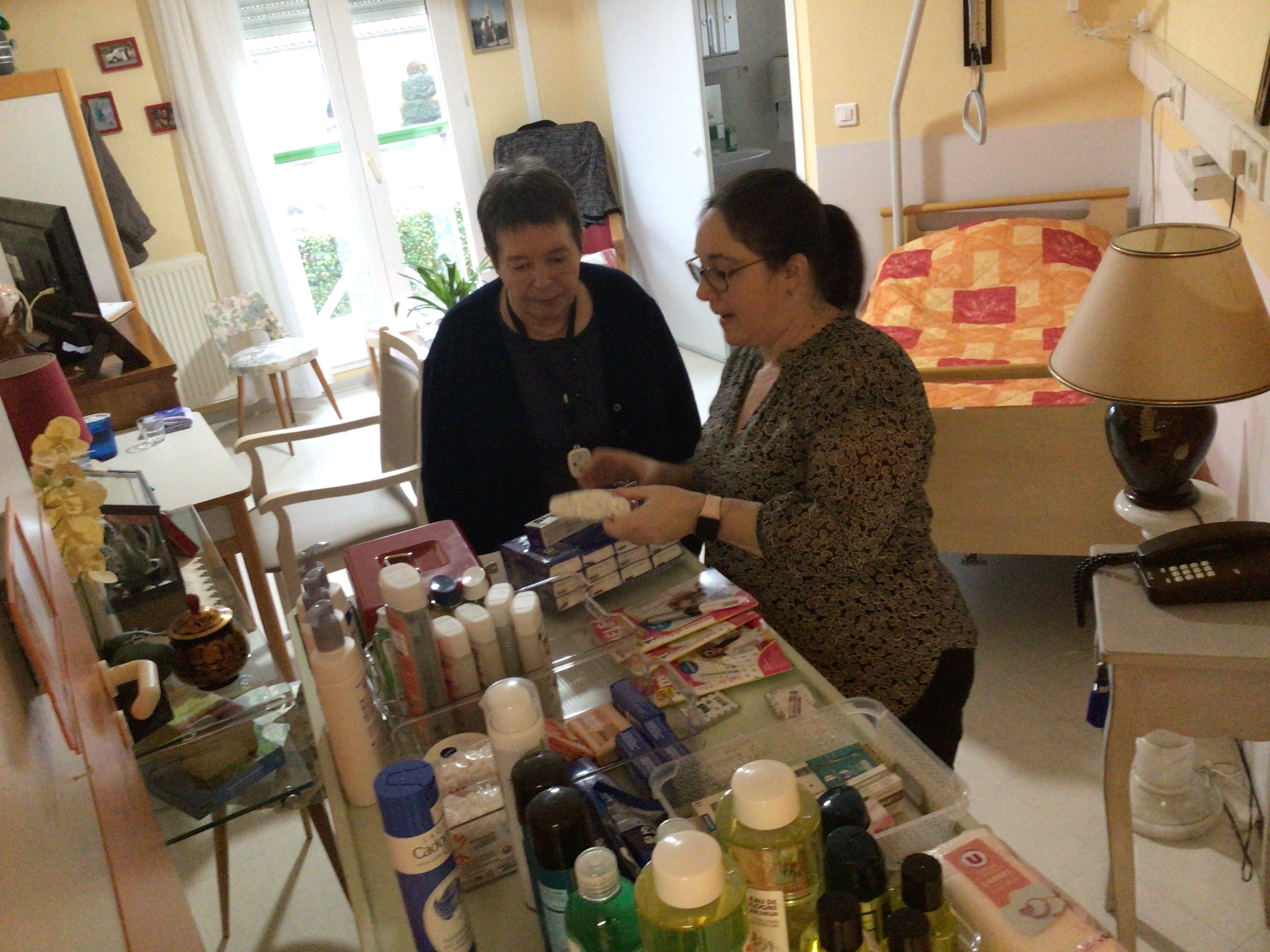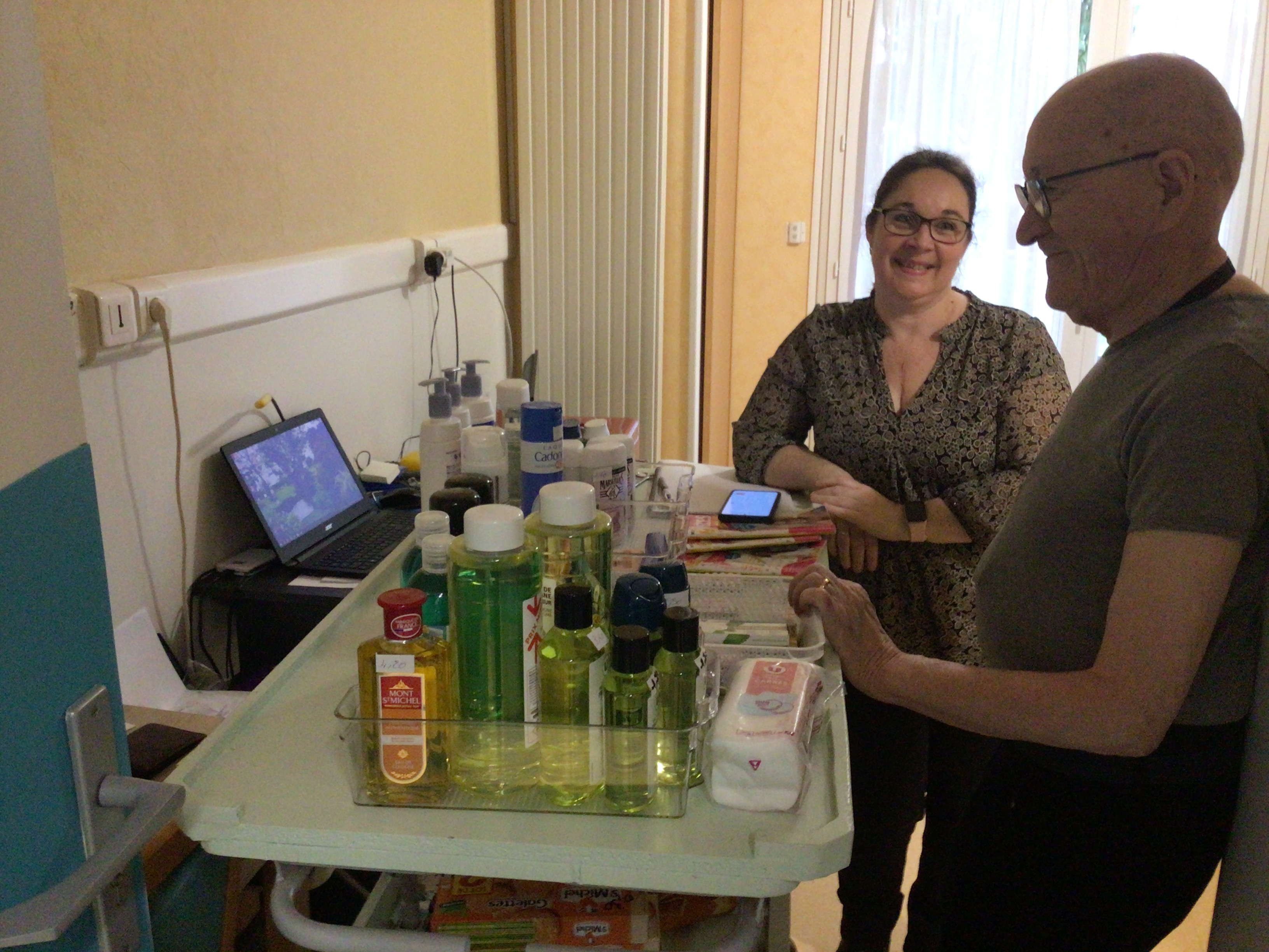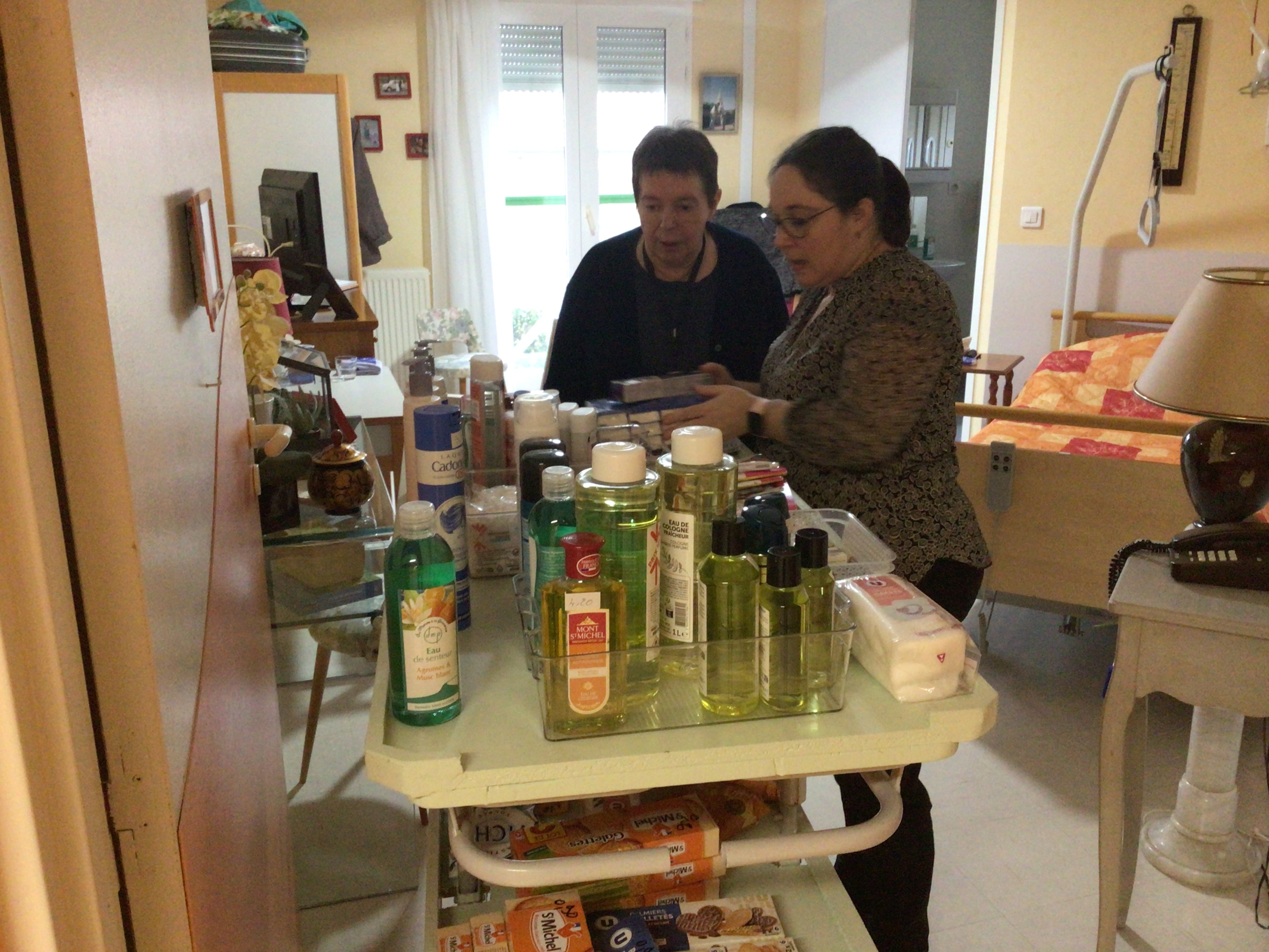 Ce matin, Sophie était dans les couloirs de la résidence avec sa boutique ambulante. Ce service propose aux résidents un petit commerce ambulant, les résidents ont la possibilité d’acheter des produits de première nécessité et également des gâteaux, des confiseries... C'est un service très apprécié des résidents, un RDV mensuel au sein de l'EHPAD.