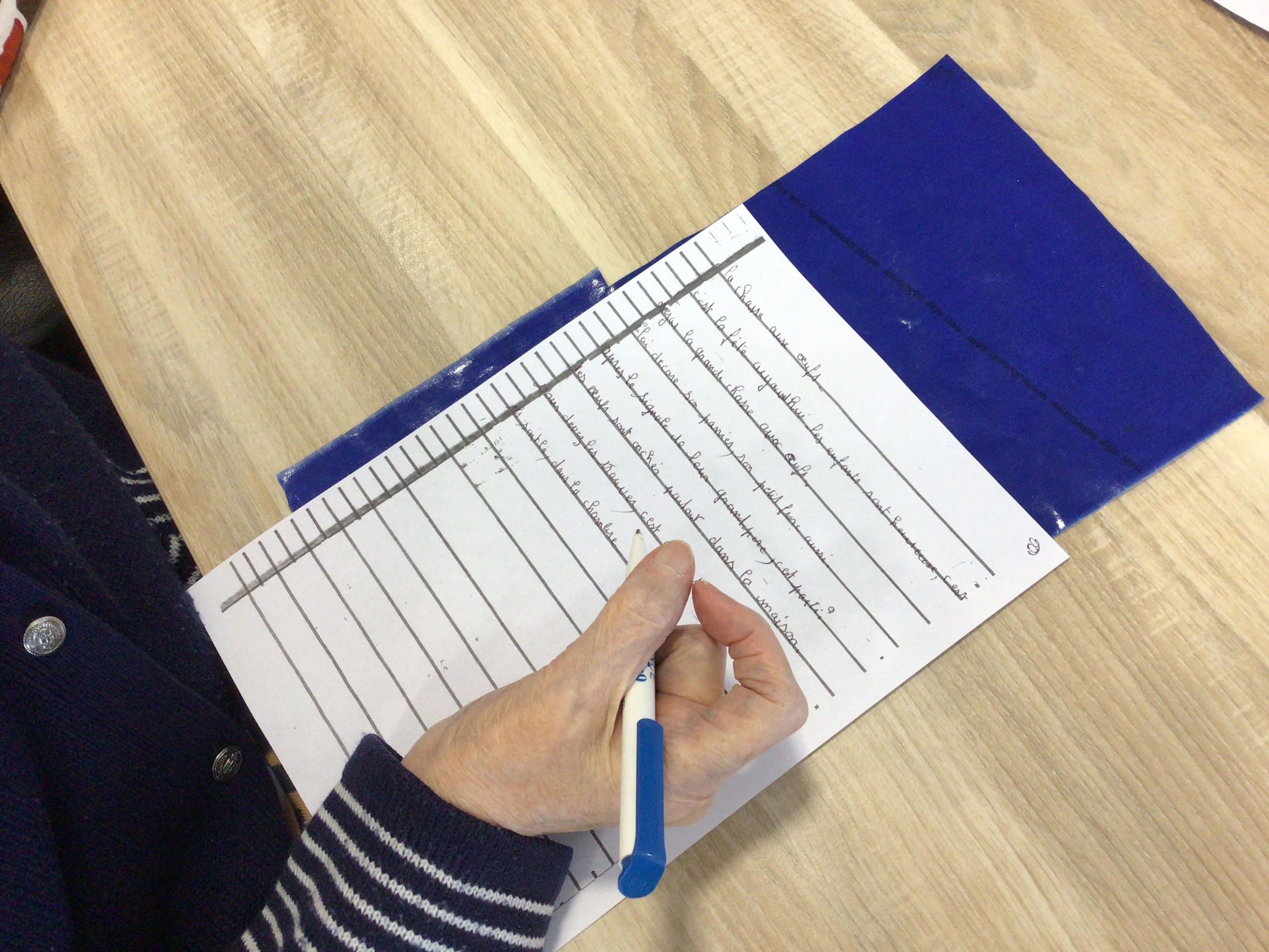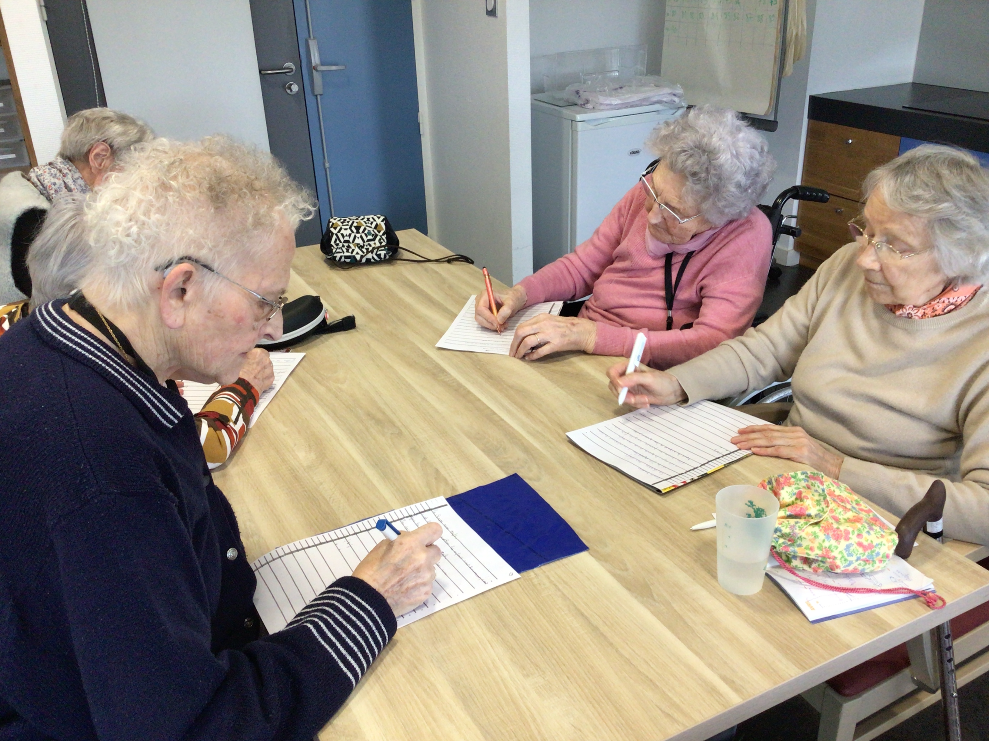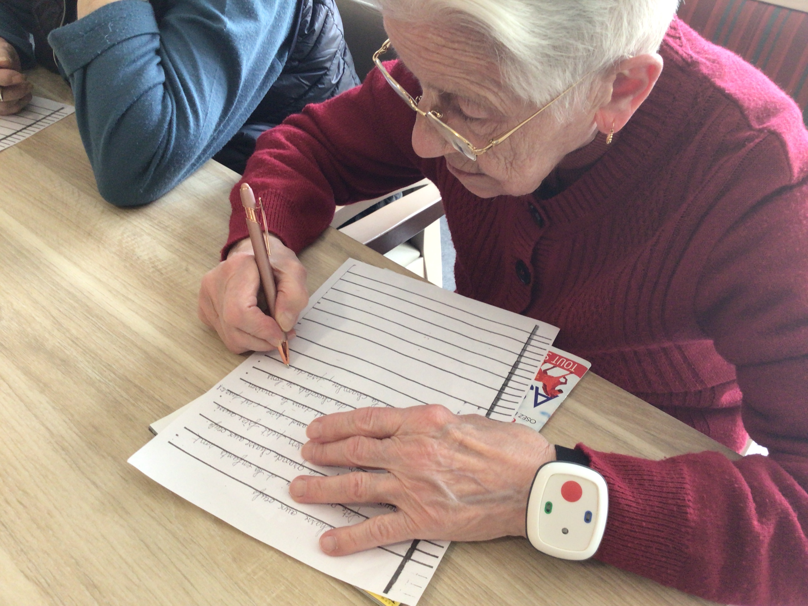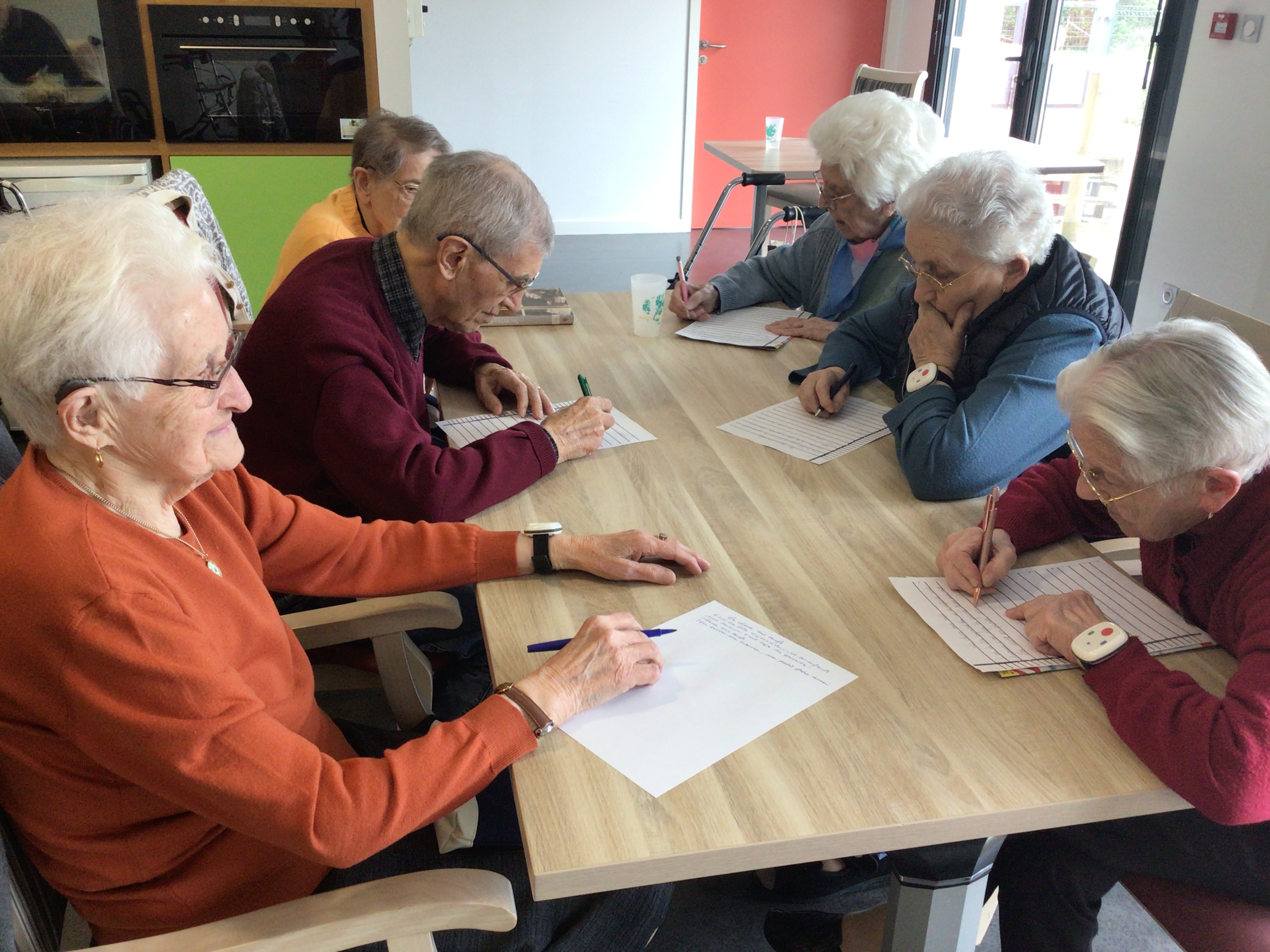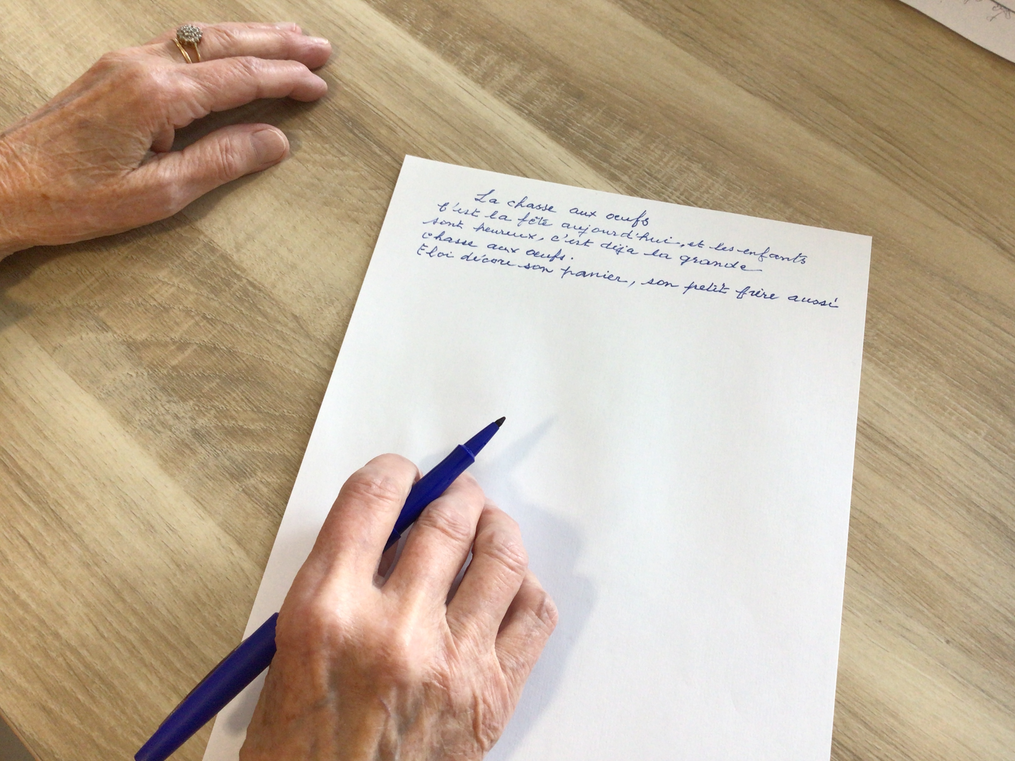 -Dictée : Certains résidents ont participé de manière active et studieuse à la dictée sur le thème de « Pâques ». Un exercice qui s’est avéré être un bon rappel du passé… l’orthographe est conservée… seule, l’écriture est modifiée d’une main plus hésitante. Au terme de l’épreuve, pas de récompenses mais pas de punitions non plus. Juste le plaisir d’avoir participé à la dictée.