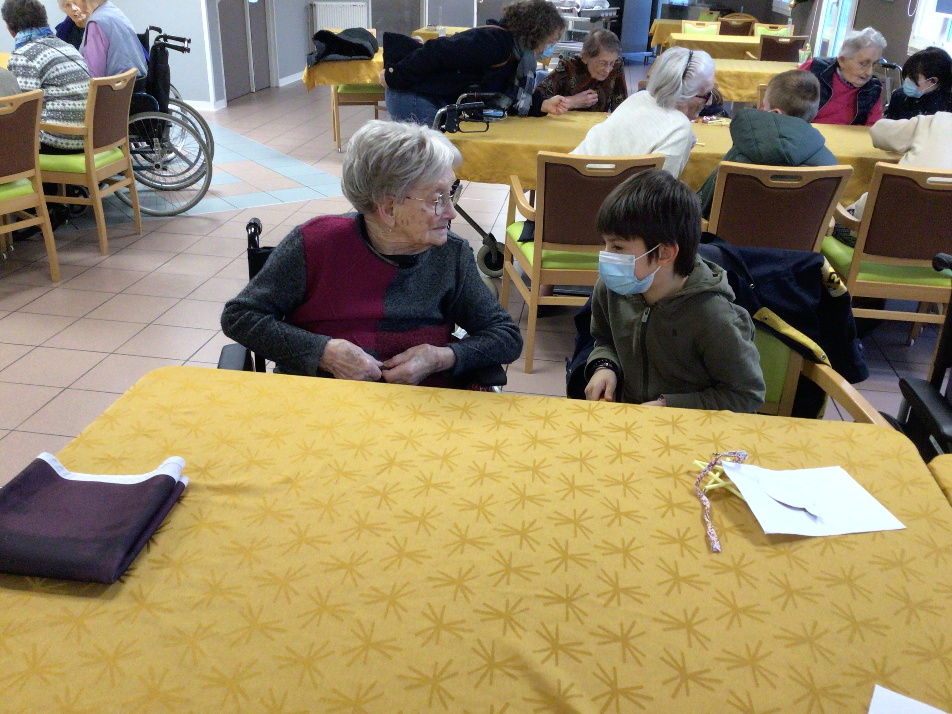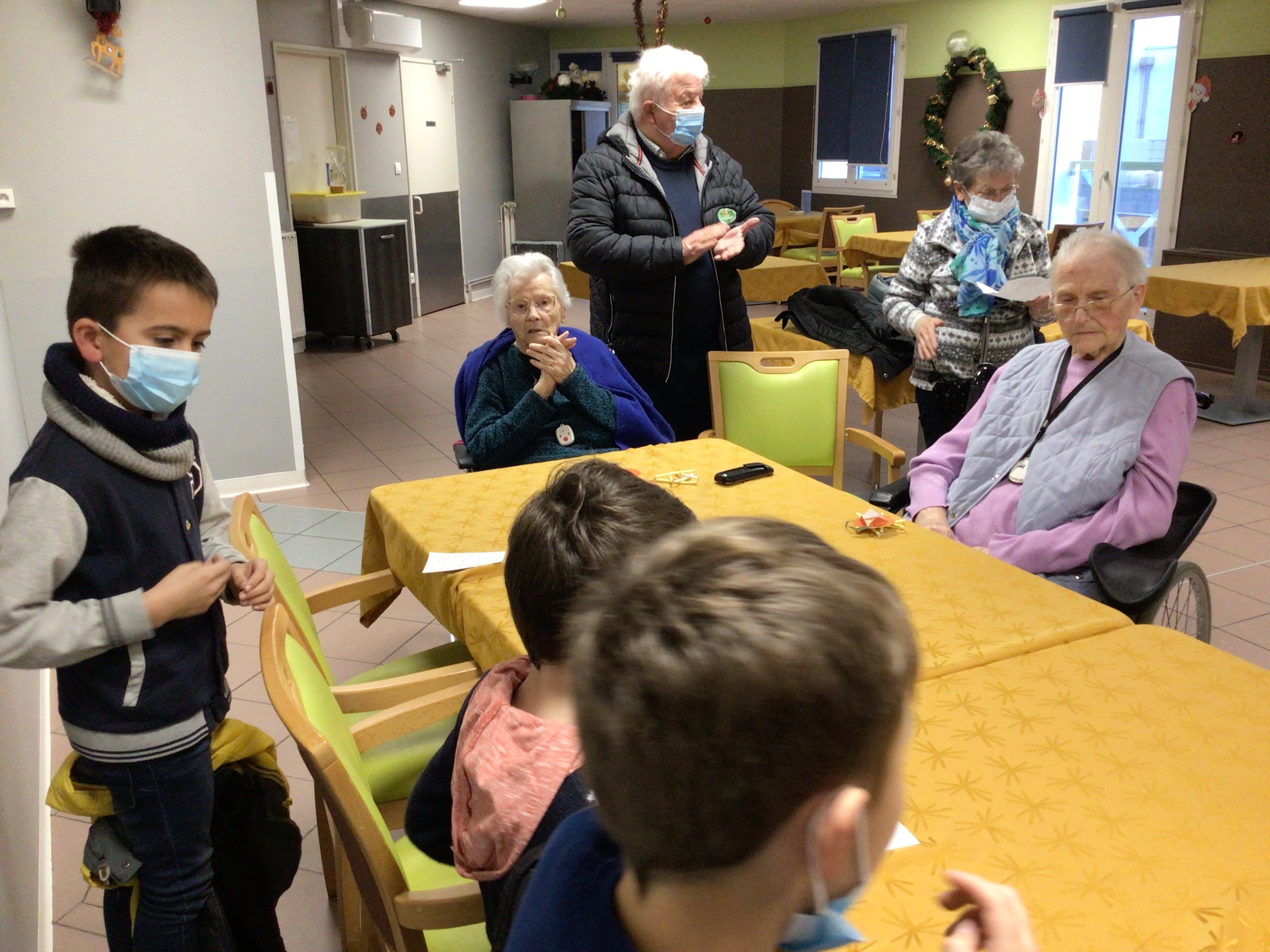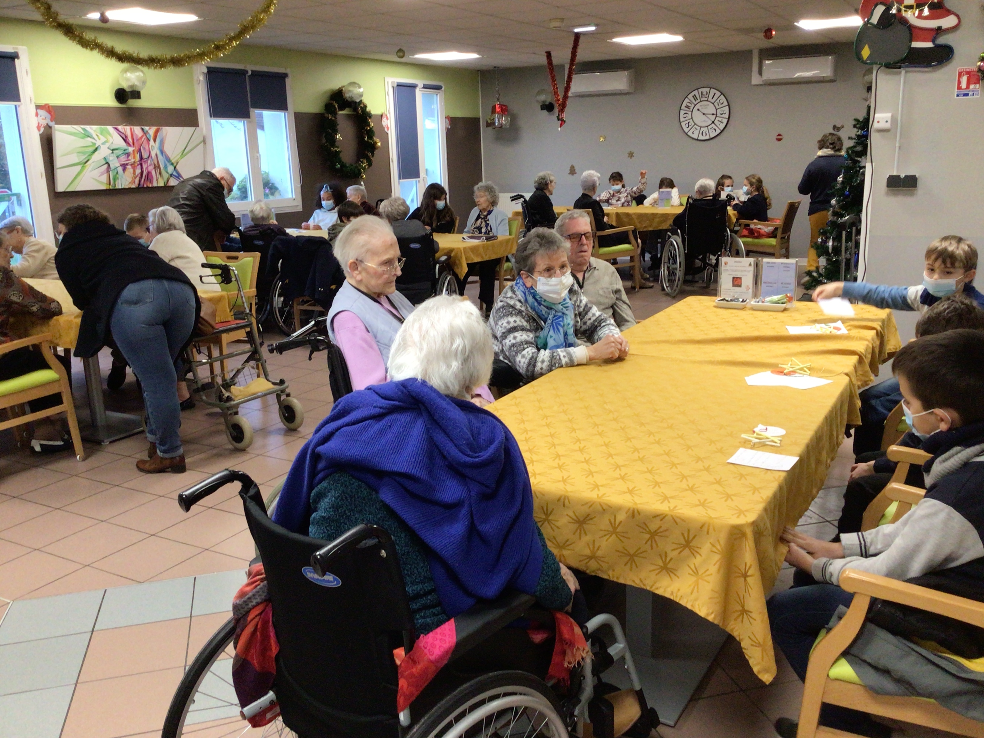 -Cet après-midi, nous avons reçu les enfants du catéchisme du secteur encadrés par Alexandrine Turpault et 3 accompagnateurs. La rencontre se voulait sur le thème de la transmission, et devait permettre aux résidents et aux enfants un échange sur le Noël vécu autrefois.