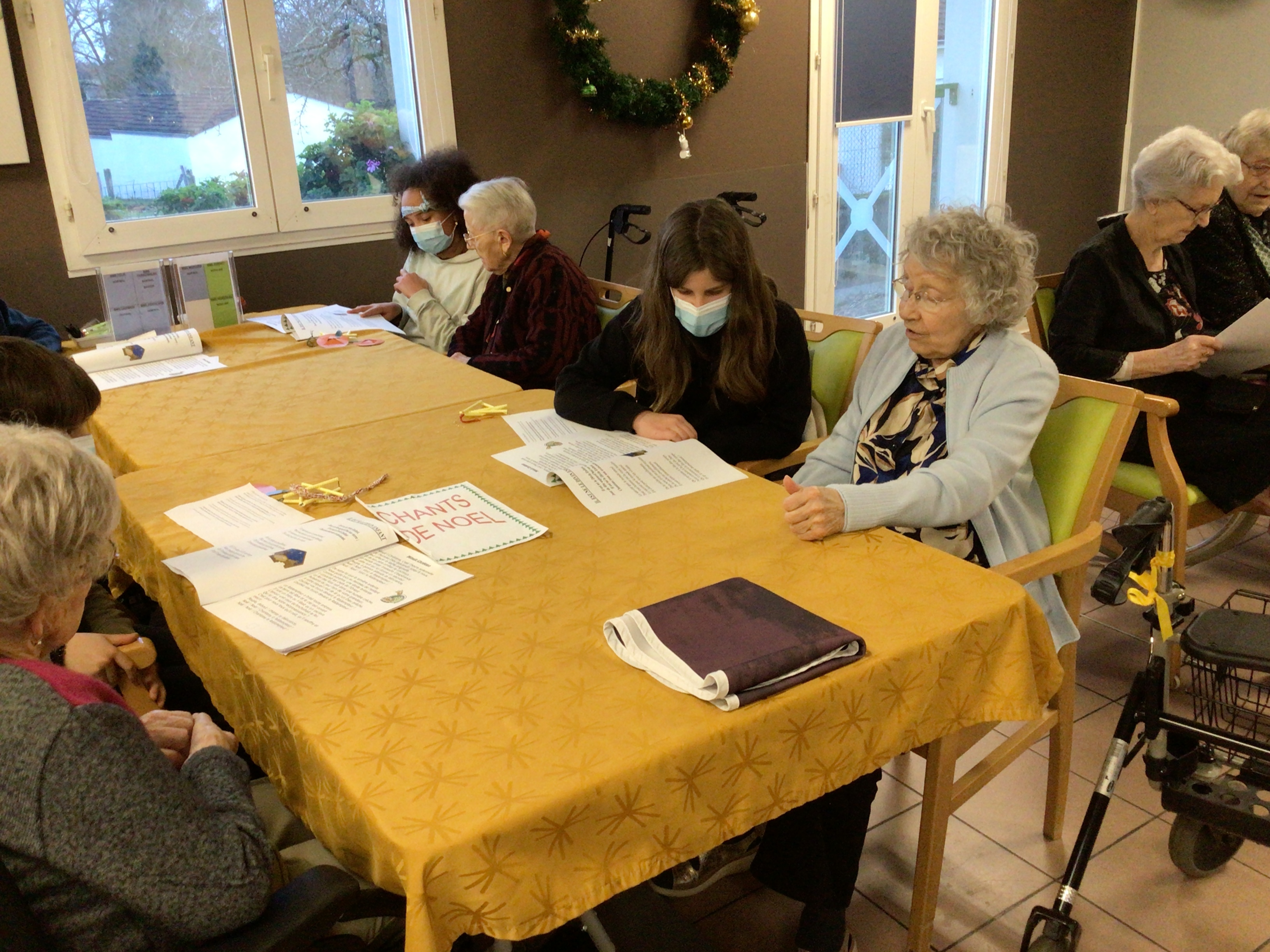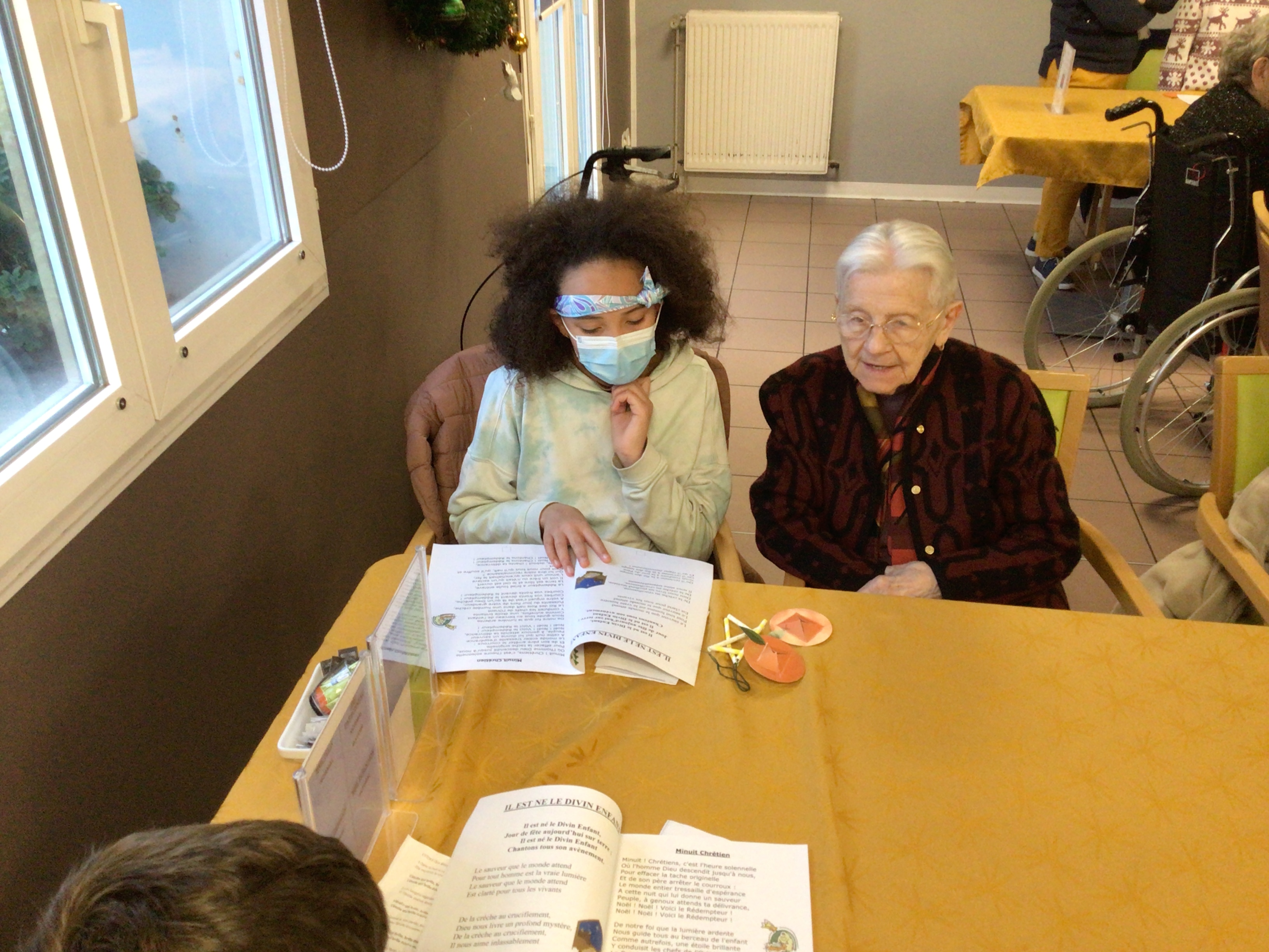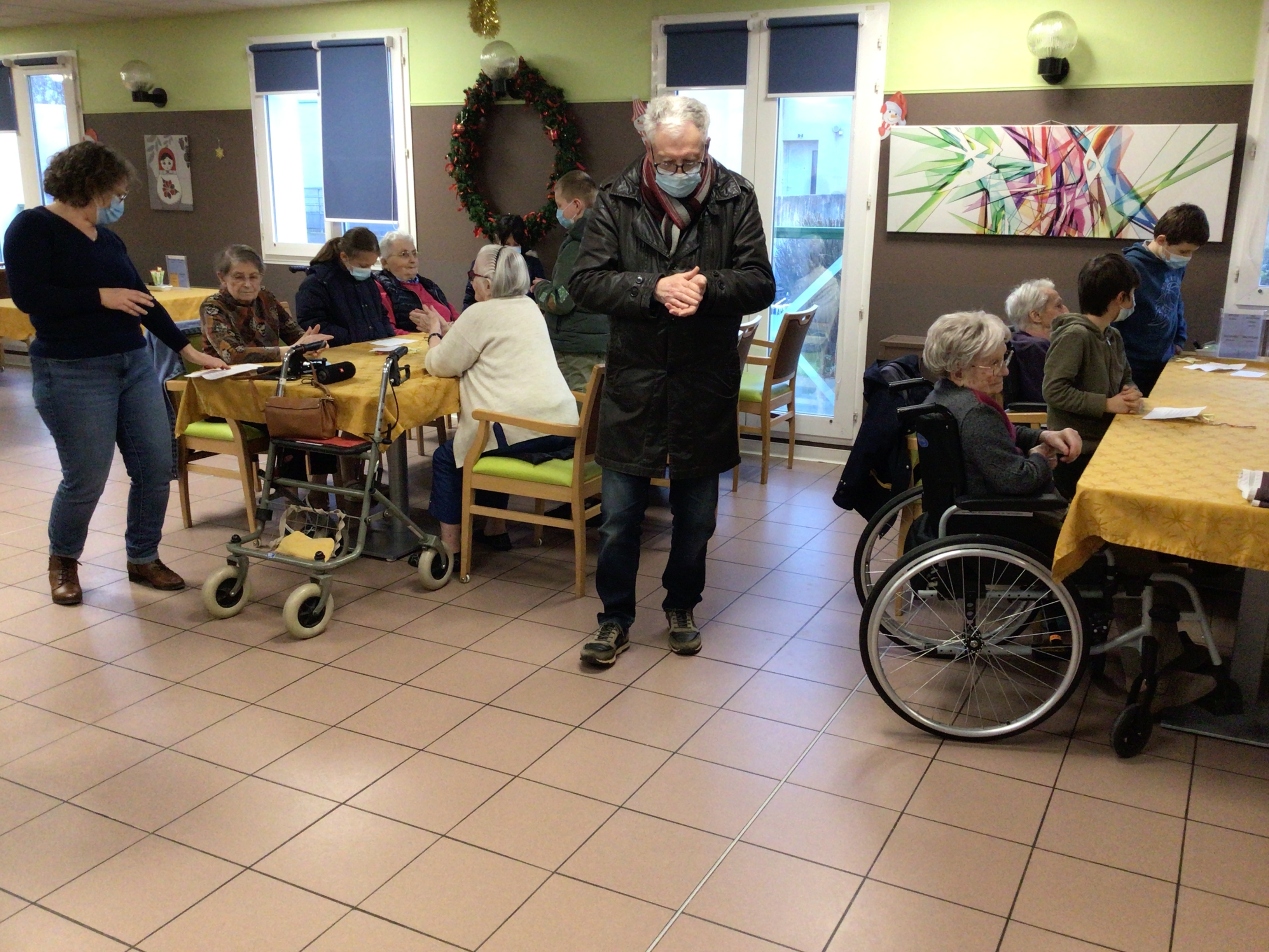-Cet après-midi, nous avons reçu les enfants du catéchisme du secteur encadrés par Alexandrine Turpault et 3 accompagnateurs. La rencontre se voulait sur le thème de la transmission, et devait permettre aux résidents et aux enfants un échange sur le Noël vécu autrefois.