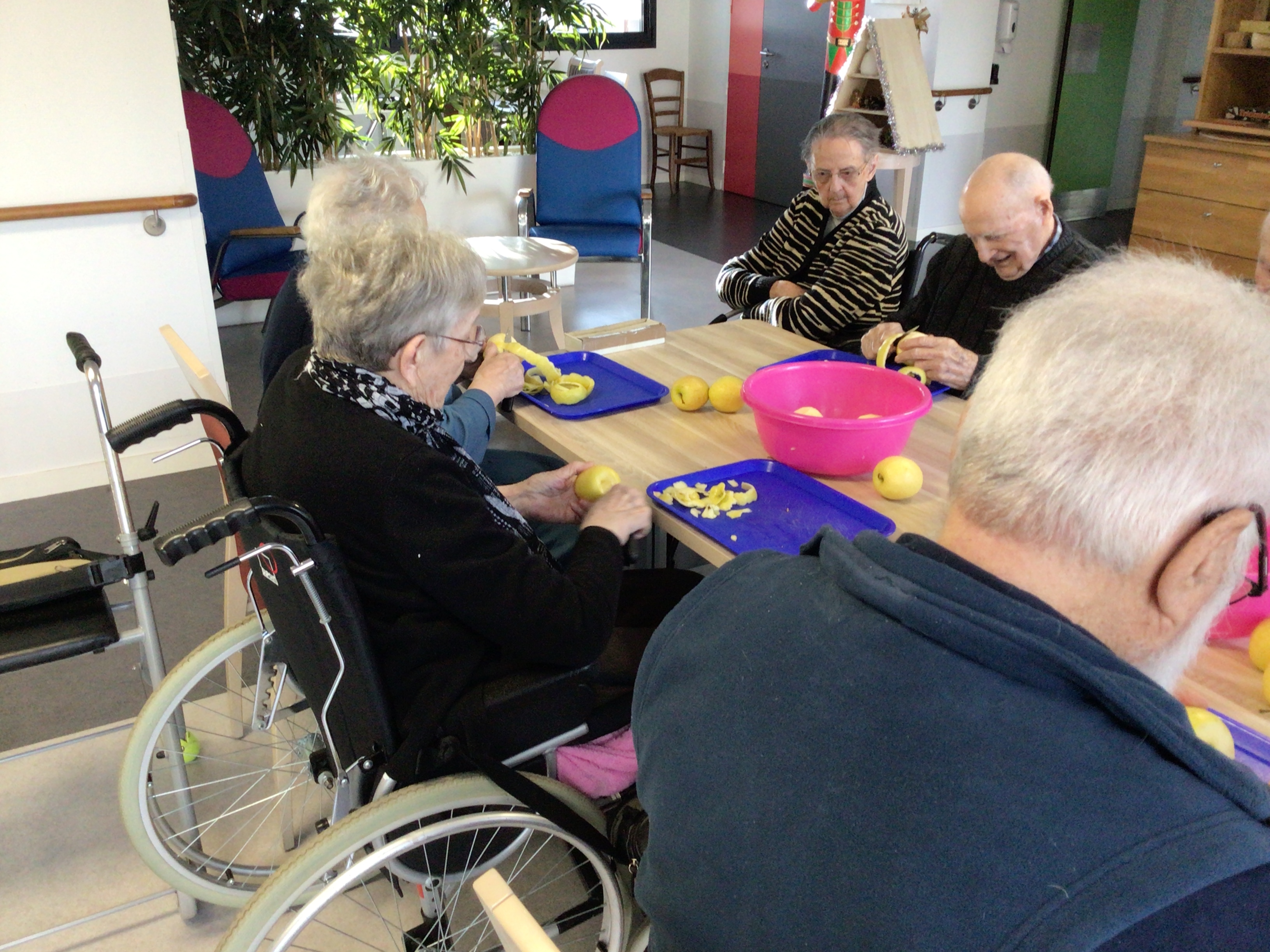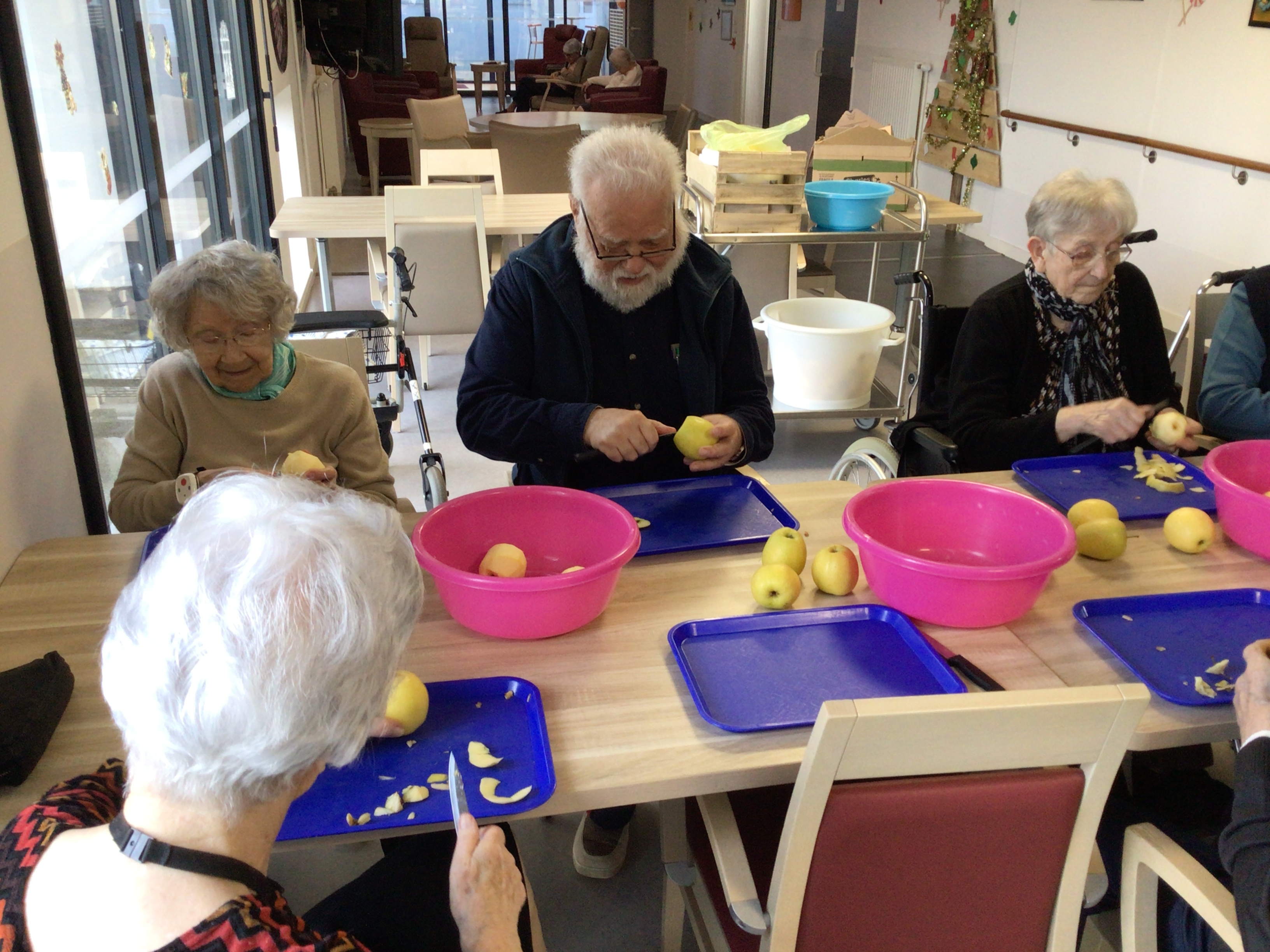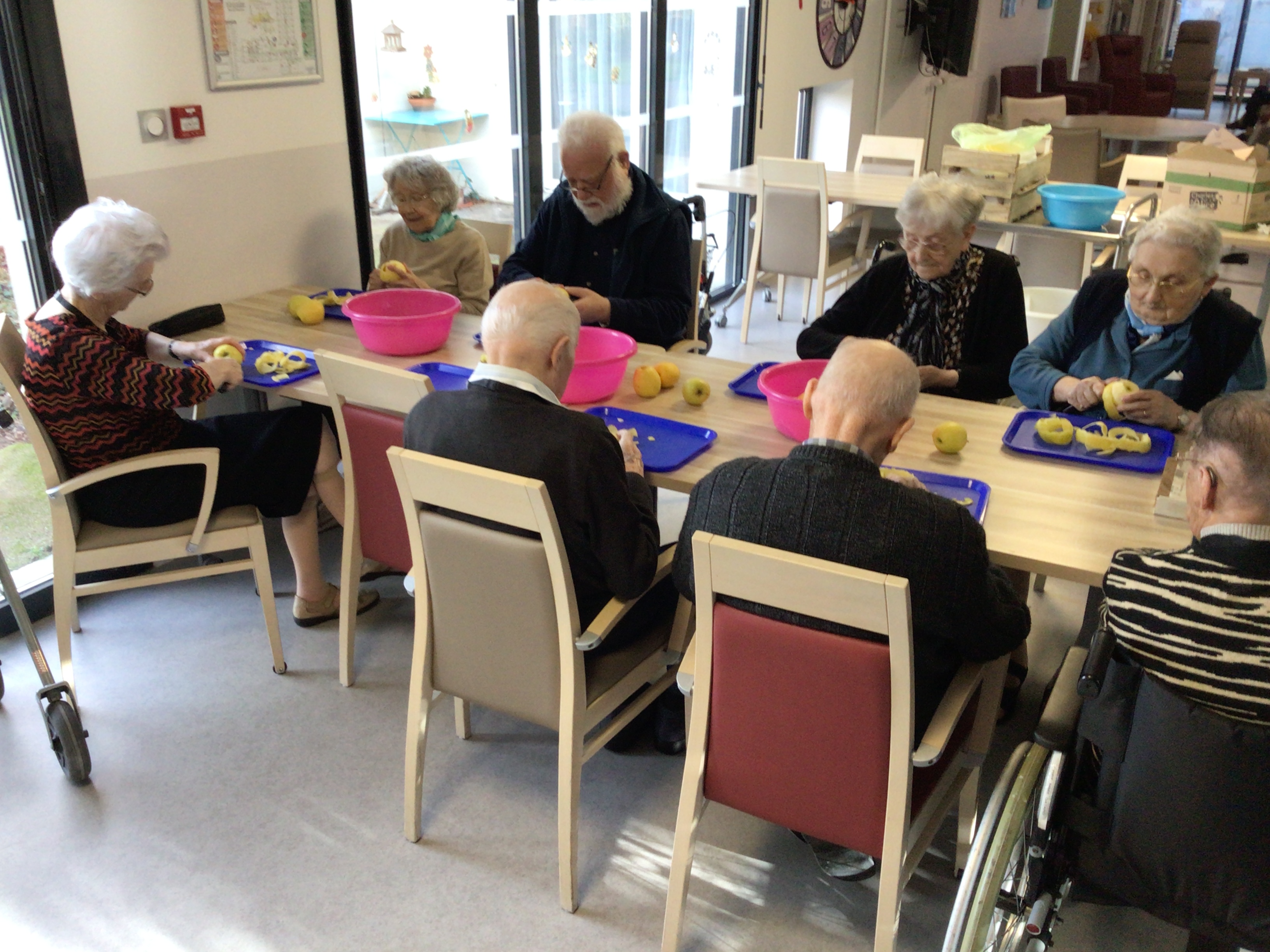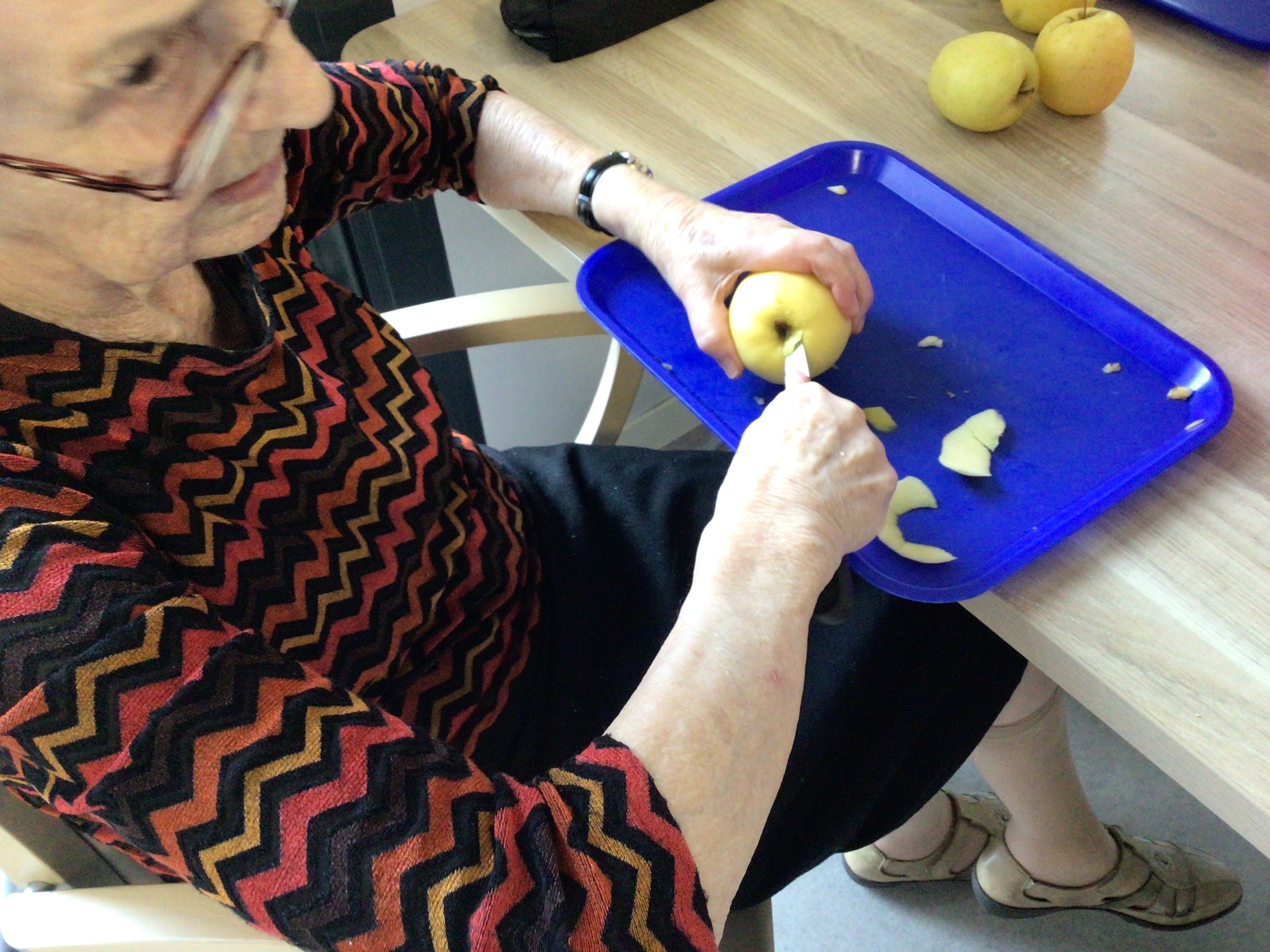 -Atelier « épluchage des pommes » : cet atelier qui a toujours beaucoup de succès favorise l'autonomie en permettant aux résidents de participer activement à la préparation des repas.