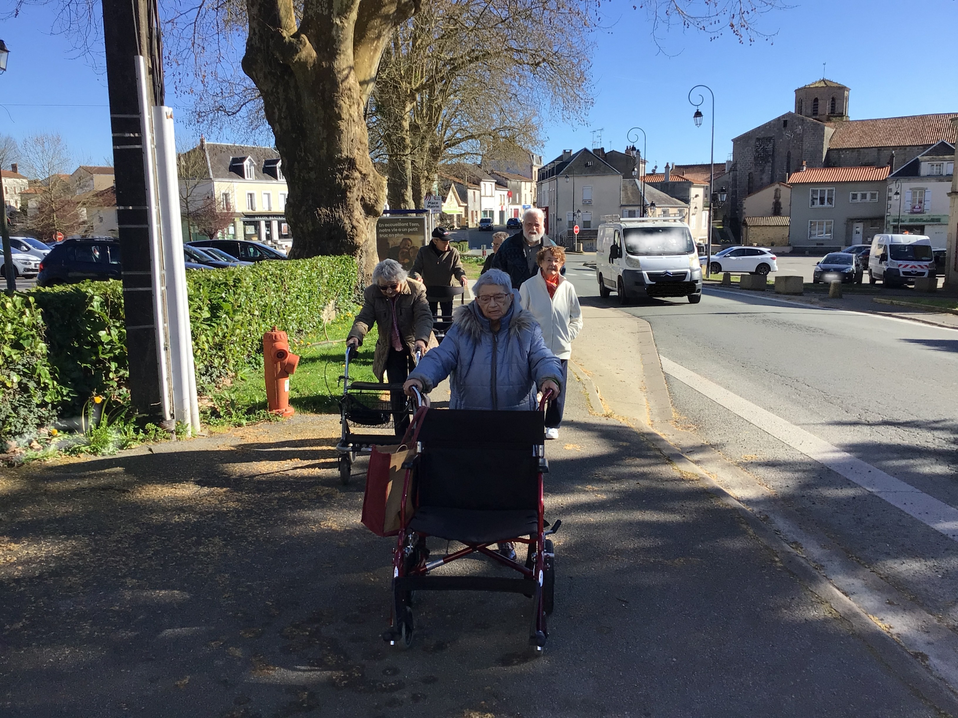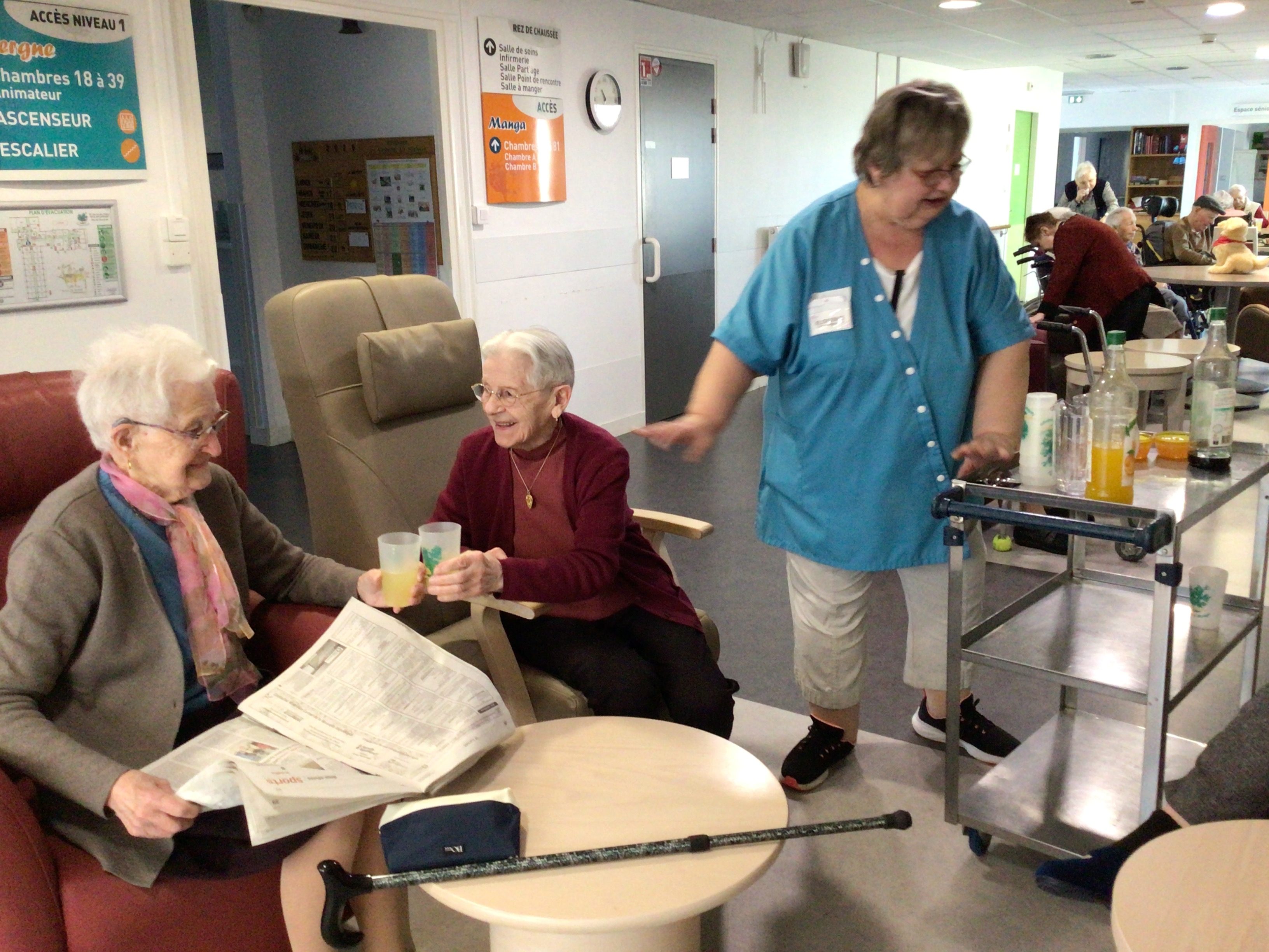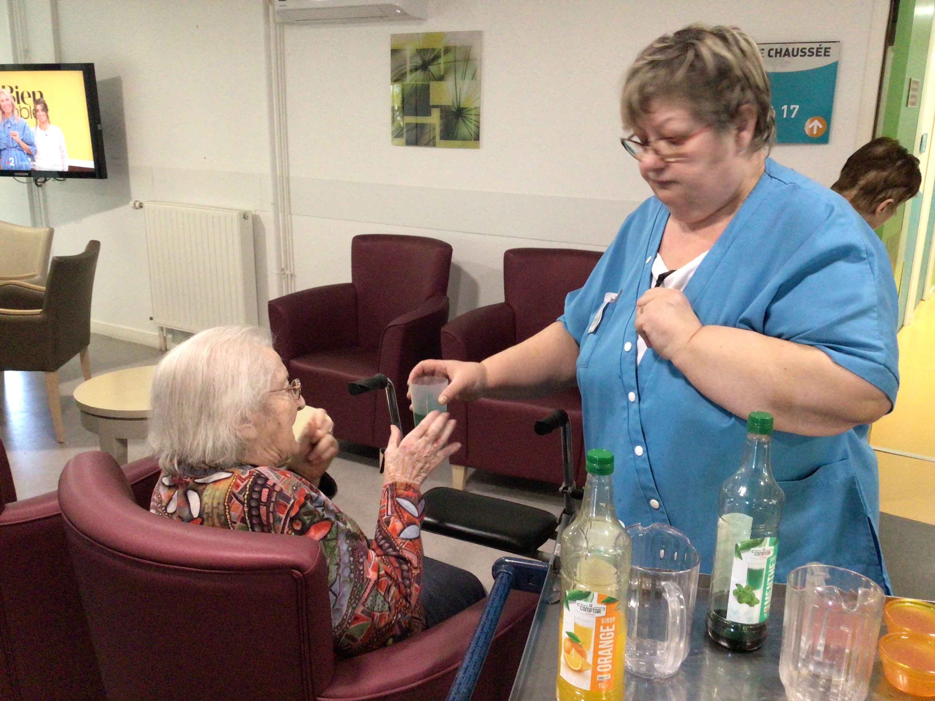 matin: reprise de la marche avec de l'aide pour certaines! Quel plaisir de se mobiliser. Il faut s'hydrater tout au long de la journée afin que son corps soit en bonne santé.