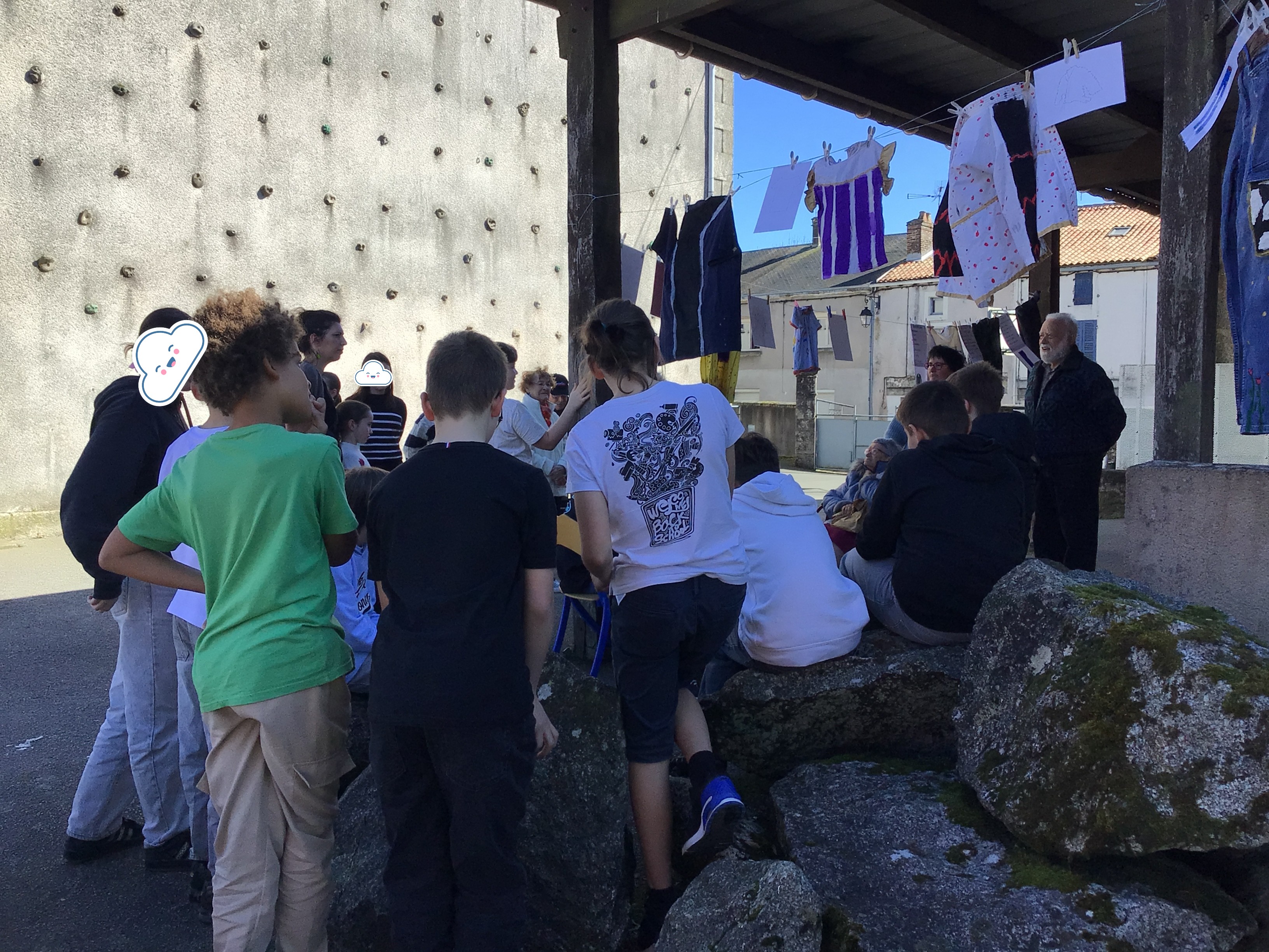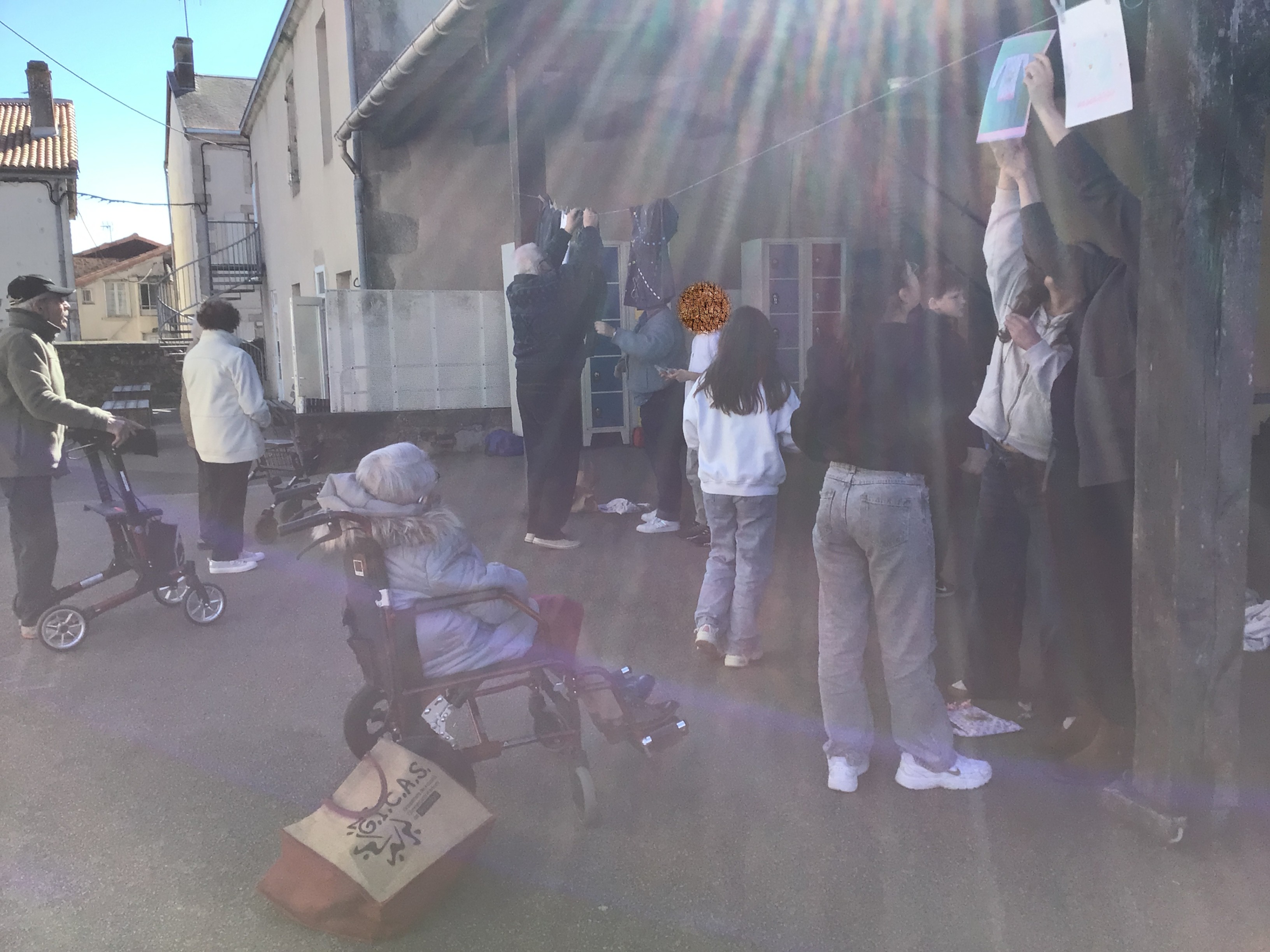 Après midi, un groupe de résidents a rejoint le collège St Joseph de Secondigny à pied par un beau soleil. ils sont allés accrocher leurs créations et les vêtements dans le cadre du projet de la Grande Lessive. les résidents ont rencontré une classe de 6ème. Chacun a pu partager un temps pour expliquer ses choix de créations, la façon de le faire, acrostiche, calligraphie, coudre, peindre....