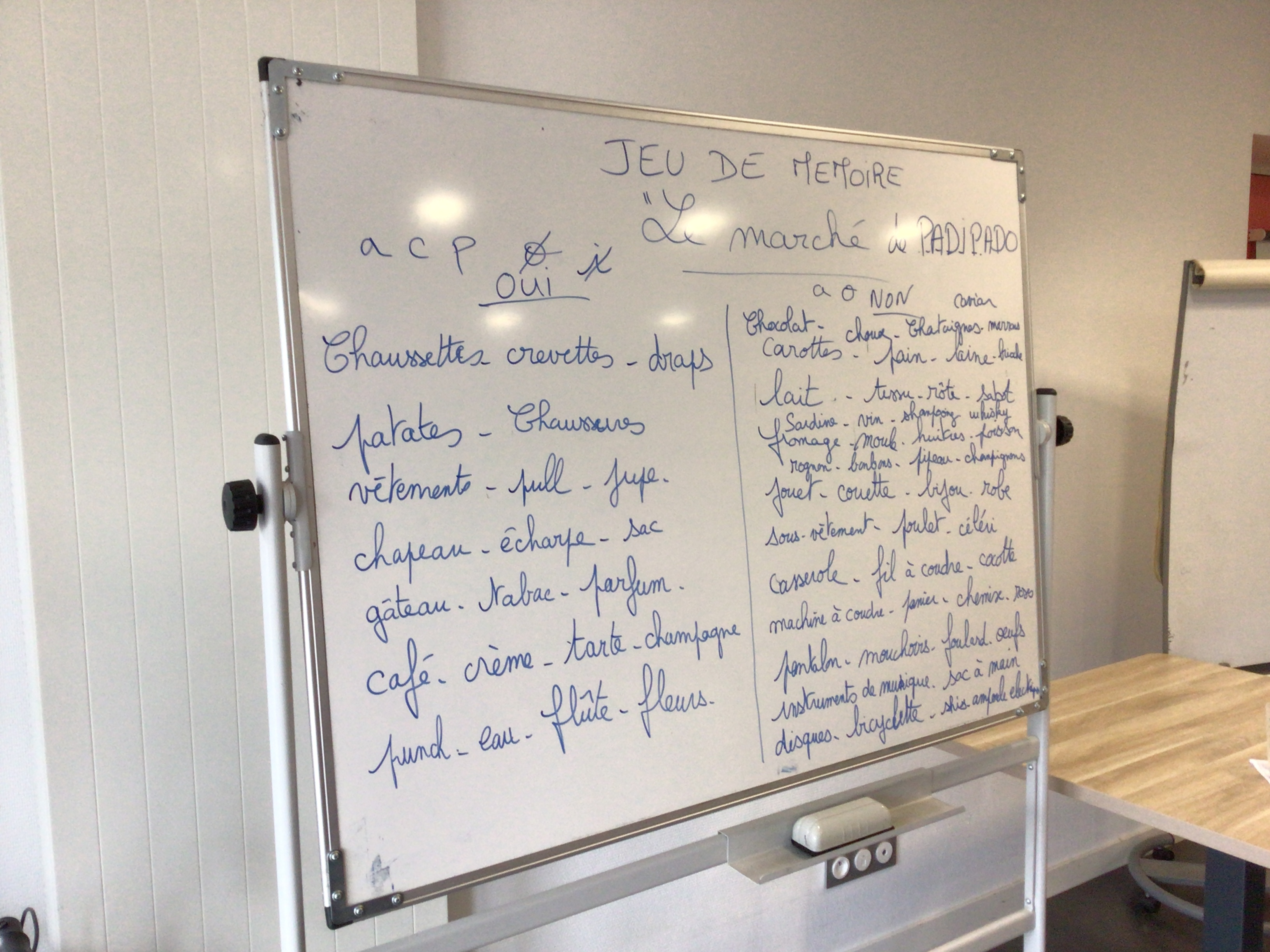 L'après-midi a permis de stimuler les méninges avec un jeu mémoire "Le marché de Padipado". il a fallu chercher afin de trouver le nom du marché en donnant des mots.... et oui, sur le marché de Padipado, on trouve que des choses qui n'ont pas de i et qui n'ont pas d'o. exemple: des patates mais pas de radis.