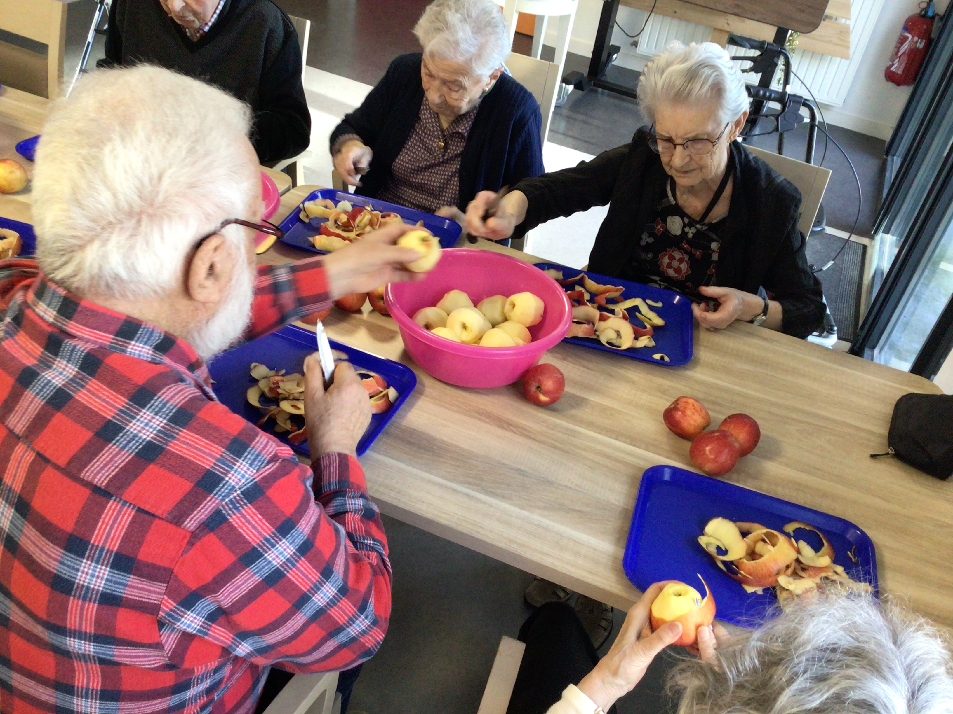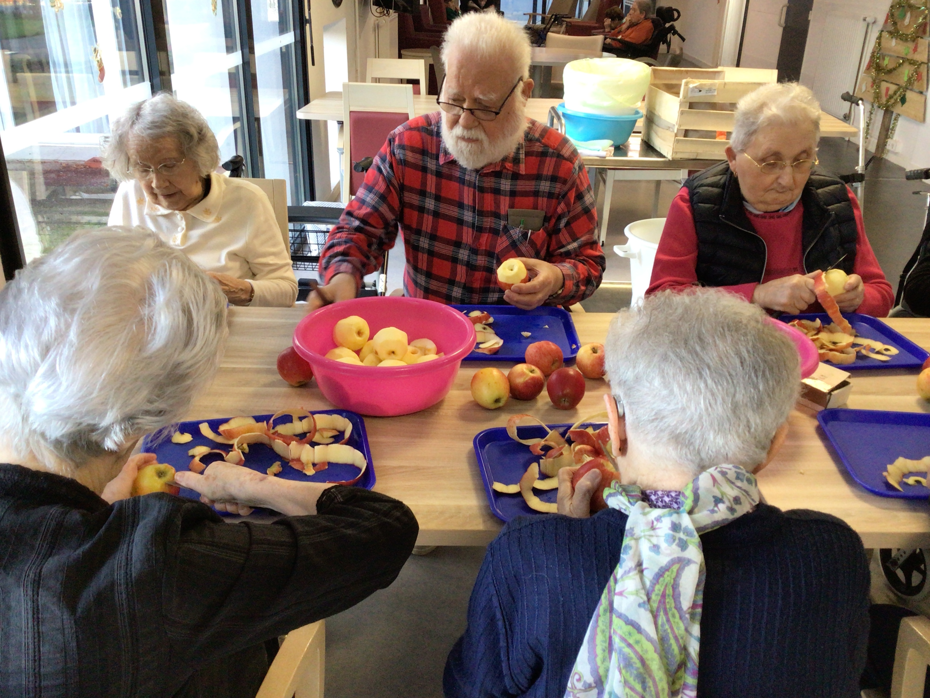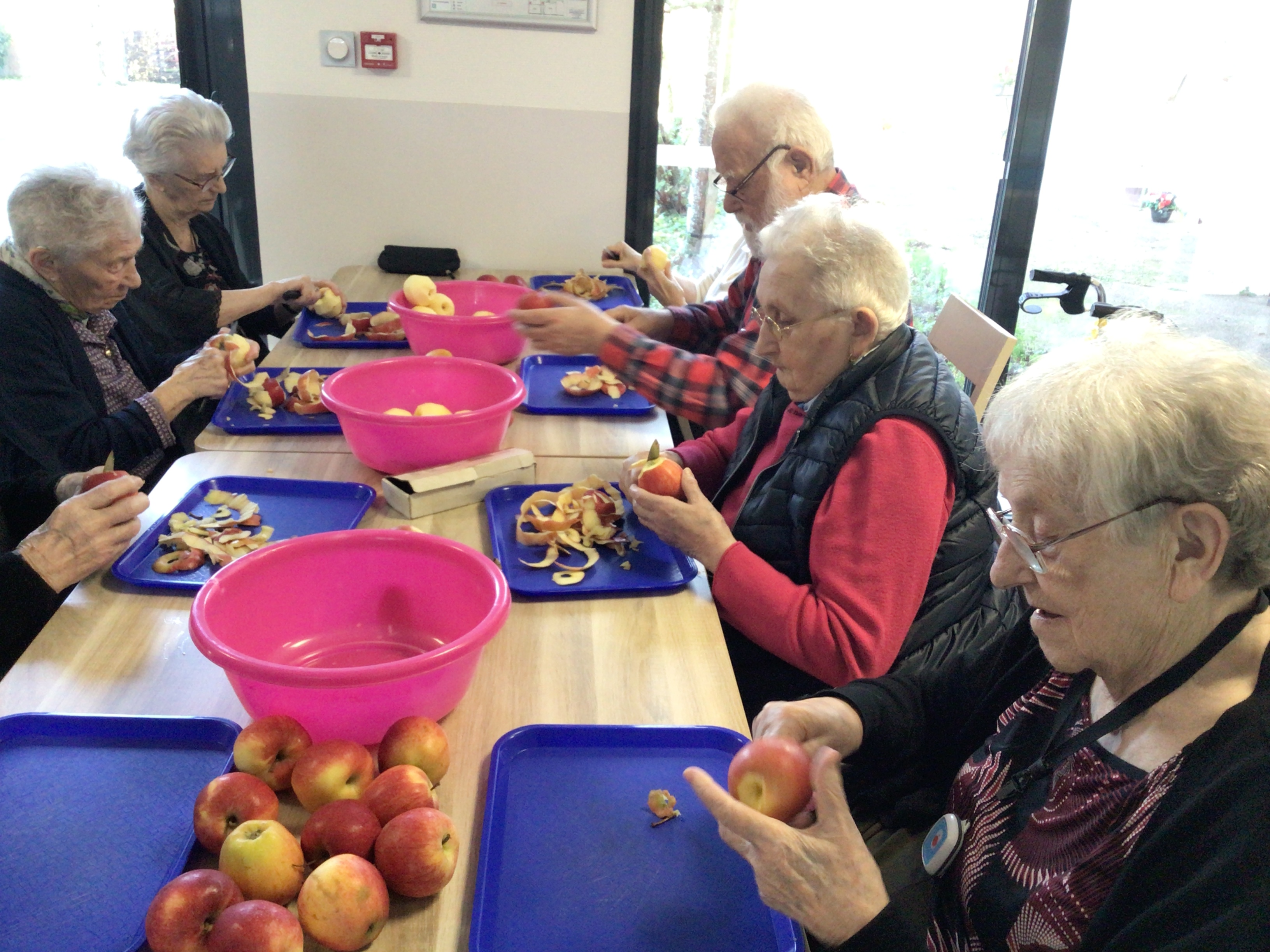 -Epluchage des pommes par les résidents qui permettra de réaliser des pommes cuites qui seront servies en dessert le mercredi midi.