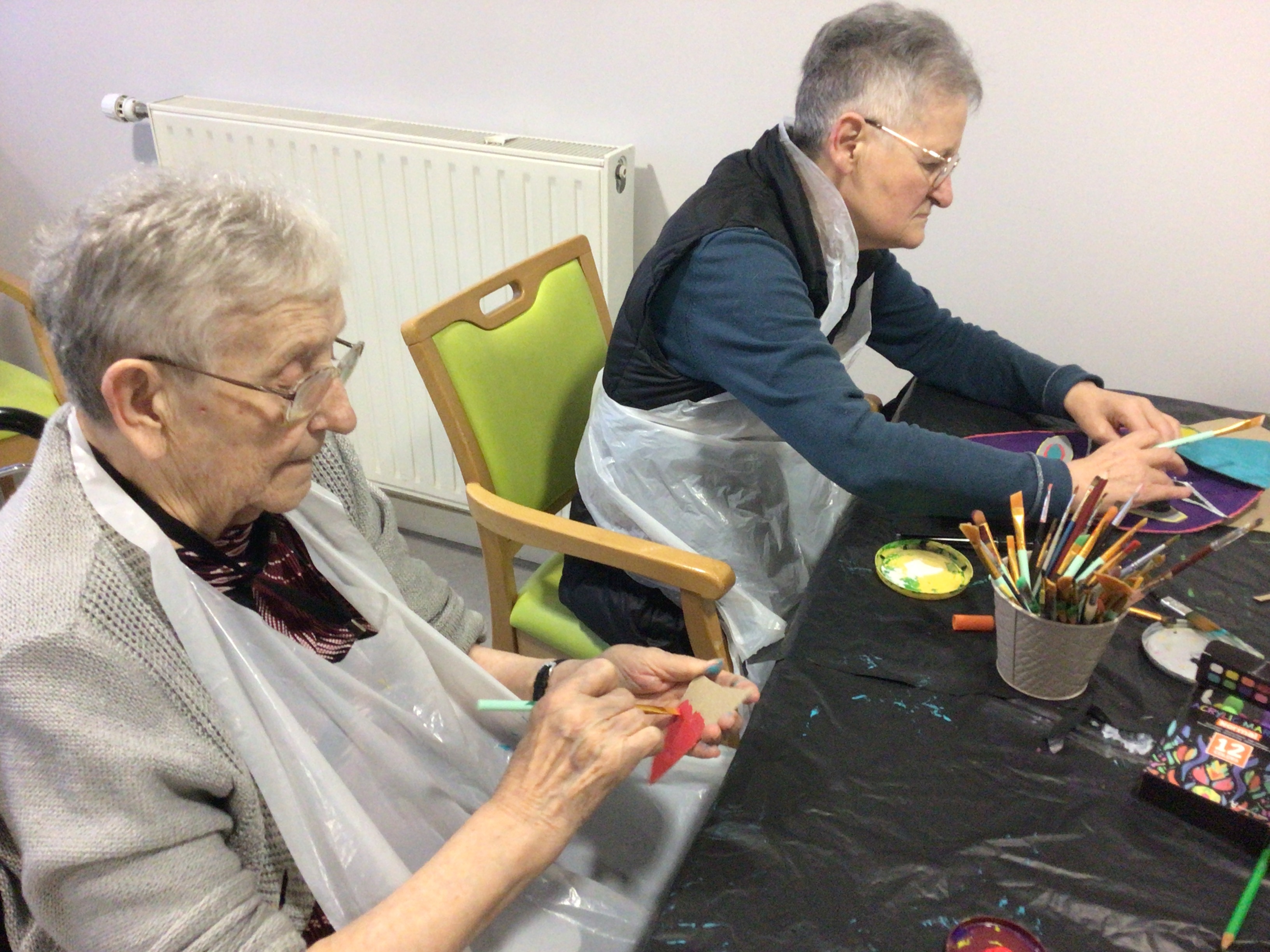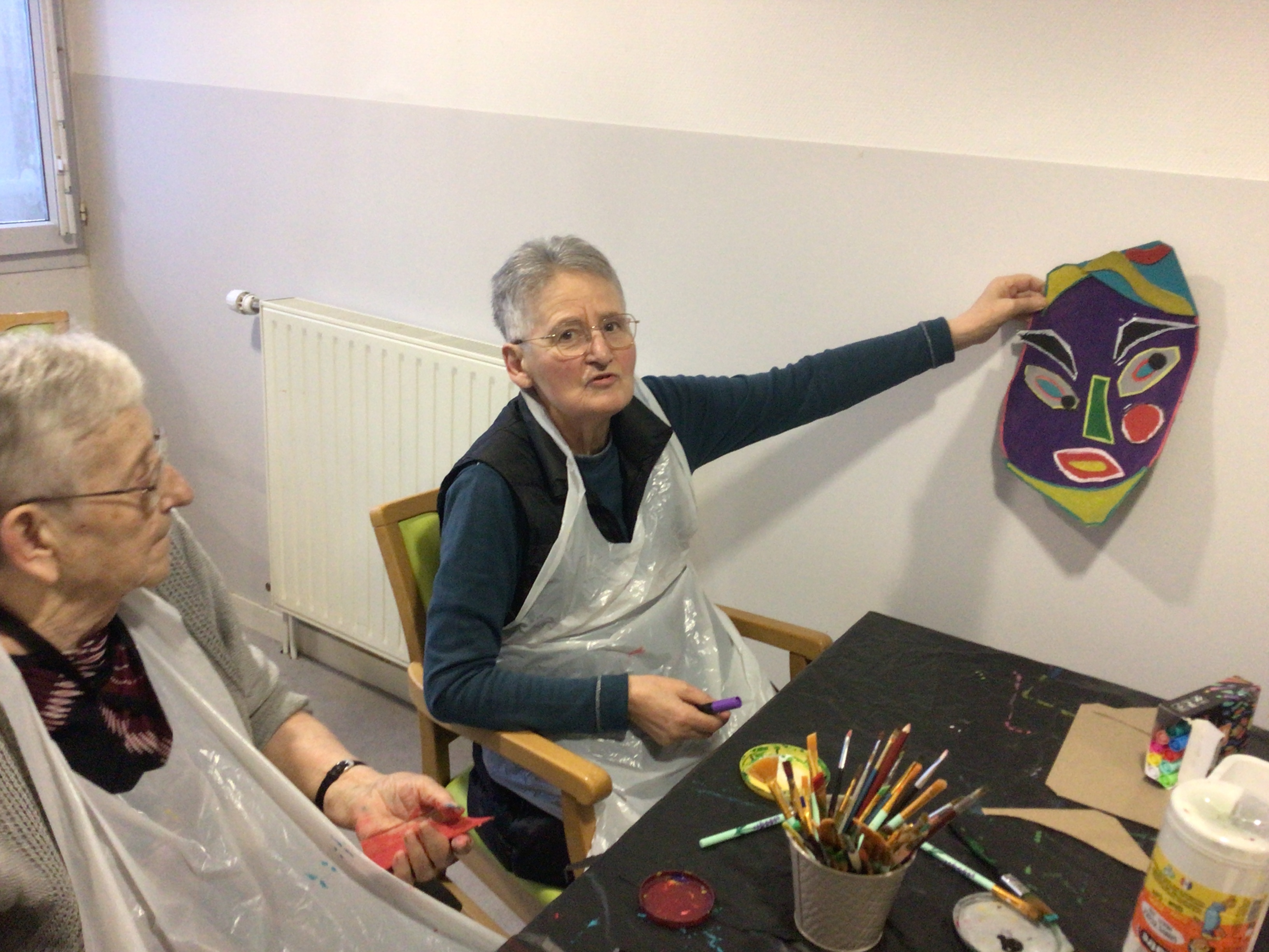 L'art thérapie animé par Brigitte notre art thérapeute, a permis cet après-midi à un groupe de résidentes, de continuer leurs créations en lien avec l'artiste Gaston Chaissac.