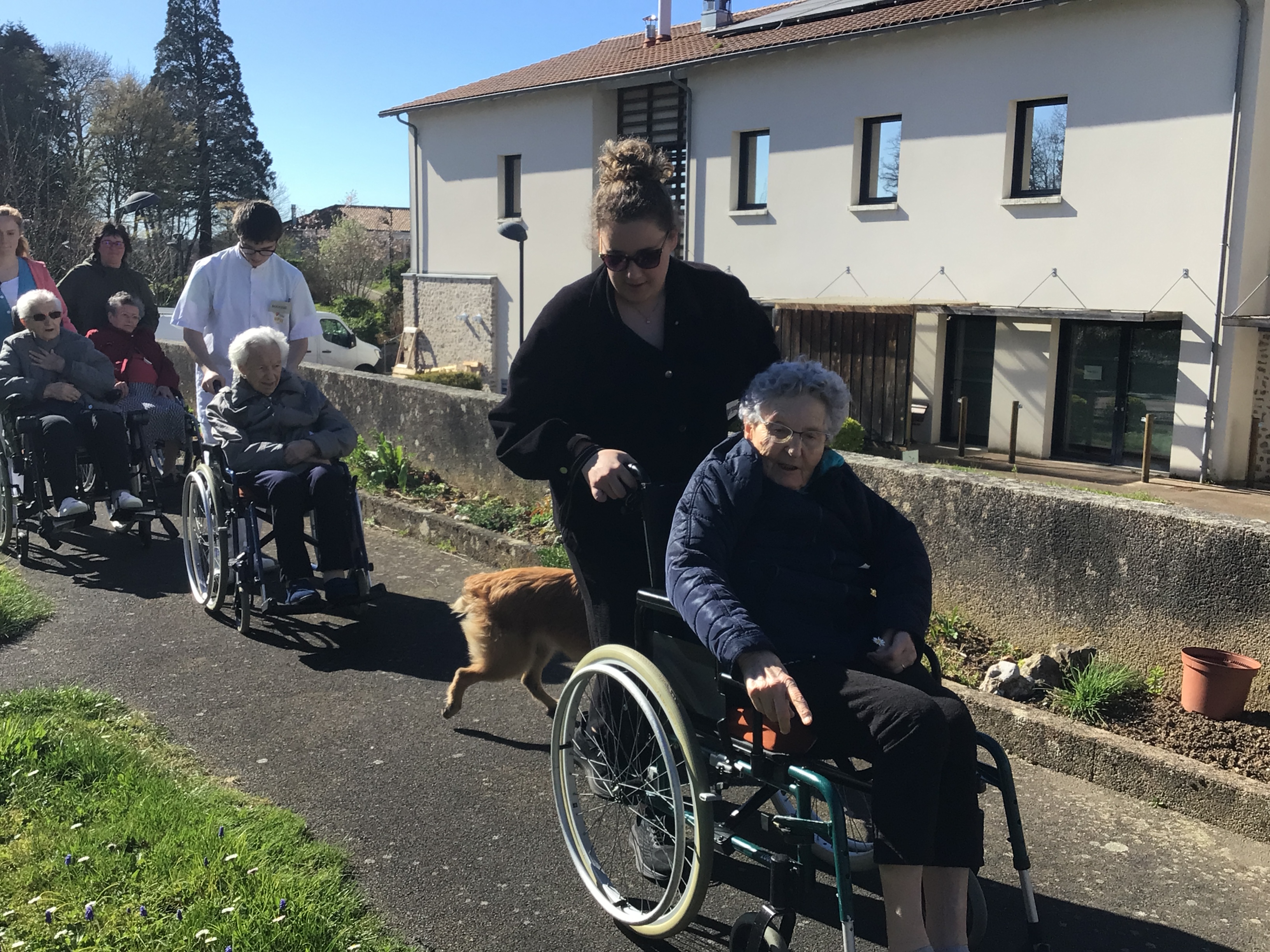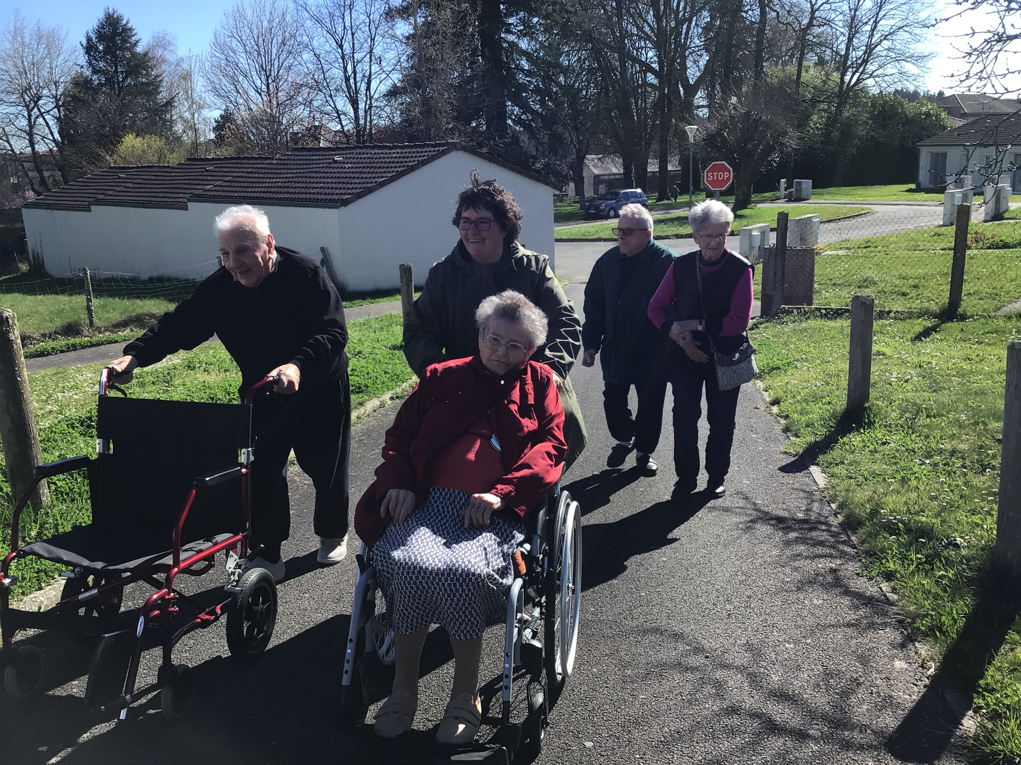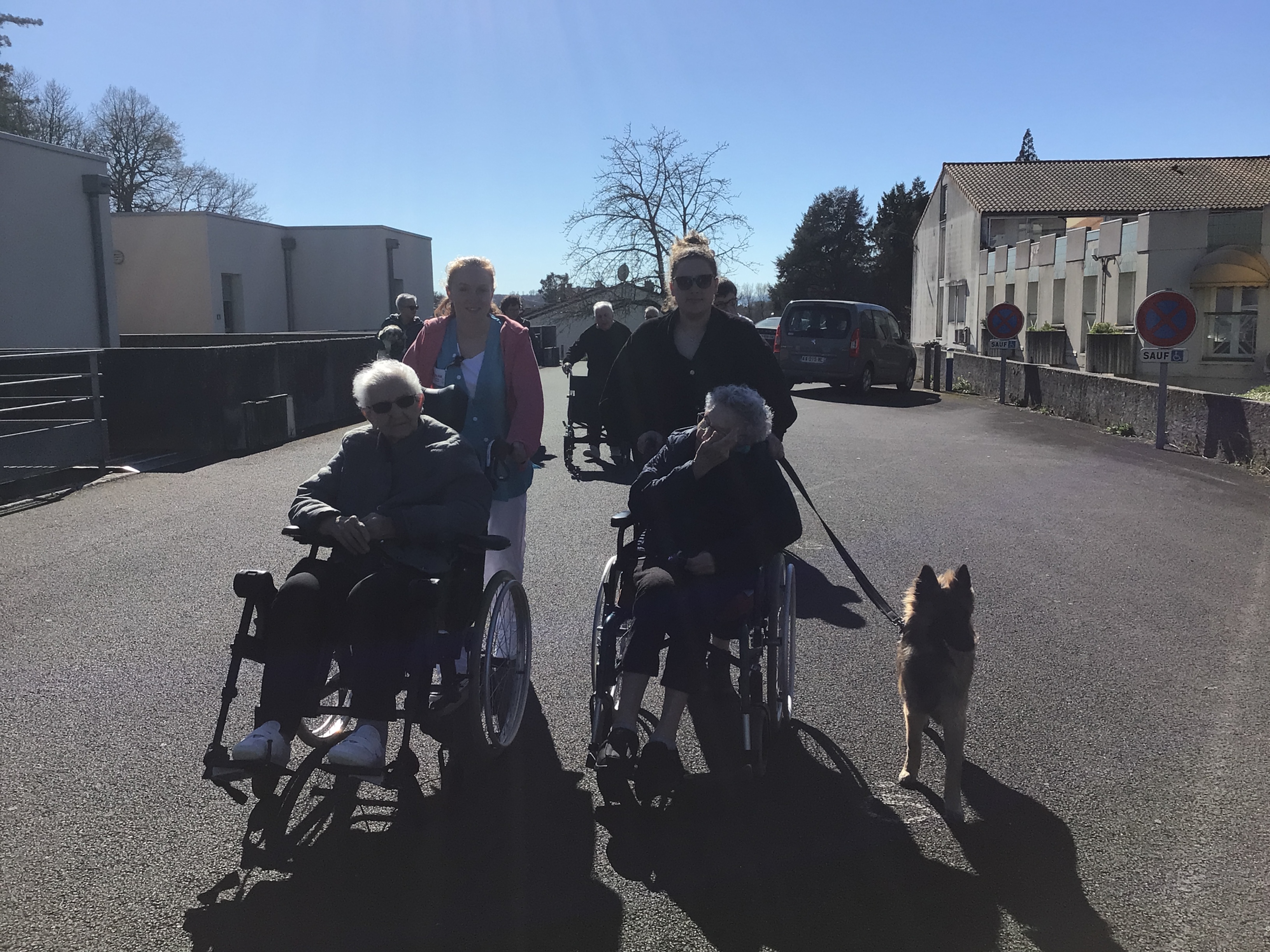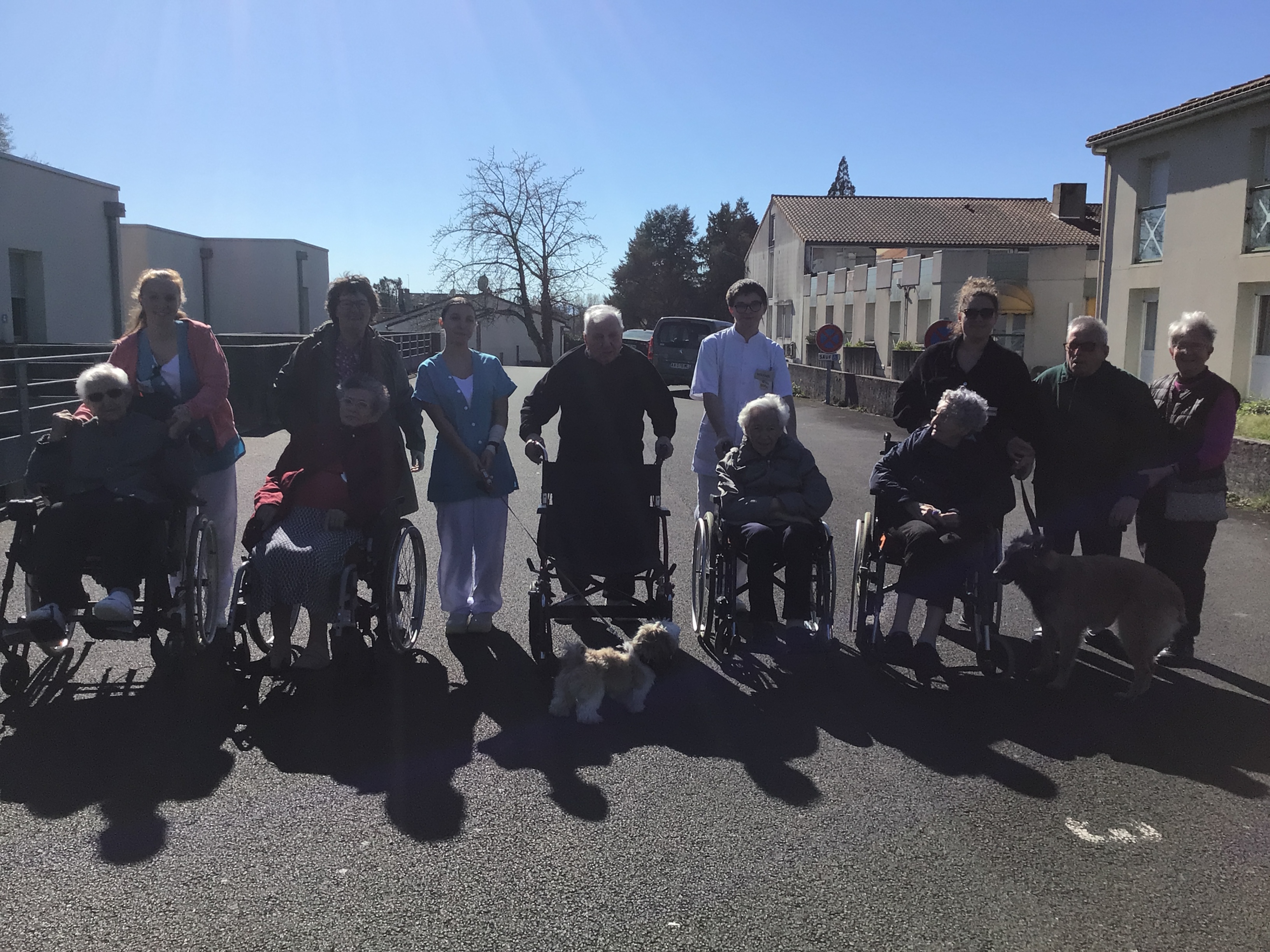 Un groupe de résidents est allé se promener dans les rues de Secondigny avec un accompagnateur à 4 pattes. Et oui, un chien bien éduqué avec son maître nous a accompagné sur toute la sortie. il faisait beau mais le vent du Nord soufflait.