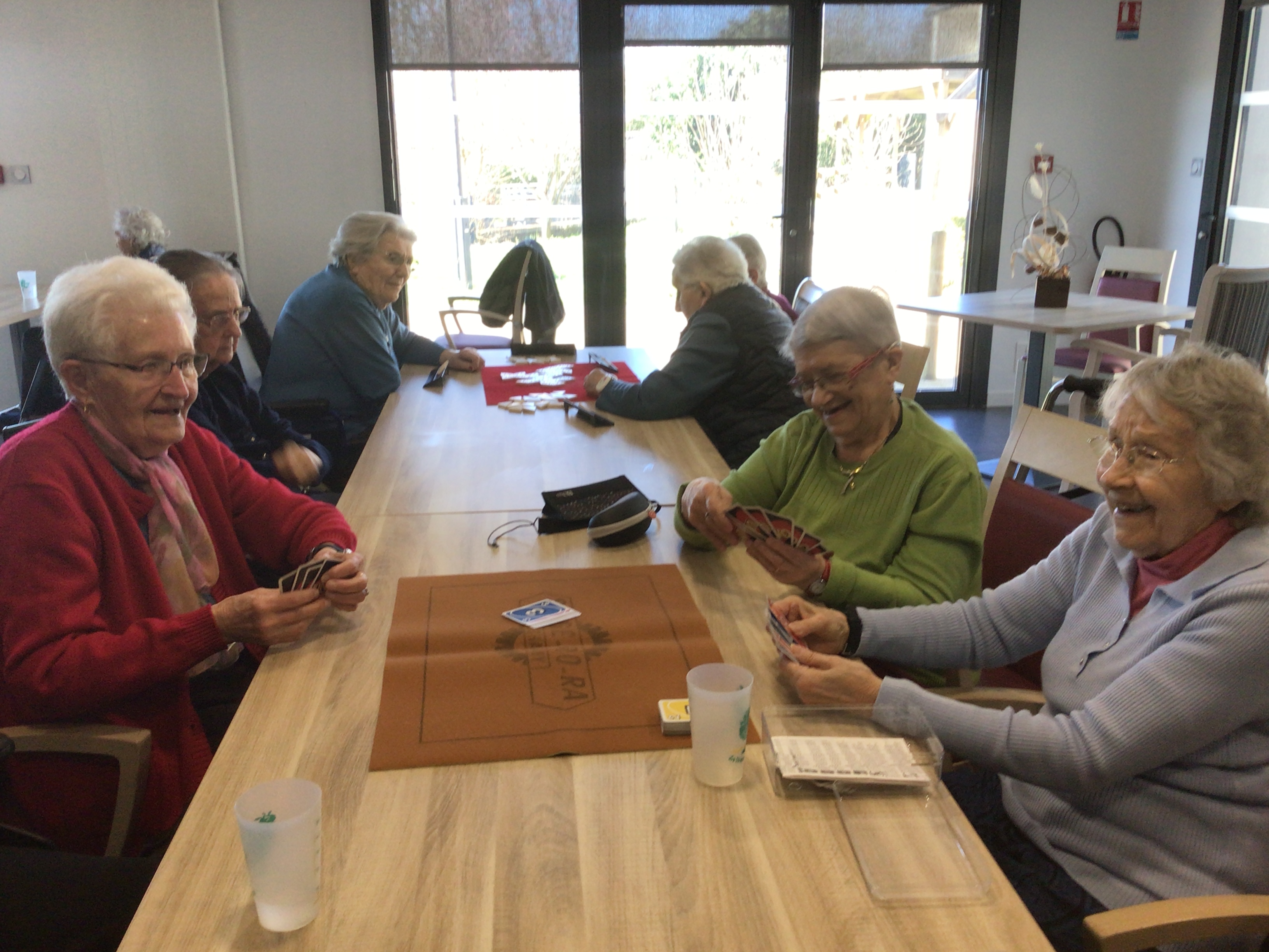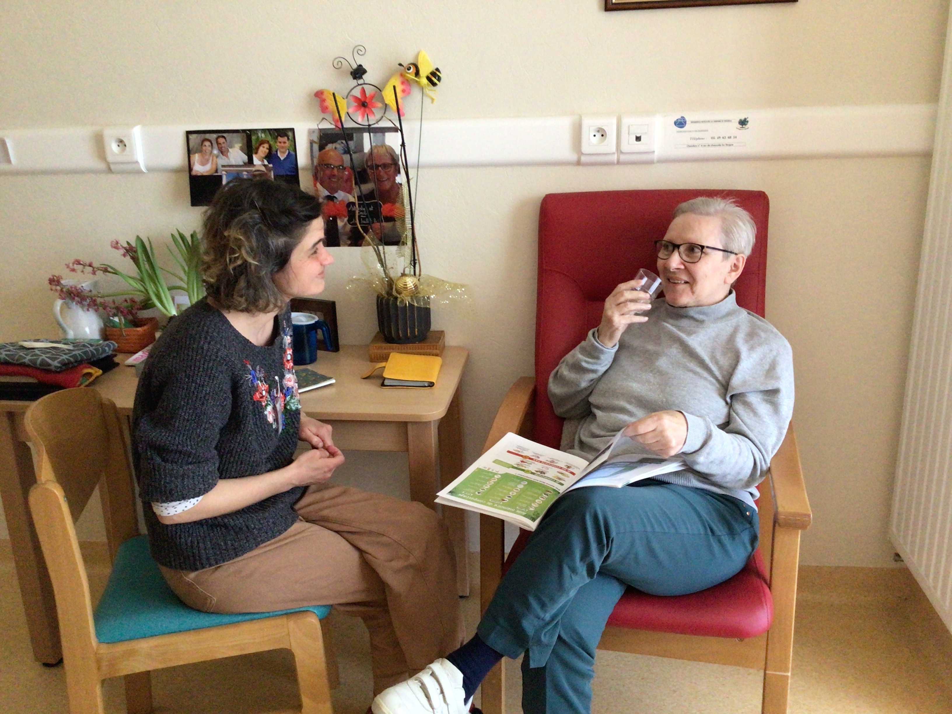 matinée: papote avec Violette: utilisation d'un livre à contes comme support et d'un bulletin communal. les résidents ont plaisir à retrouver Violette du Nombril du Monde tous les jours.