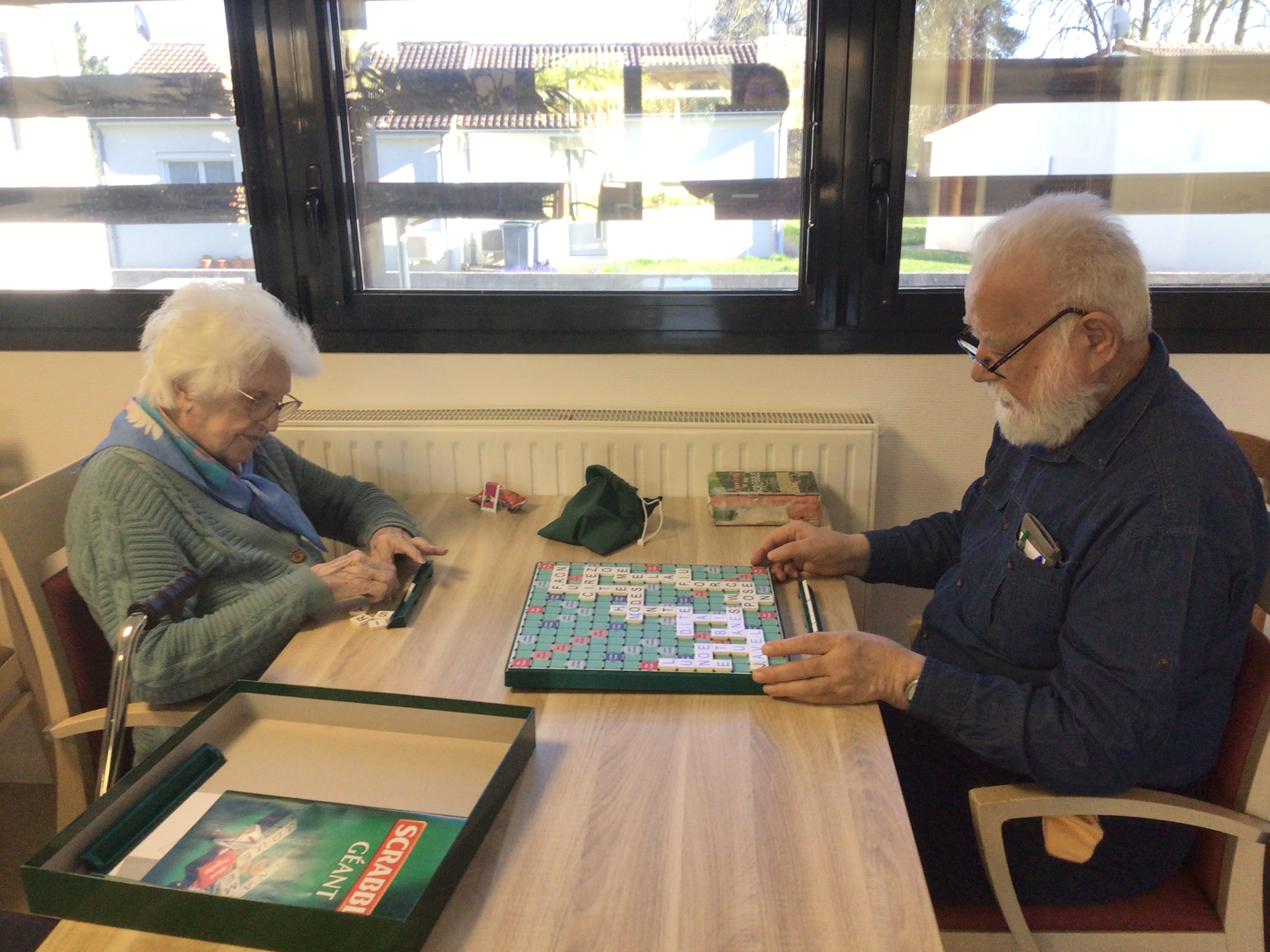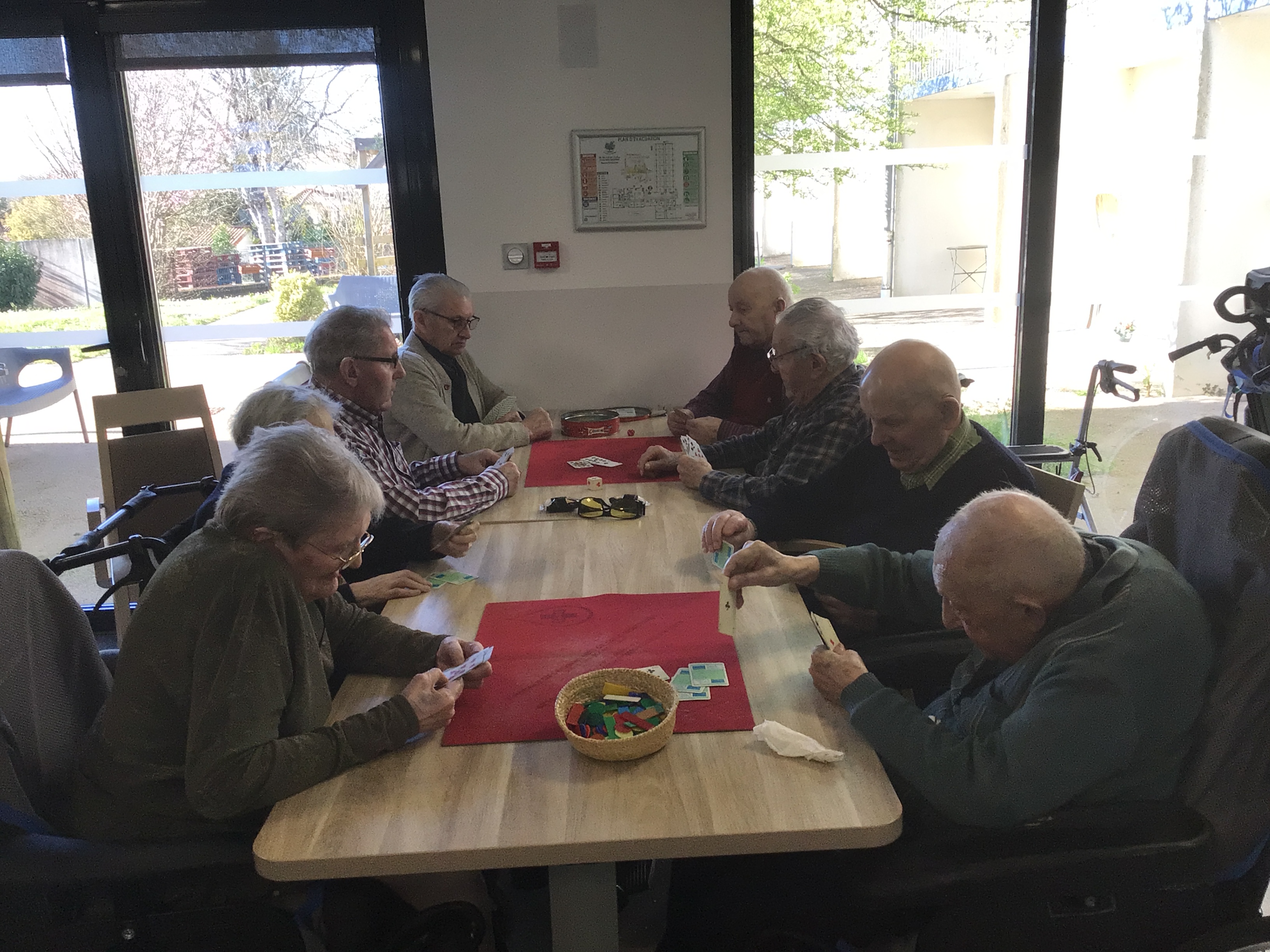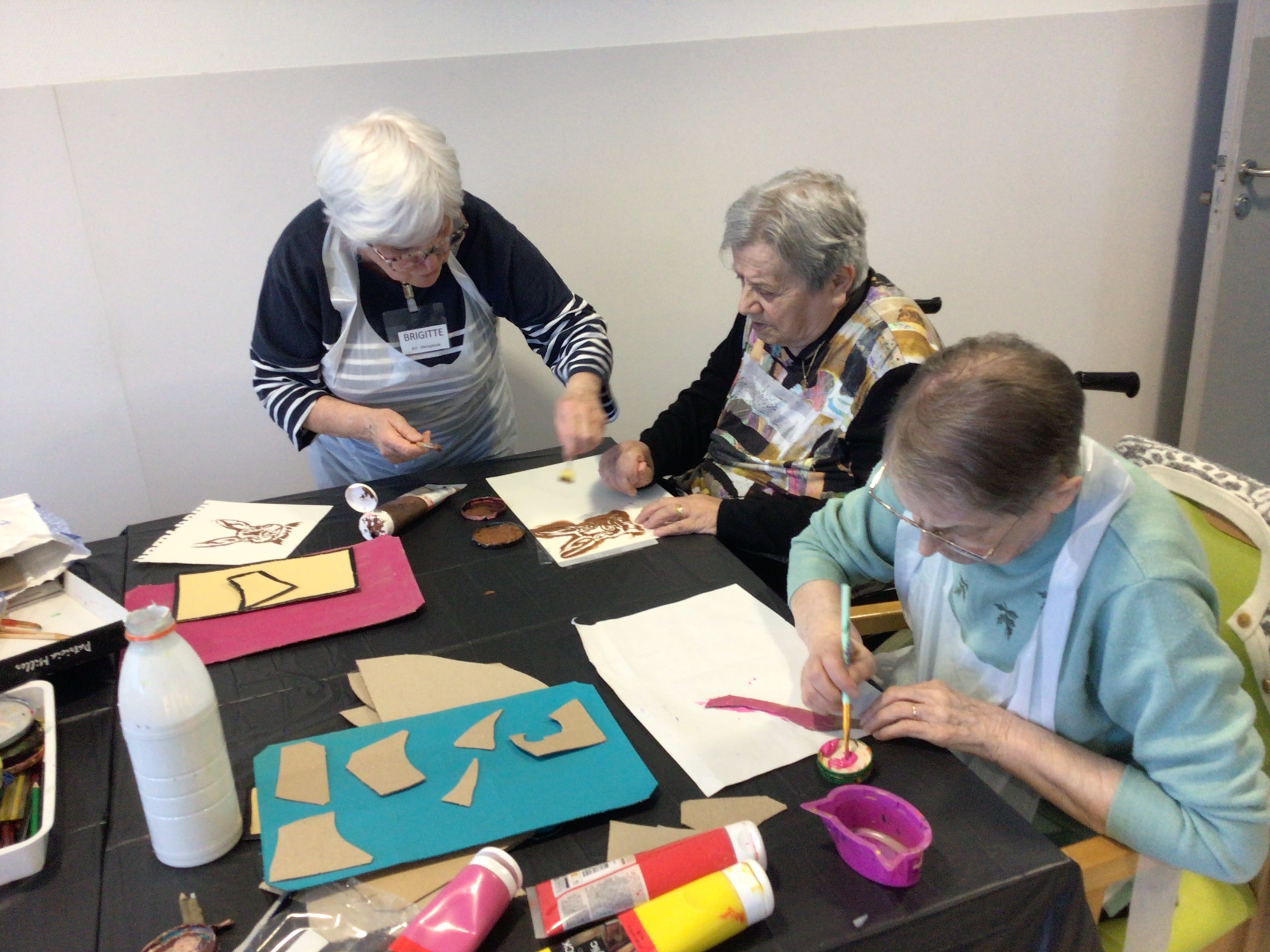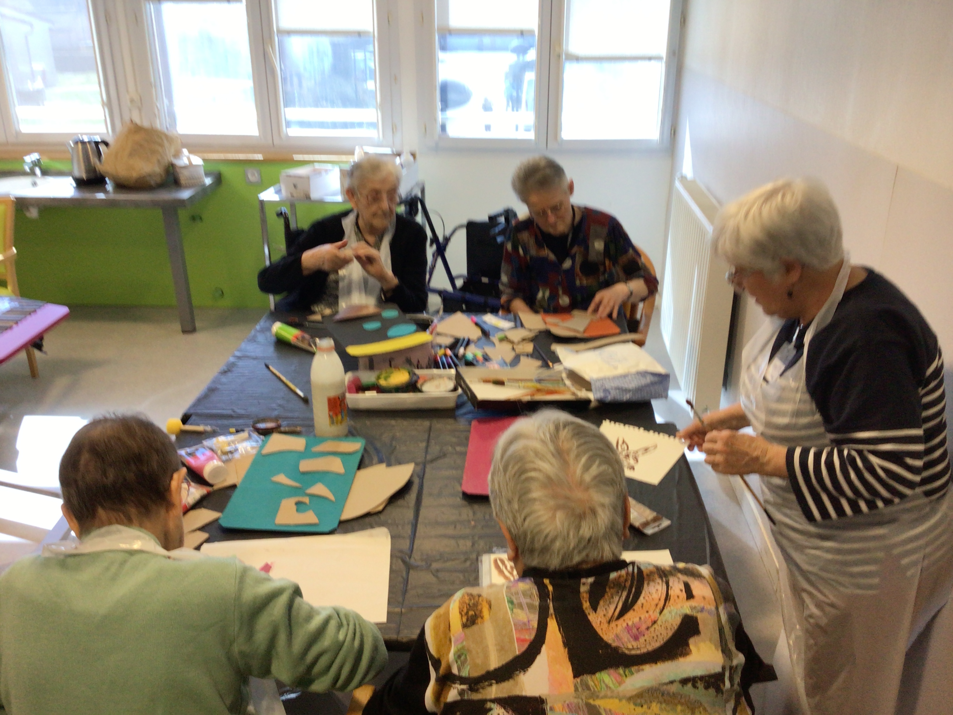 Après midi: art thérapie : le groupe prépare des supports de décoration pour Pâques à l'aide de pochoir. D'autres résidentes souhaitent continuer sur leurs oeuvres en vue d'une exposition fin mai sur le thème Gaston Chaissac.