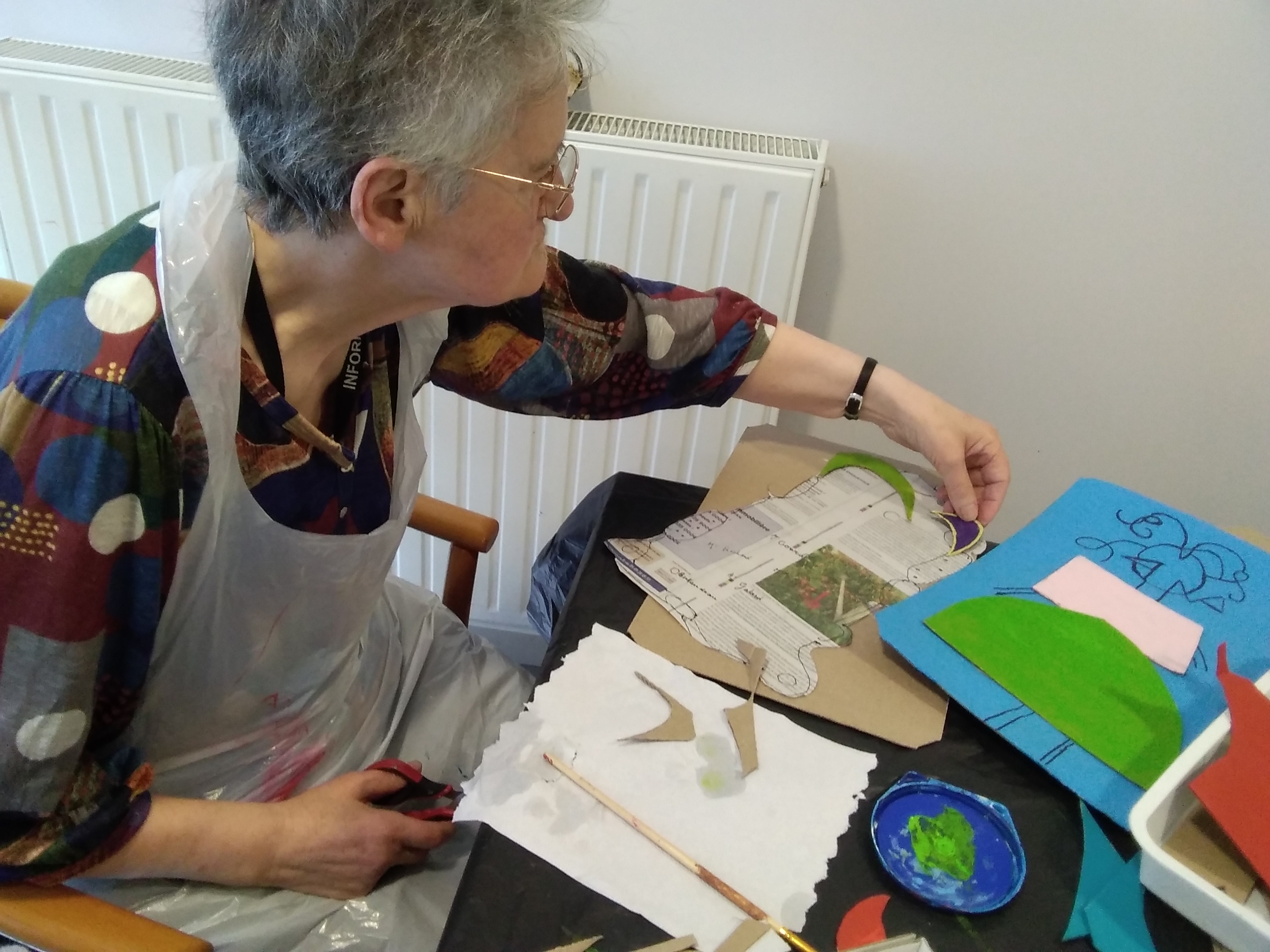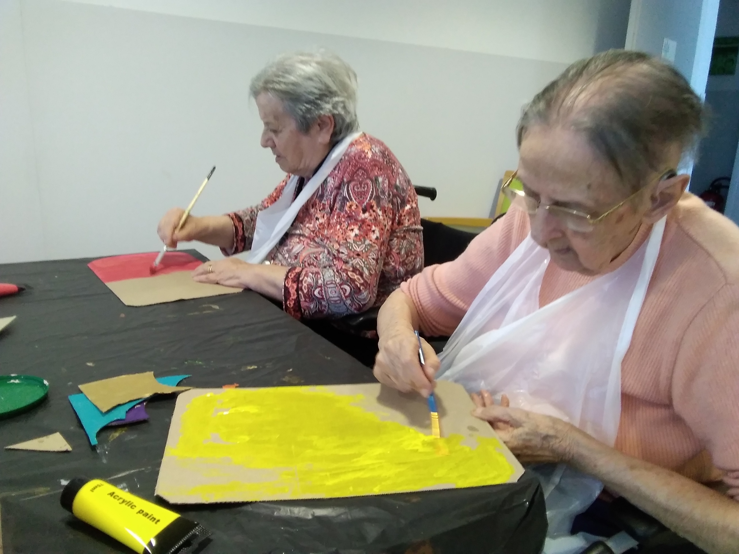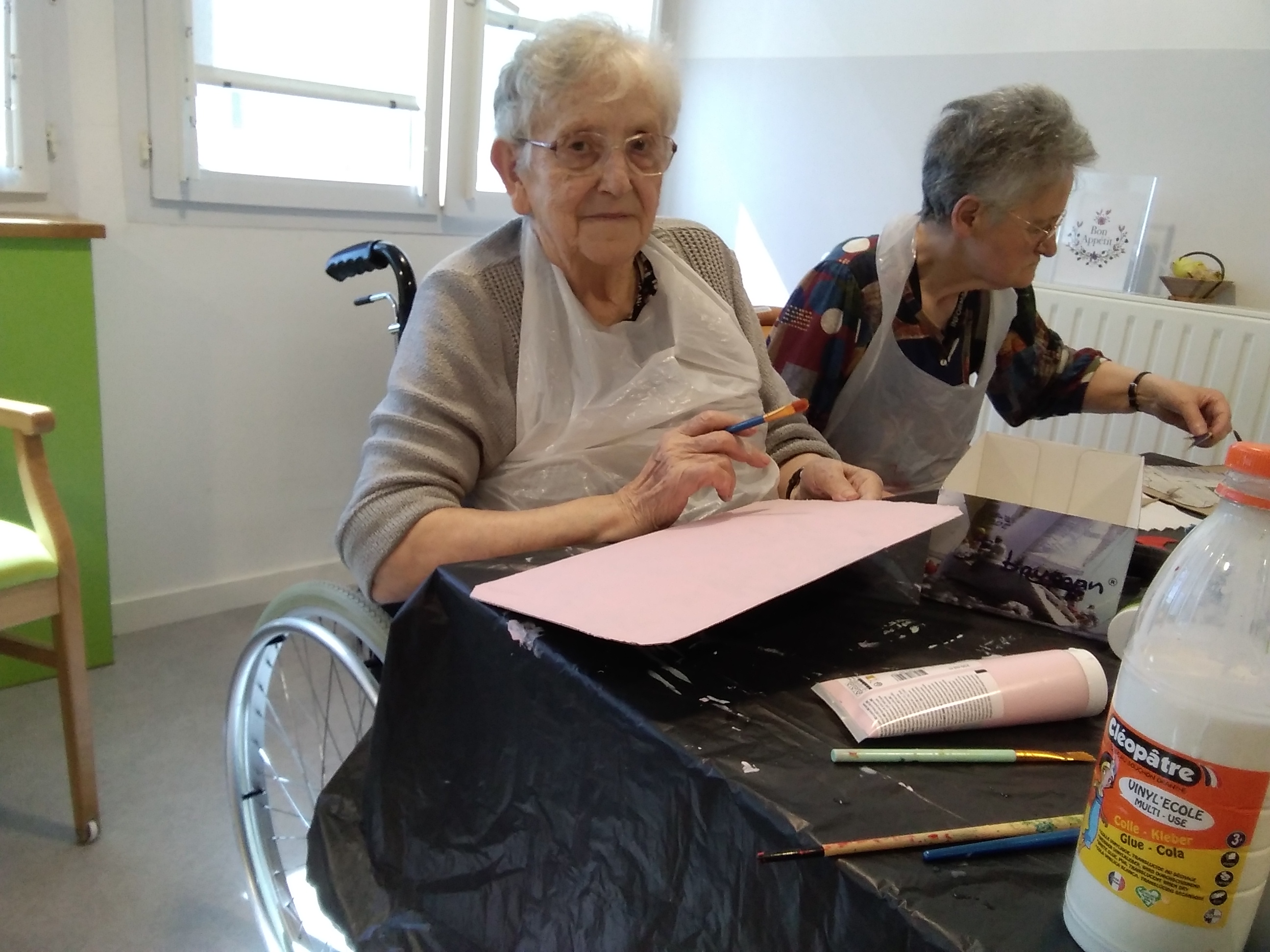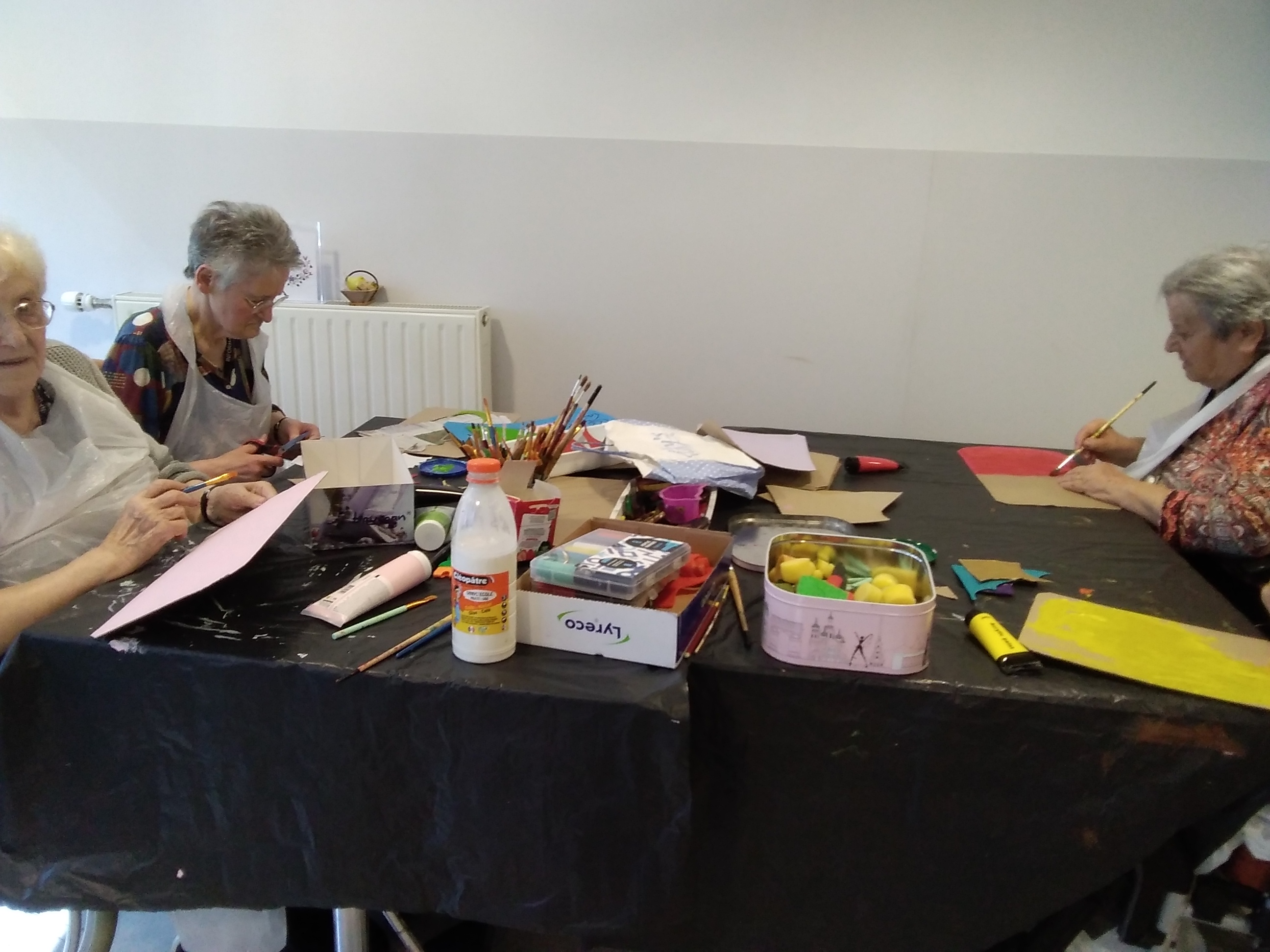 -Brigitte Belaud Art thérapeute a proposé des séances individuelles (musique, lecture…) dans les chambres pour certains ce matin et a retrouvé son groupe de résidentes cet après-midi ; un groupe qui continue des créations autour des œuvres de Gaston Chaissac pour une exposition prévue très prochainement…