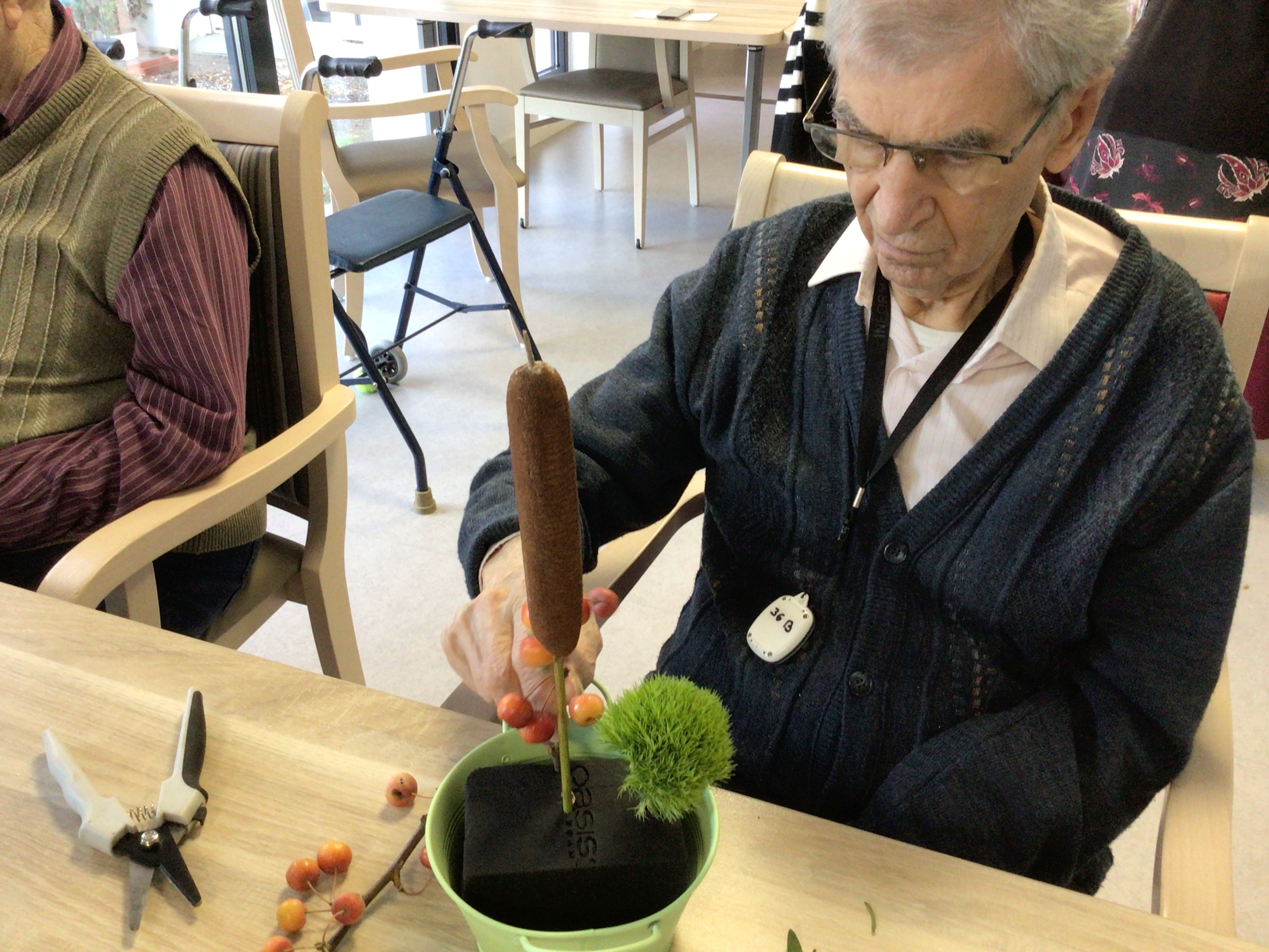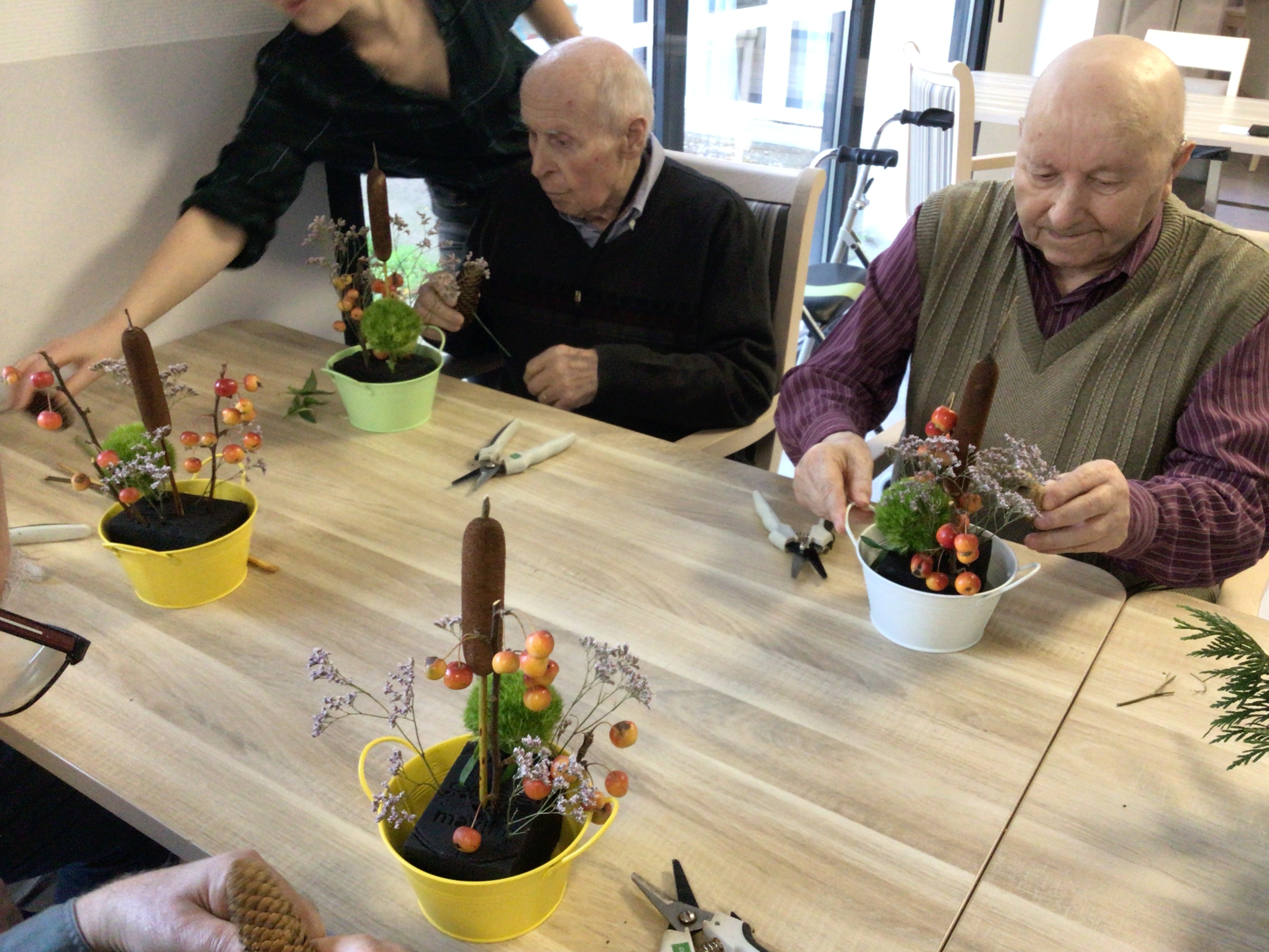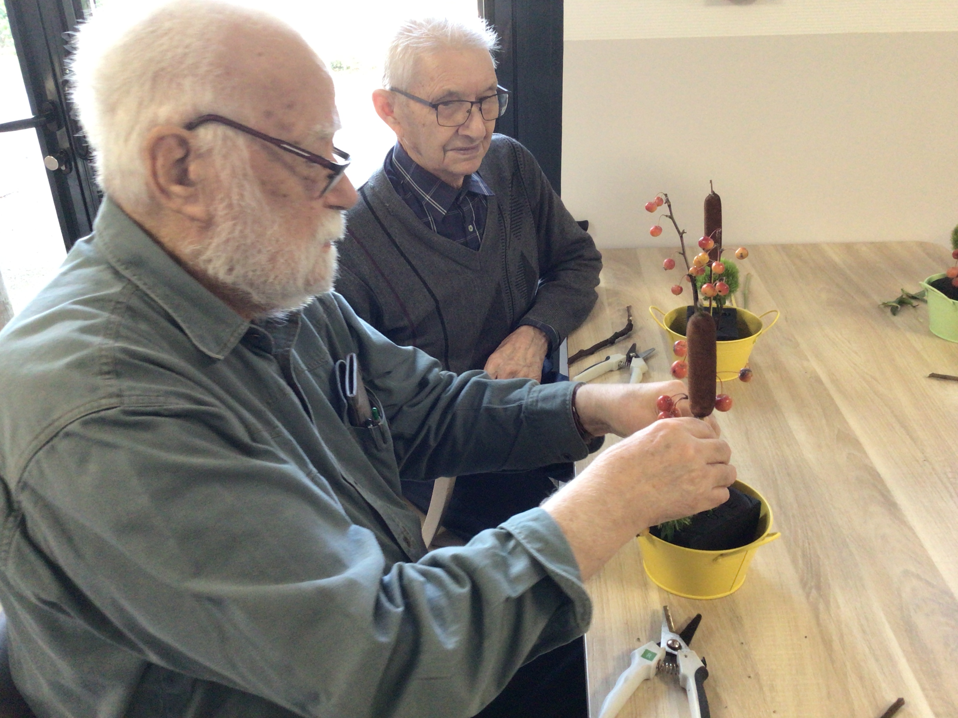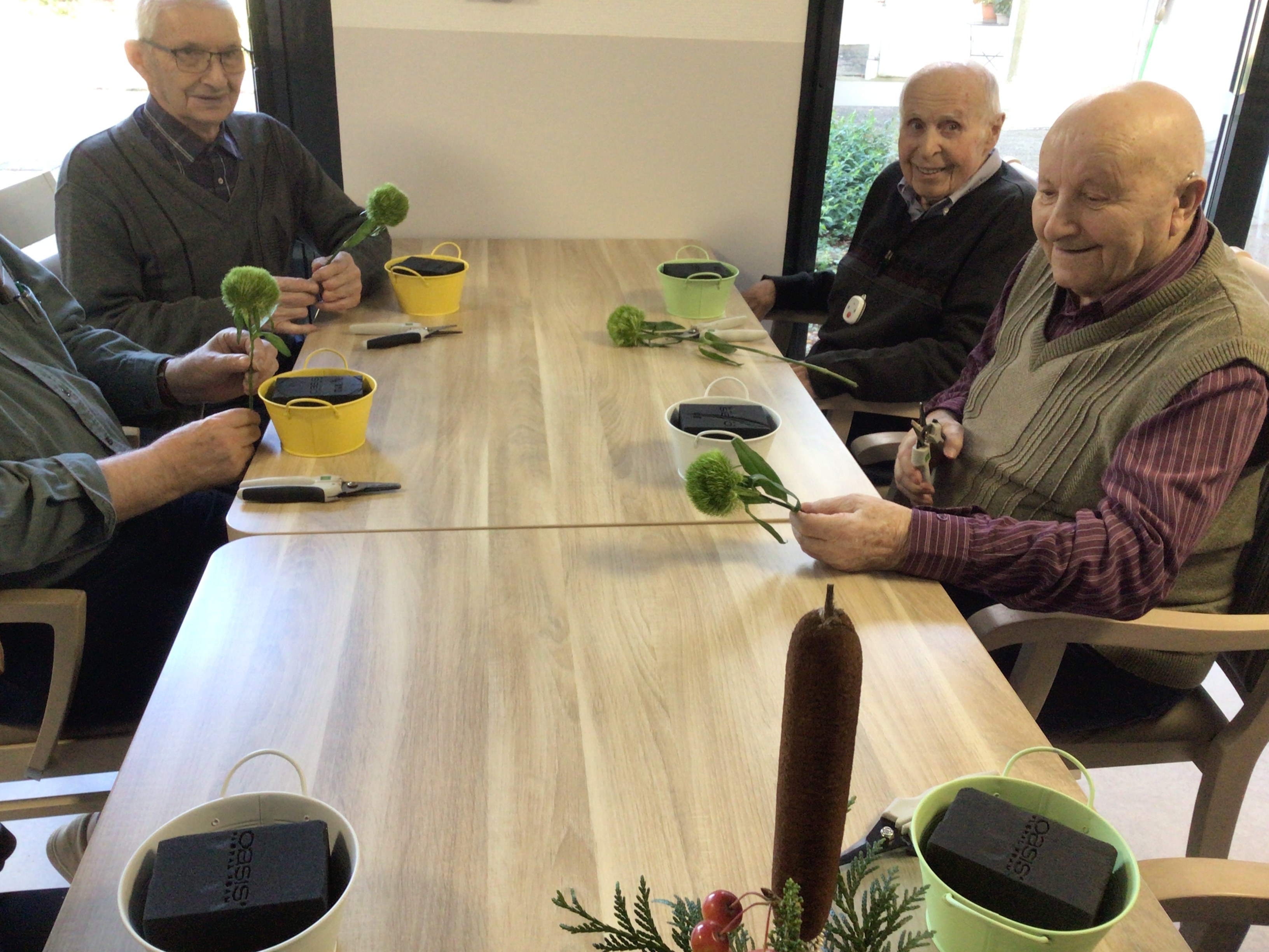 -Art floral avec Honorine la fleuriste de Secondigny et Jacqueline notre bénévole pour un groupe de Messieurs très volontaires . Ambiance très studieuse...