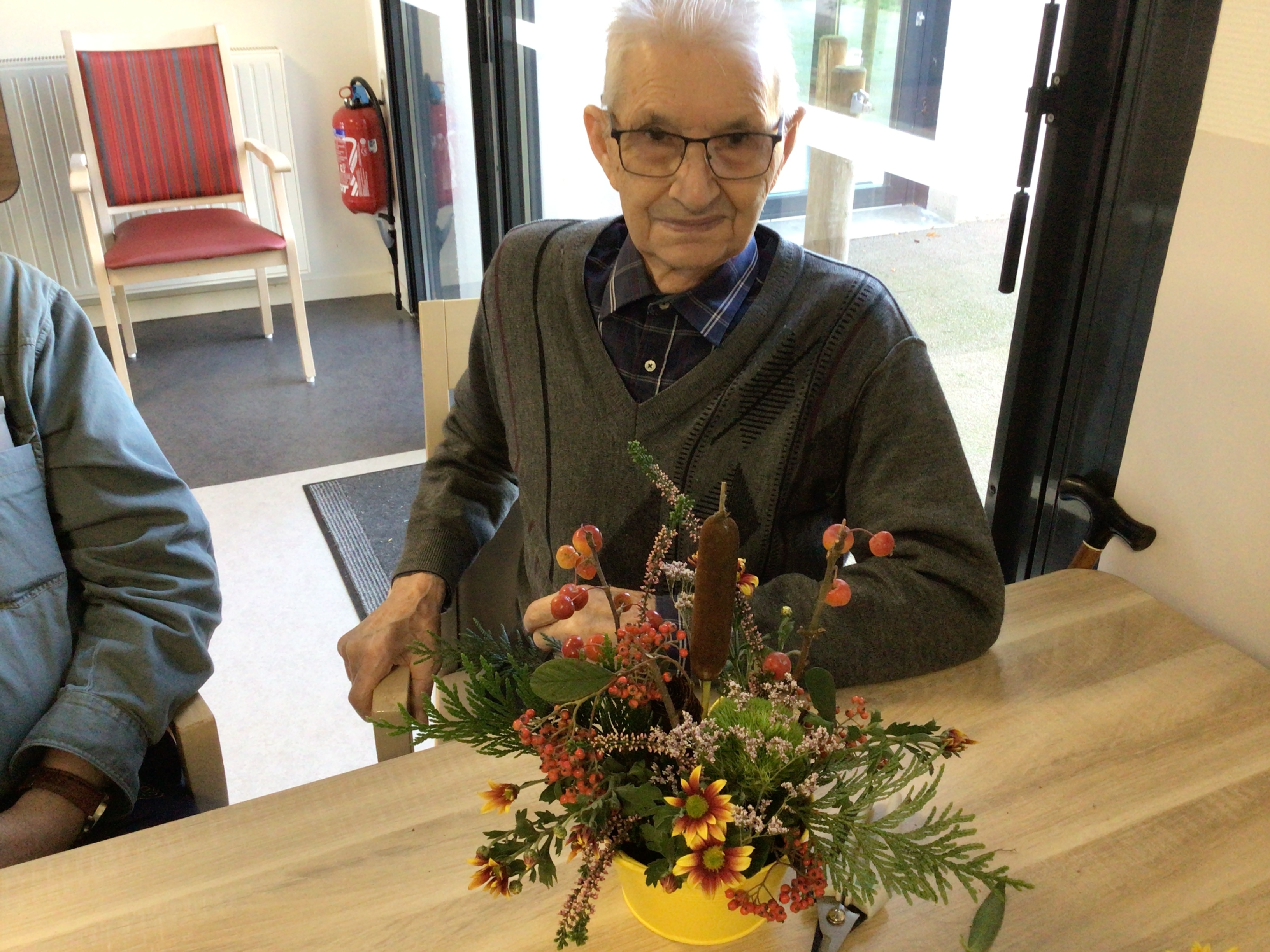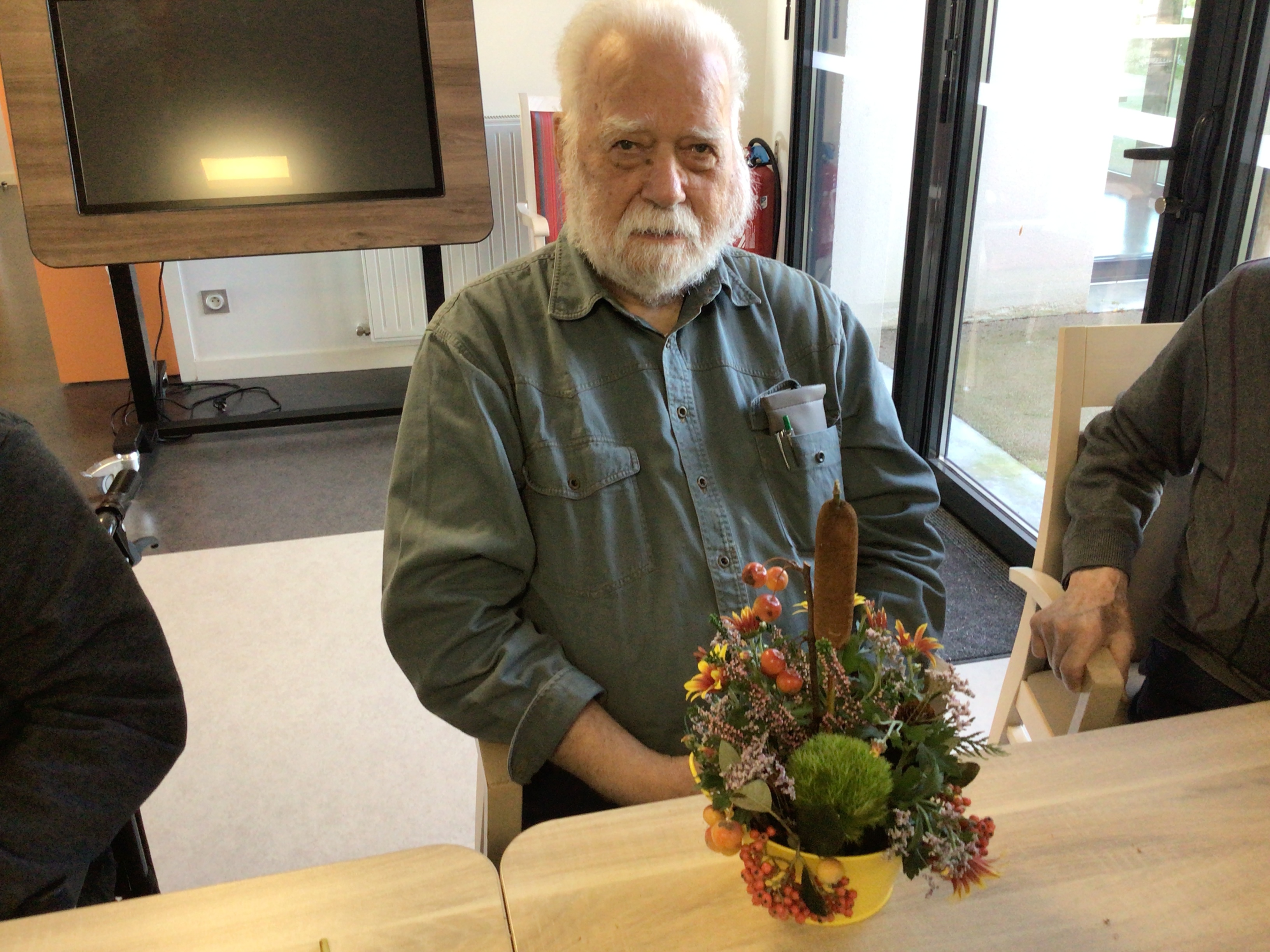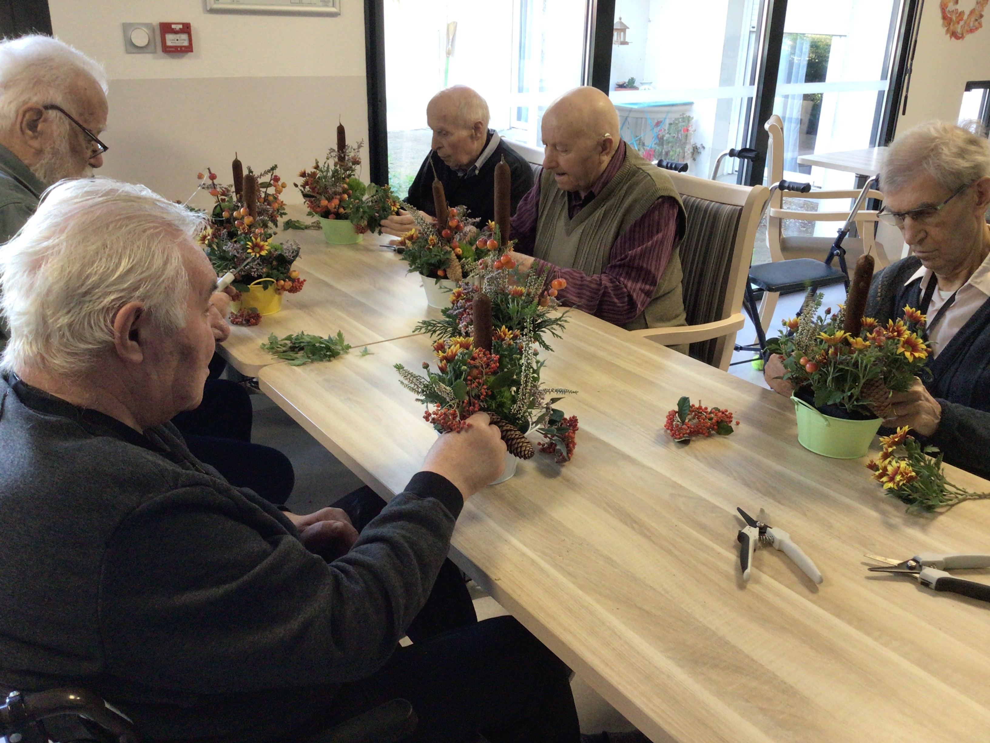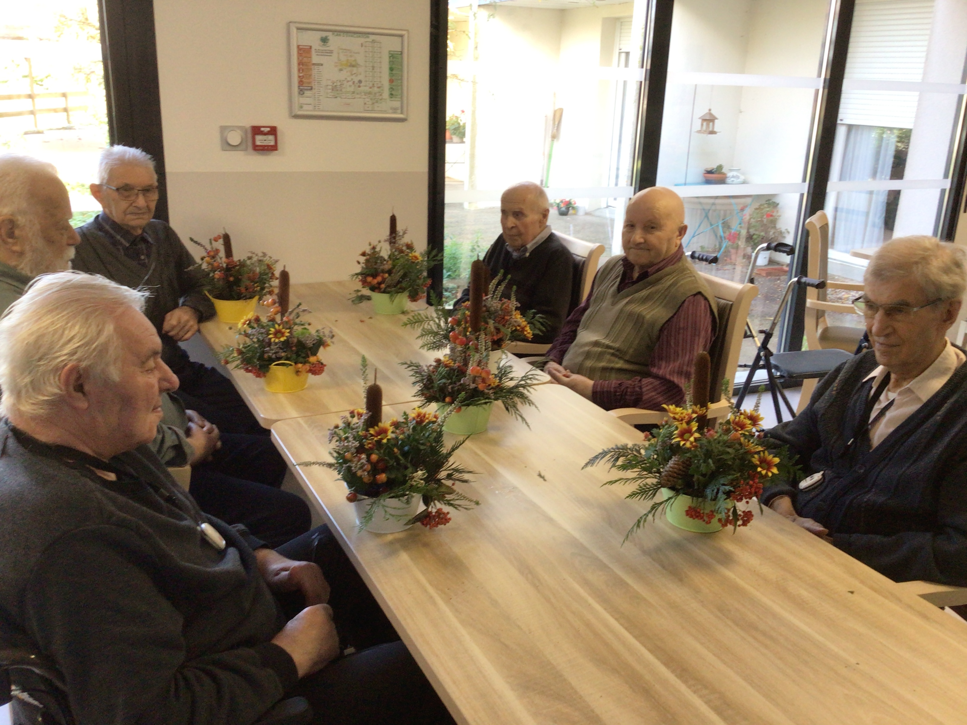 -Art floral avec Honorine la fleuriste de Secondigny et Jacqueline notre bénévole pour un groupe de Messieurs très volontaires . Ambiance très studieuse...