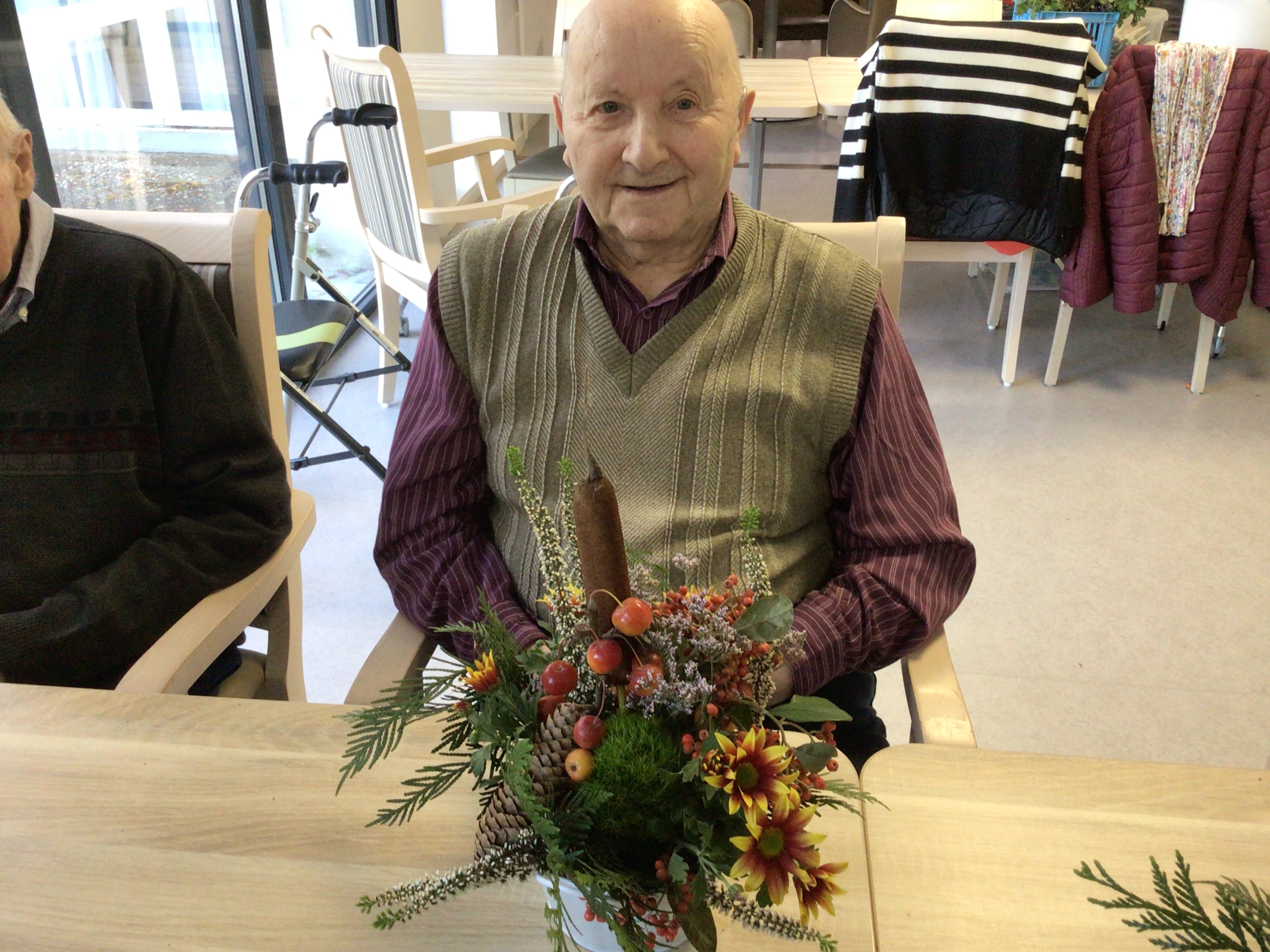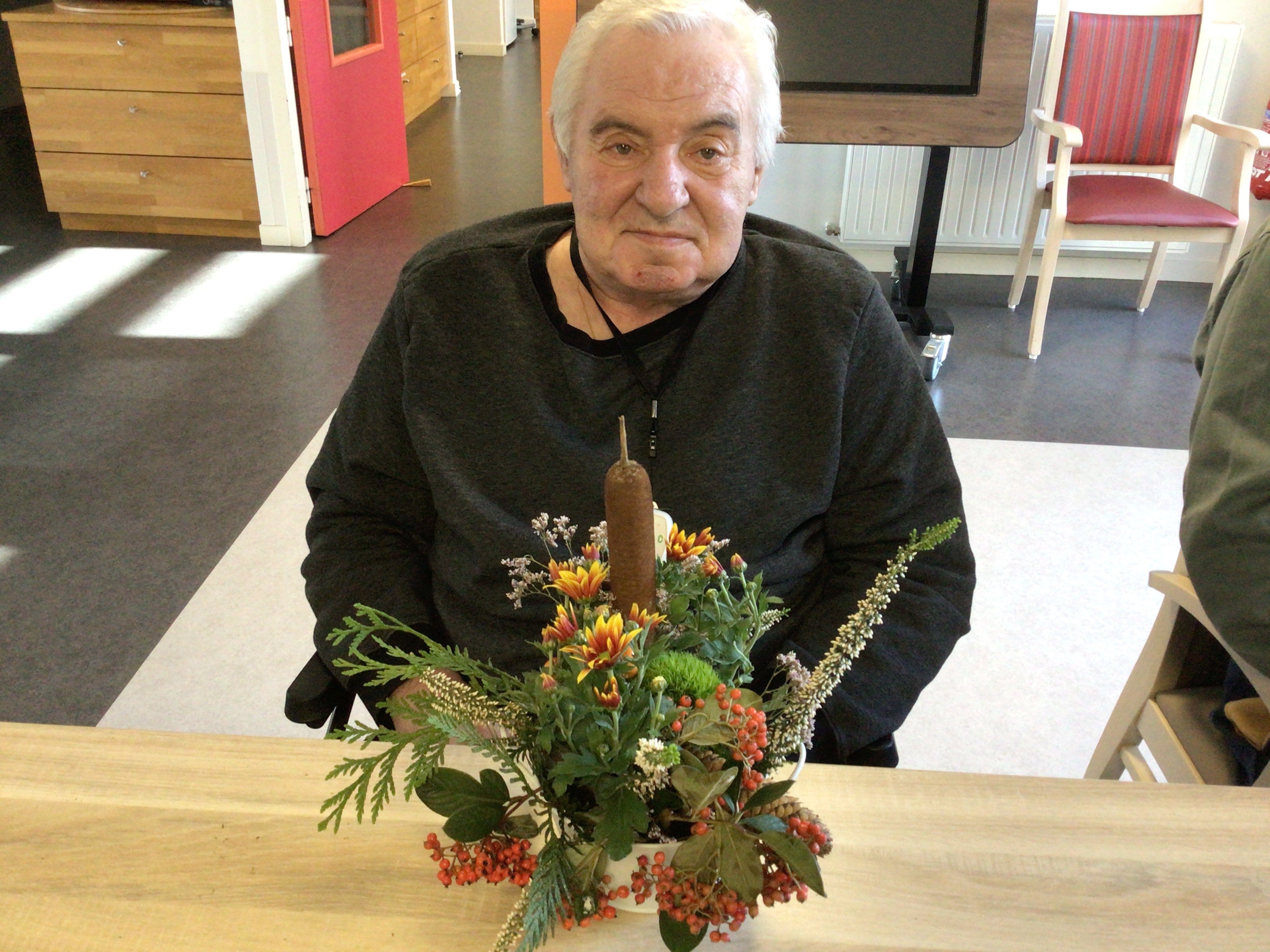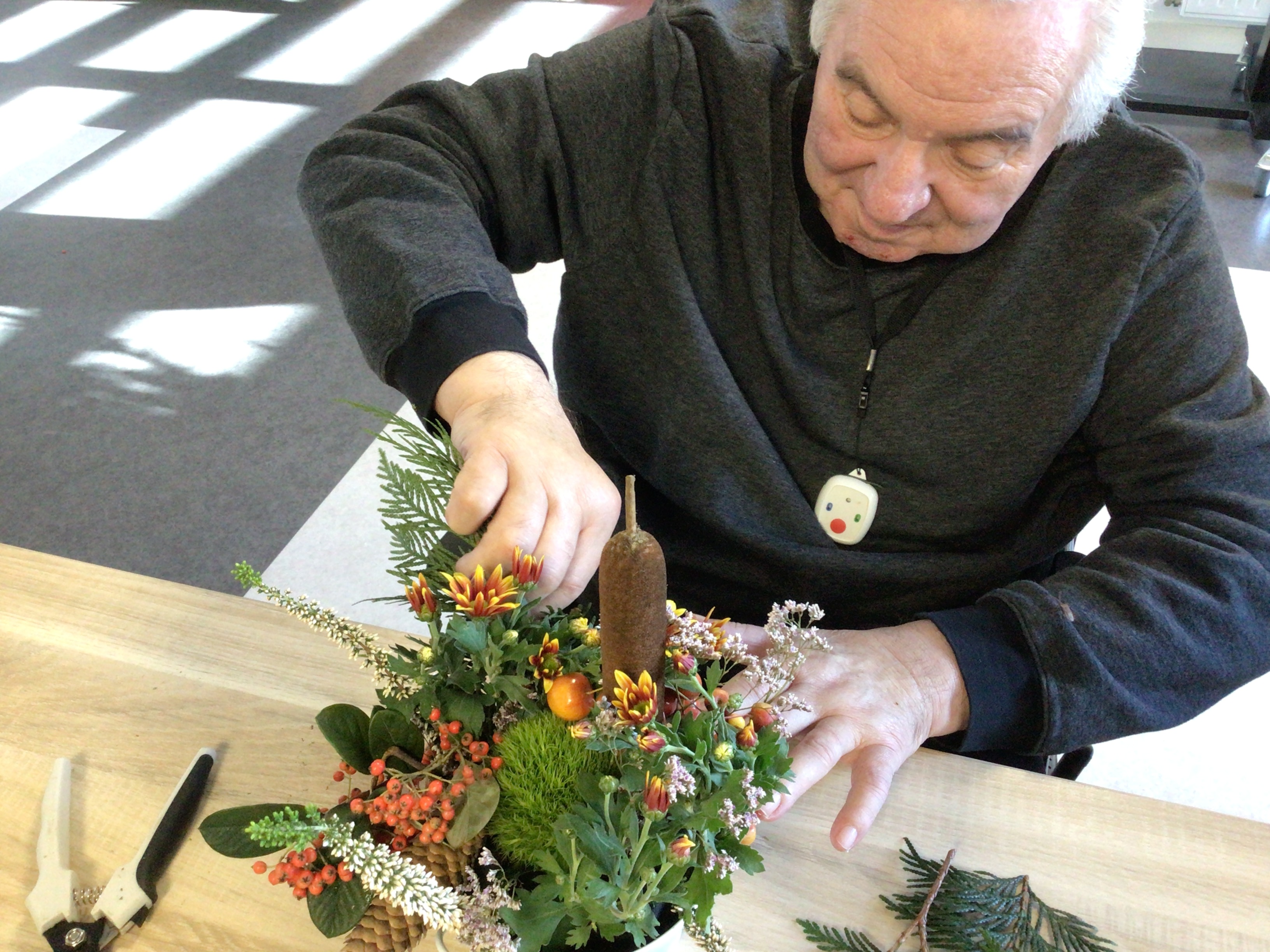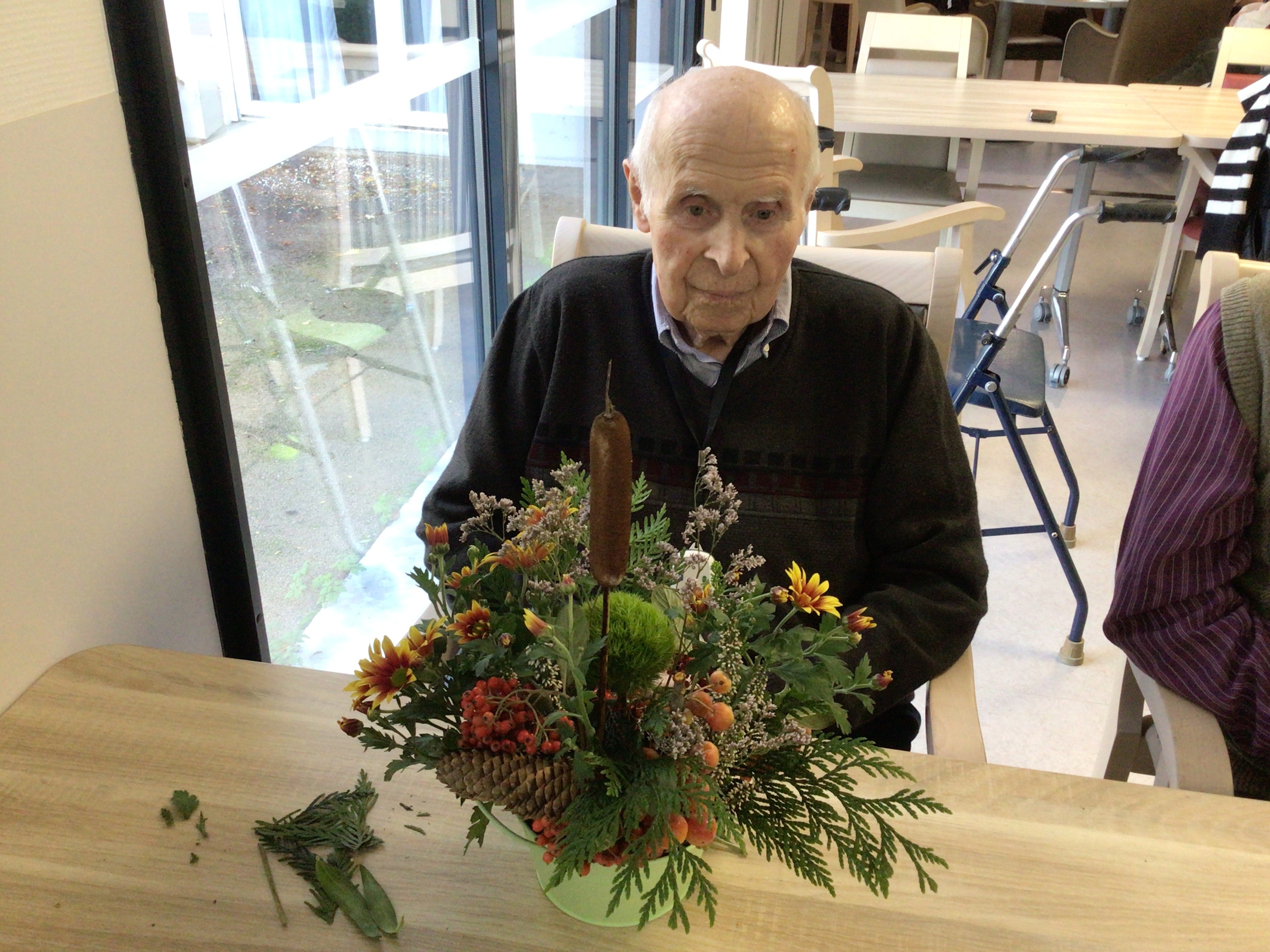 -Art floral avec Honorine la fleuriste de Secondigny et Jacqueline notre bénévole pour un groupe de Messieurs très volontaires . Ambiance très studieuse...