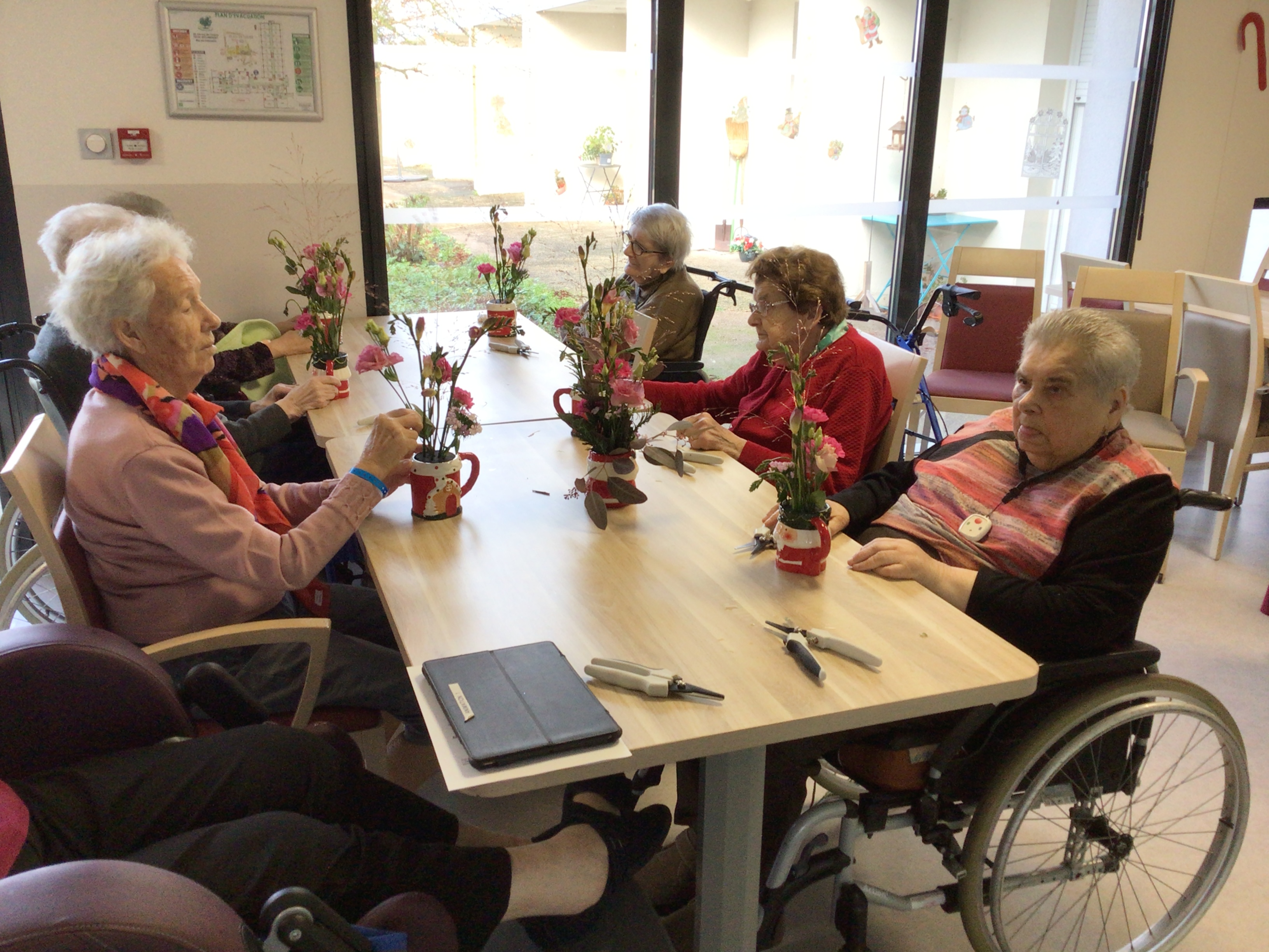 -Honorine la fleuriste a proposé à un petit groupe de résidentes de réaliser une belle composition florale sur le thème de Noël.