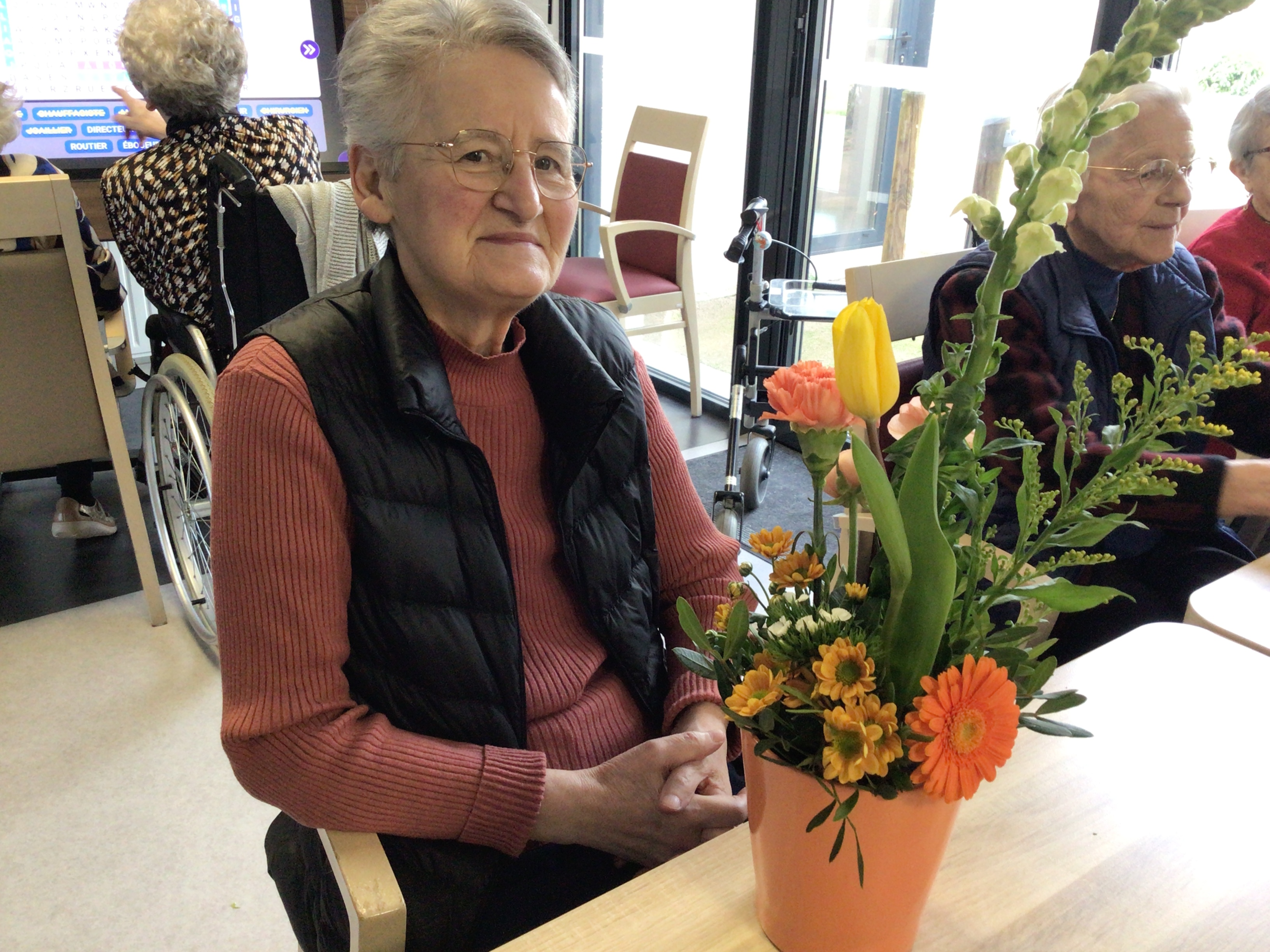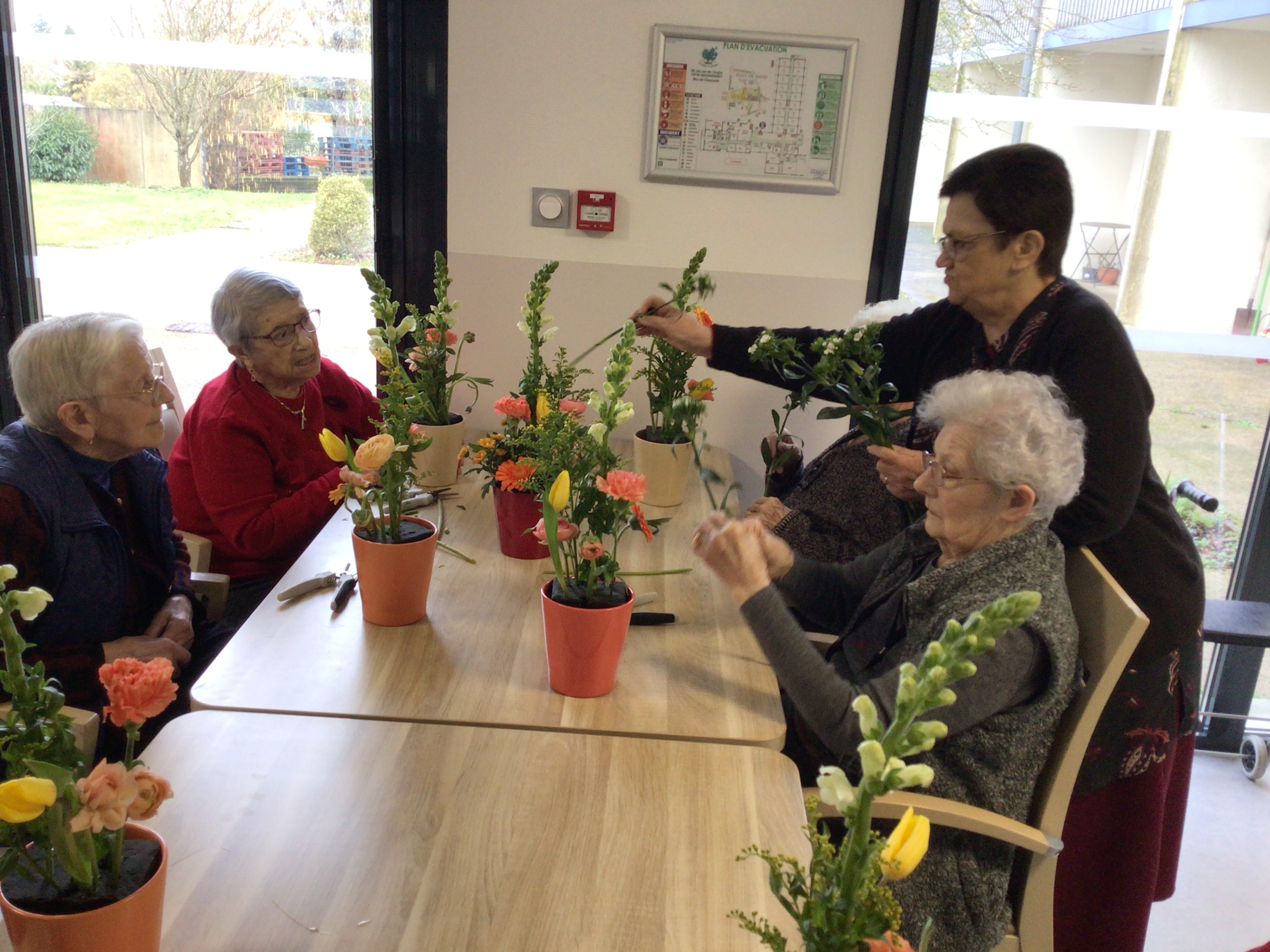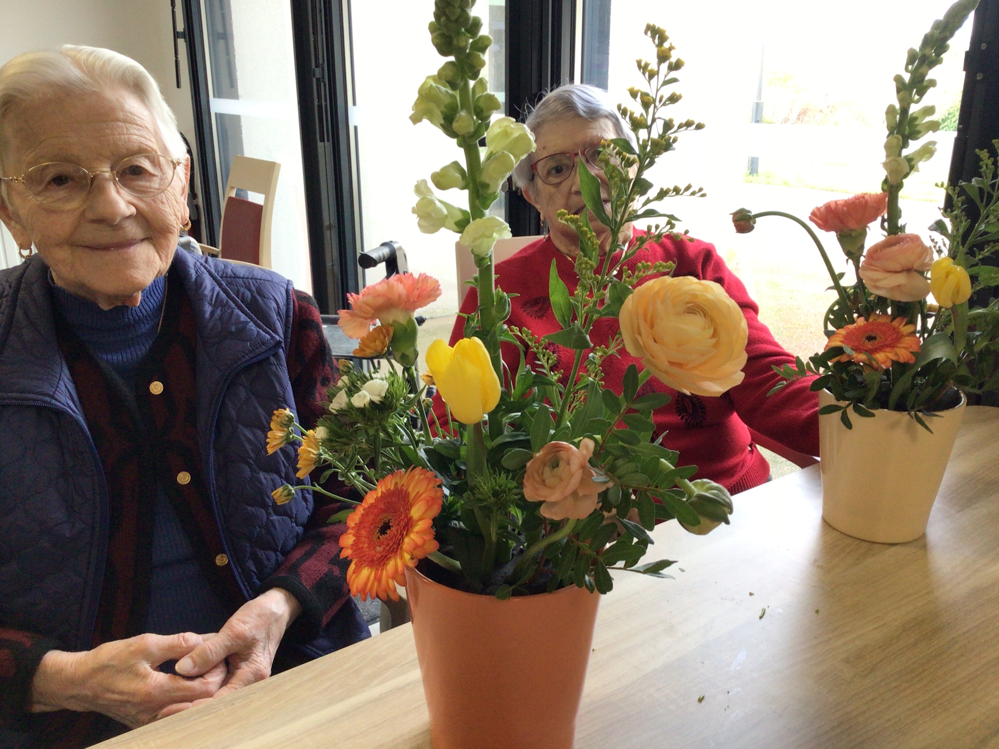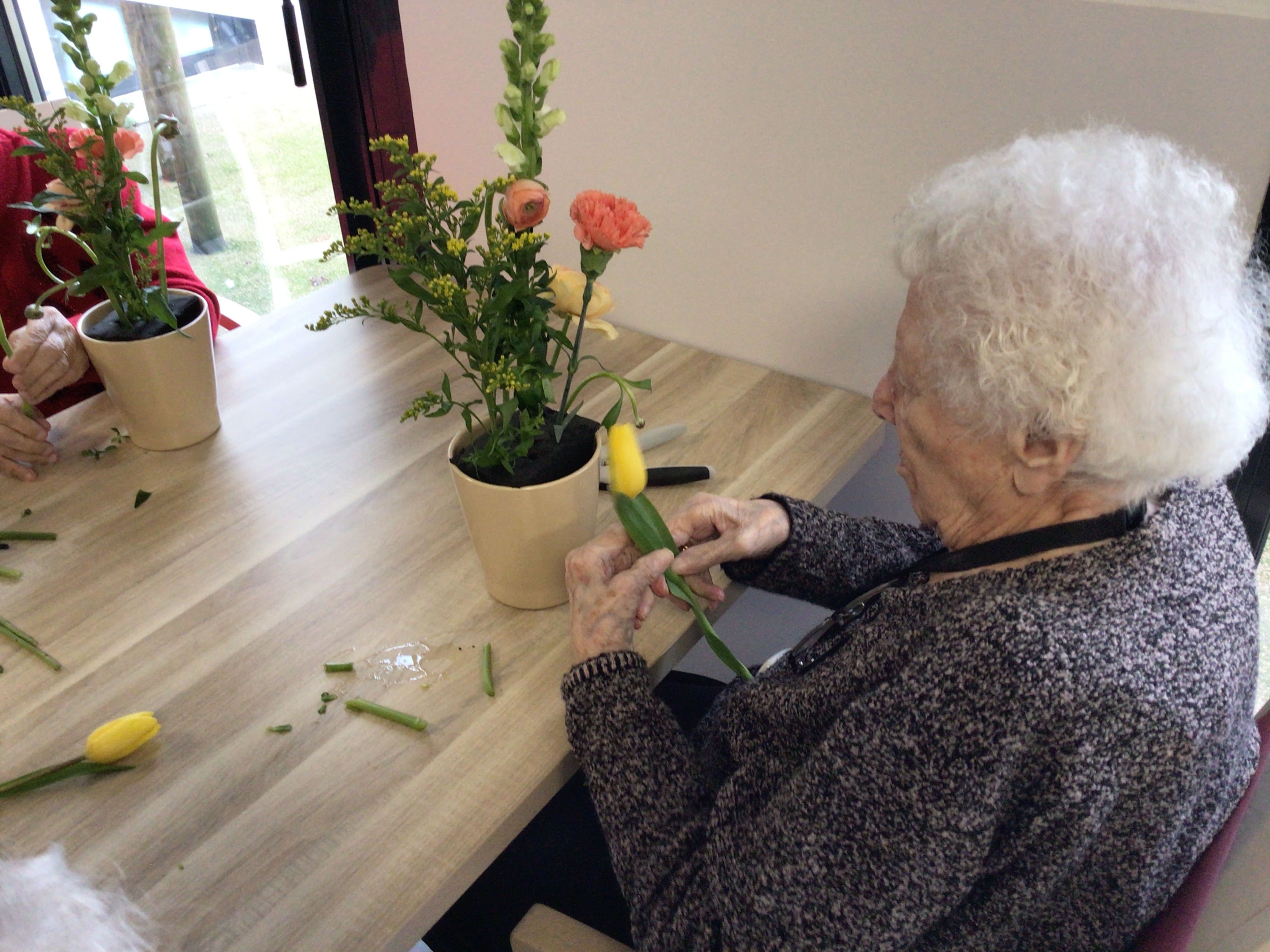 art floral ce matin en compagnie d'honorine de Miletunefleurs Honorine et de notre bénévole Jacqueline : création d'une composition florale pour agrémenter sa chambre. En suivant les consignes de la fleuriste, chaque résidente réalise sa composition florale et en bavardant.
