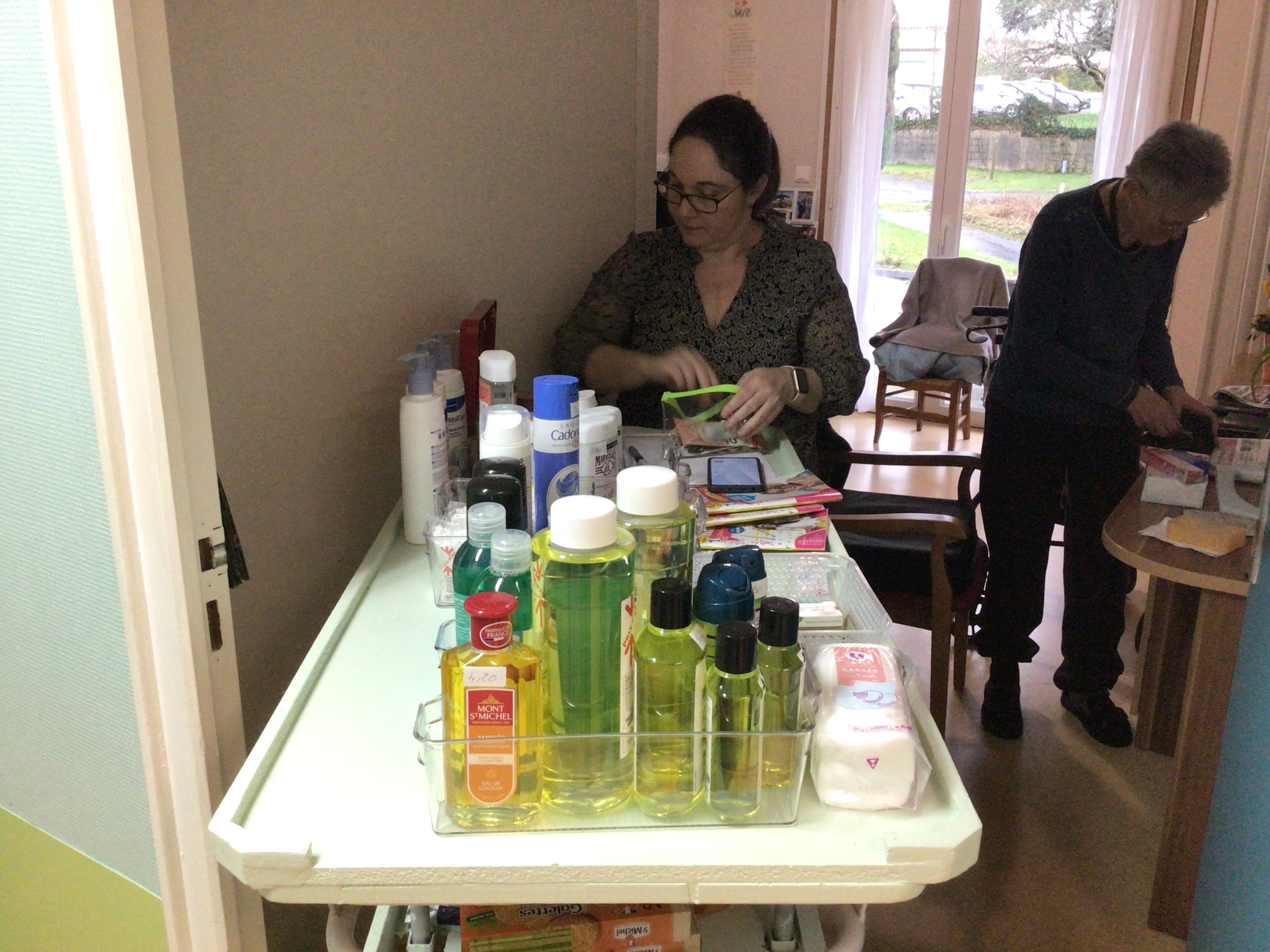Ce matin, Sophie était dans les couloirs de la résidence avec sa boutique ambulante. Ce service propose aux résidents un petit commerce ambulant, les résidents ont la possibilité d’acheter des produits de première nécessité et également des gâteaux, des confiseries... C'est un service très apprécié des résidents, un RDV mensuel au sein de l'EHPAD.