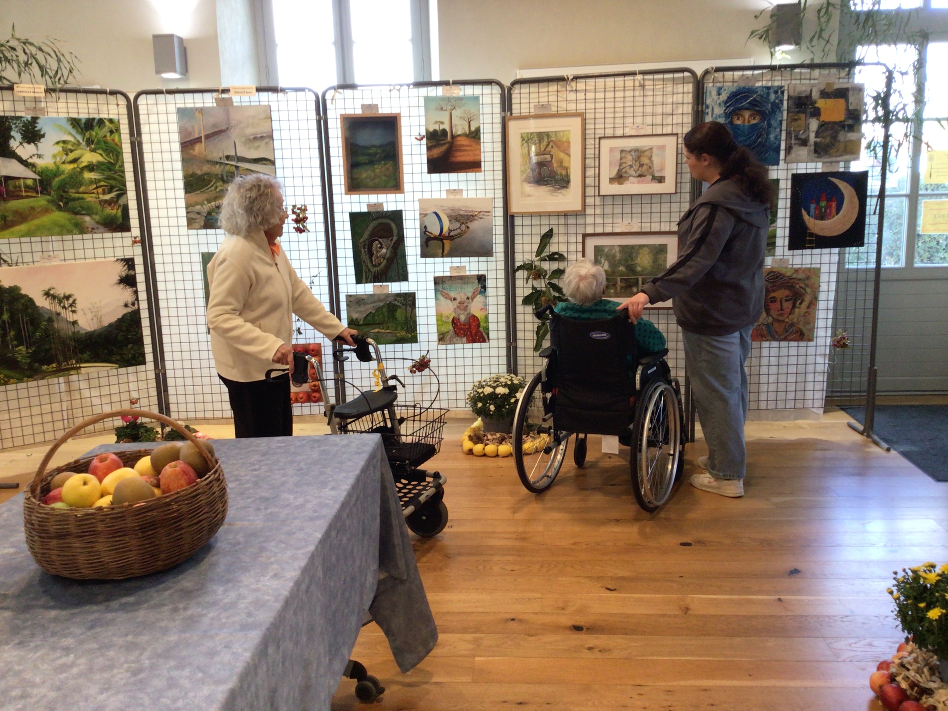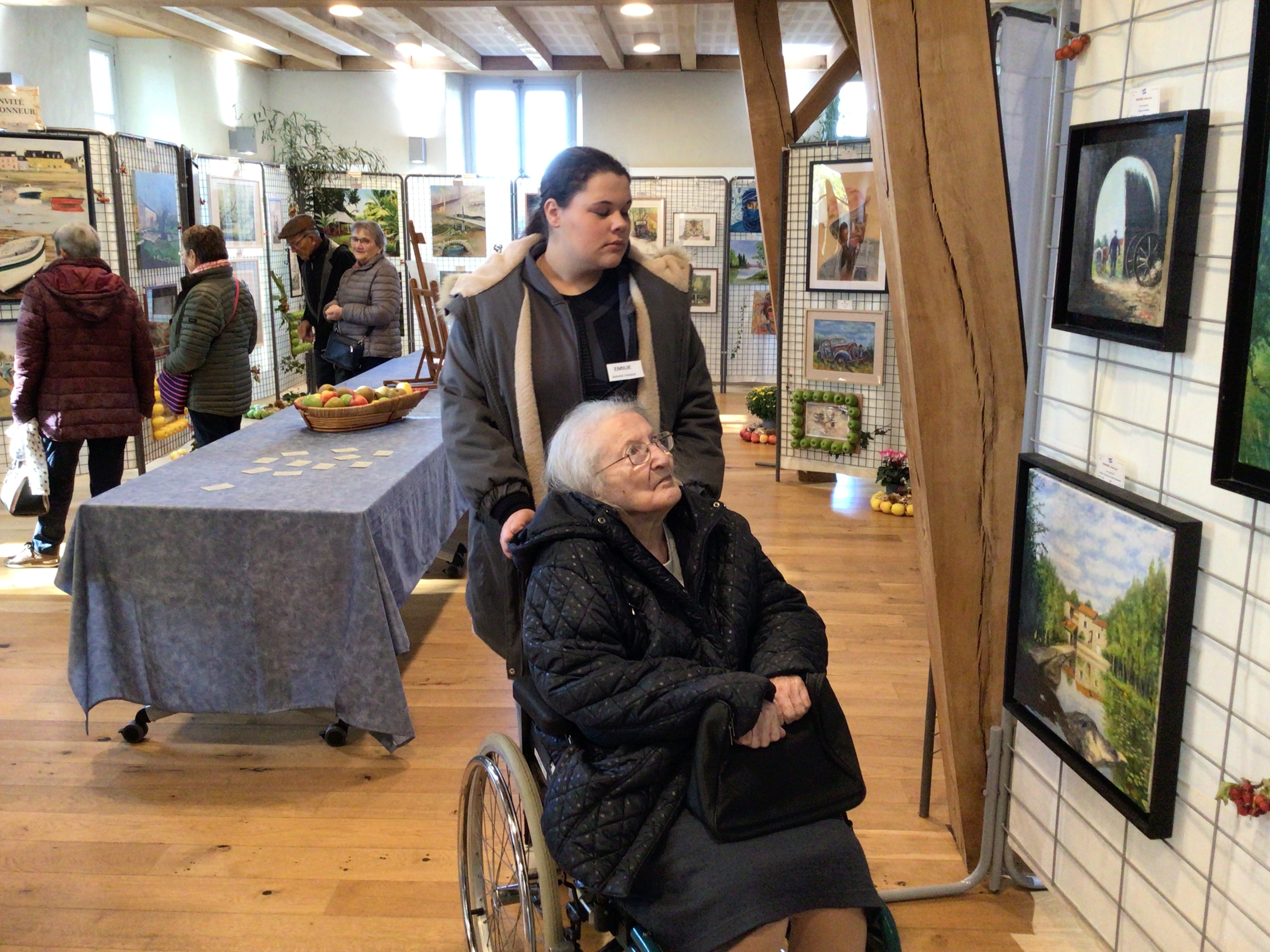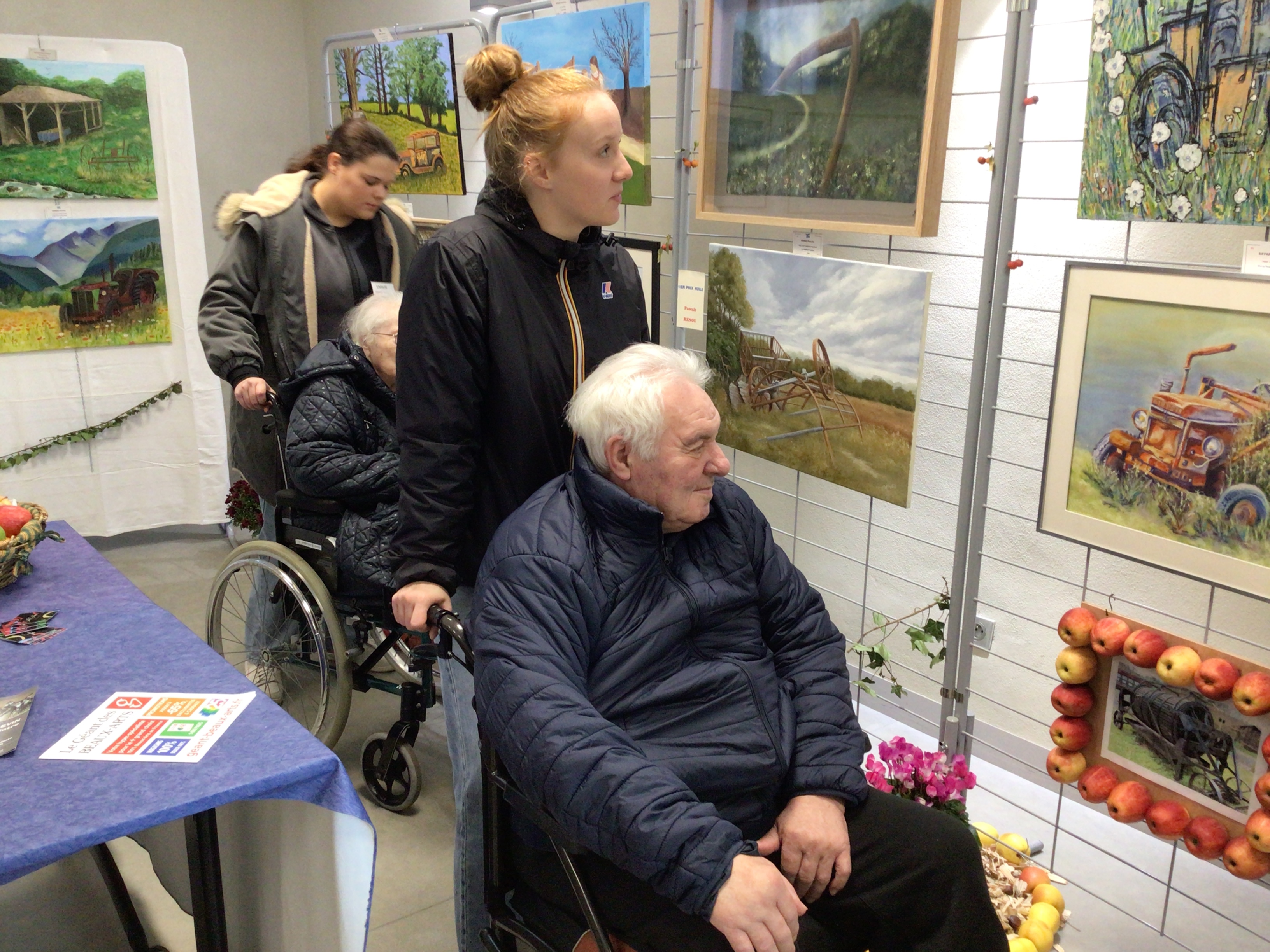 Dans le cadre de Pomm'expo, les résidents de l'Ehpad sont allés ce matin , visiter le salon de peinture qui rend hommage au patrimoine agricole : vestiges de matériels, voitures anciennes et outils d’autrefois revisités par les artistes.