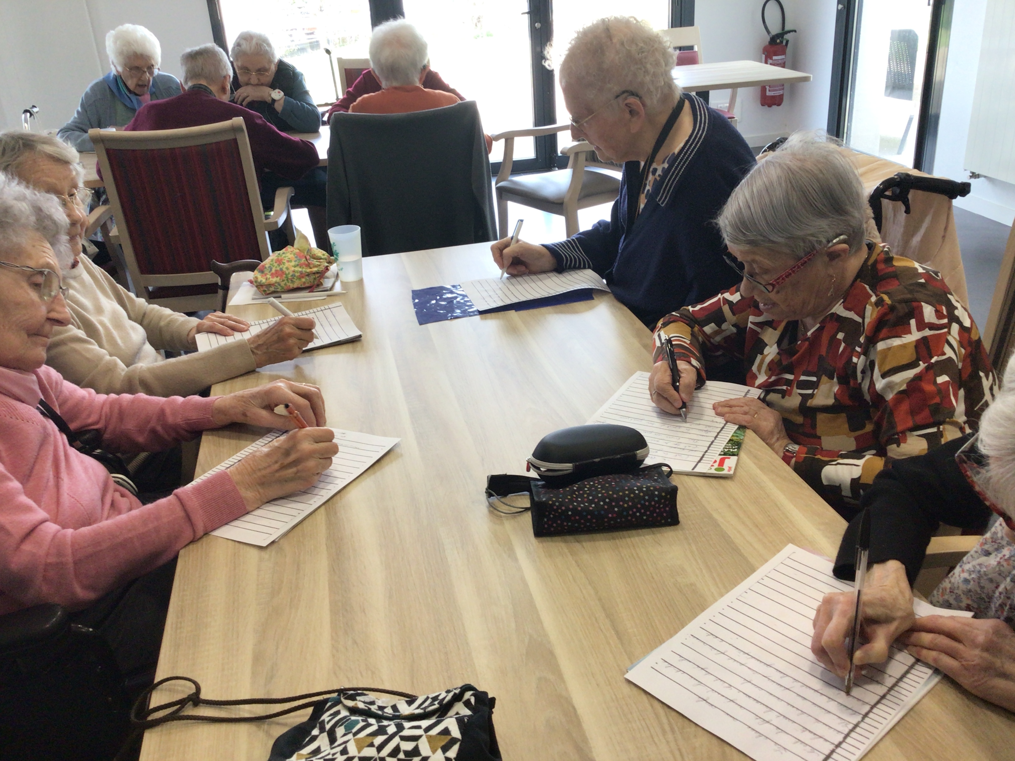 -Dictée : Certains résidents ont participé de manière active et studieuse à la dictée sur le thème de « Pâques ». Un exercice qui s’est avéré être un bon rappel du passé… l’orthographe est conservée… seule, l’écriture est modifiée d’une main plus hésitante. Au terme de l’épreuve, pas de récompenses mais pas de punitions non plus. Juste le plaisir d’avoir participé à la dictée.