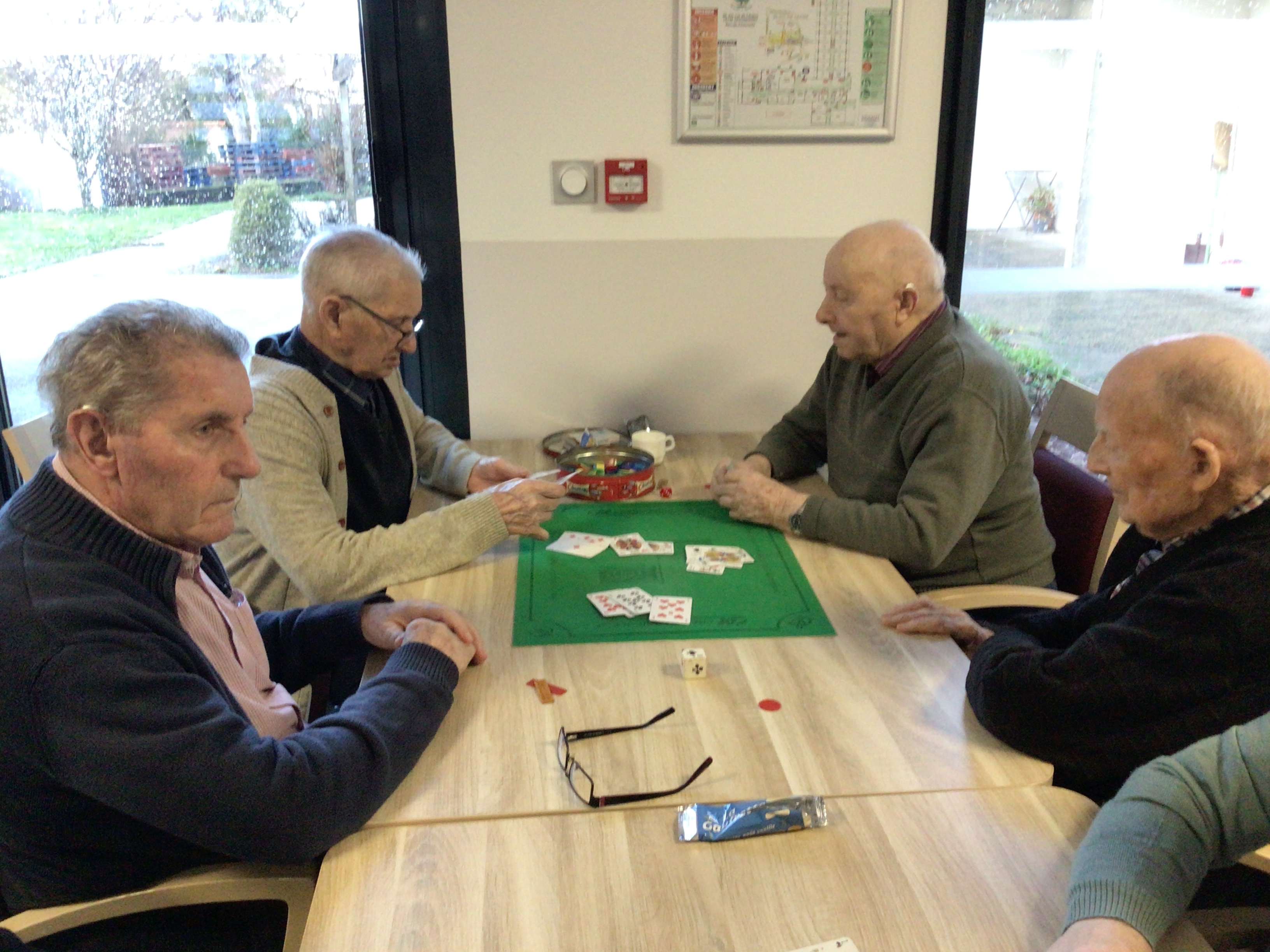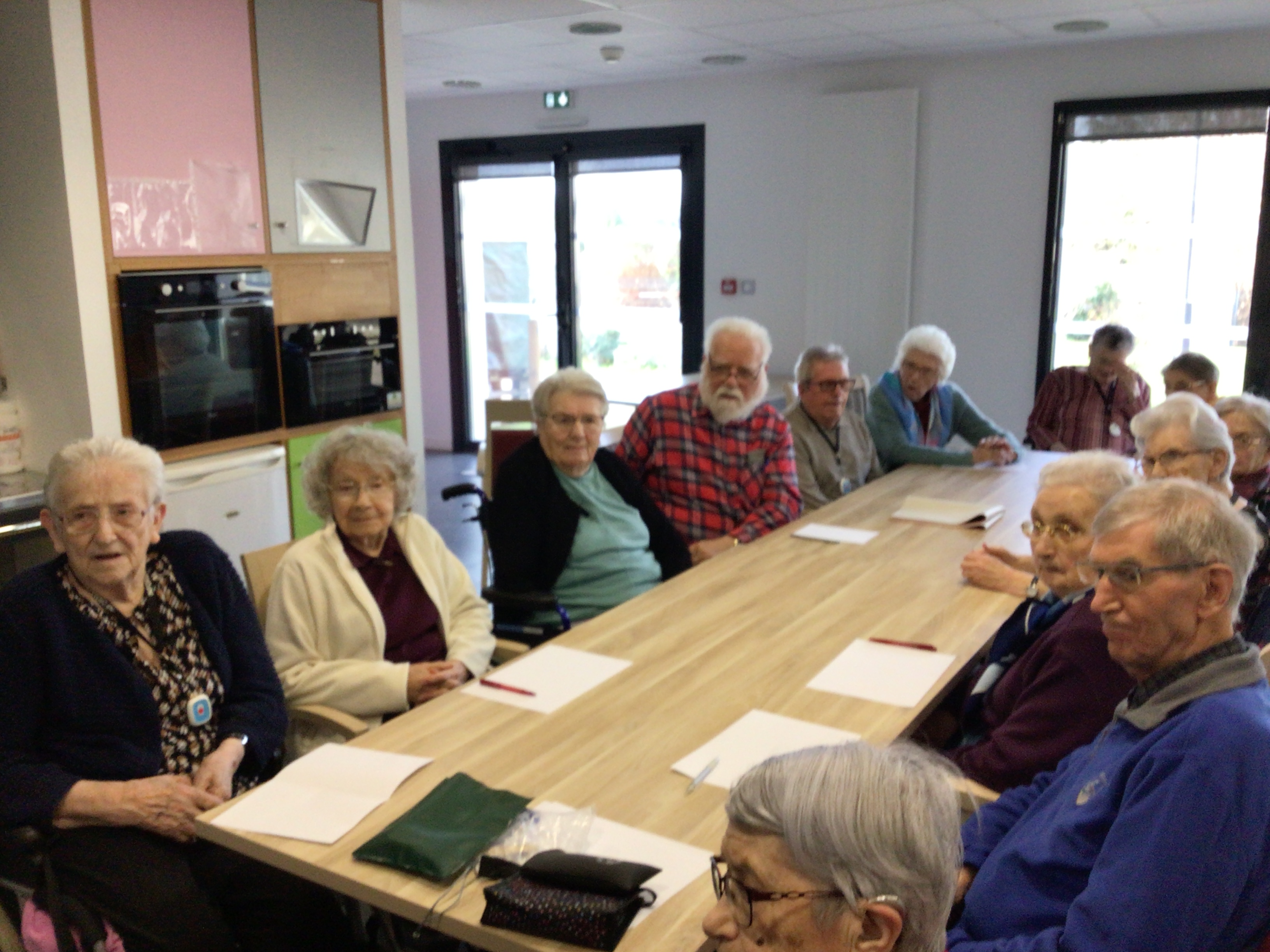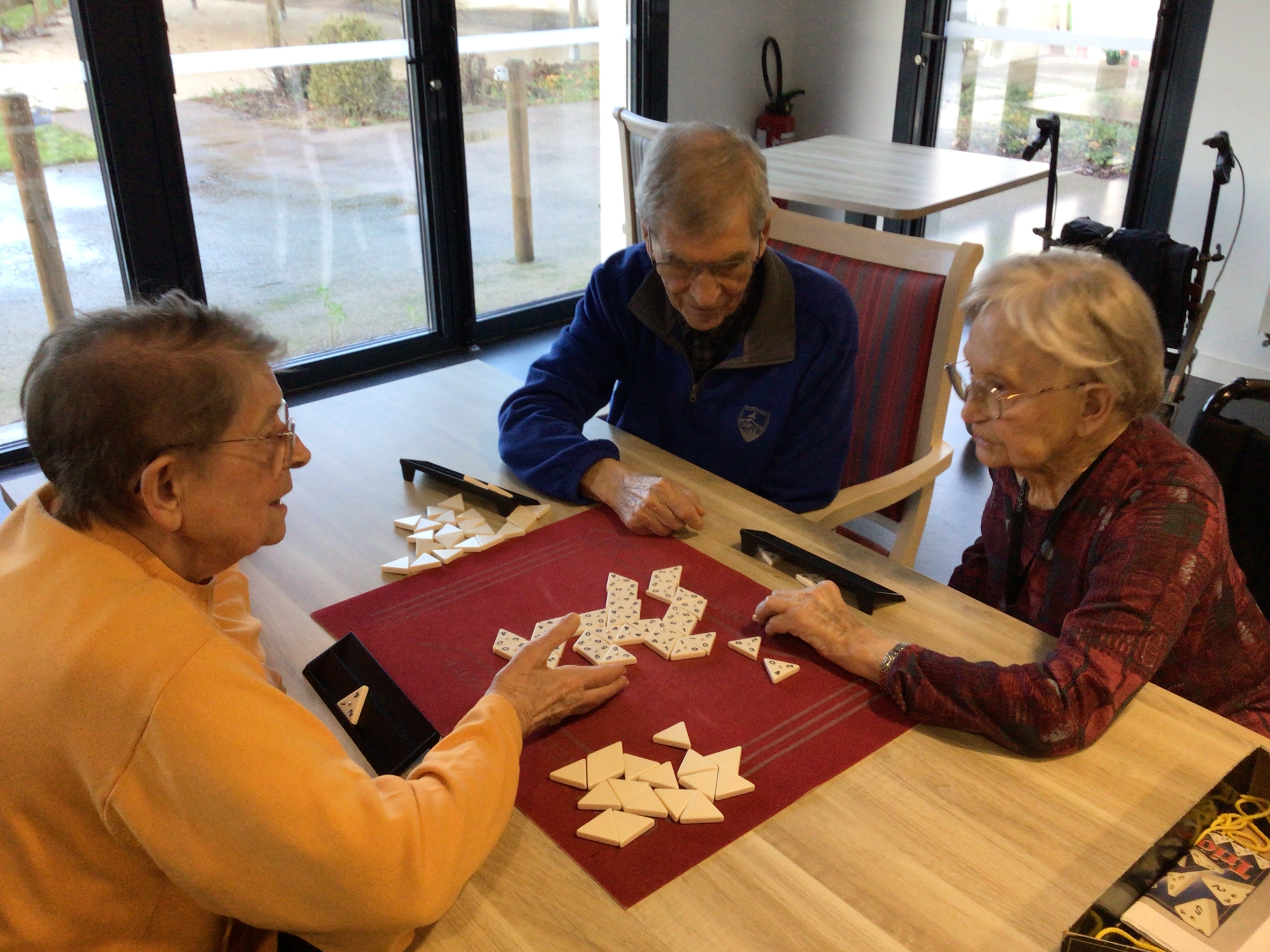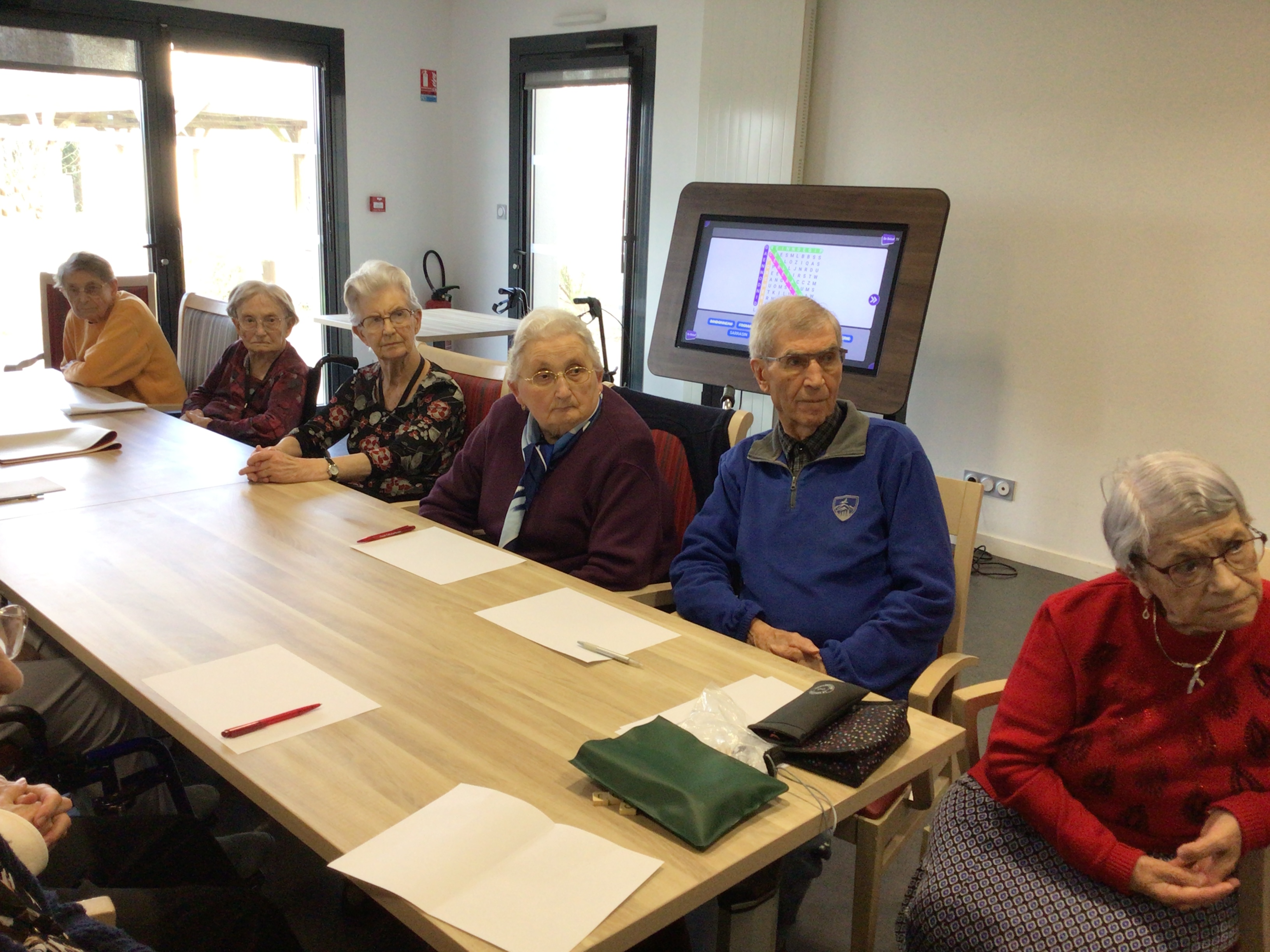 Jeu coopératif car les résidents s'entraident durant la partie. Ce jeu permet de faire travailler sa mémoire et d'échanger sur la bonne écriture du mot et sa définition. exemple: Onyx.