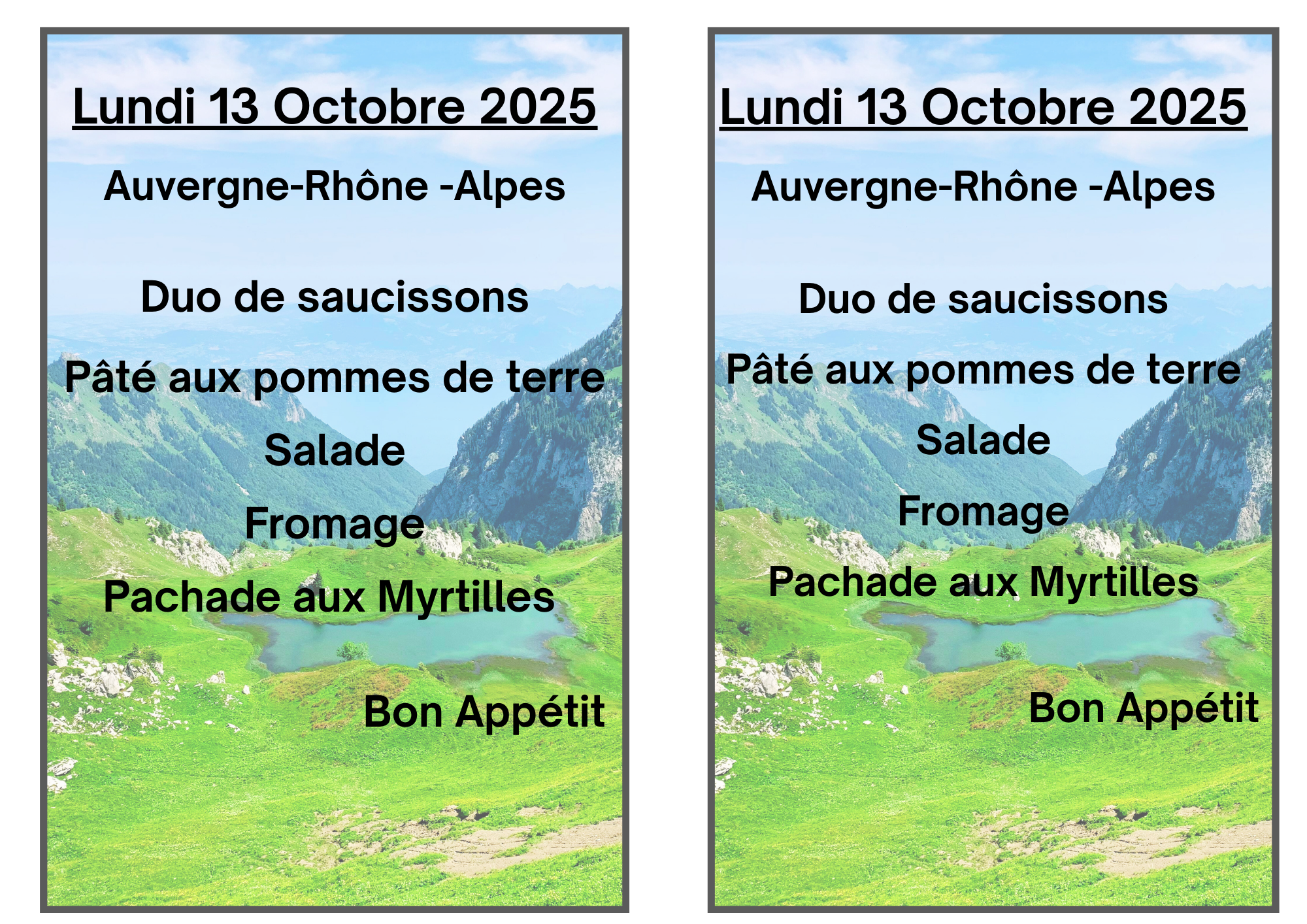 semaine du goût du 13 au 17 octobre avec un tour de France. Chaque jour, le service cuisine concocte un repas régional.