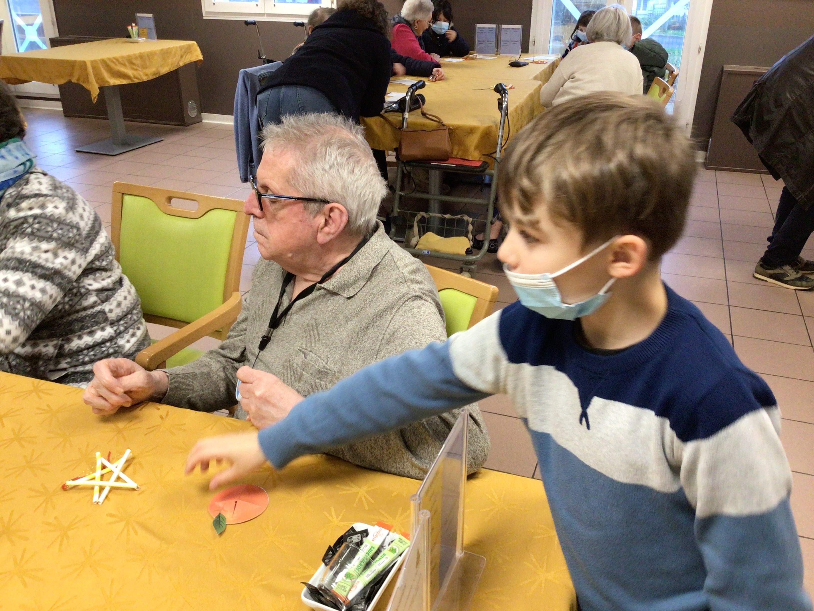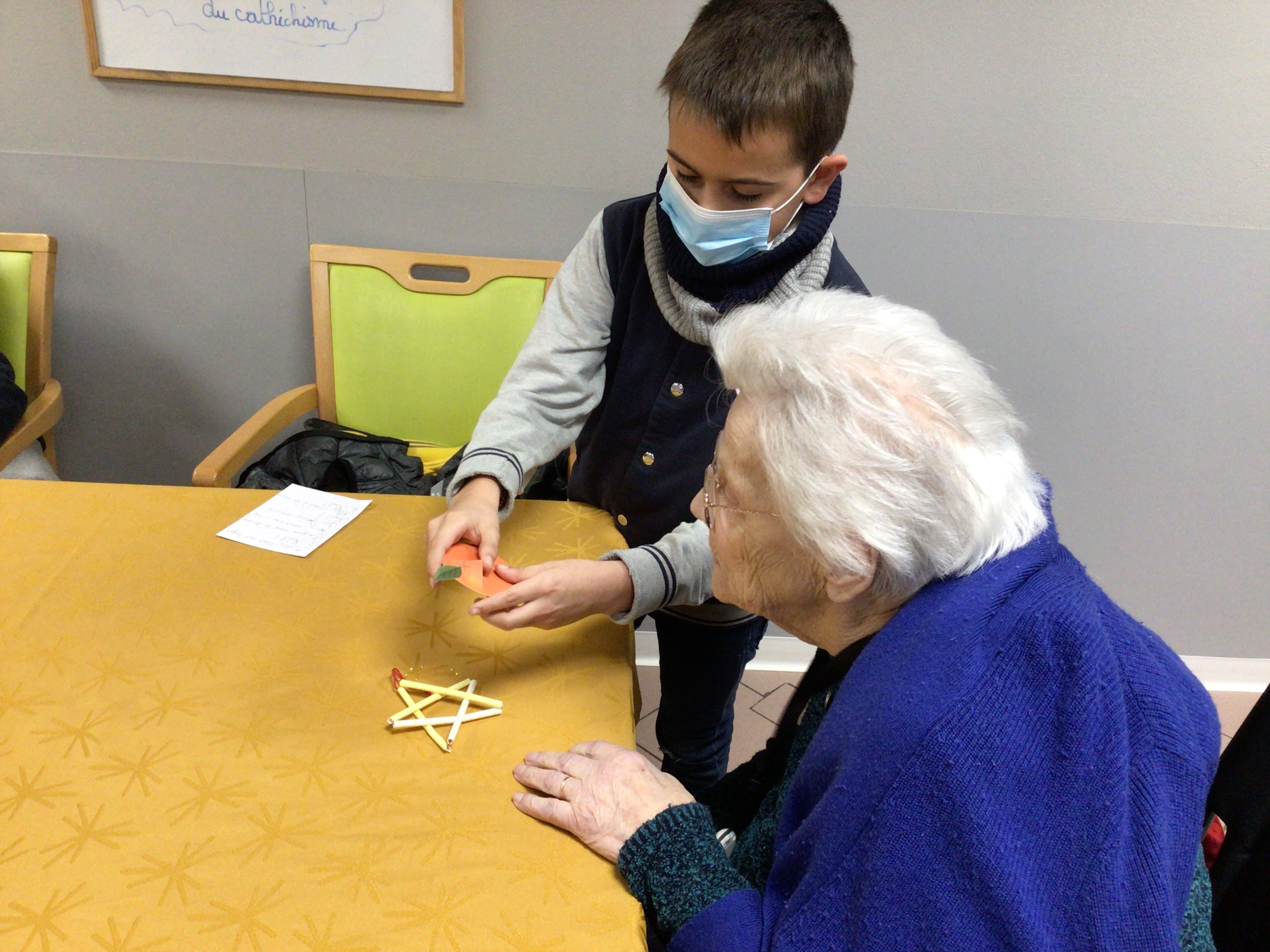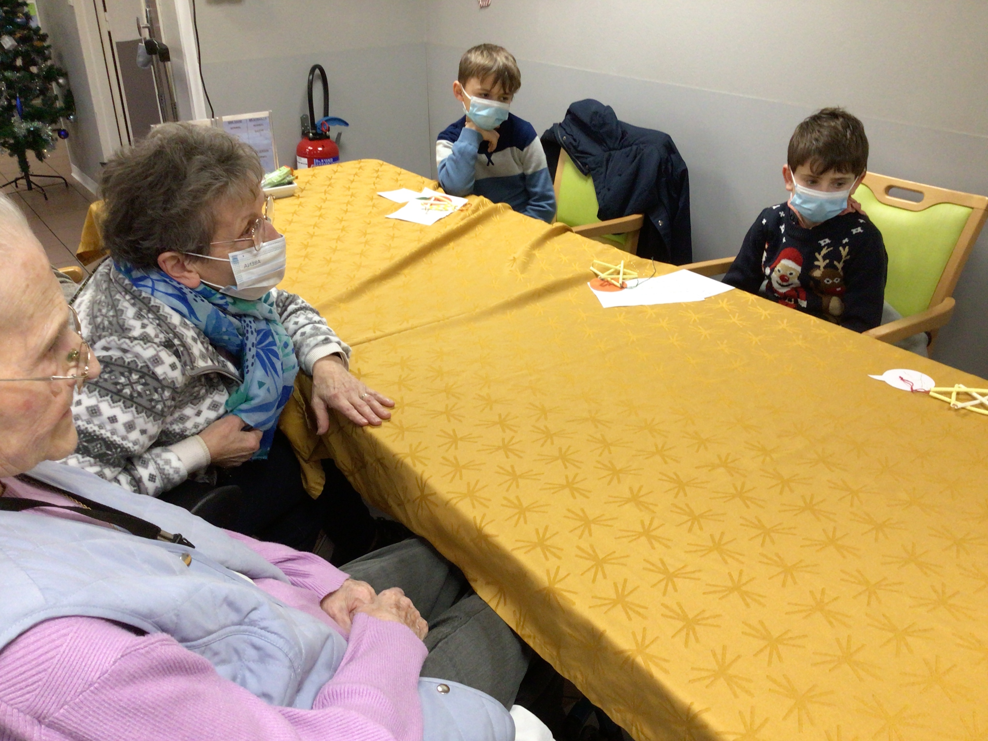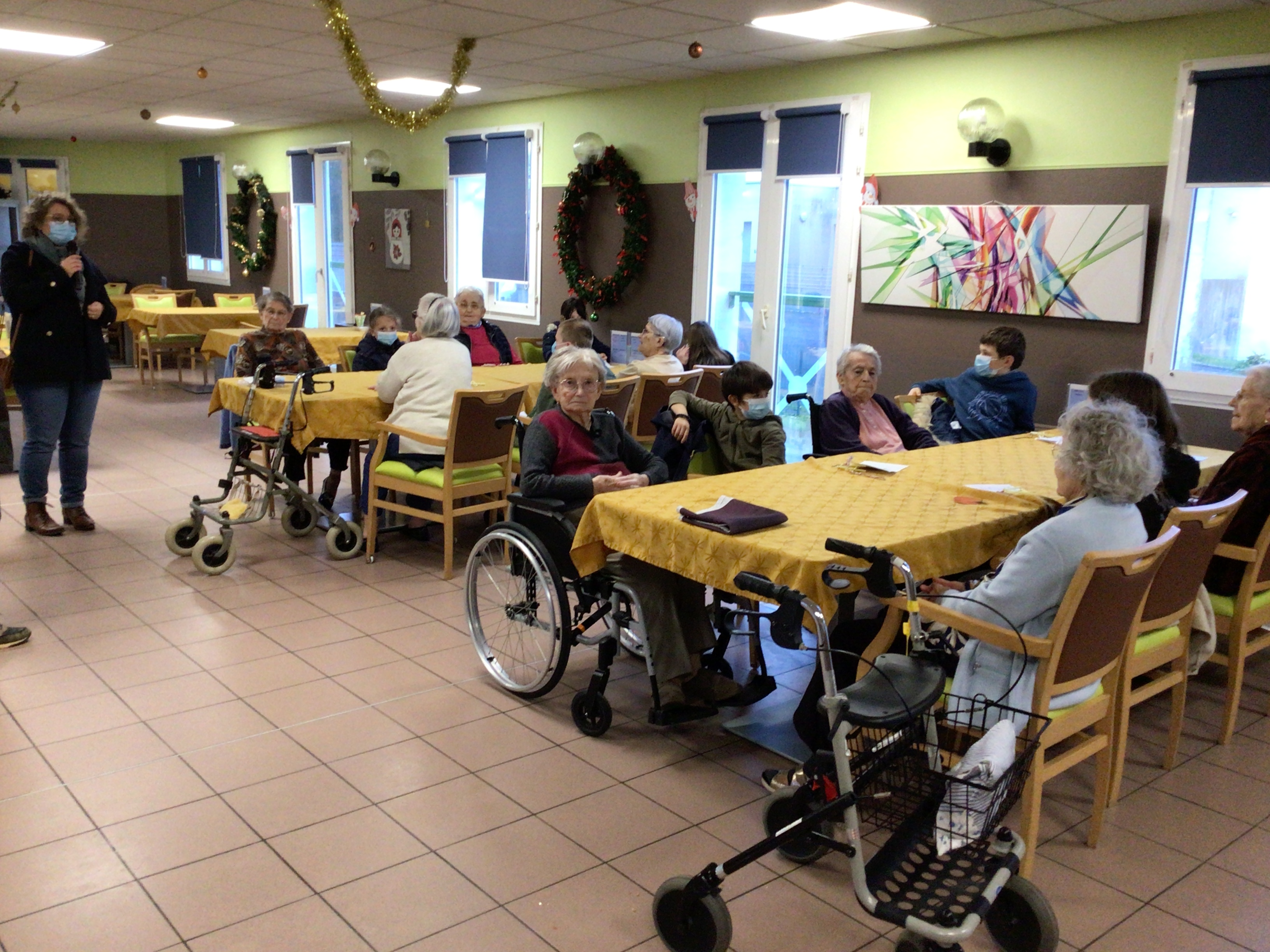 -Cet après-midi, nous avons reçu les enfants du catéchisme du secteur encadrés par Alexandrine Turpault et 3 accompagnateurs. La rencontre se voulait sur le thème de la transmission, et devait permettre aux résidents et aux enfants un échange sur le Noël vécu autrefois.