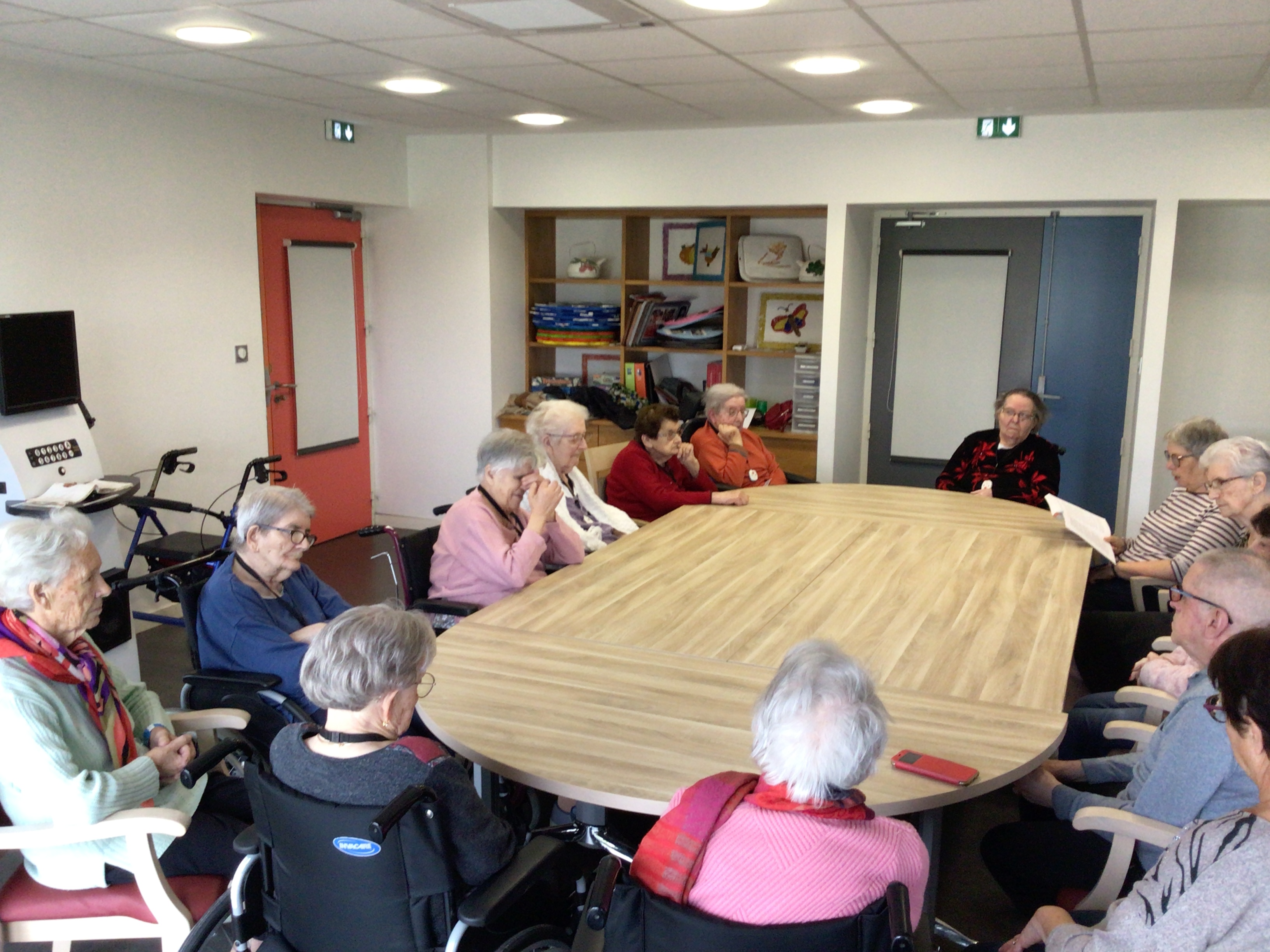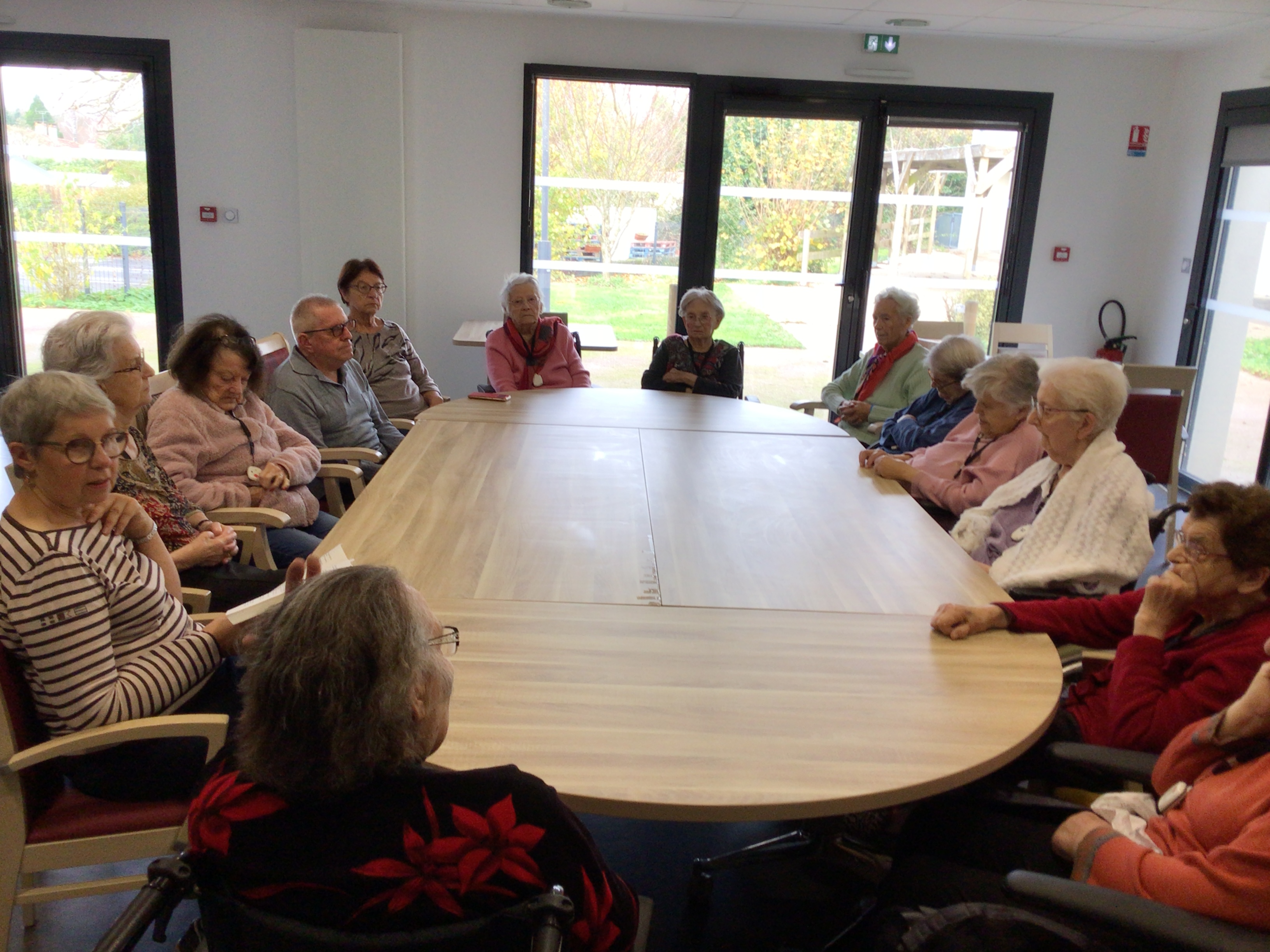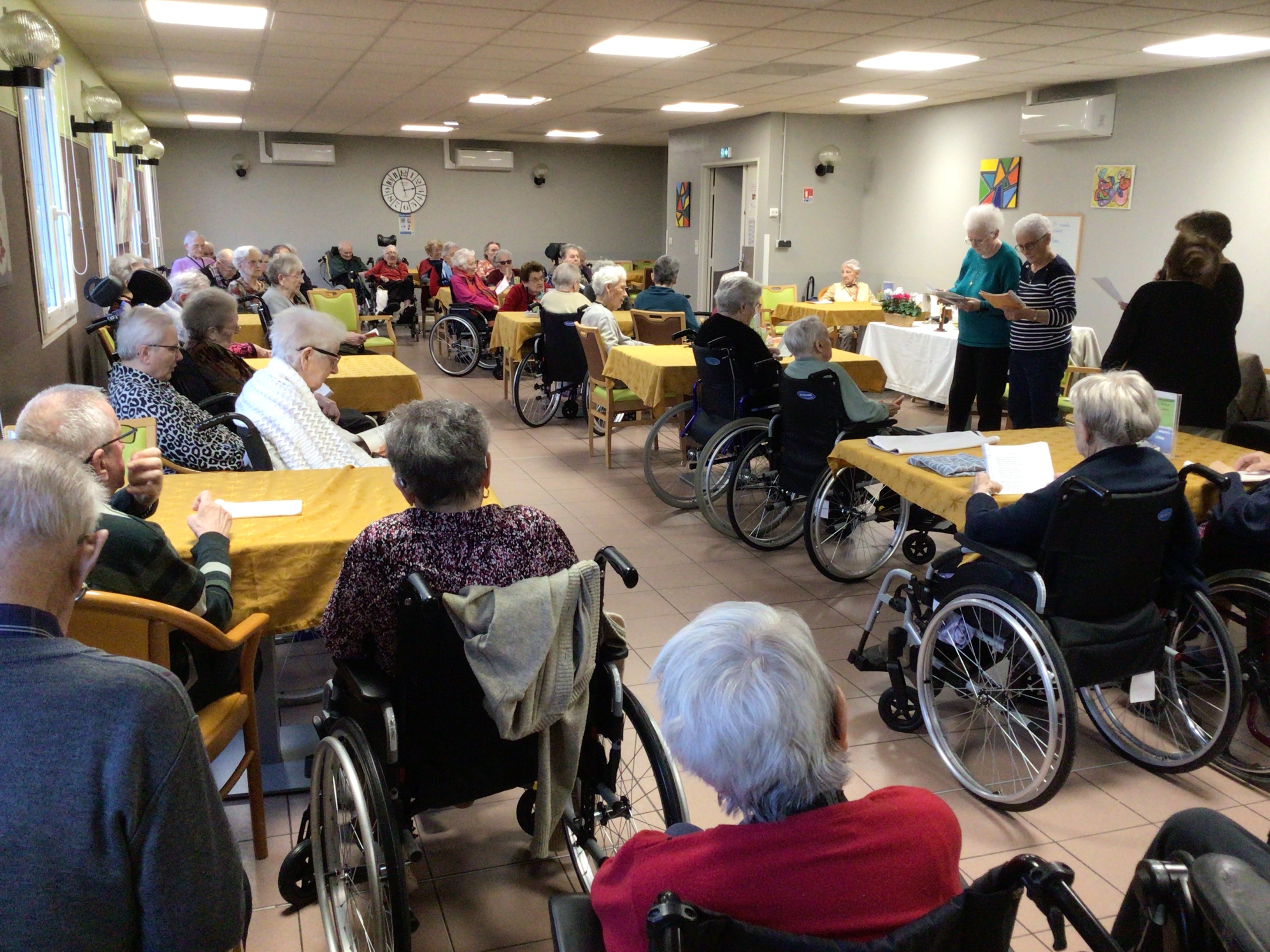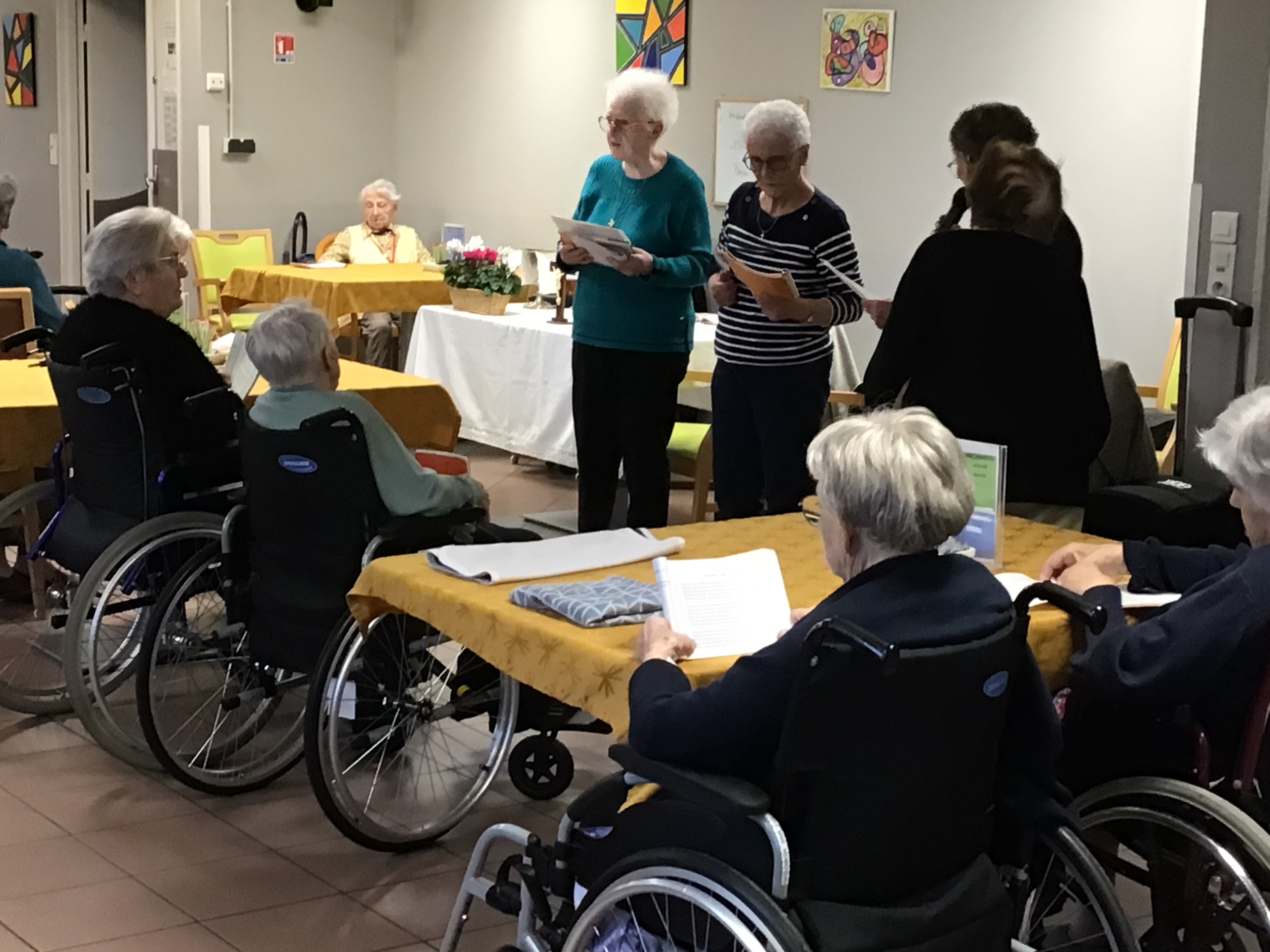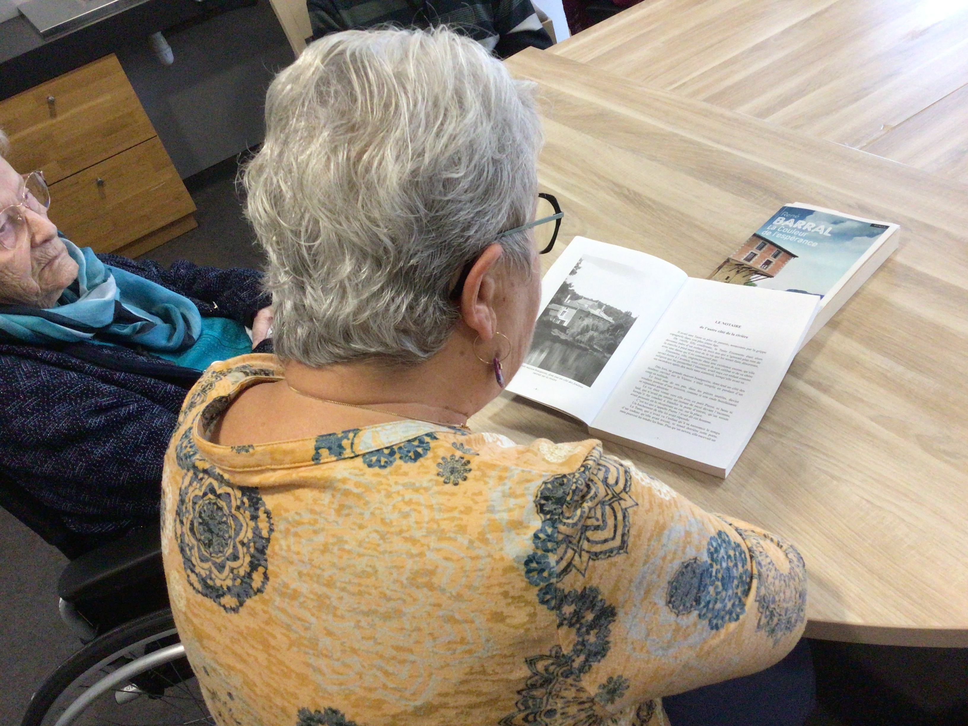 -Lecture à haute voix avec les bénévoles Josiane et Thérèse ce matin. Un moment de lecture toujours apprécié pour le groupe de résidents.