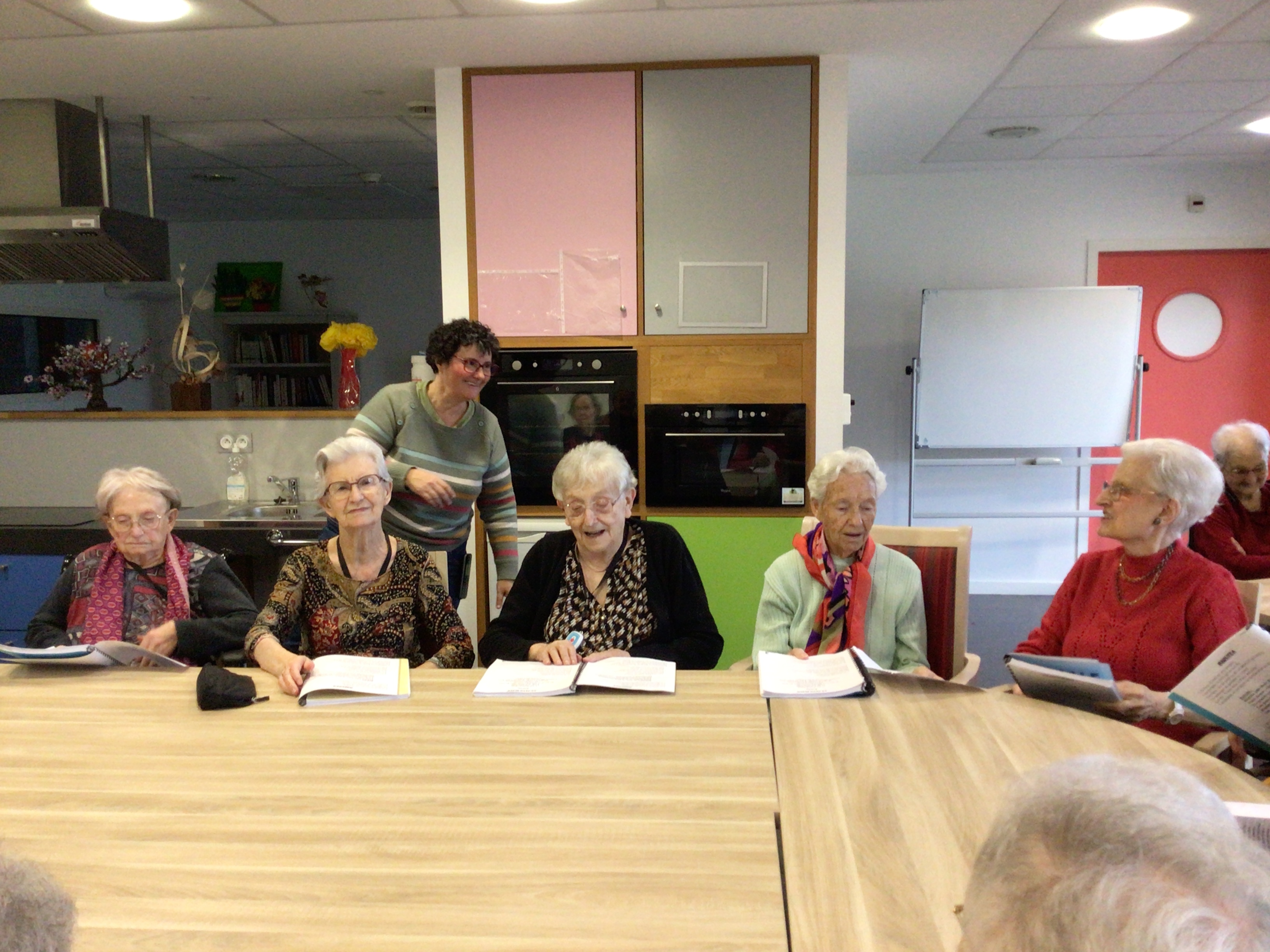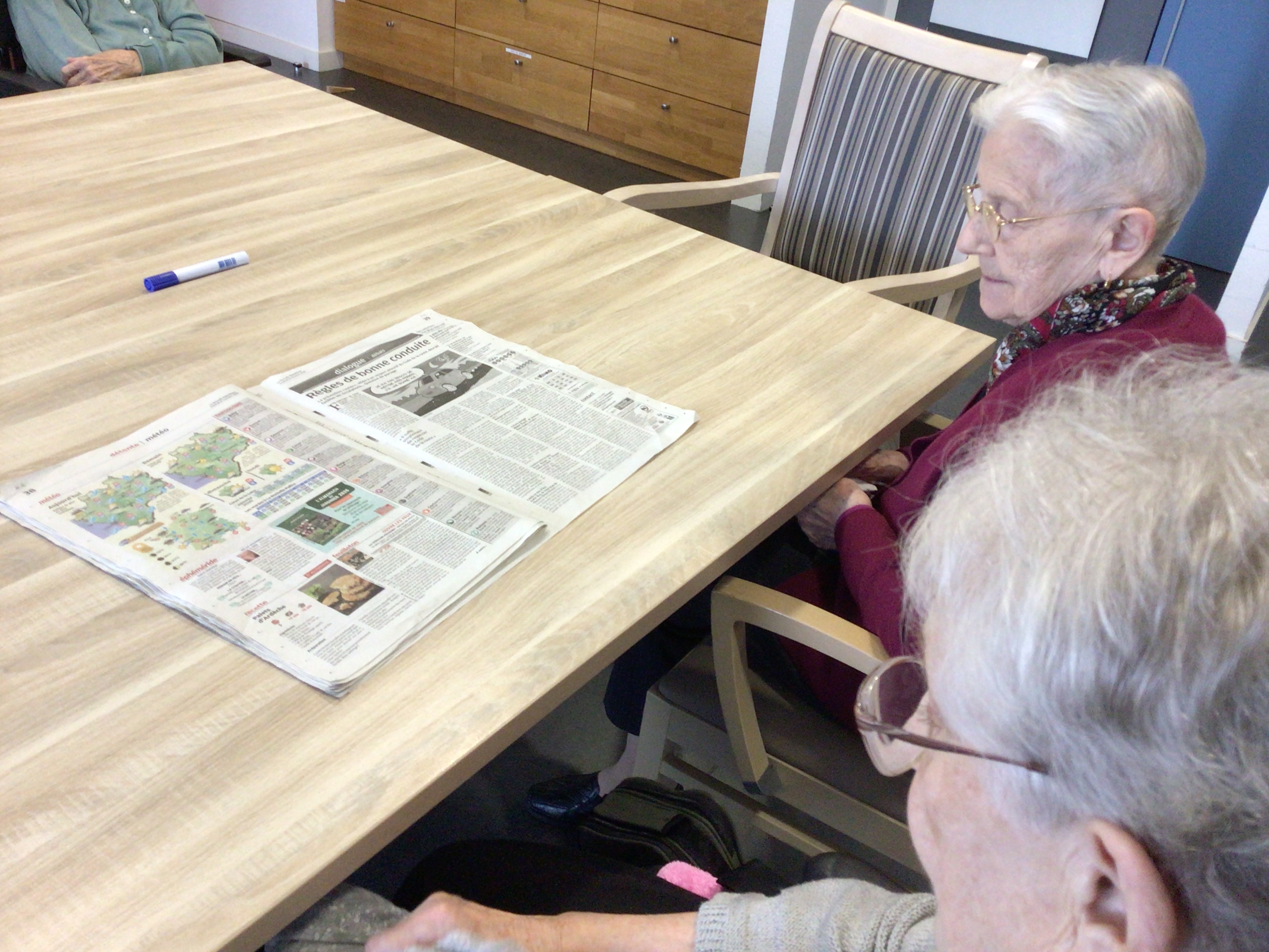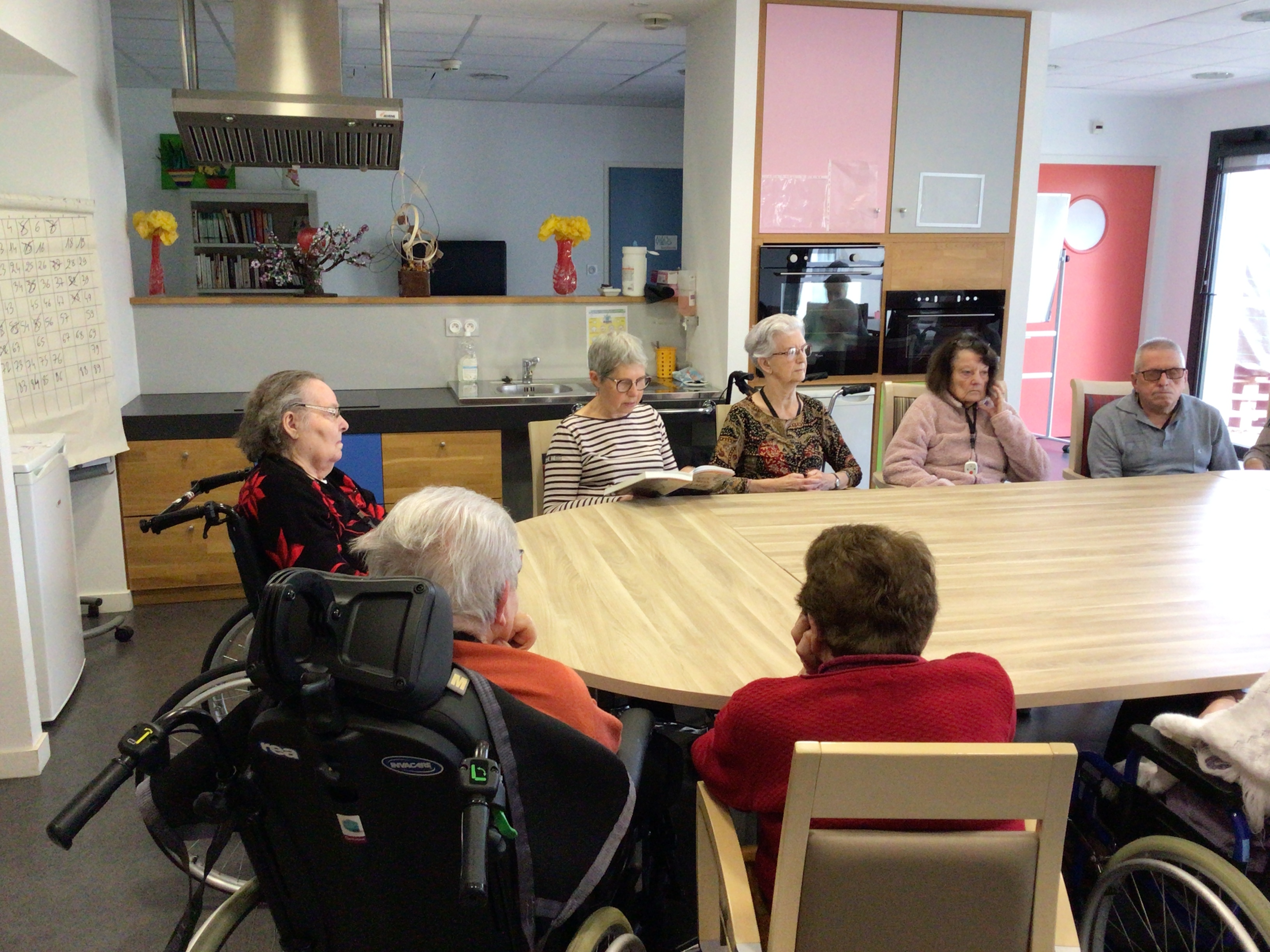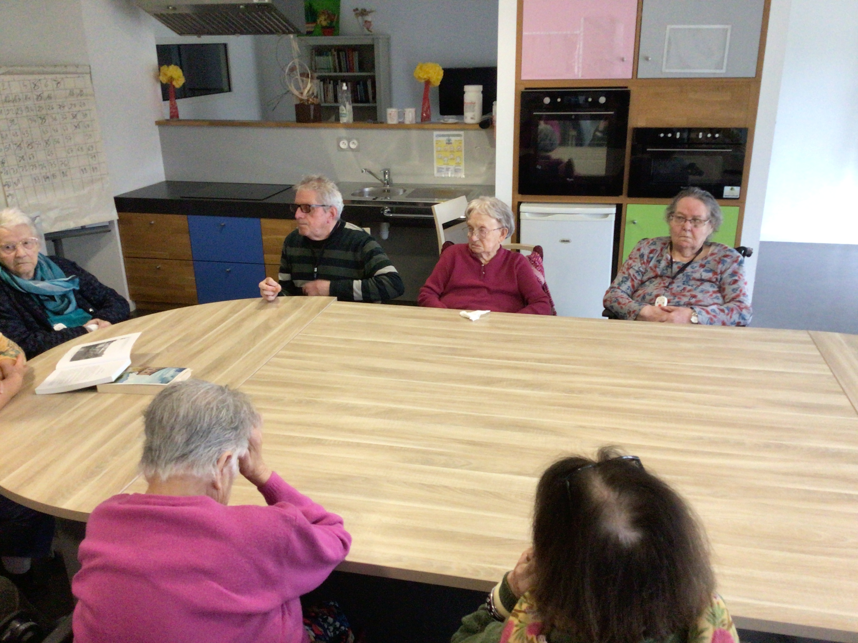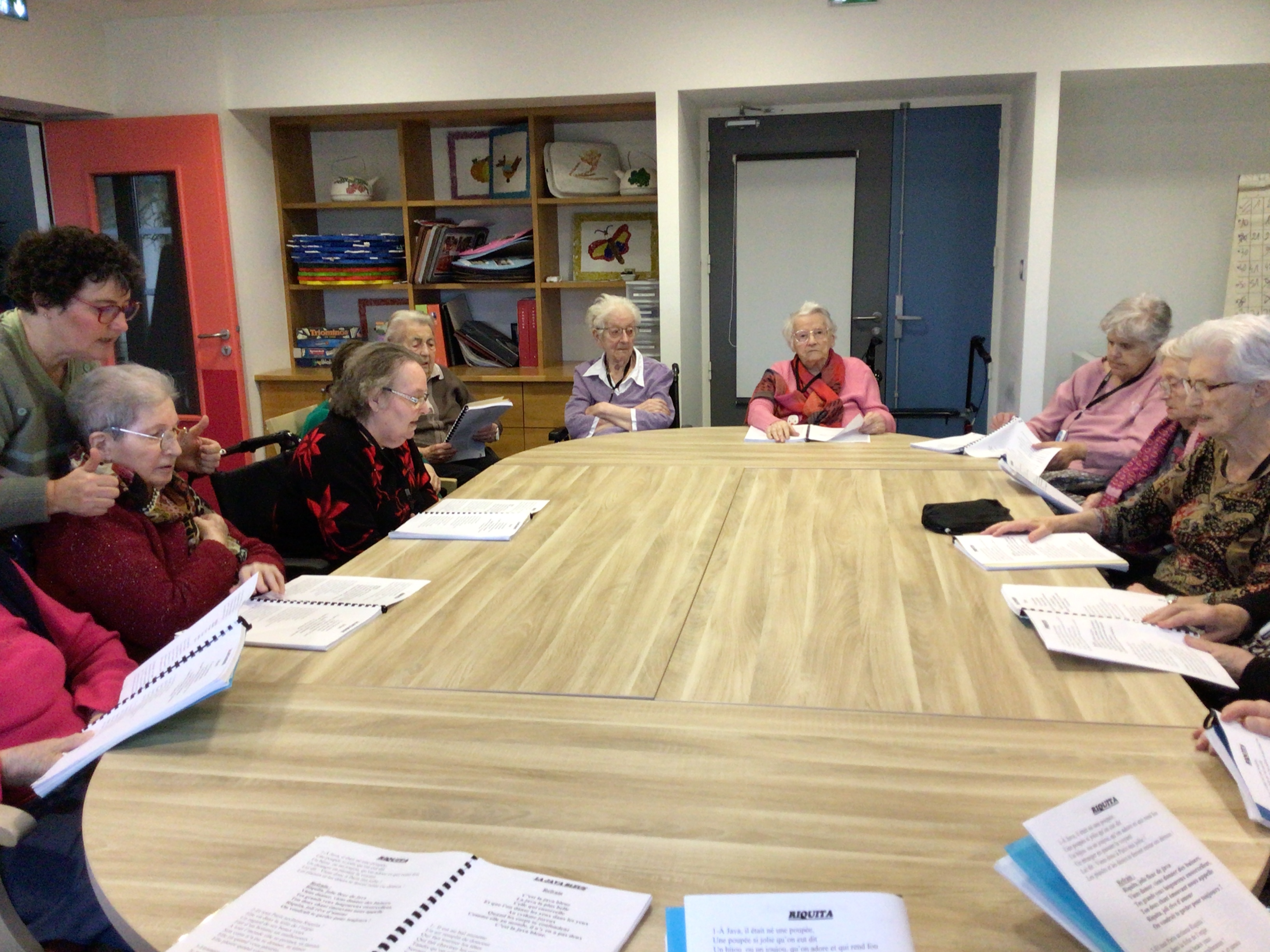 -Lecture à haute voix avec les bénévoles Josiane et Thérèse ce matin. Un moment de lecture toujours apprécié pour le groupe de résidents.