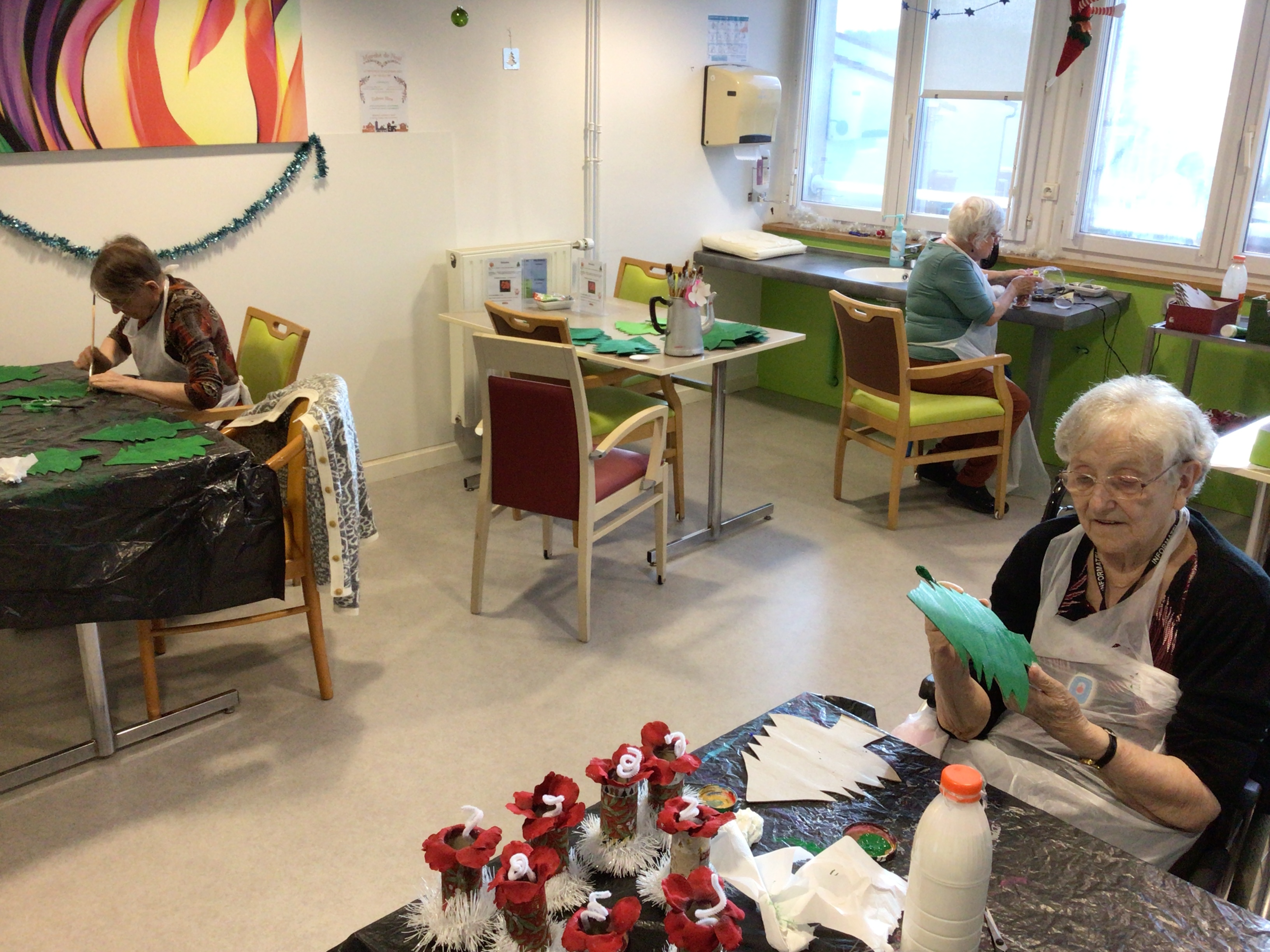 -Brigitte Belaud Art thérapeute, a pu lors de son atelier créatif, terminer avec des résidentes assidues et très impliquées , les bricolages pour les fêtes de fin d'année . Certaines créations seront vendues lors du marché de Noël du 10 décembre