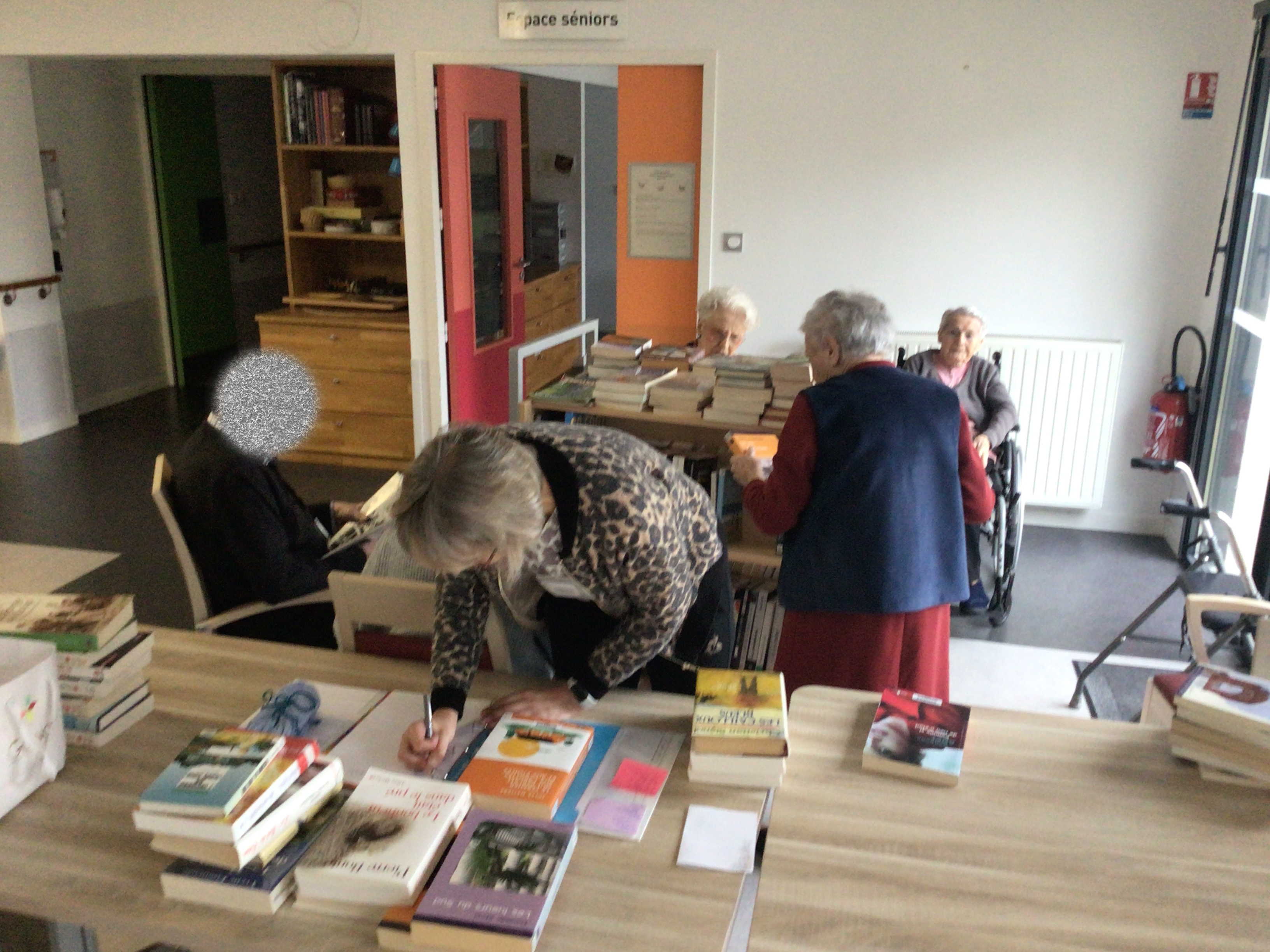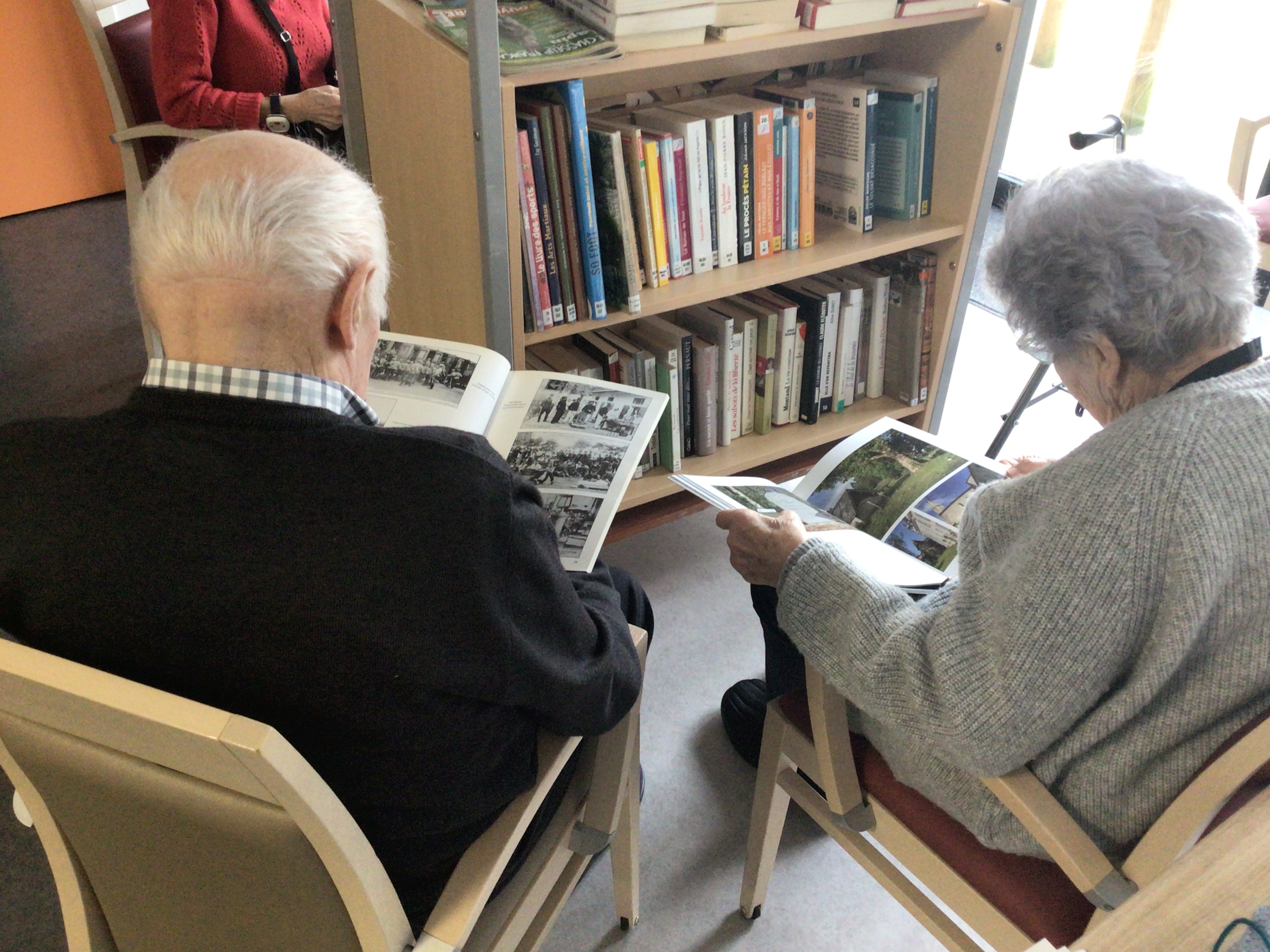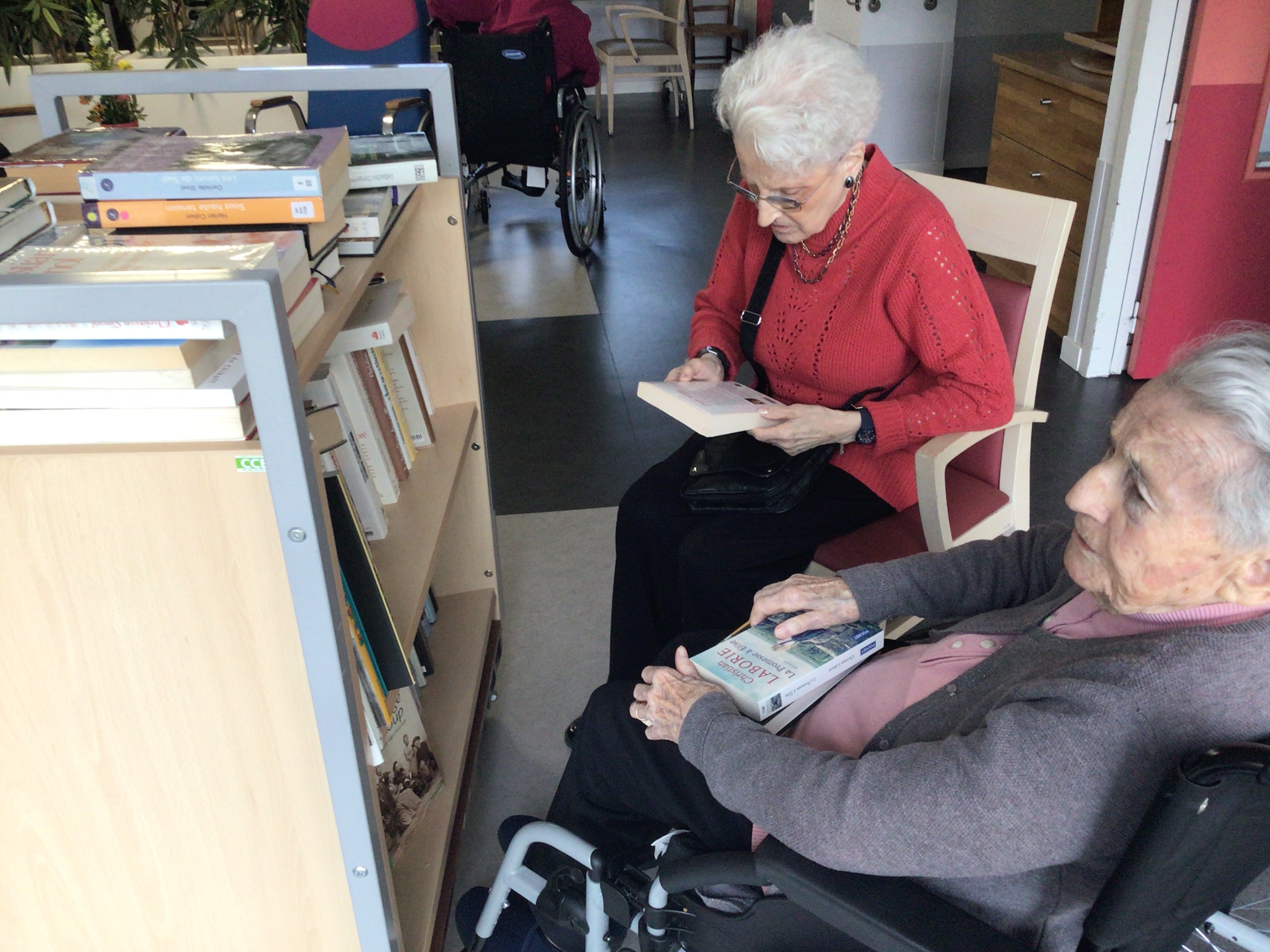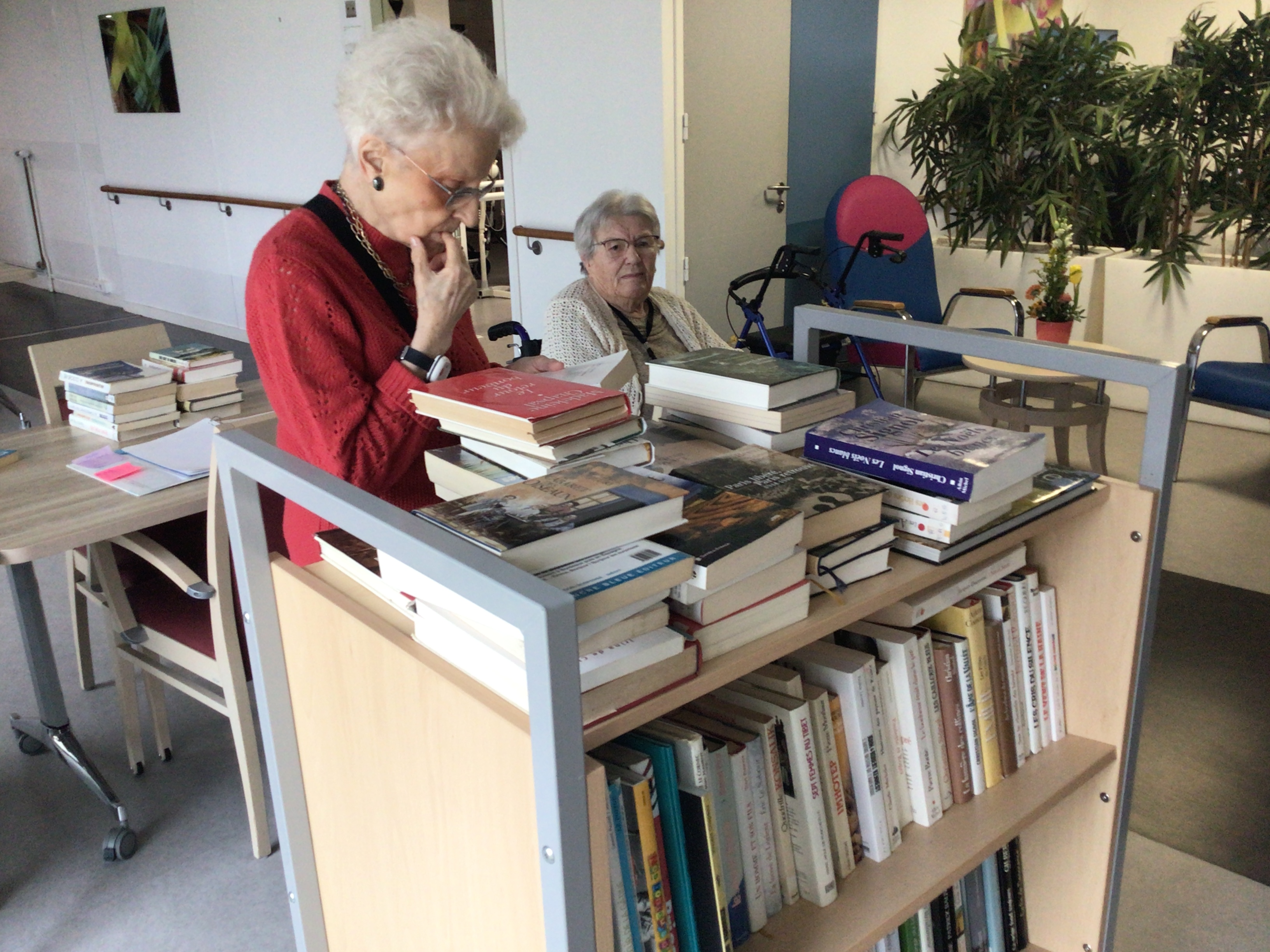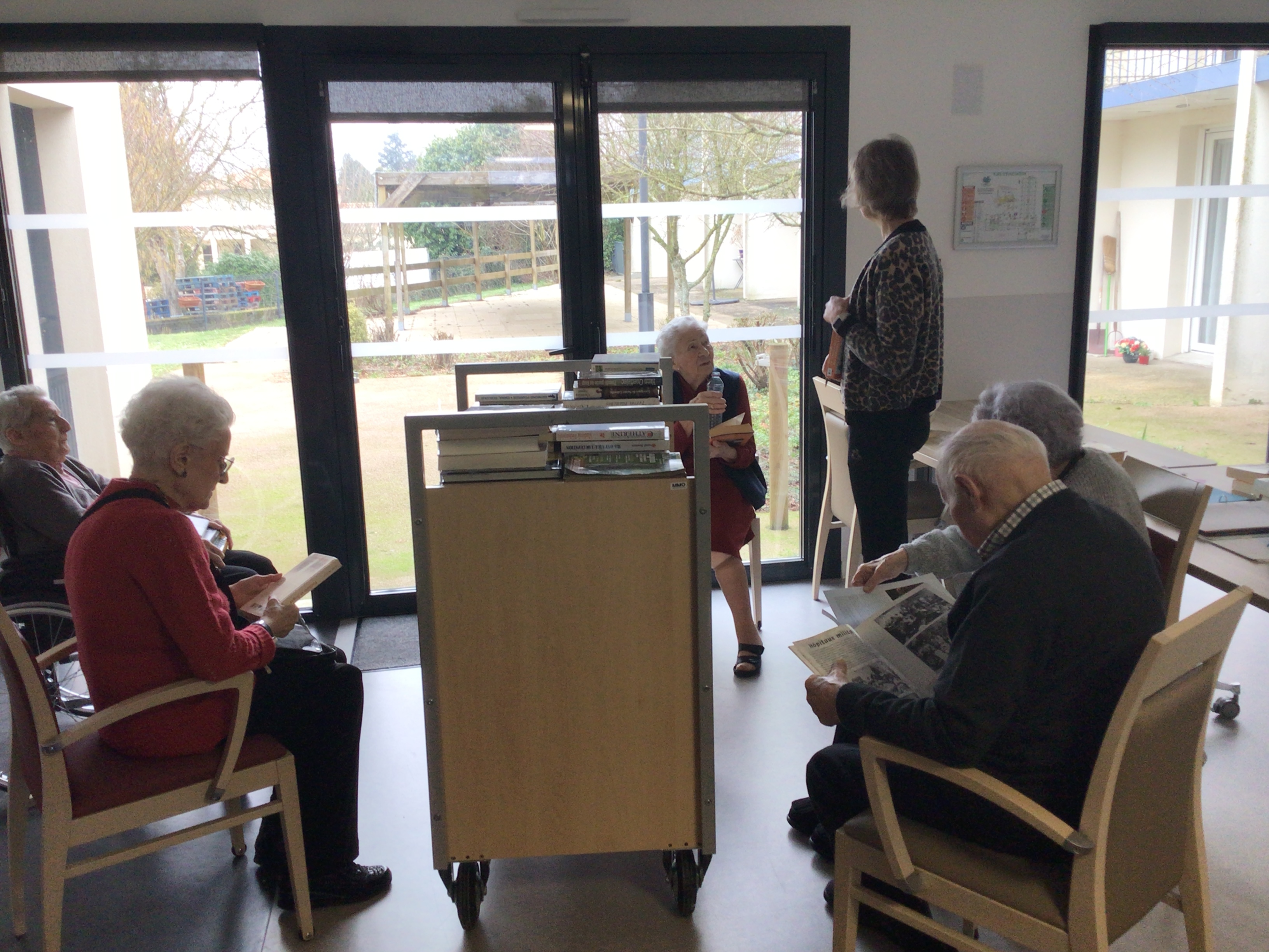 Le matin, bibliothèque ambulante, les résidents ont pu venir dans l'espace activités où les attendait de nombreux livres empruntés à la médiathèque de Secondigny ou appartenant à l'EHPAD. Accompagnés de l'animatrice pour ceux qui ont du mal à se déplacer , cette activité permet de se rencontrer autour des livres. Chacun a pu faire son ou ses choix de lecture.
