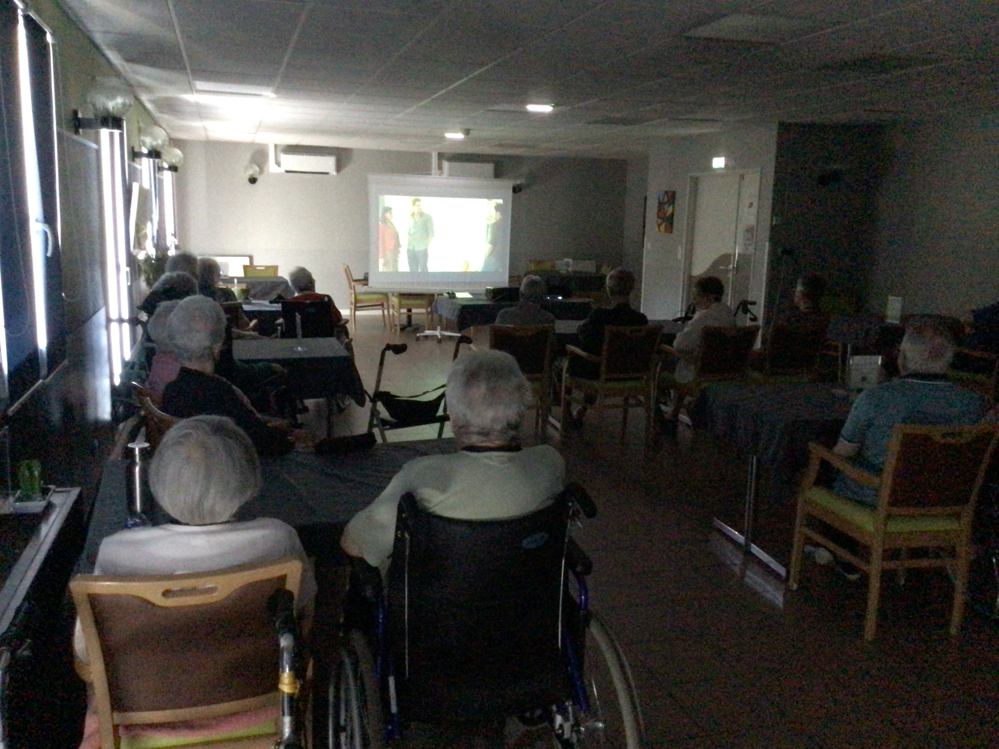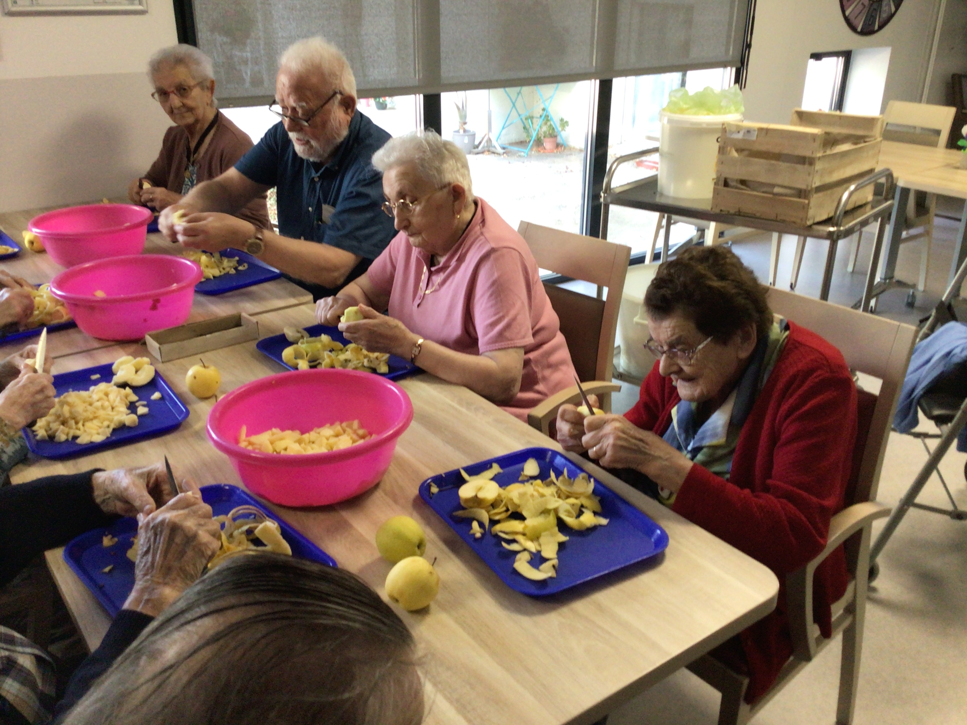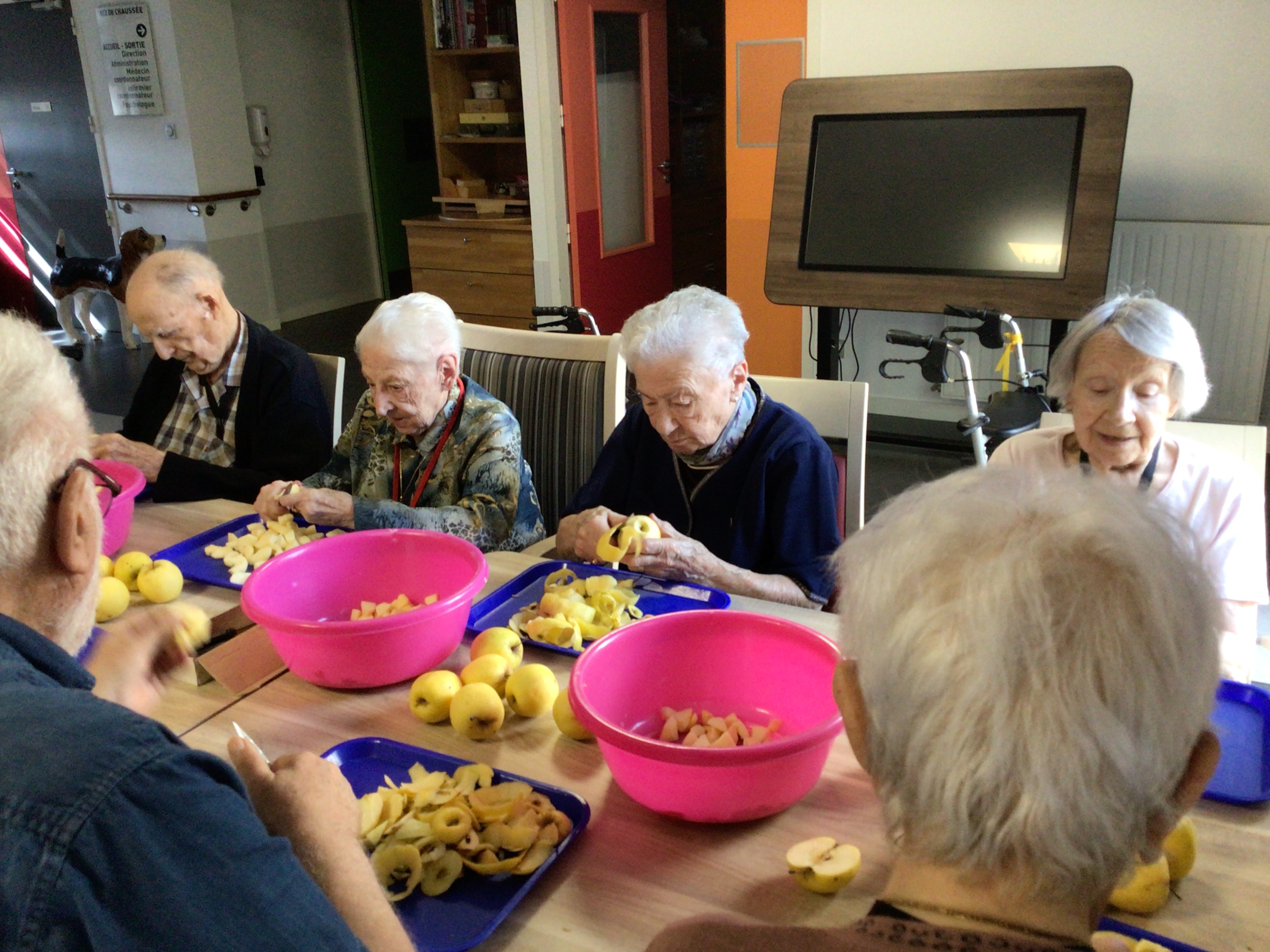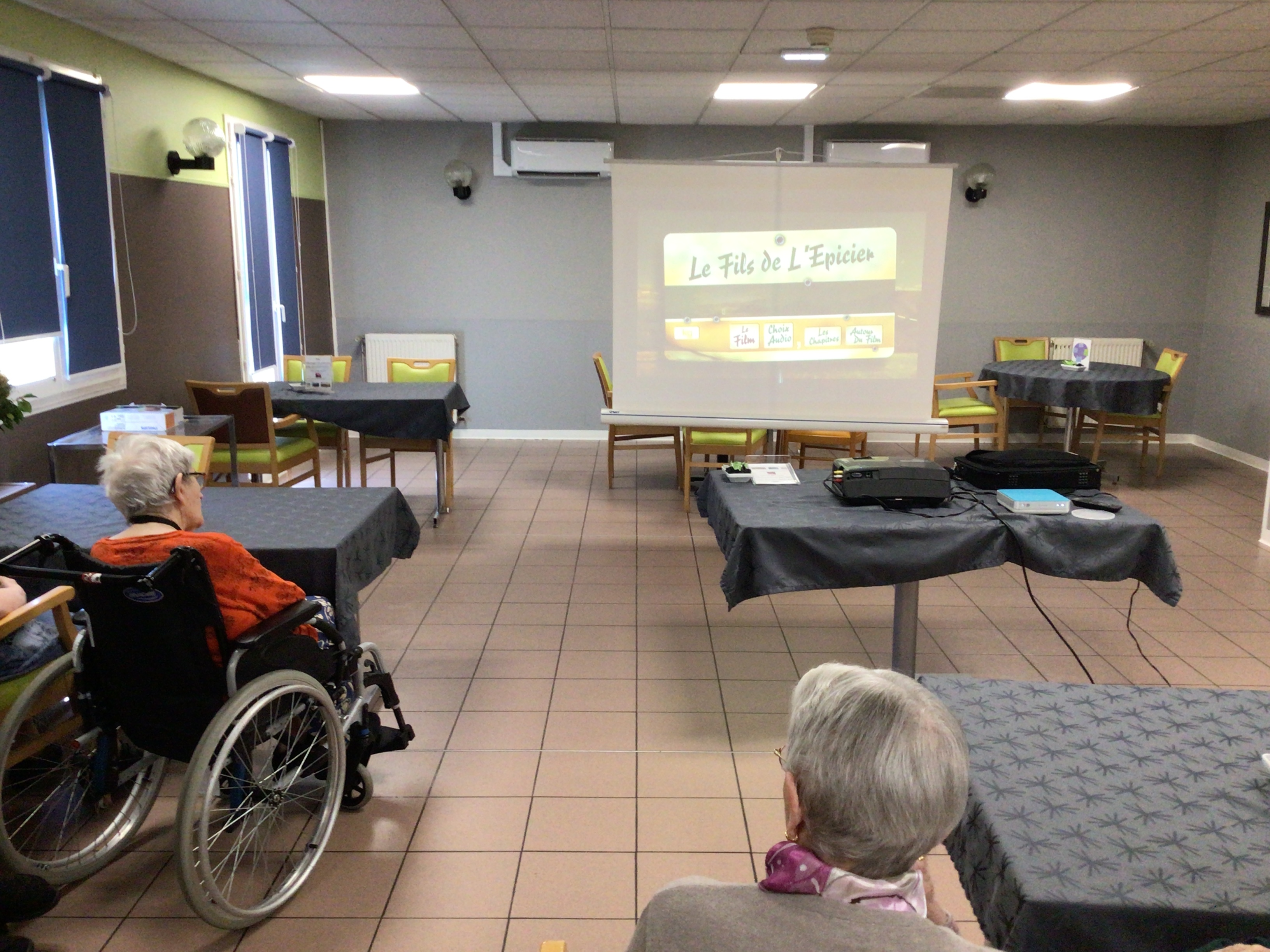 Après l'épluchage des pommes qui permettra de déguster par la suite un bon dessert préparé par les cuisines de l'EHPAD et le pliage du linge par des résidentes volontaires et motivées, la journée s'est poursuivie avec une séance cinéma , et la diffusion du film "le fils de l'épicier".