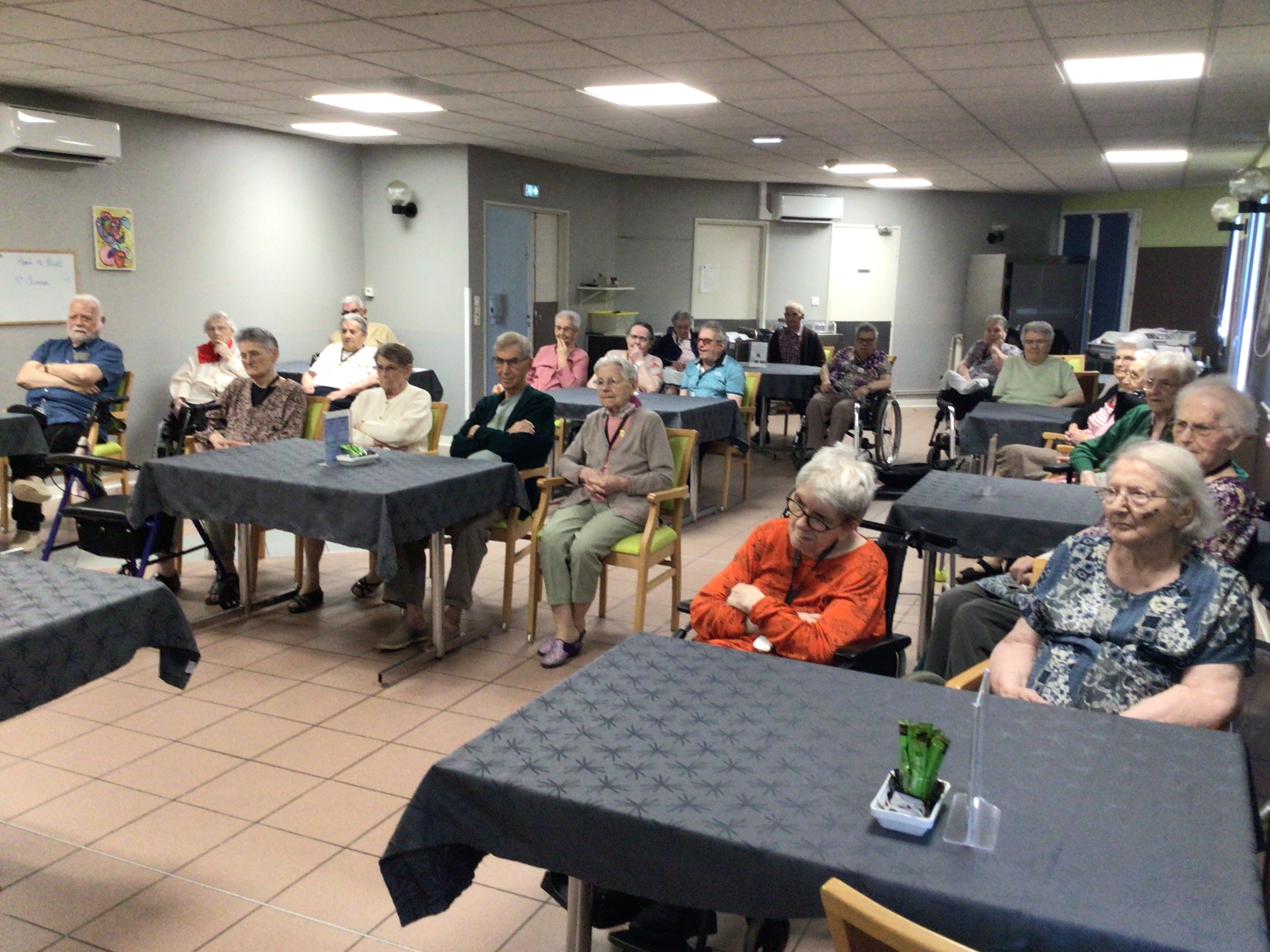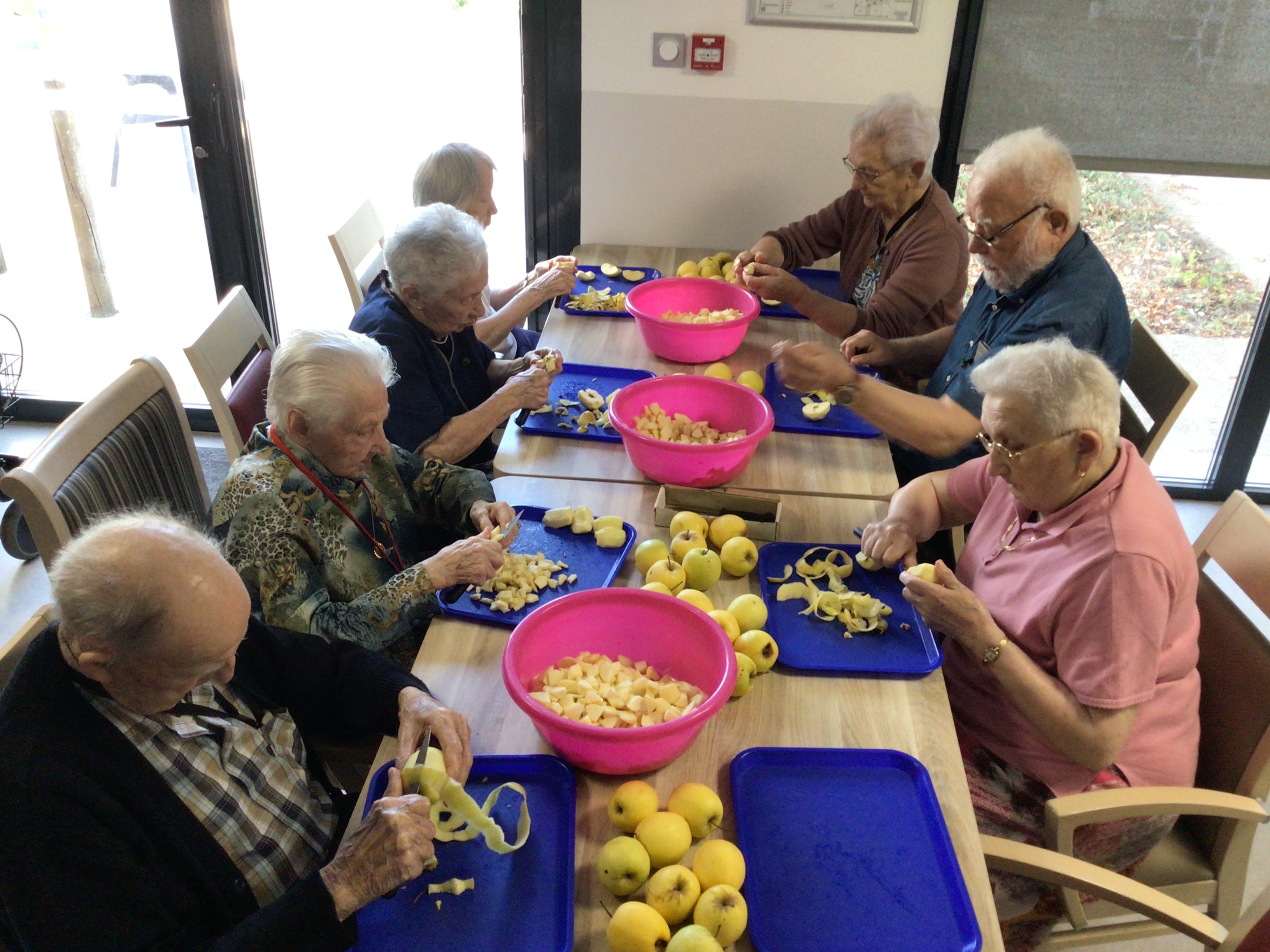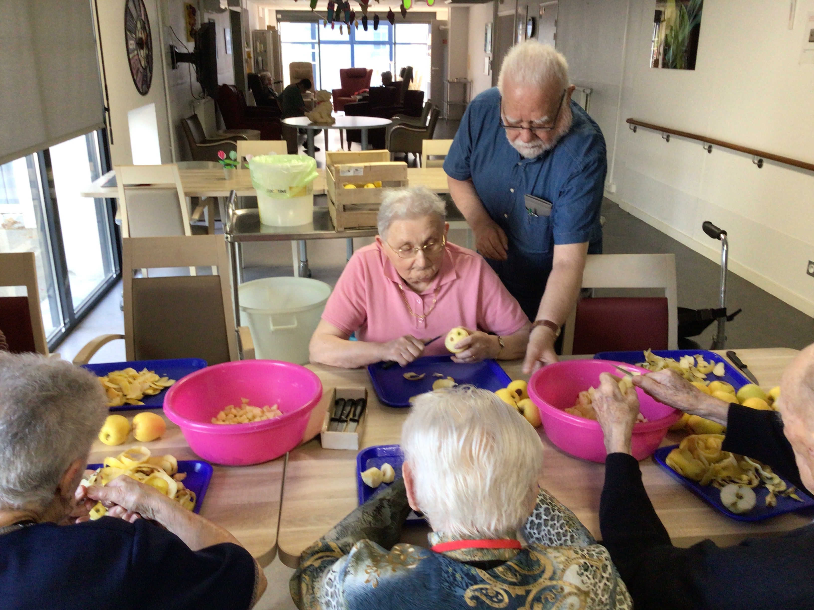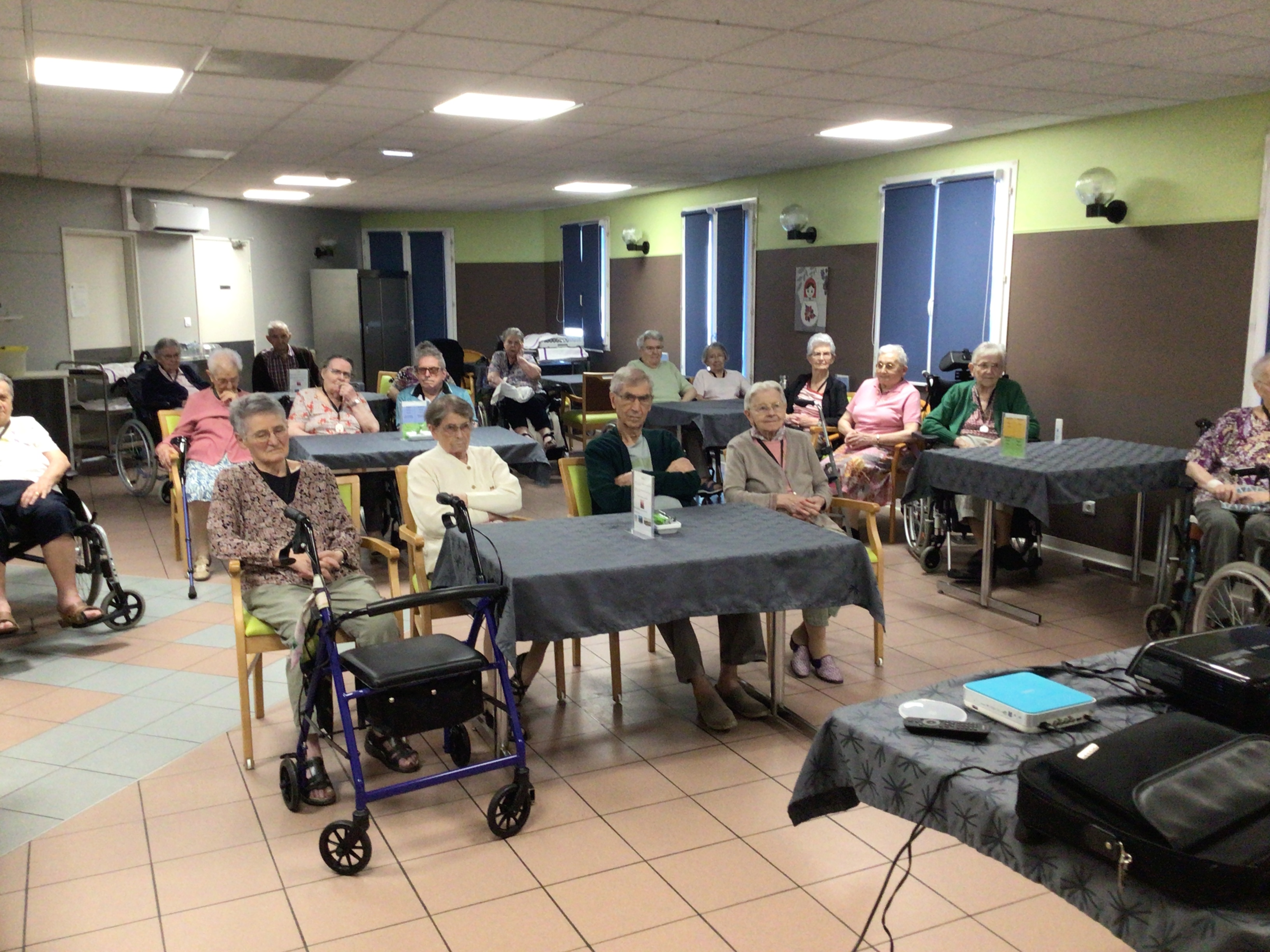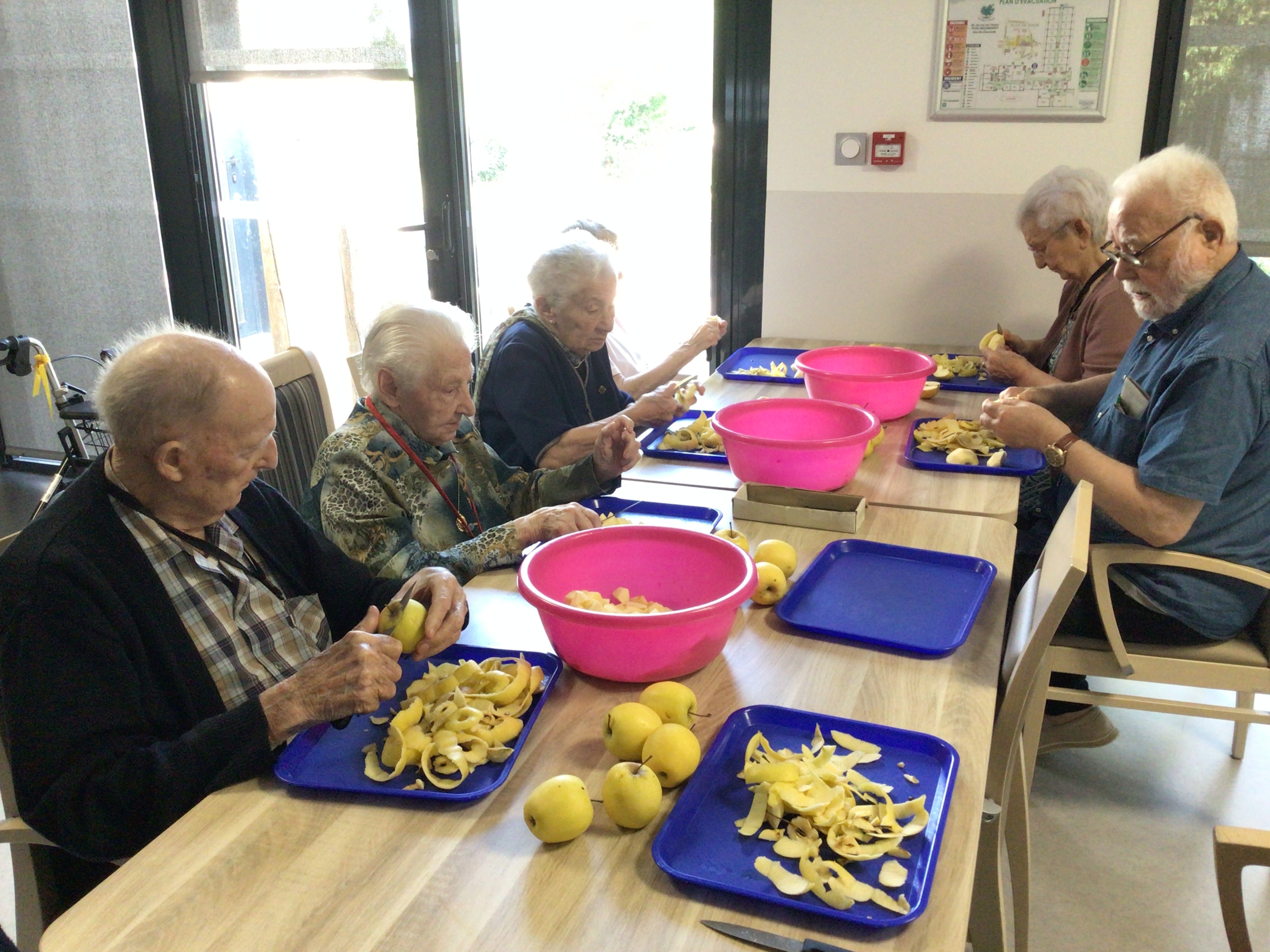 Après l'épluchage des pommes qui permettra de déguster par la suite un bon dessert préparé par les cuisines de l'EHPAD et le pliage du linge par des résidentes volontaires et motivées, la journée s'est poursuivie avec une séance cinéma , et la diffusion du film "le fils de l'épicier".