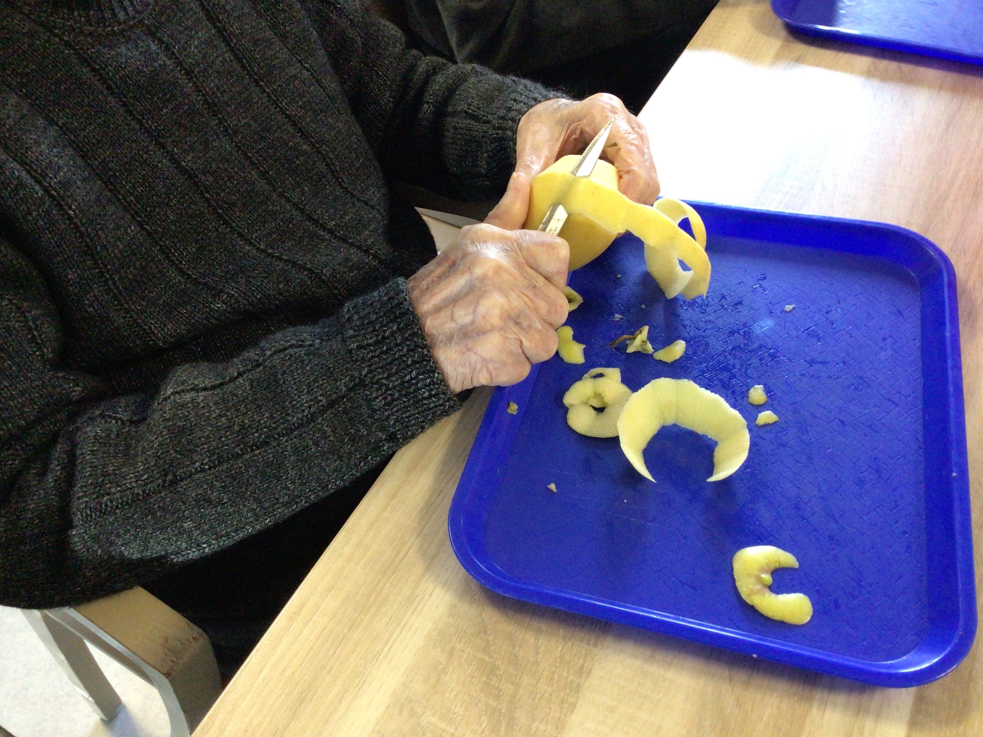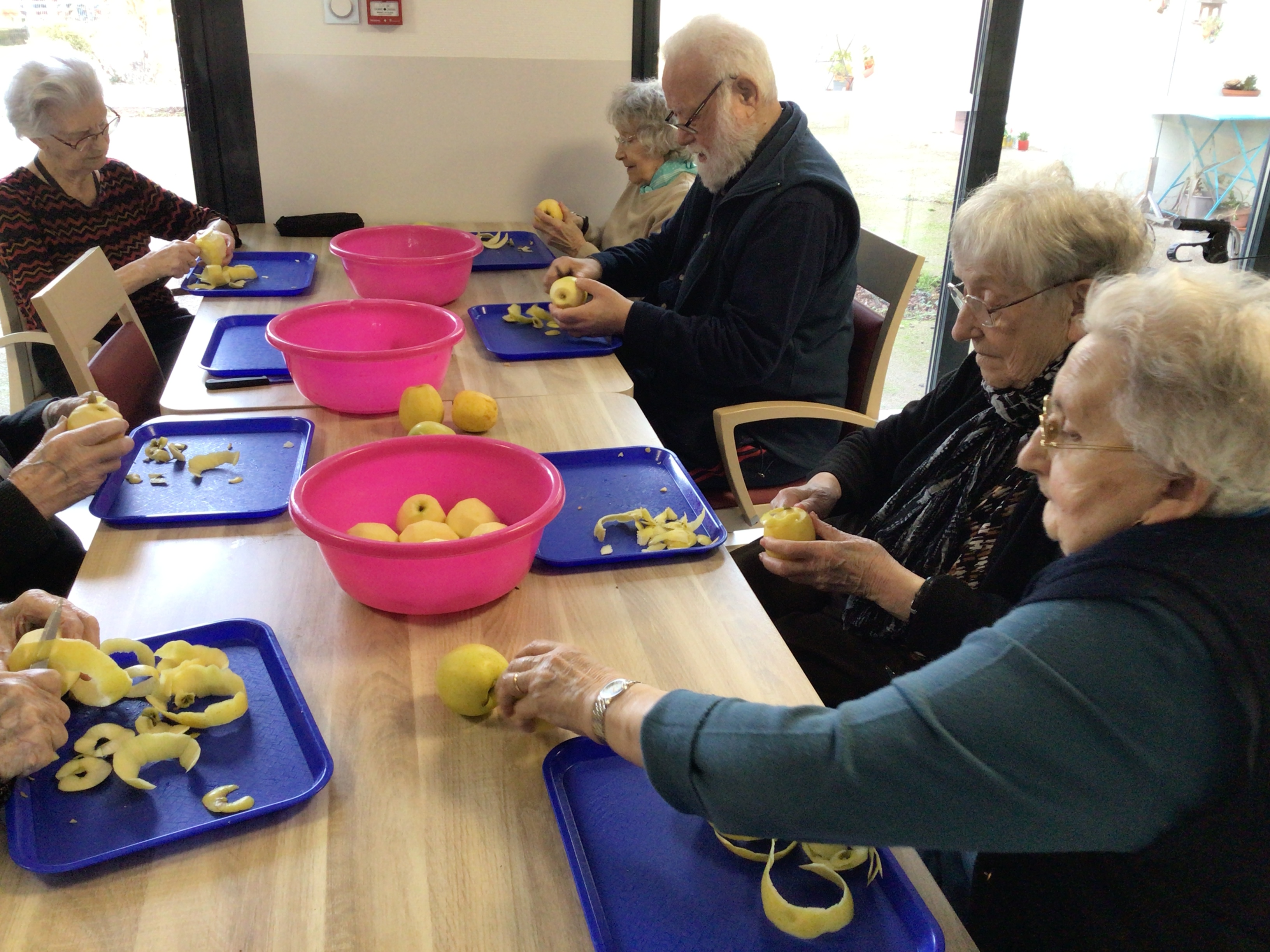 -Atelier « épluchage des pommes » : cet atelier qui a toujours beaucoup de succès favorise l'autonomie en permettant aux résidents de participer activement à la préparation des repas.