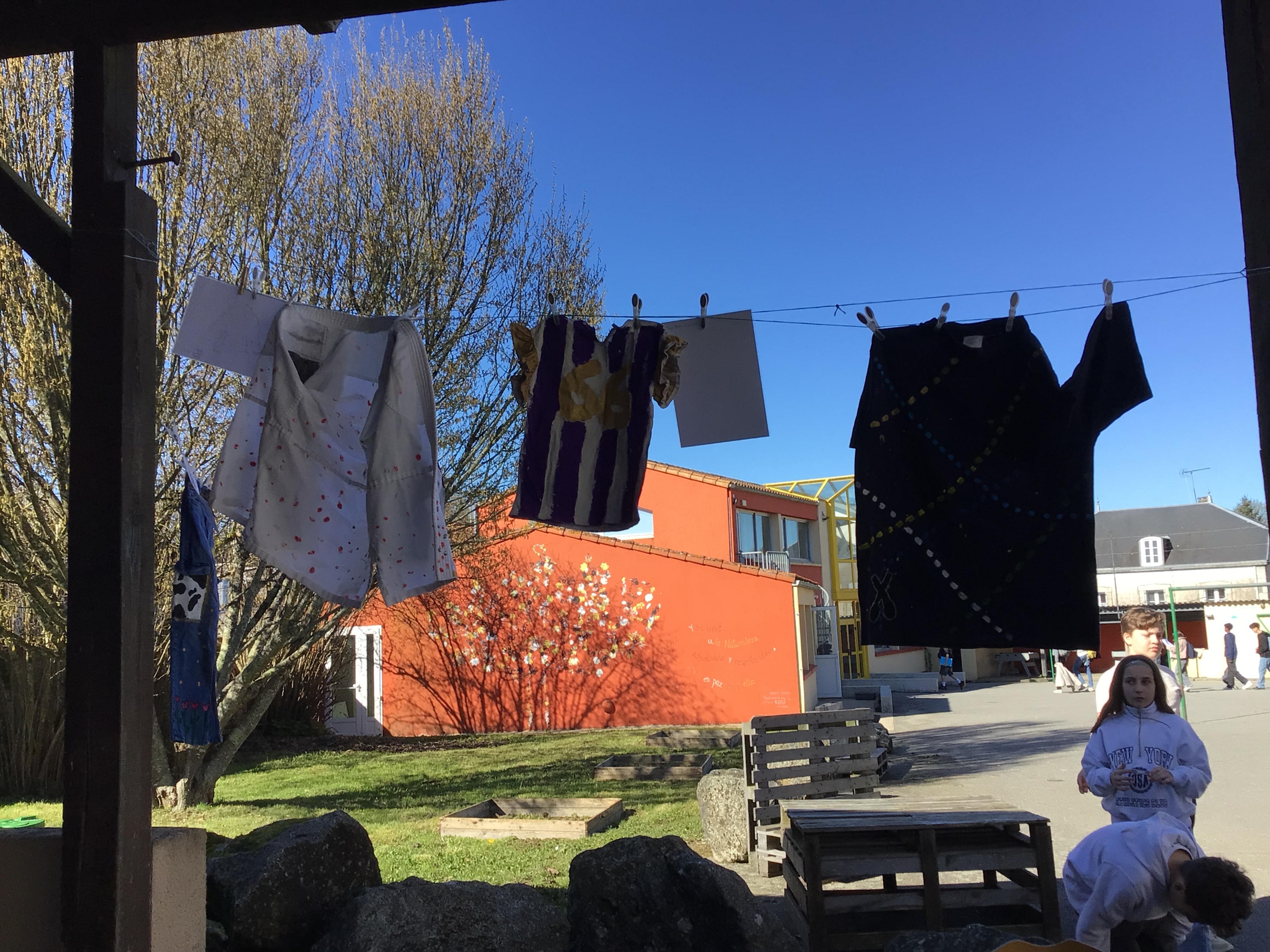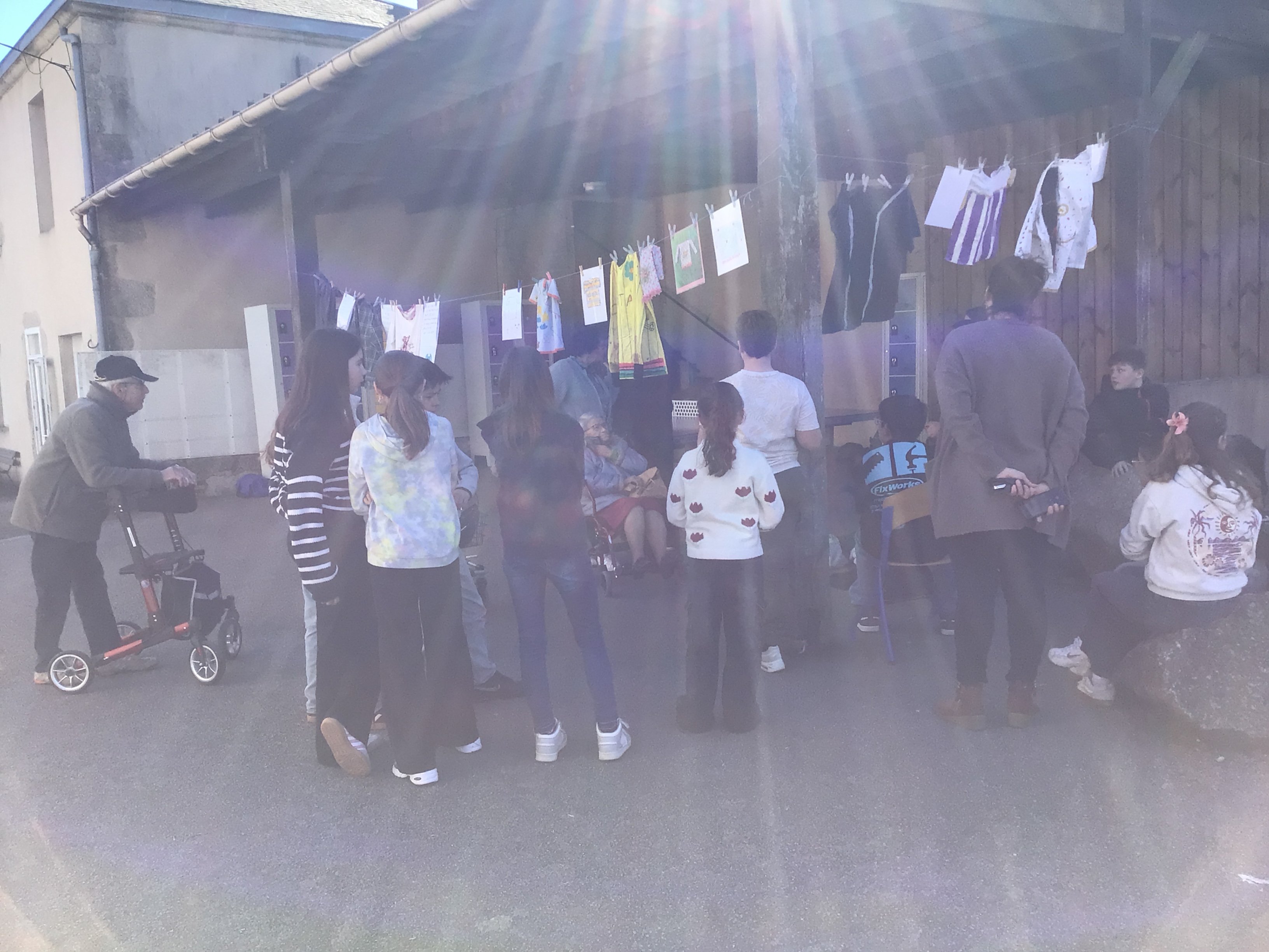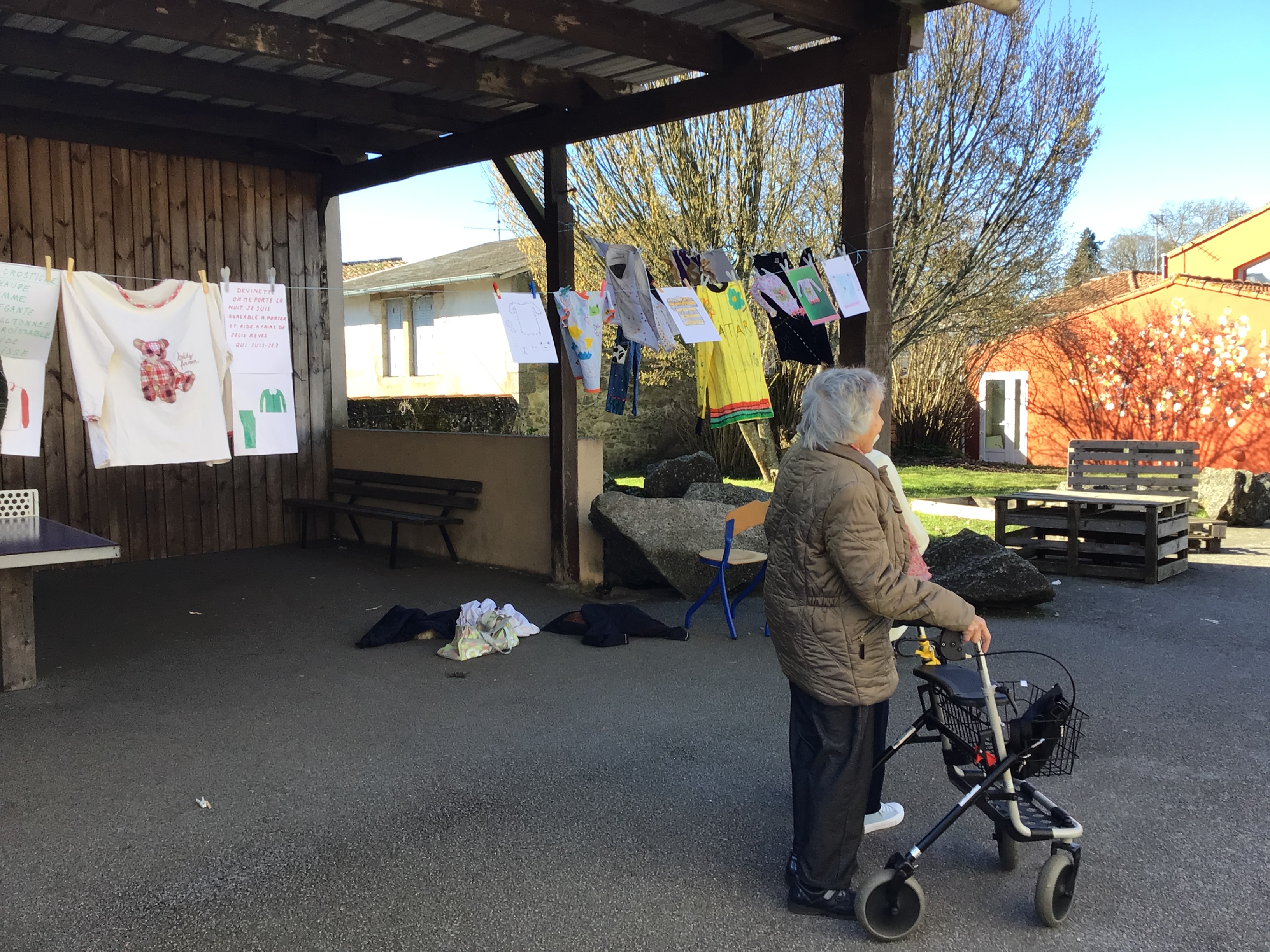 Après midi, un groupe de résidents a rejoint le collège St Joseph de Secondigny à pied par un beau soleil. ils sont allés accrocher leurs créations et les vêtements dans le cadre du projet de la Grande Lessive. les résidents ont rencontré une classe de 6ème. Chacun a pu partager un temps pour expliquer ses choix de créations, la façon de le faire, acrostiche, calligraphie, coudre, peindre....