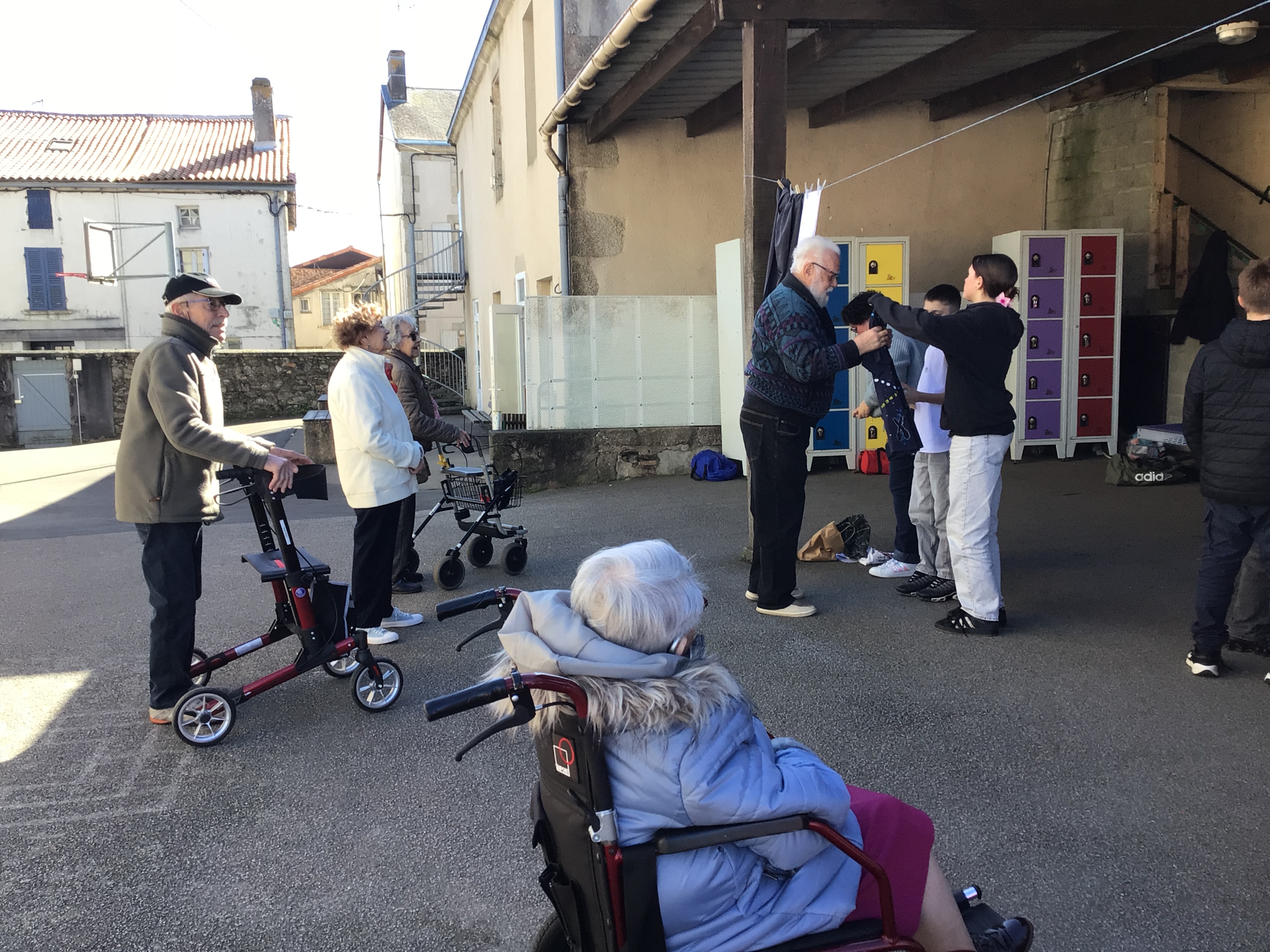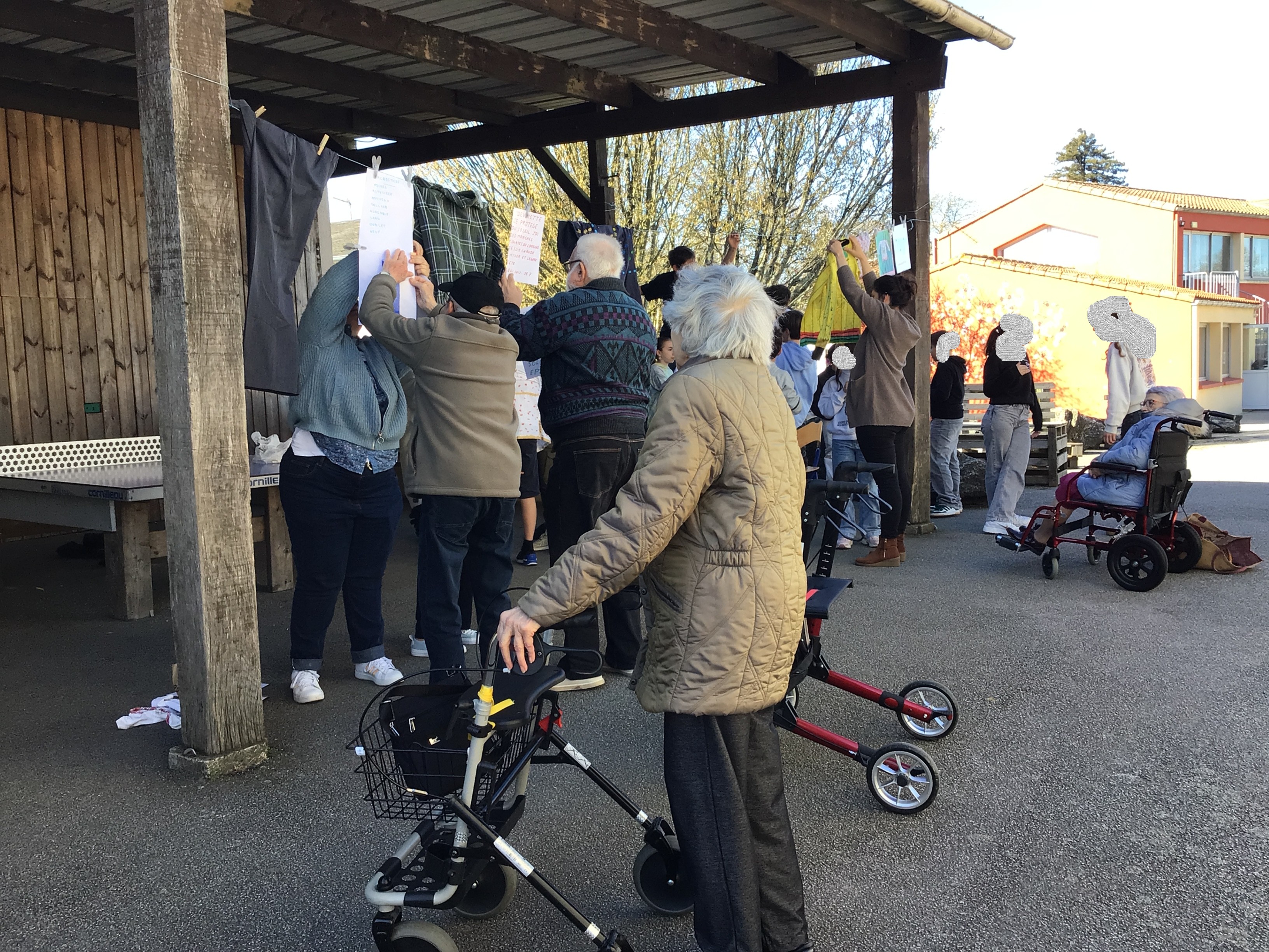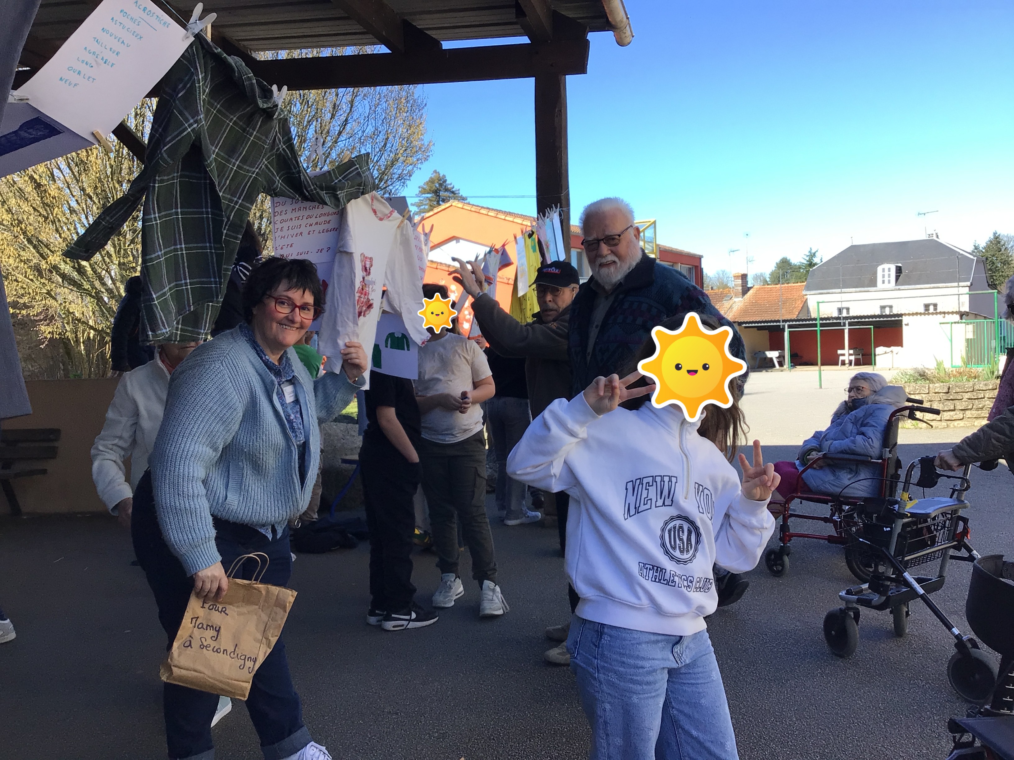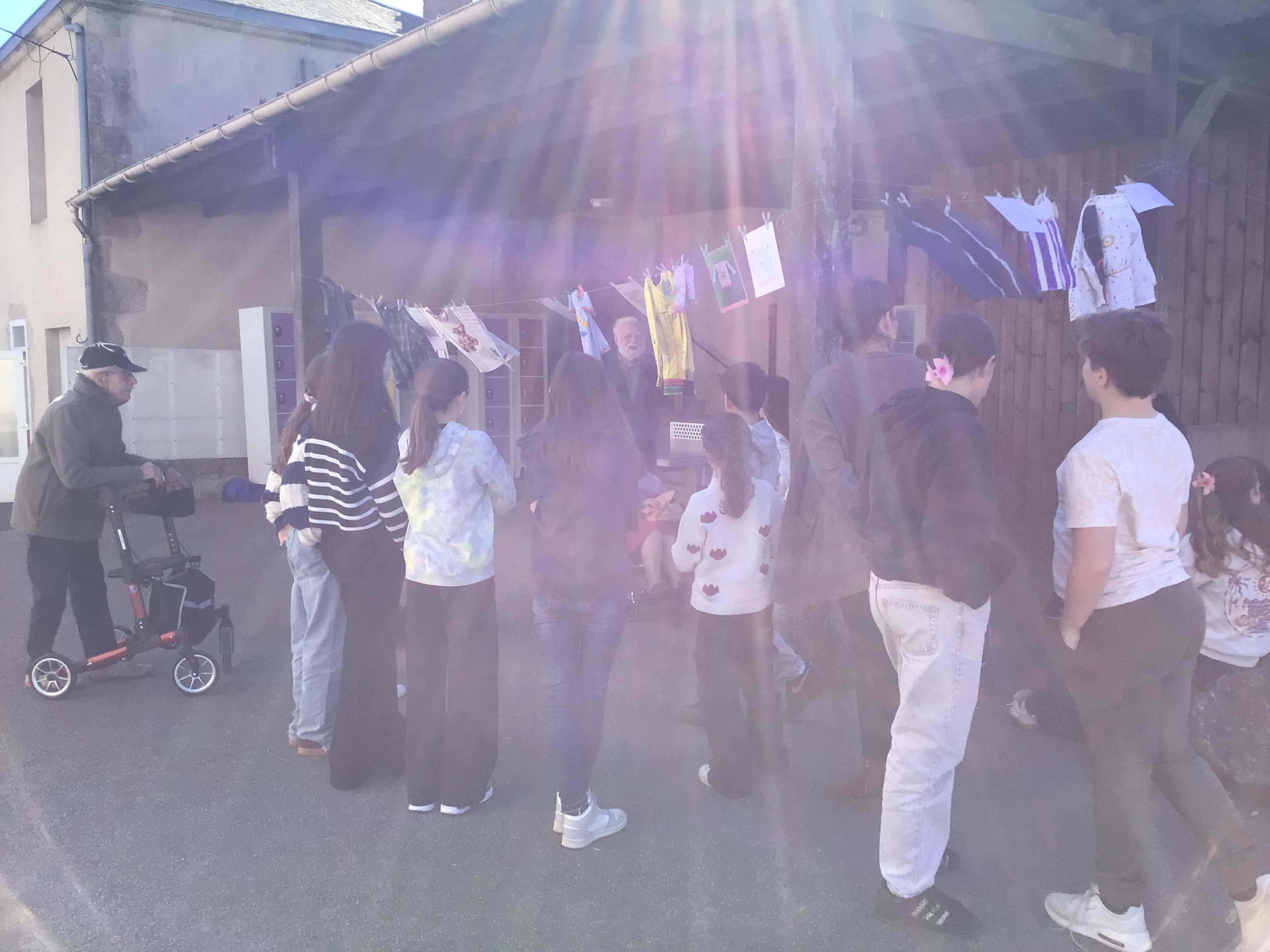 Après midi, un groupe de résidents a rejoint le collège St Joseph de Secondigny à pied par un beau soleil. ils sont allés accrocher leurs créations et les vêtements dans le cadre du projet de la Grande Lessive. les résidents ont rencontré une classe de 6ème. Chacun a pu partager un temps pour expliquer ses choix de créations, la façon de le faire, acrostiche, calligraphie, coudre, peindre....