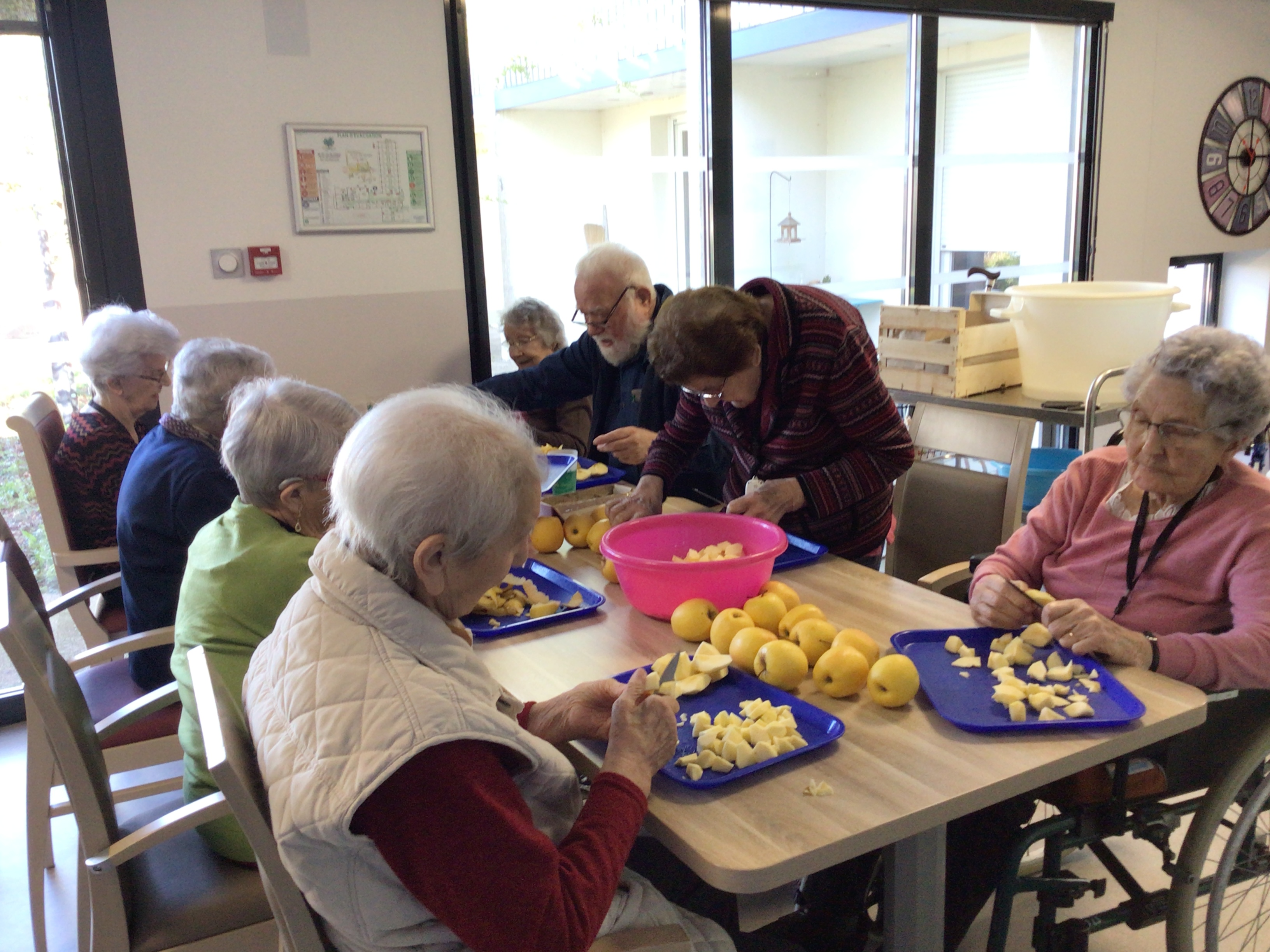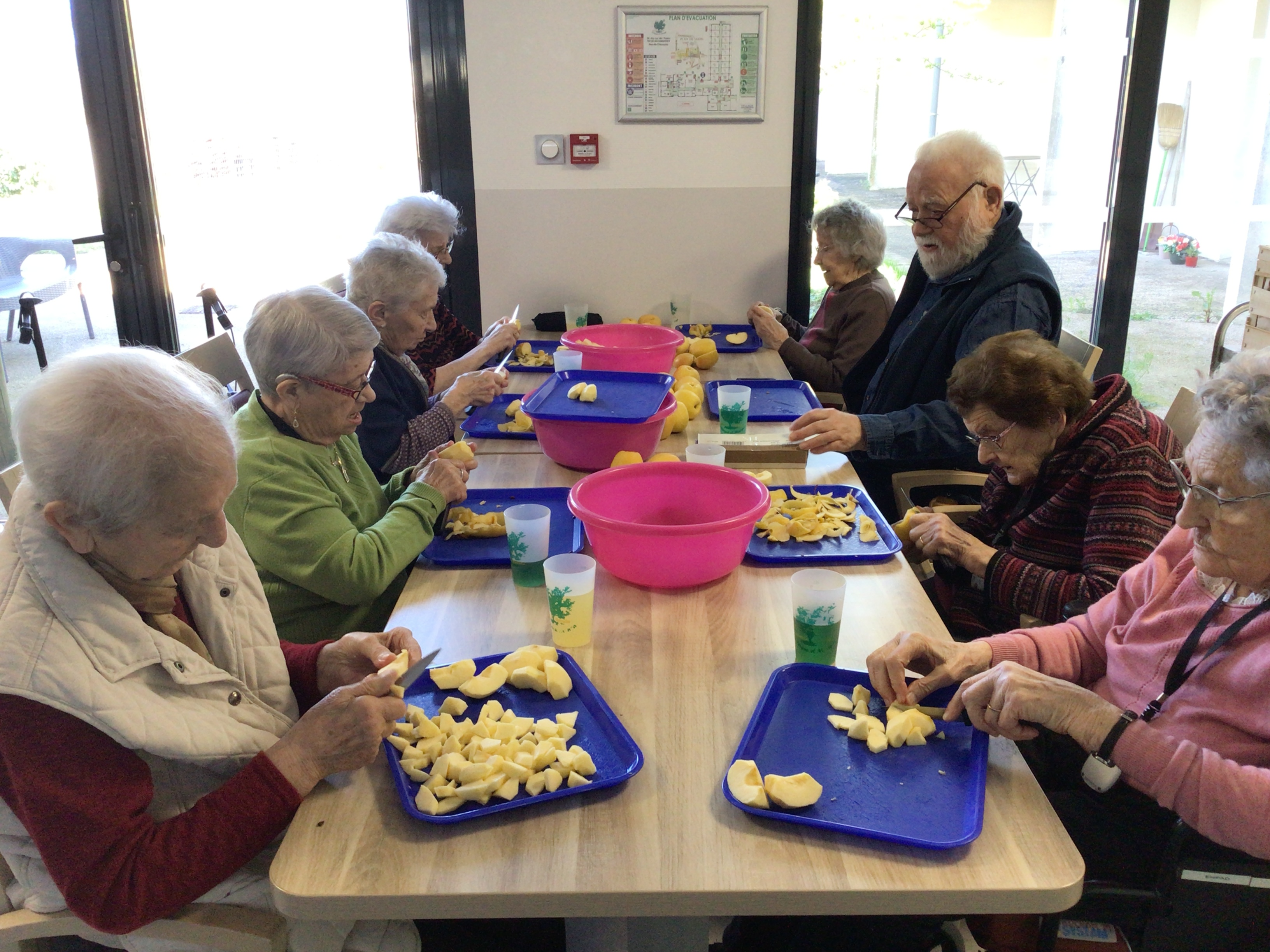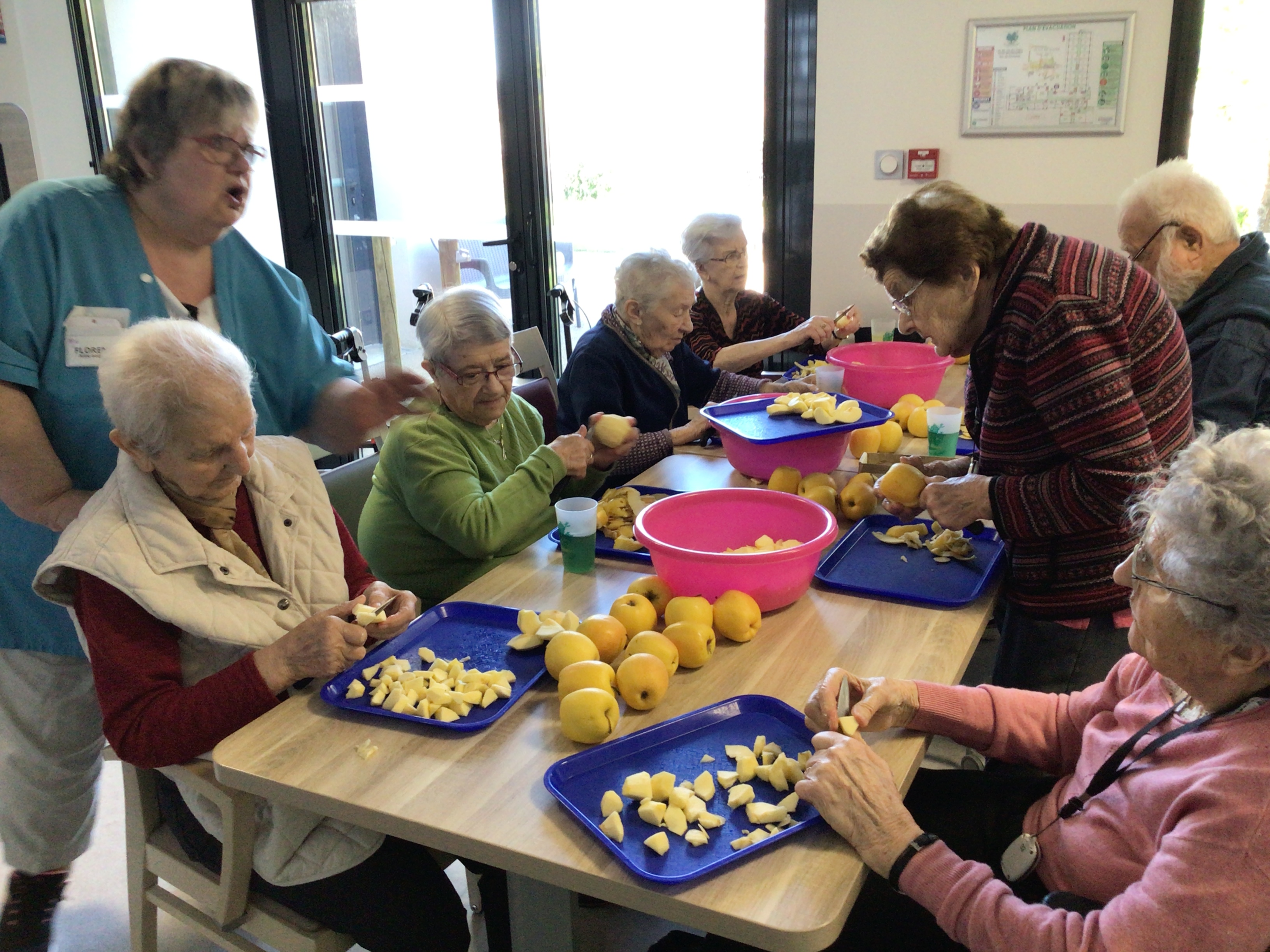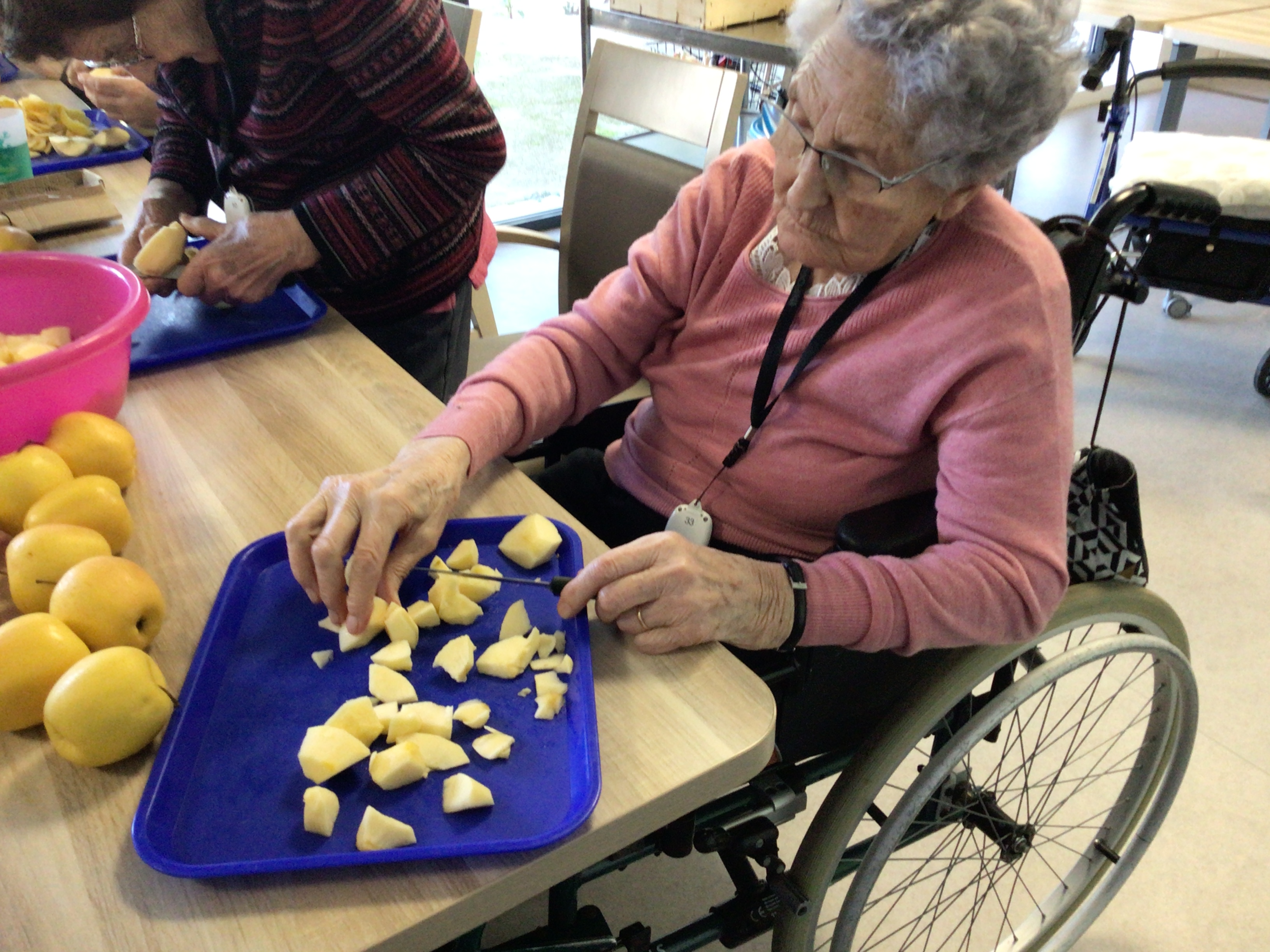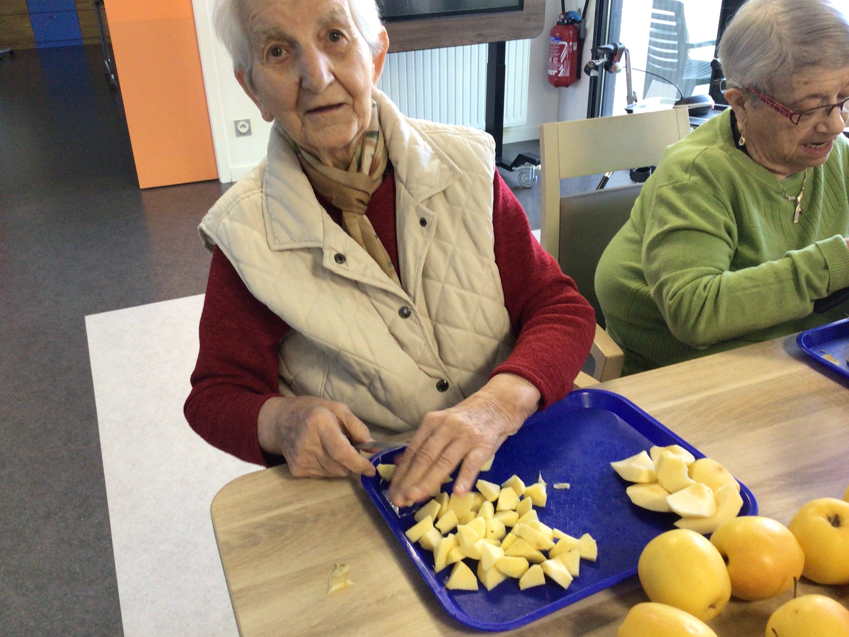 Epluchage de pommes: les doigts agiles de nos aînés ont épluché et coupé les pommes en vu d'une compote maison. Certaines en ont profité pour grignoter quelques petits morceaux de pommes.