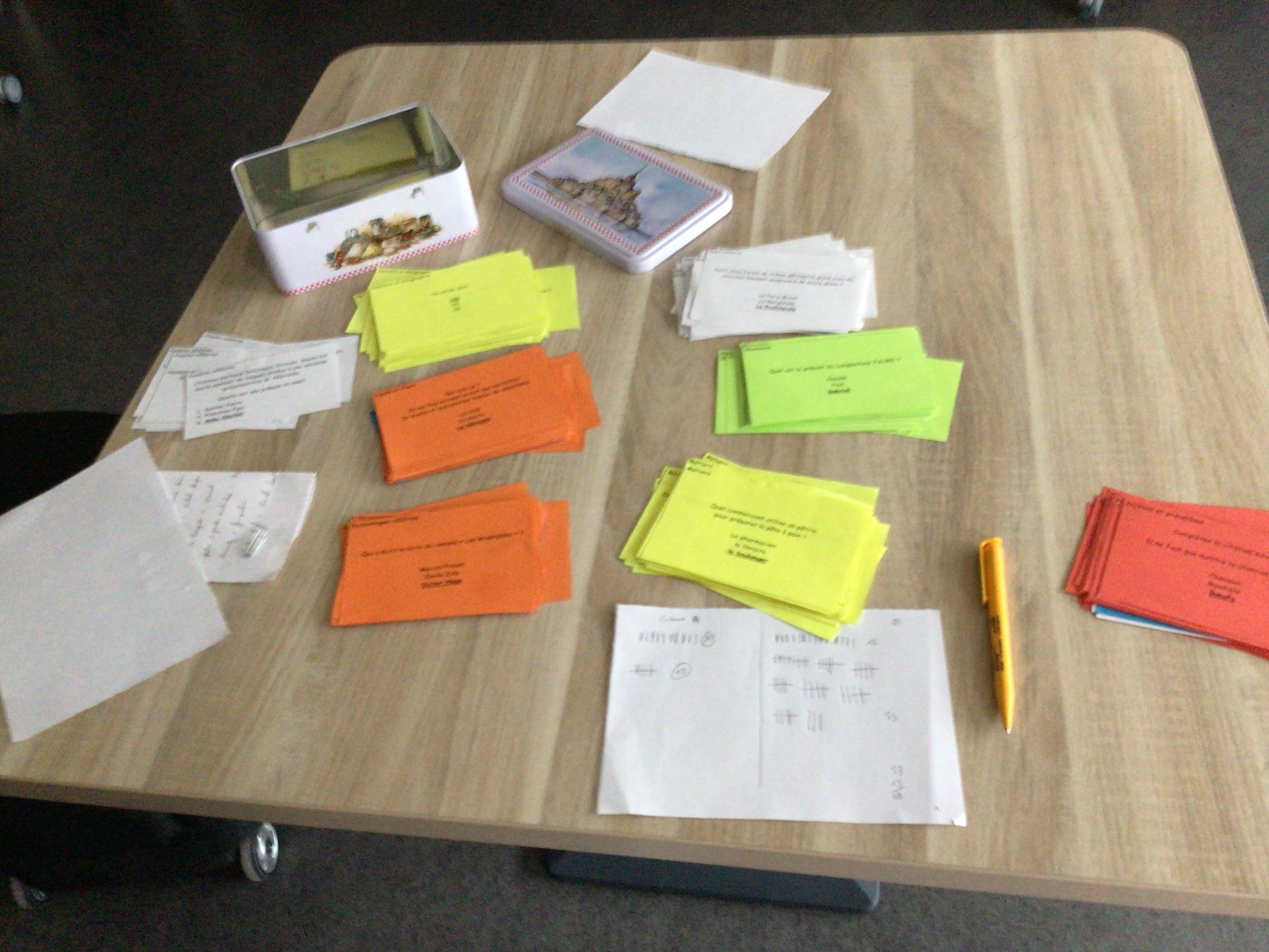 après midi: jeu " questions pour des champions": 2 équipes se sont challengés autour de questions autour de différentes catégories: gastronomie, histoire et géographie, chansons, dictons et proverbes, faunes et flores , personnages célèbres, couples célèbres,... 68 questions ont été élucidés par nos joueurs.