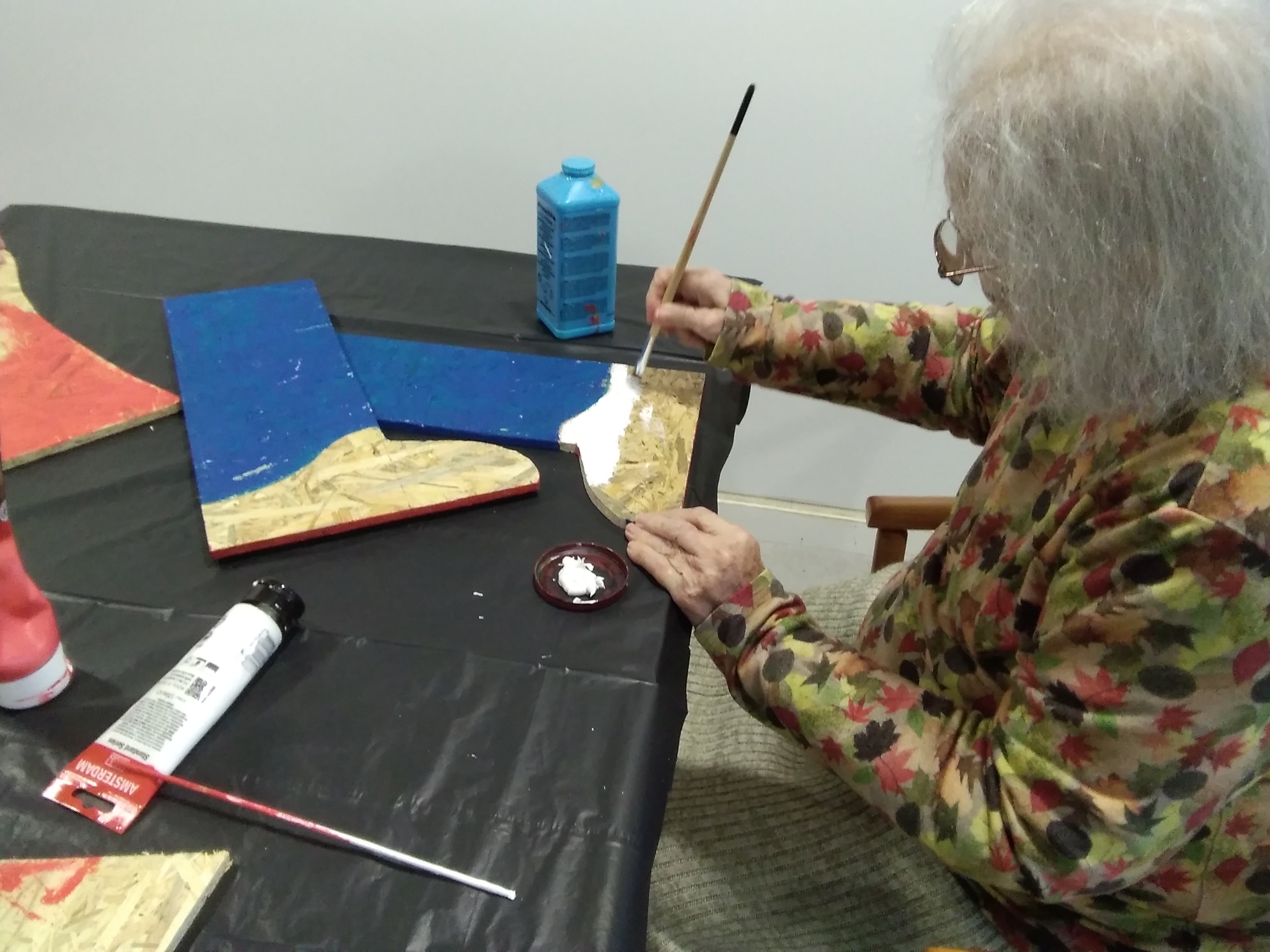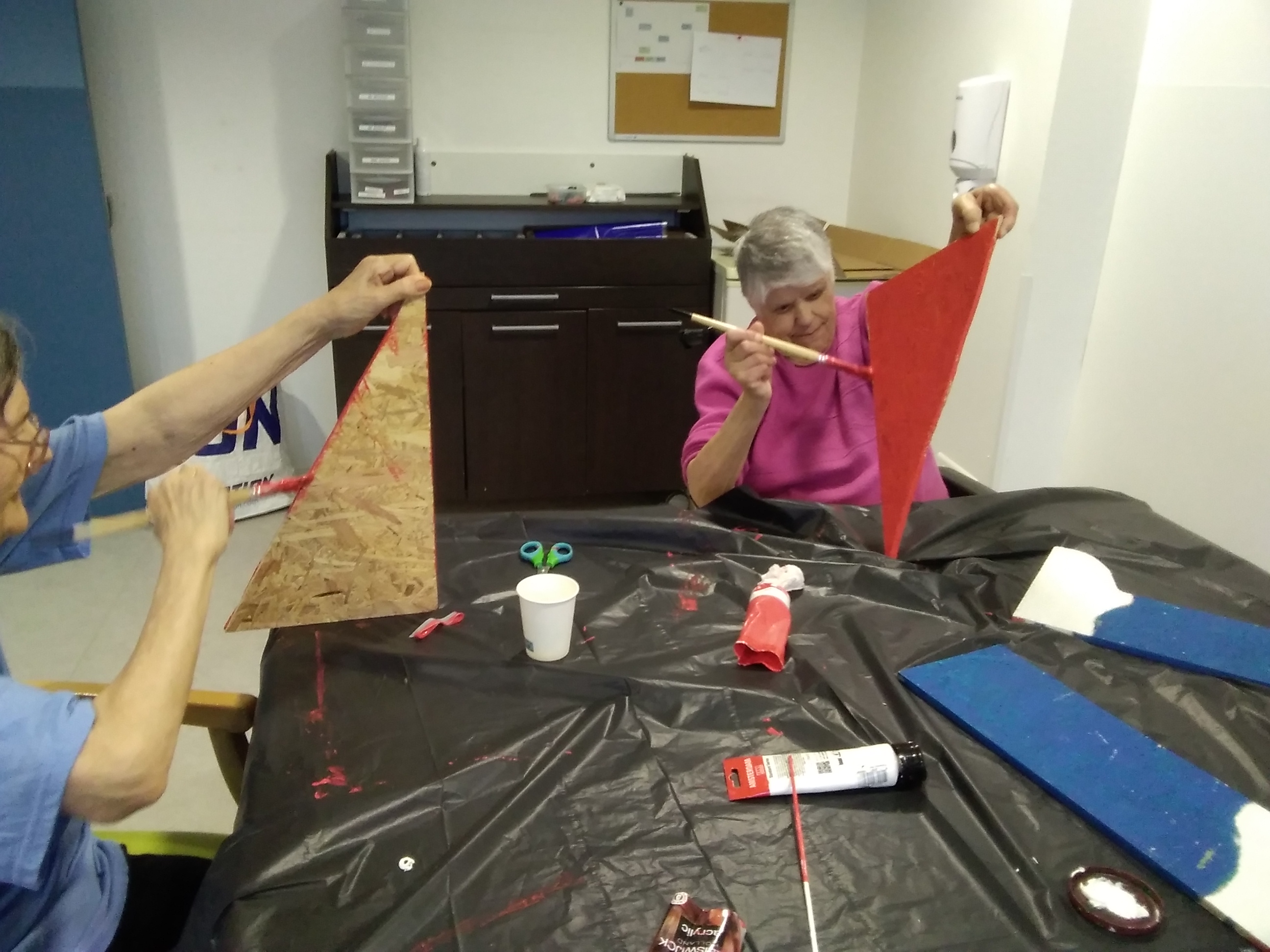 Art thérapie: les dames sous la direction de Brigitte Belaud, art thérapeute, fabrique des supports pour les jeux qui seront utilisés pour les J.O.