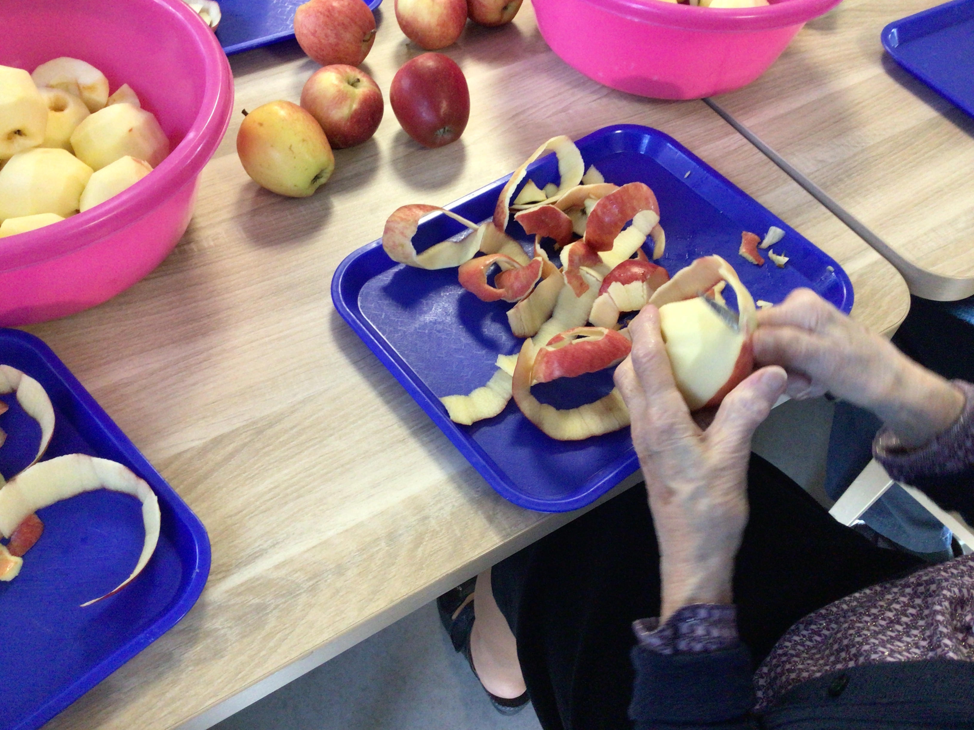 -Epluchage des pommes par les résidents qui permettra de réaliser des pommes cuites qui seront servies en dessert le mercredi midi.