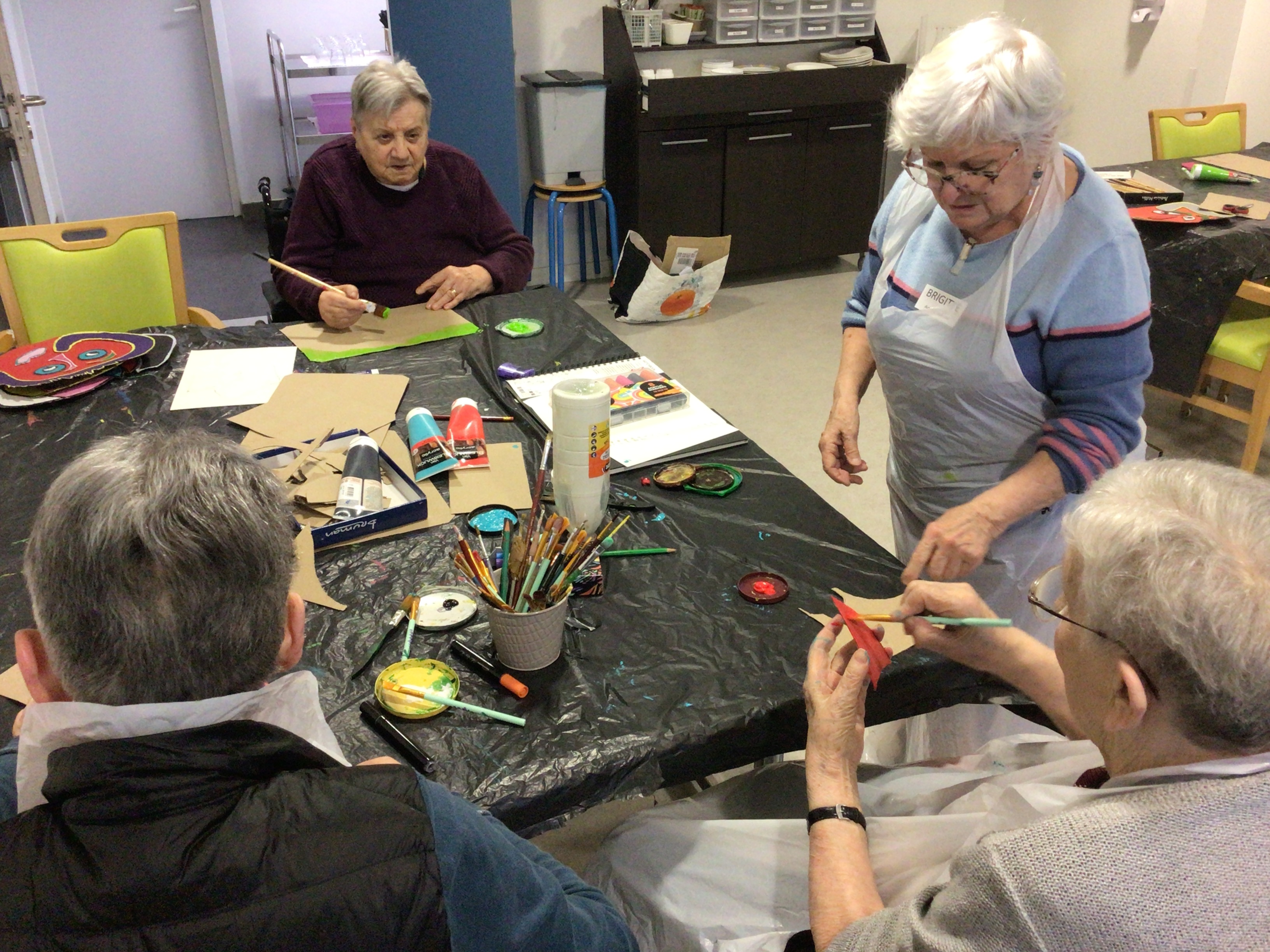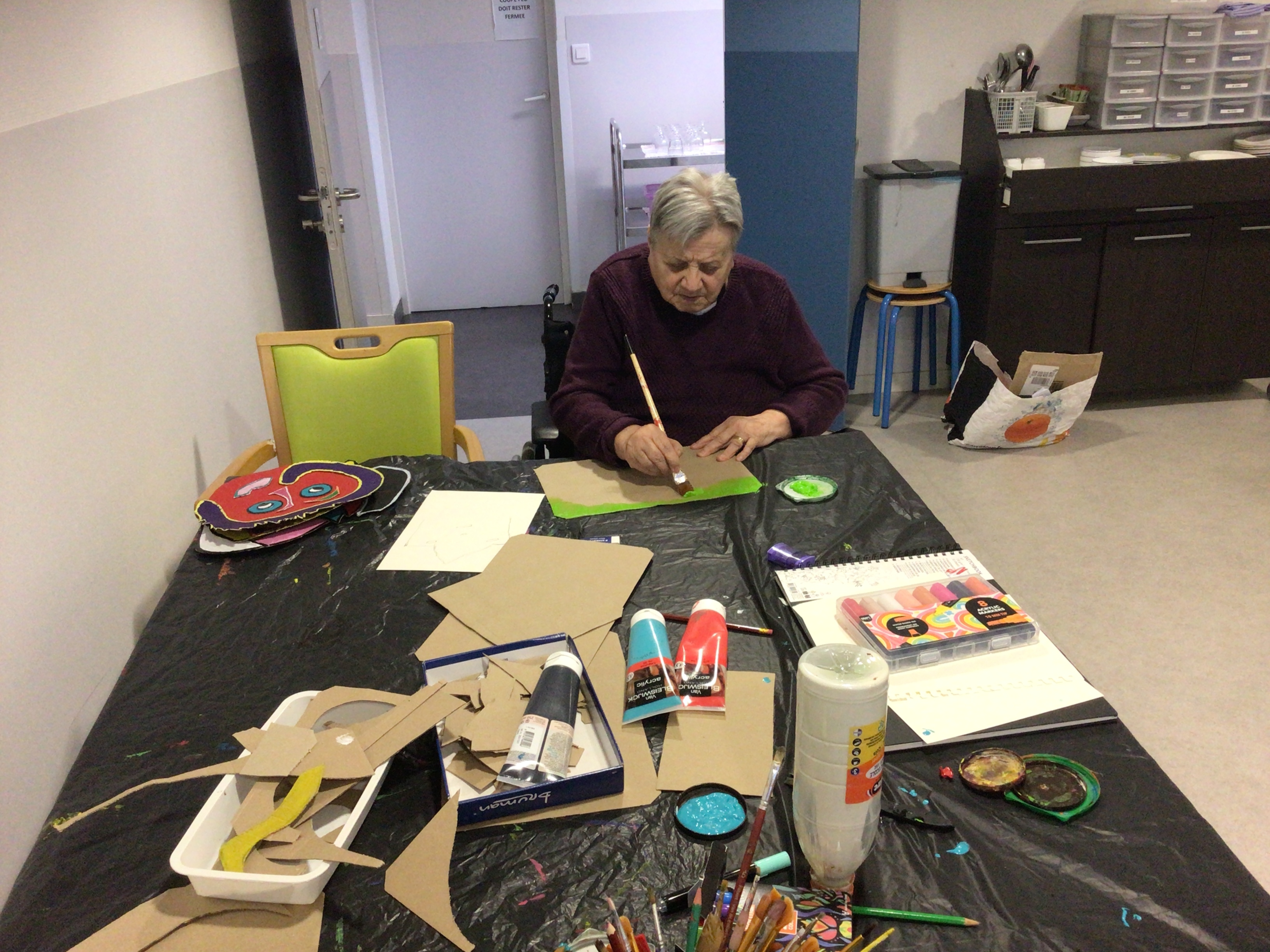 L'art thérapie animé par Brigitte notre art thérapeute, a permis cet après-midi à un groupe de résidentes, de continuer leurs créations en lien avec l'artiste Gaston Chaissac.