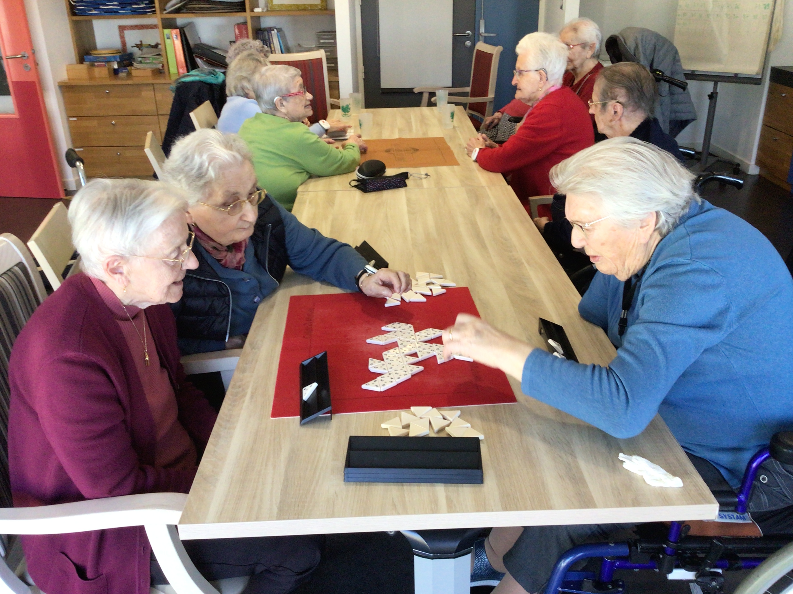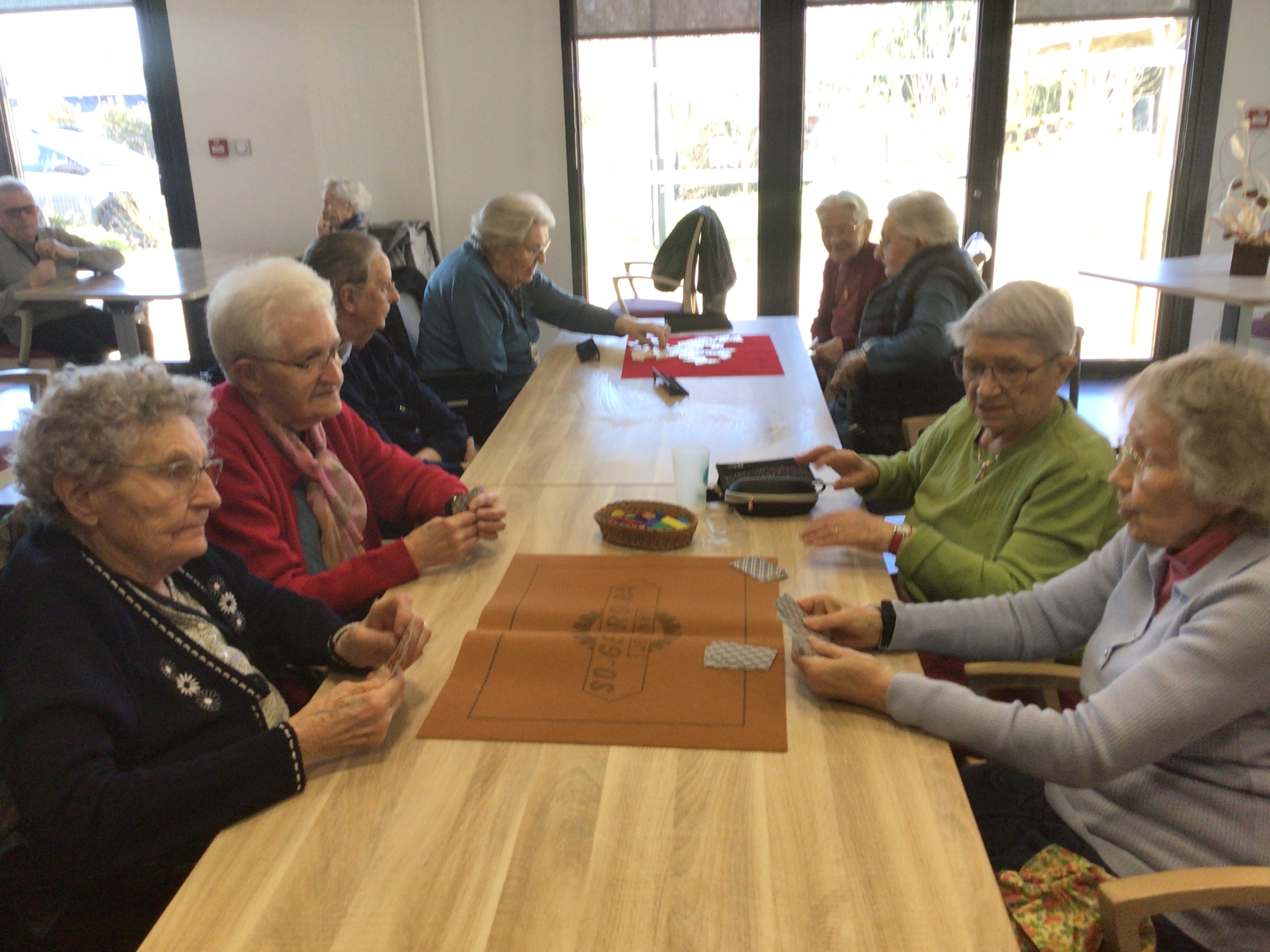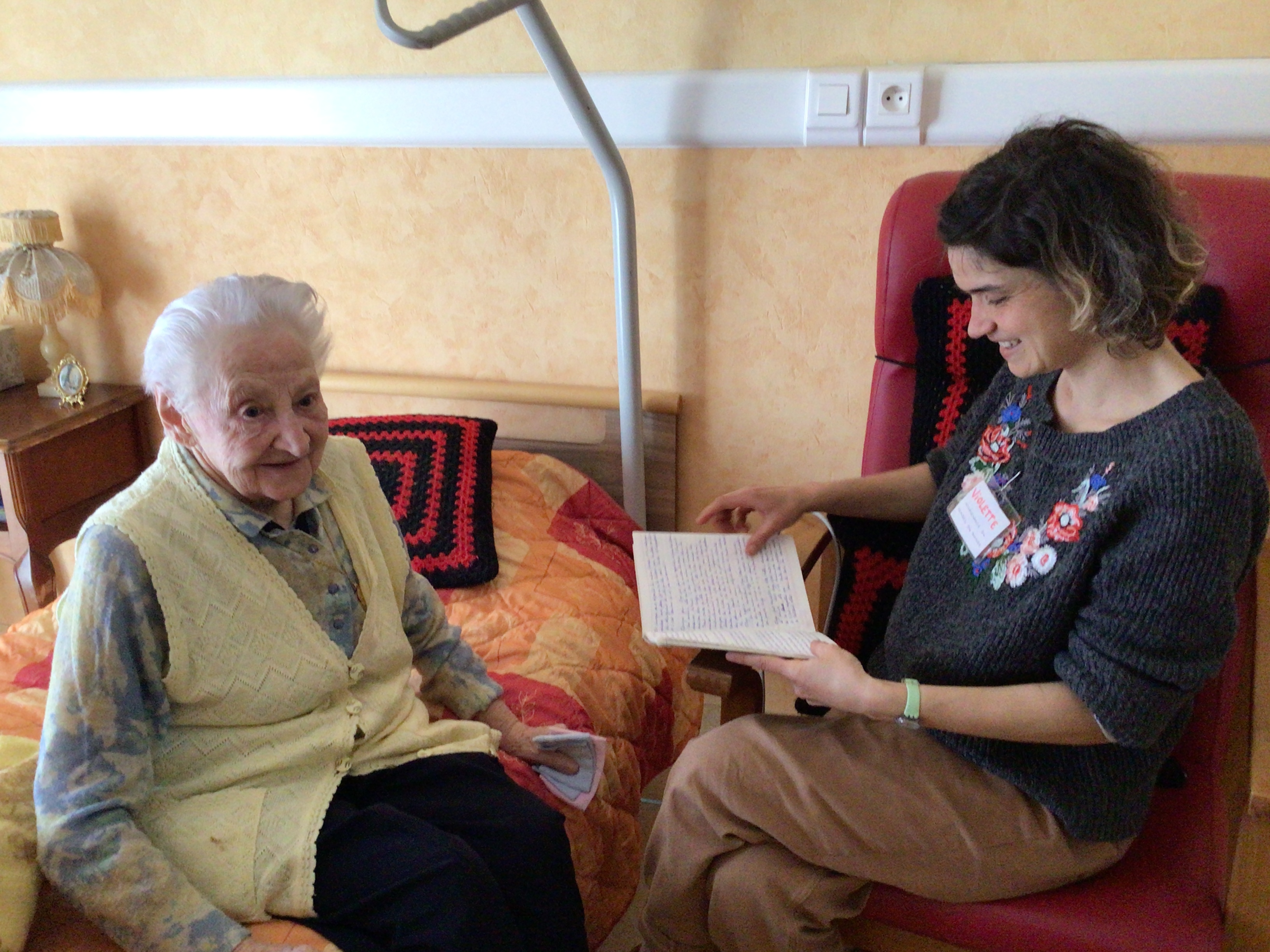 matinée: papote avec Violette: utilisation d'un livre à contes comme support et d'un bulletin communal. les résidents ont plaisir à retrouver Violette du Nombril du Monde tous les jours.