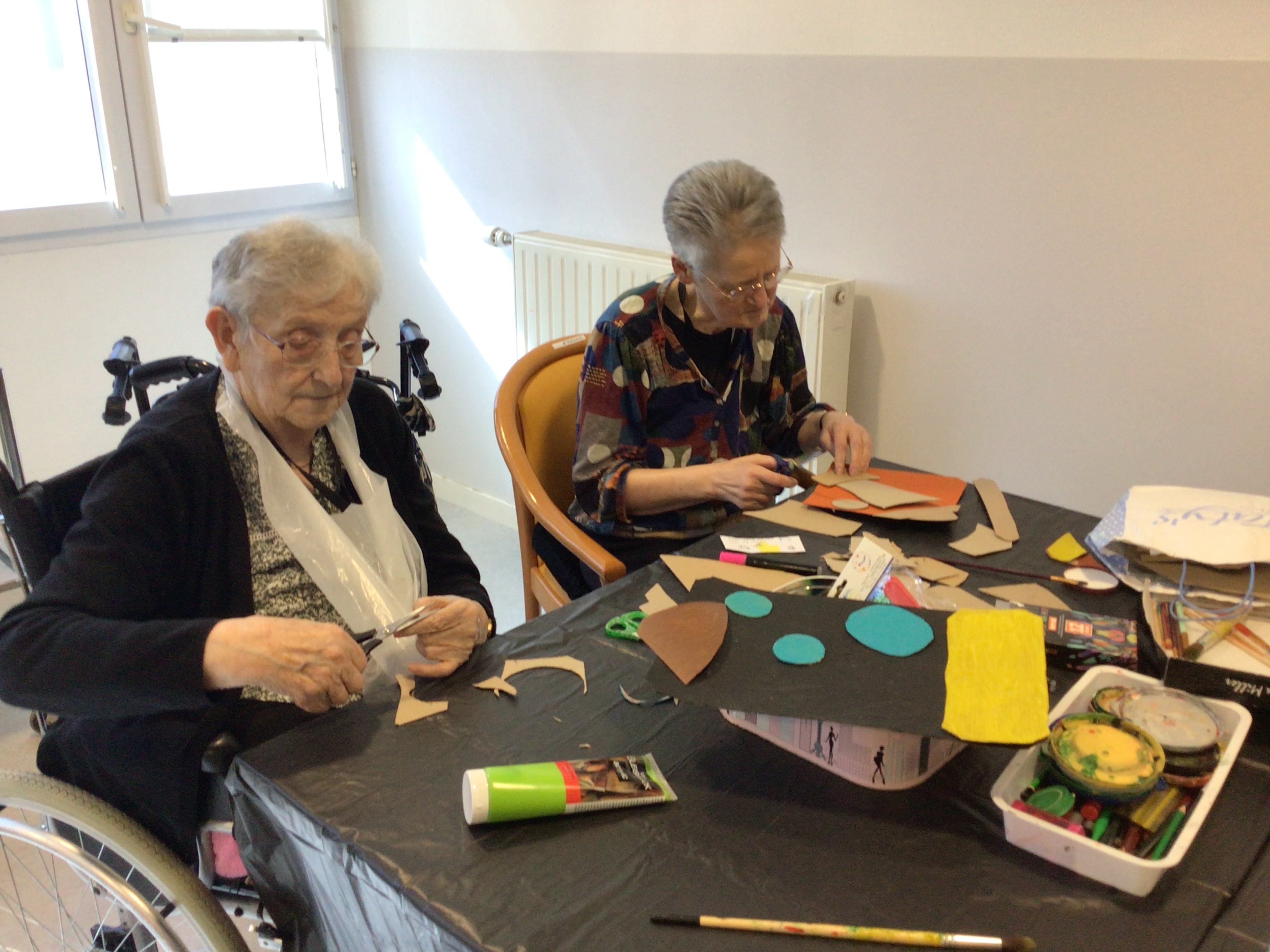 Après midi: art thérapie : le groupe prépare des supports de décoration pour Pâques à l'aide de pochoir. D'autres résidentes souhaitent continuer sur leurs oeuvres en vue d'une exposition fin mai sur le thème Gaston Chaissac.