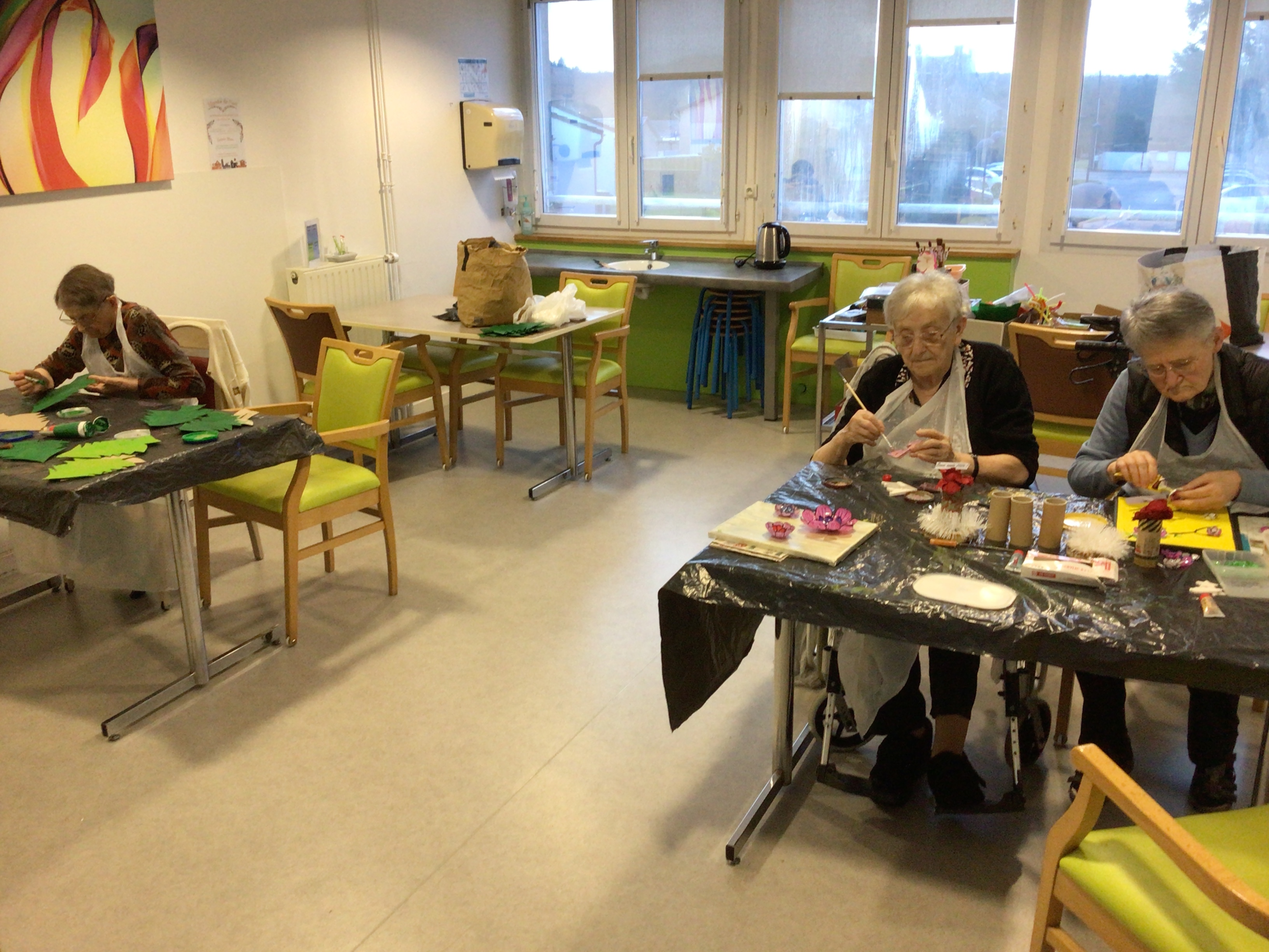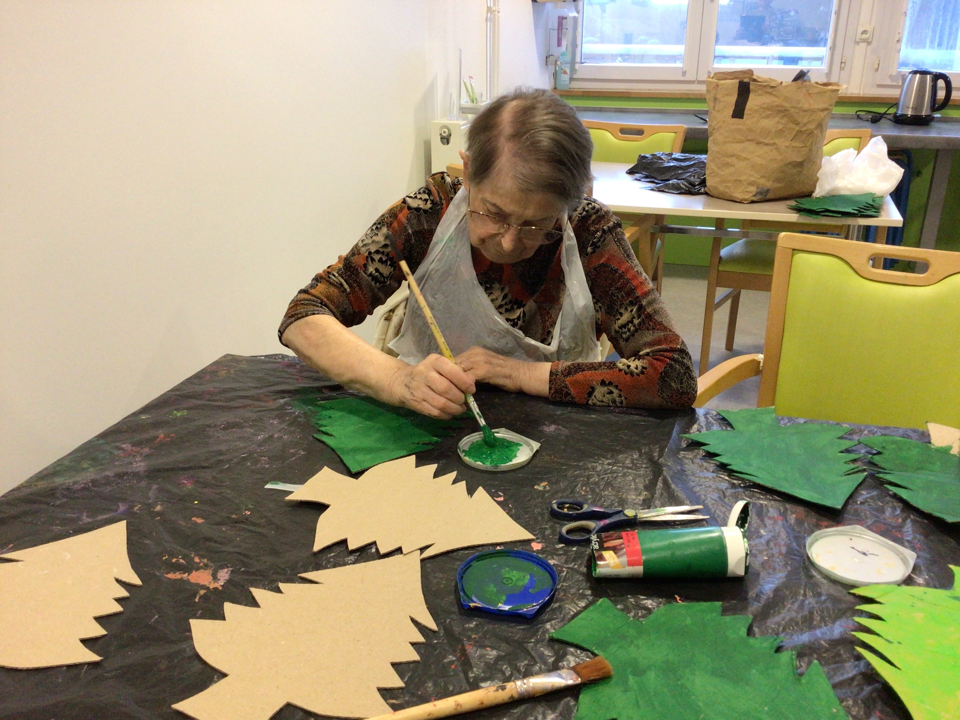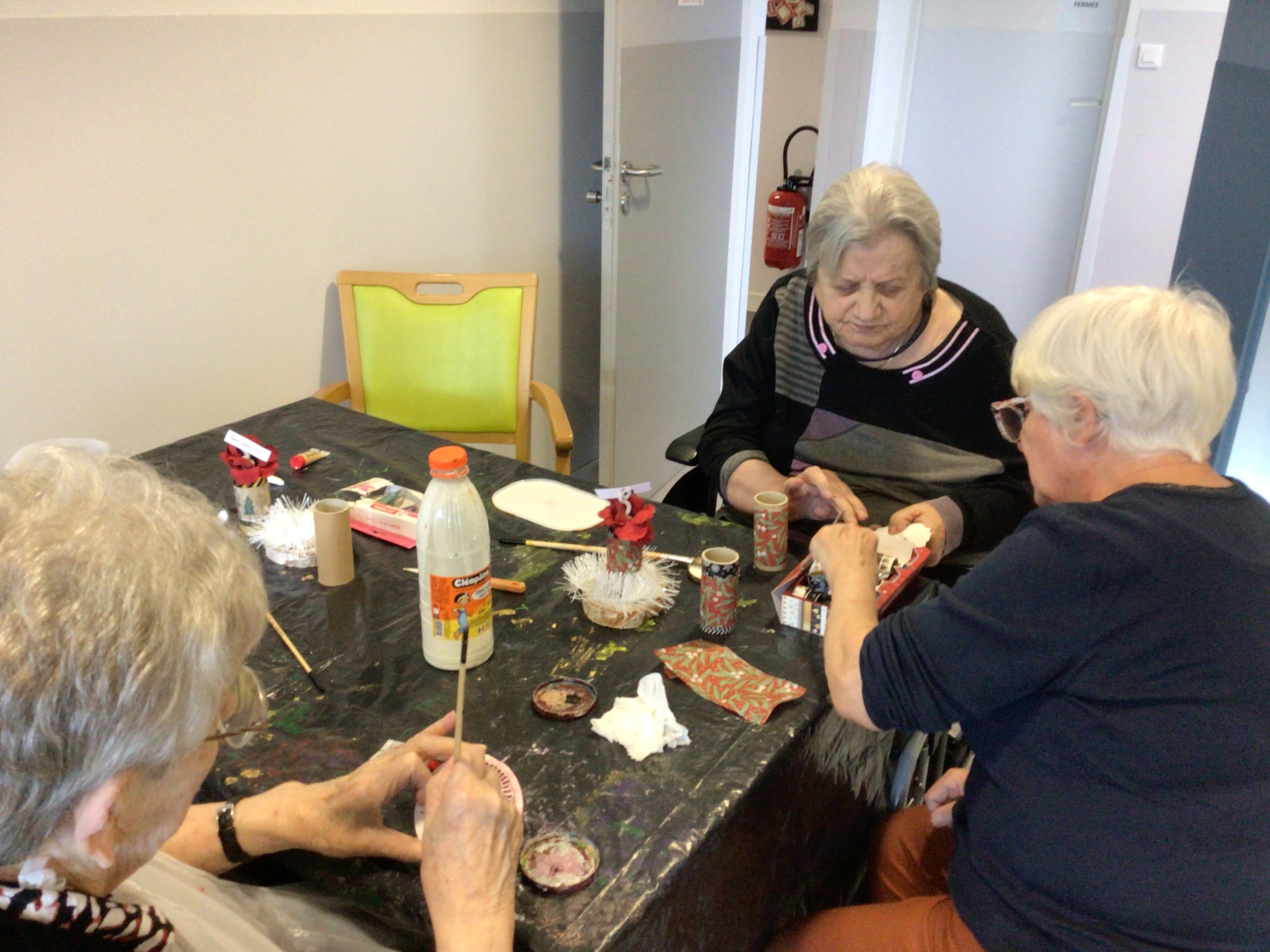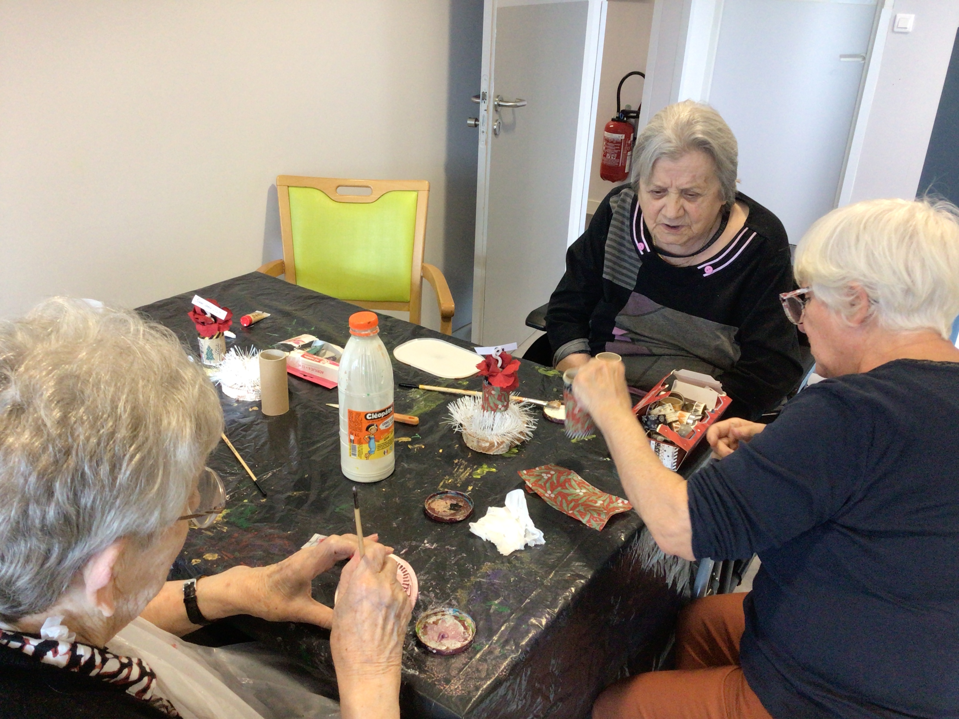 -Atelier Art thérapie avec Brigitte Belaud. Les résidents s'impliquent dans la préparation de décorations pour Noël.