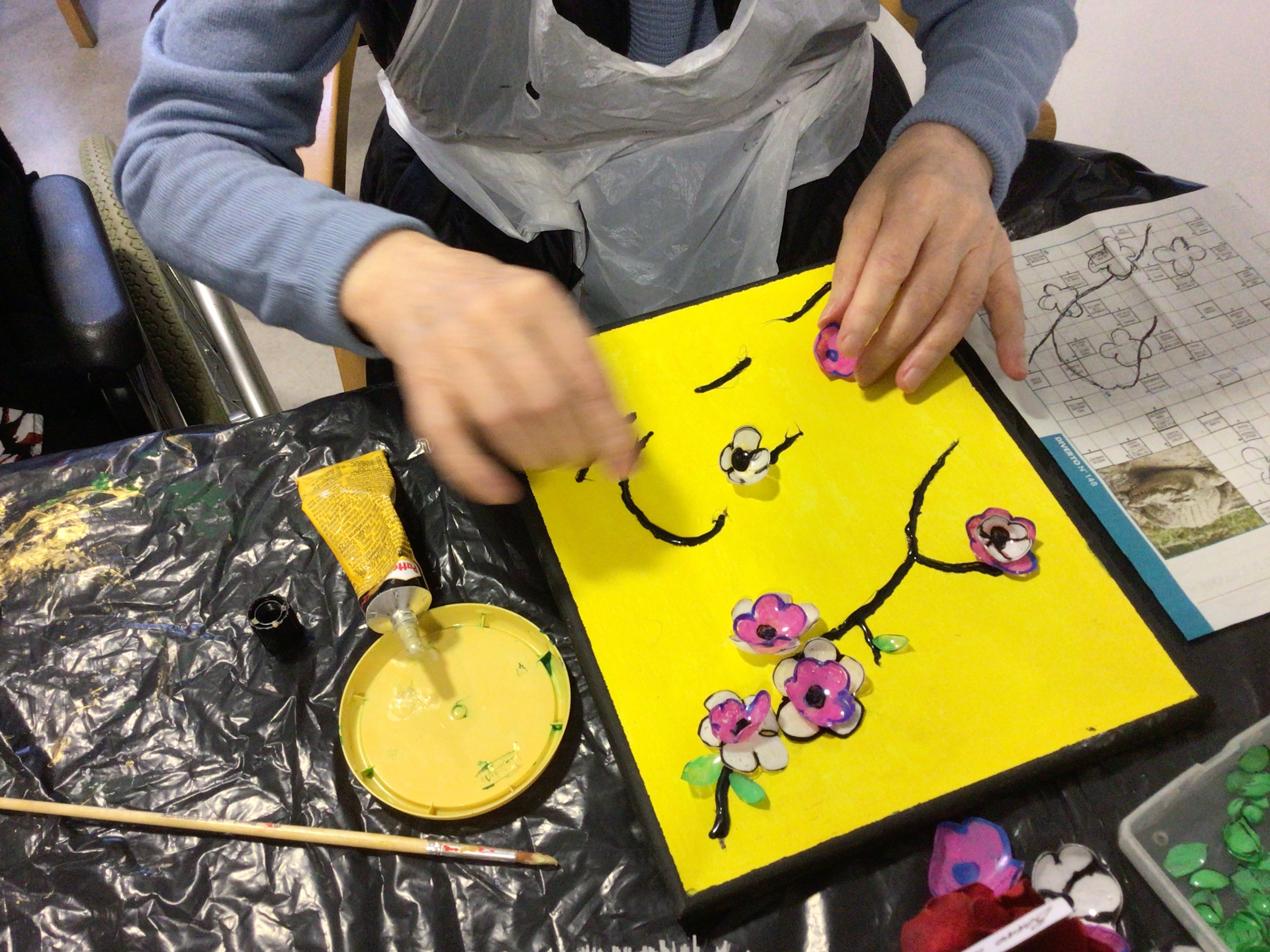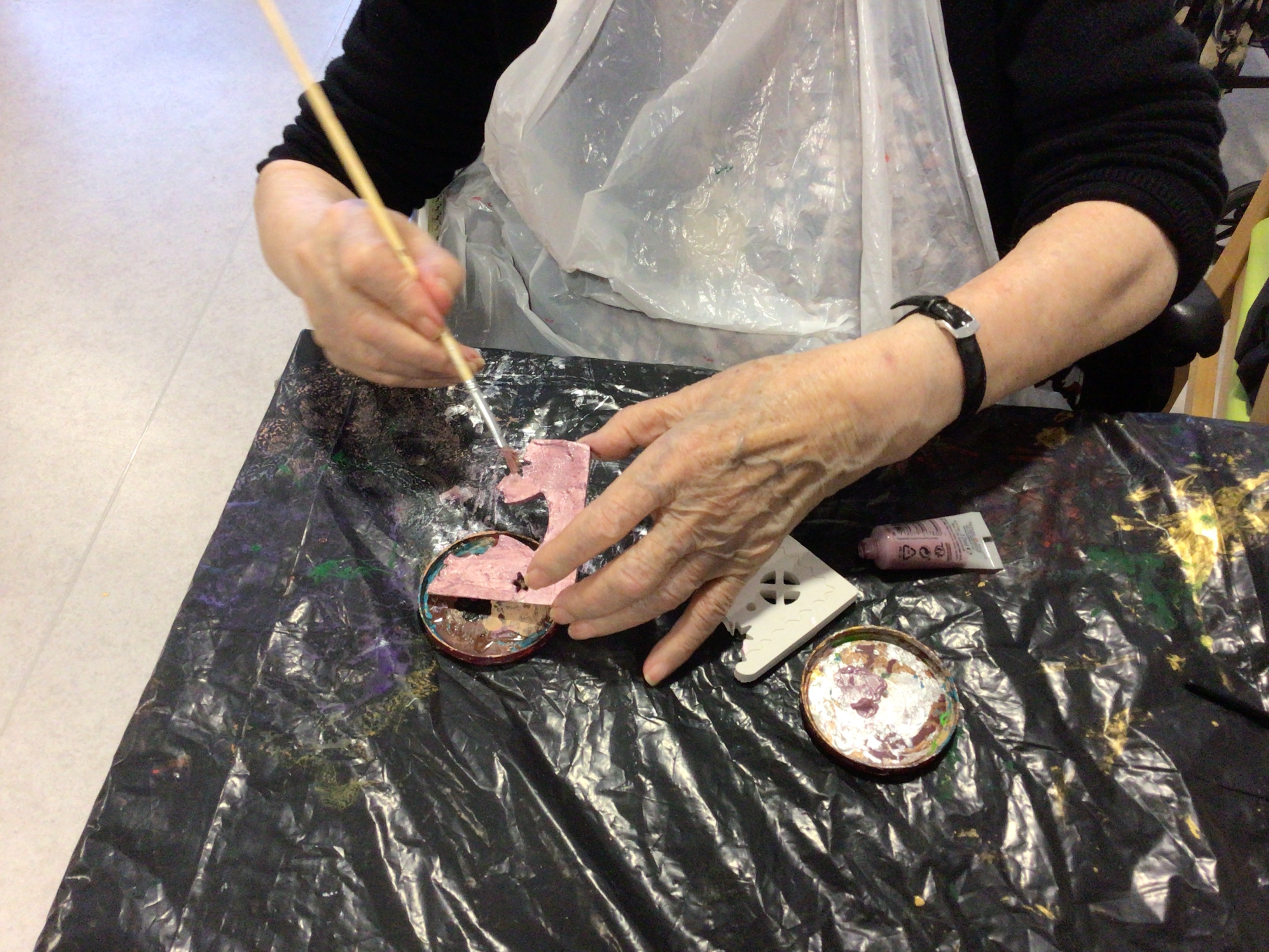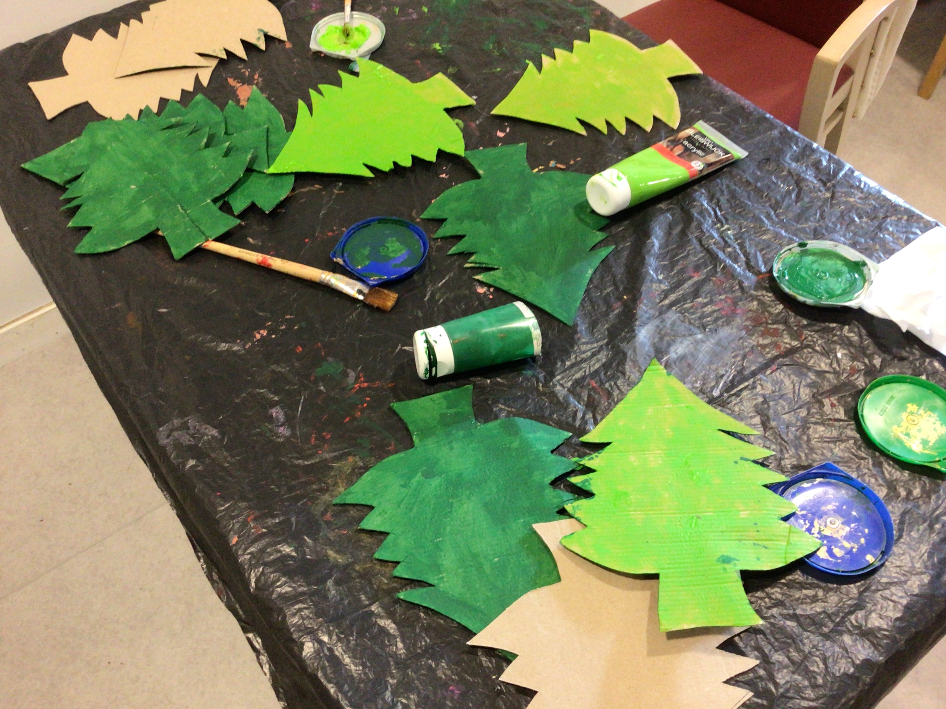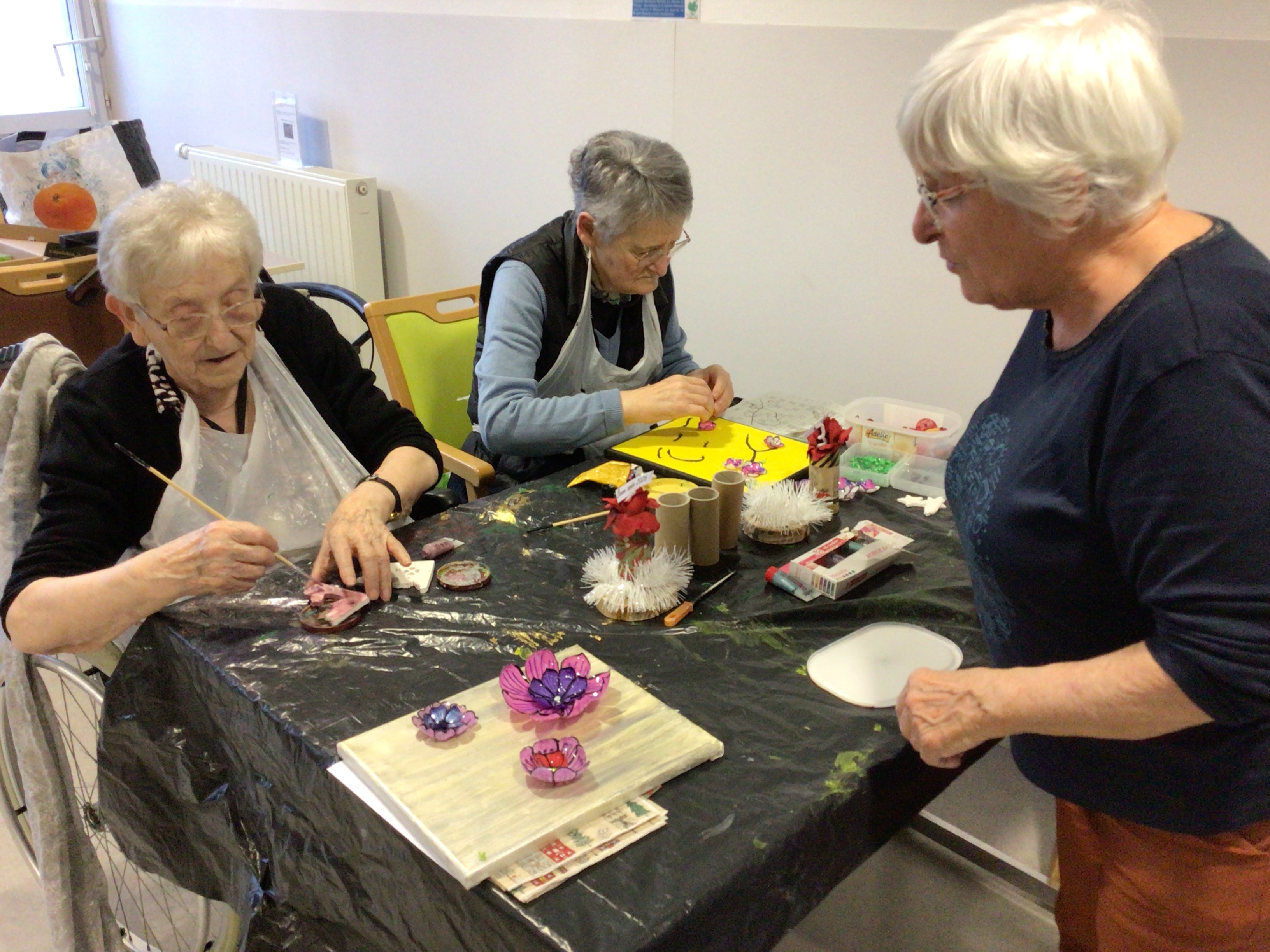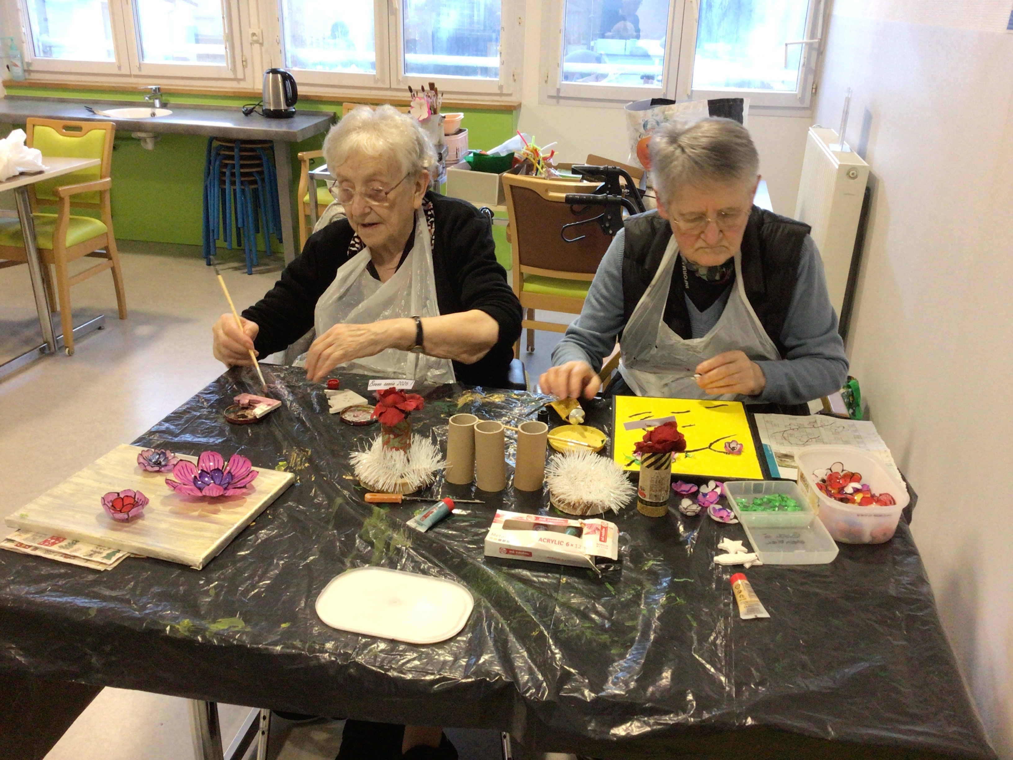 -Atelier Art thérapie avec Brigitte Belaud. Les résidents s'impliquent dans la préparation de décorations pour Noël.