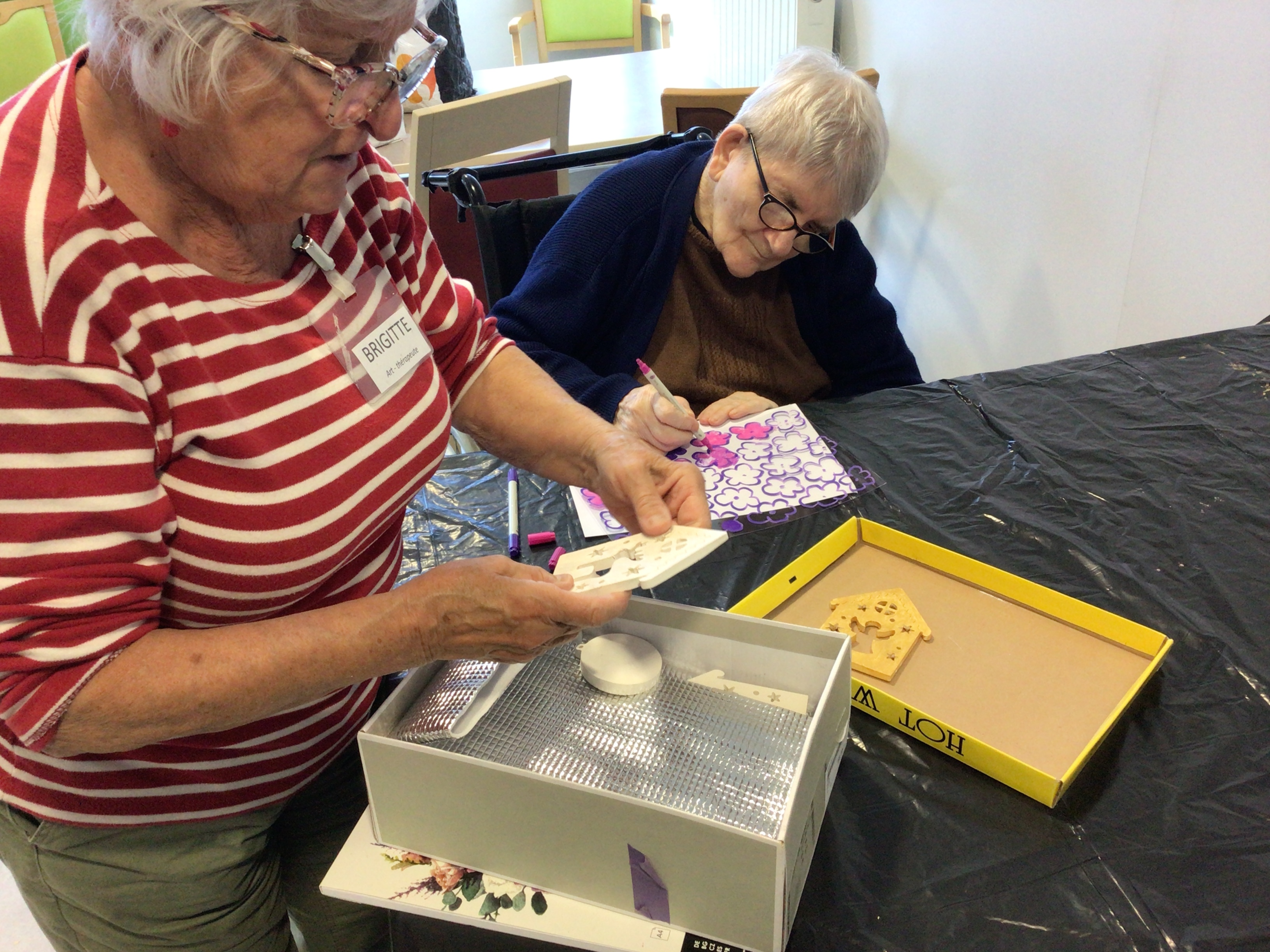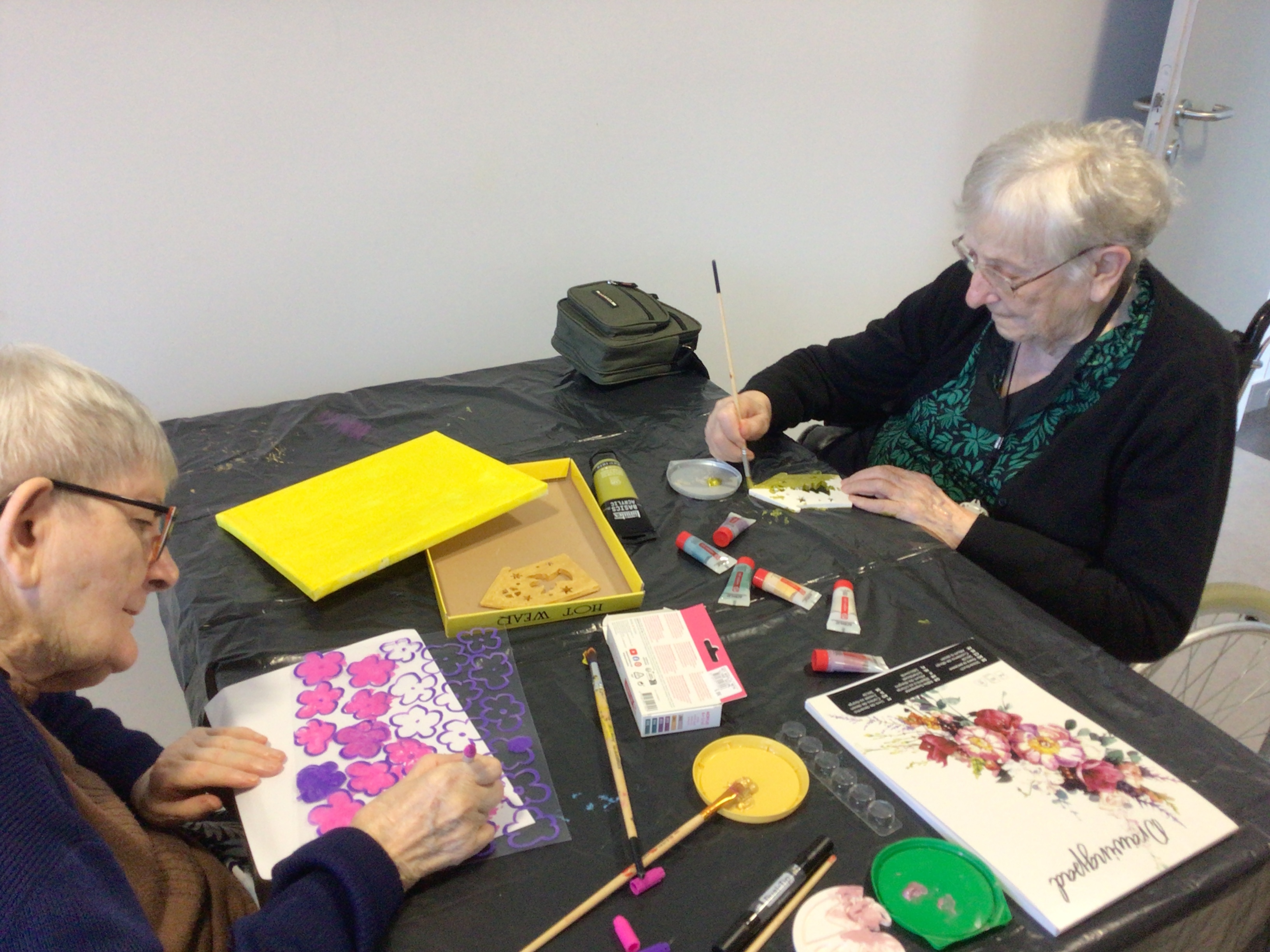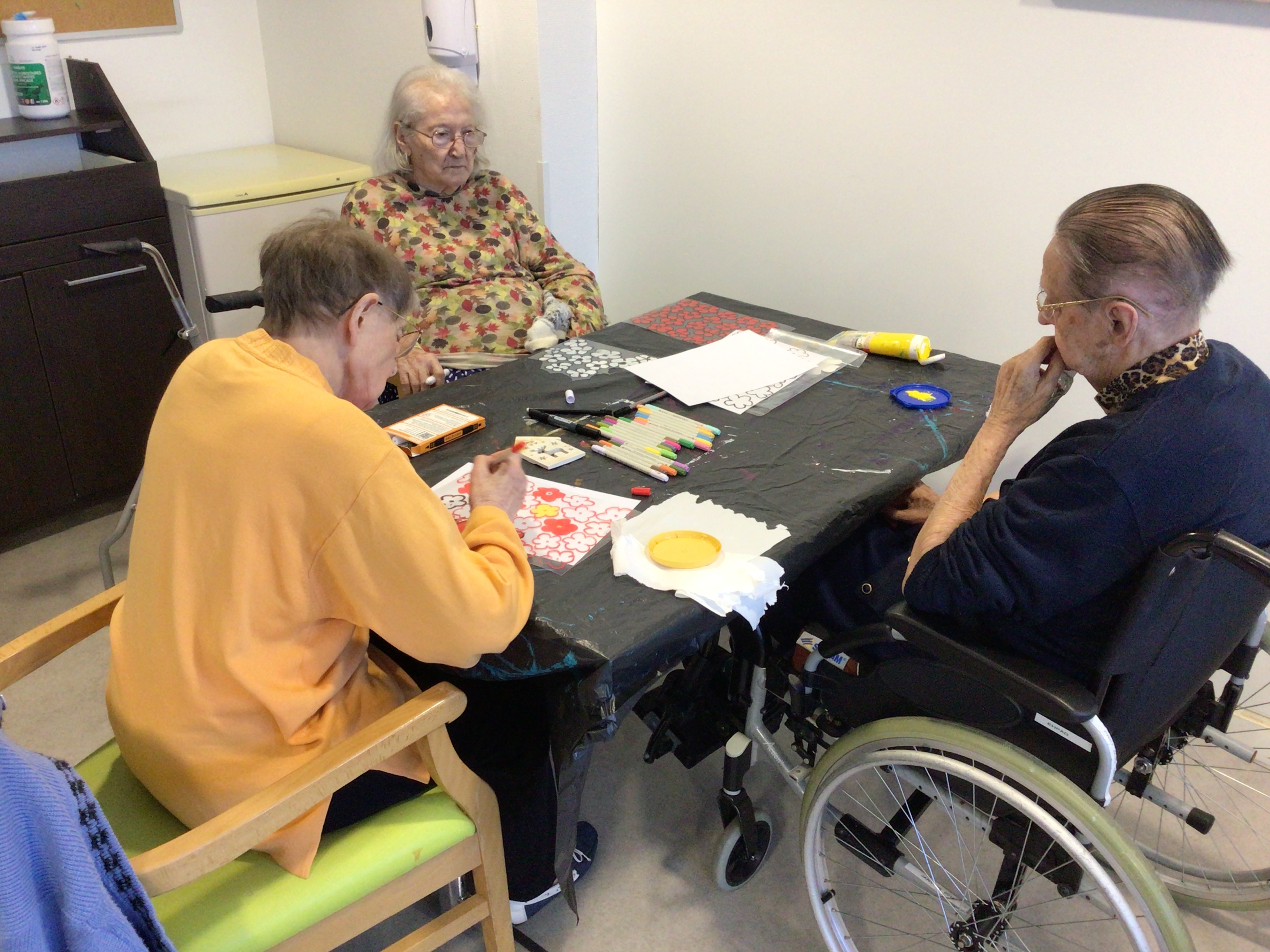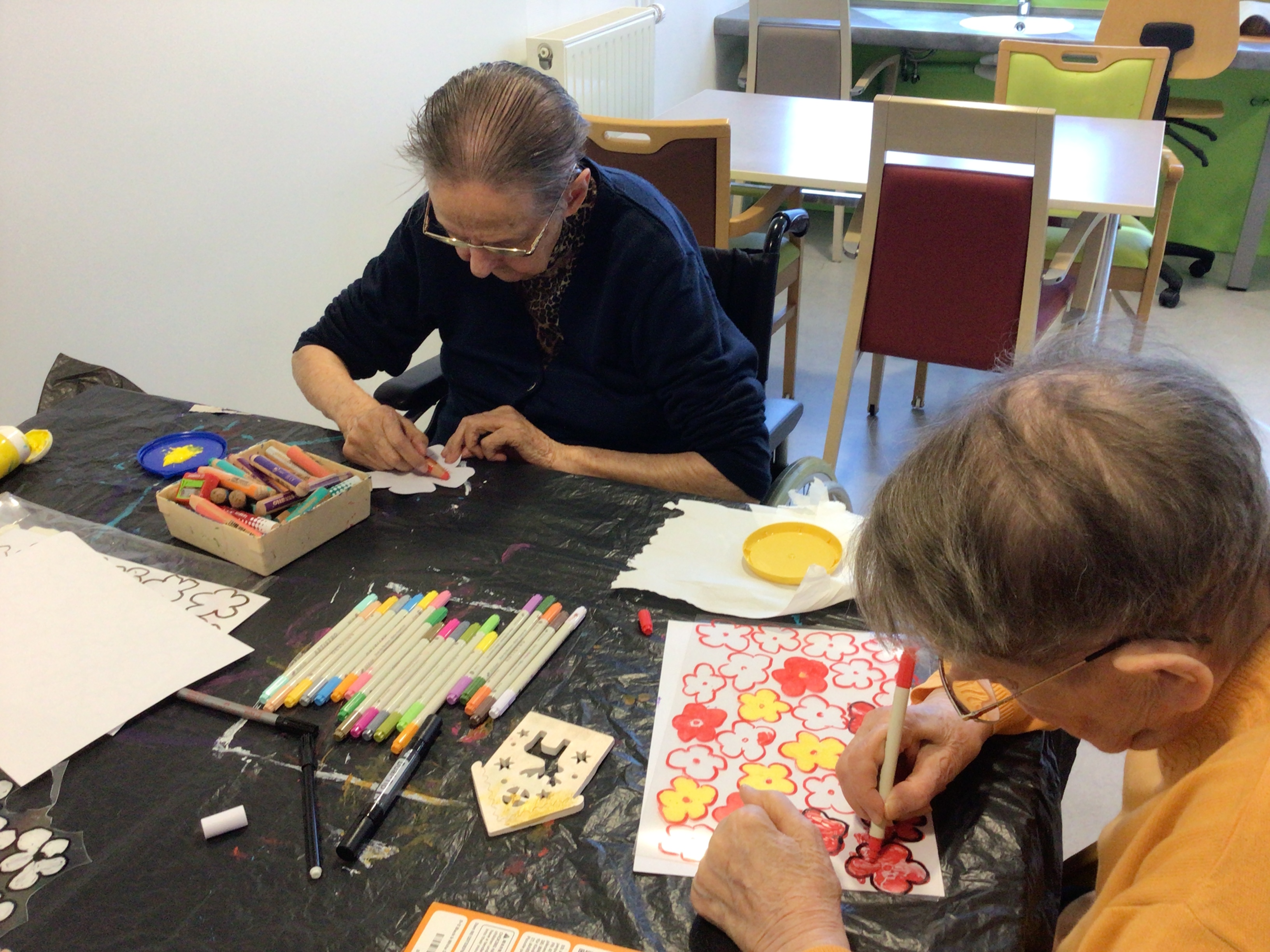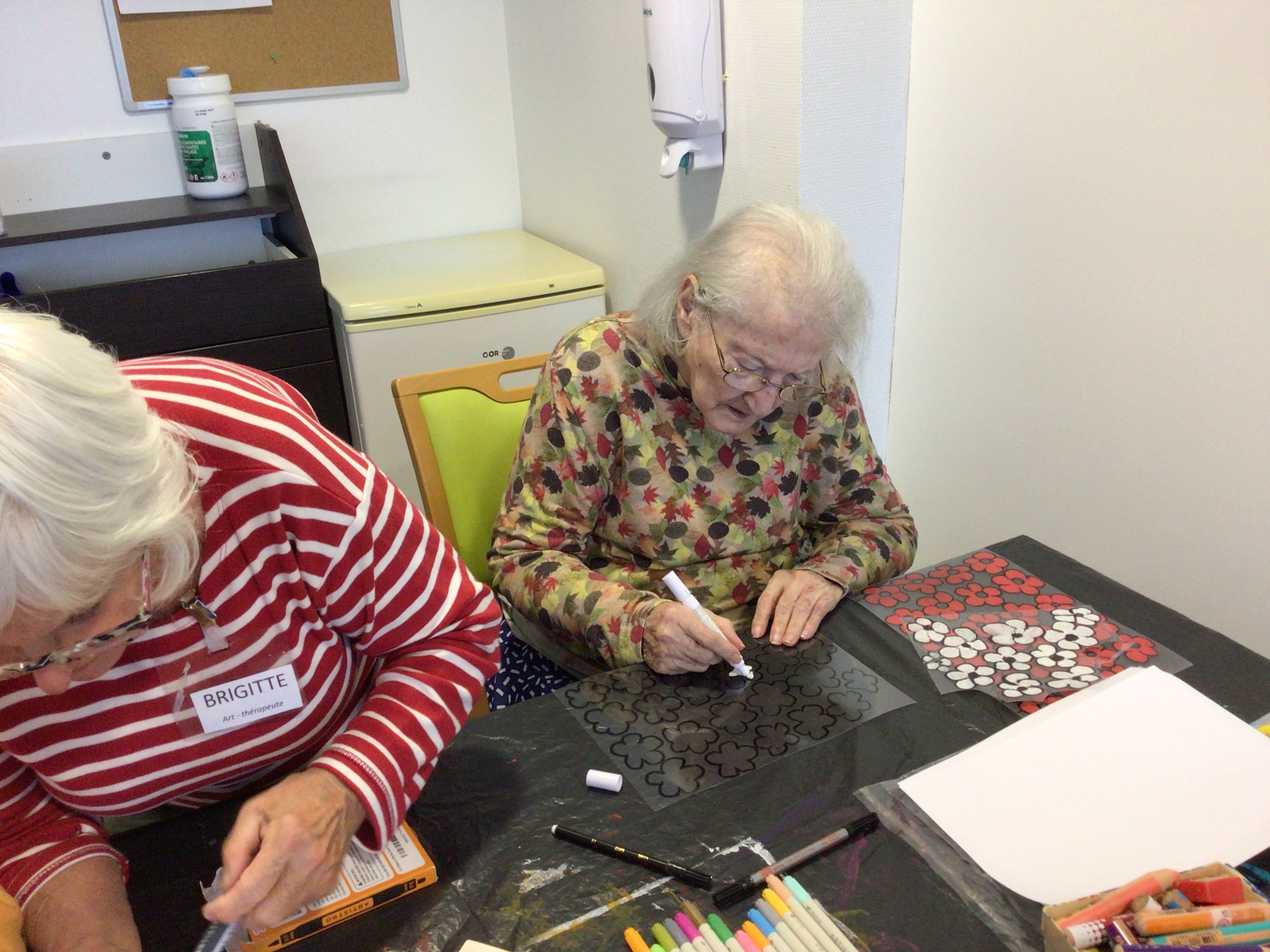 Cet après-midi, préparation des fleurs pour Pomm'expo avec Brigitte , art thérapeute et jeux de société avec notre bénévole Marguerite.