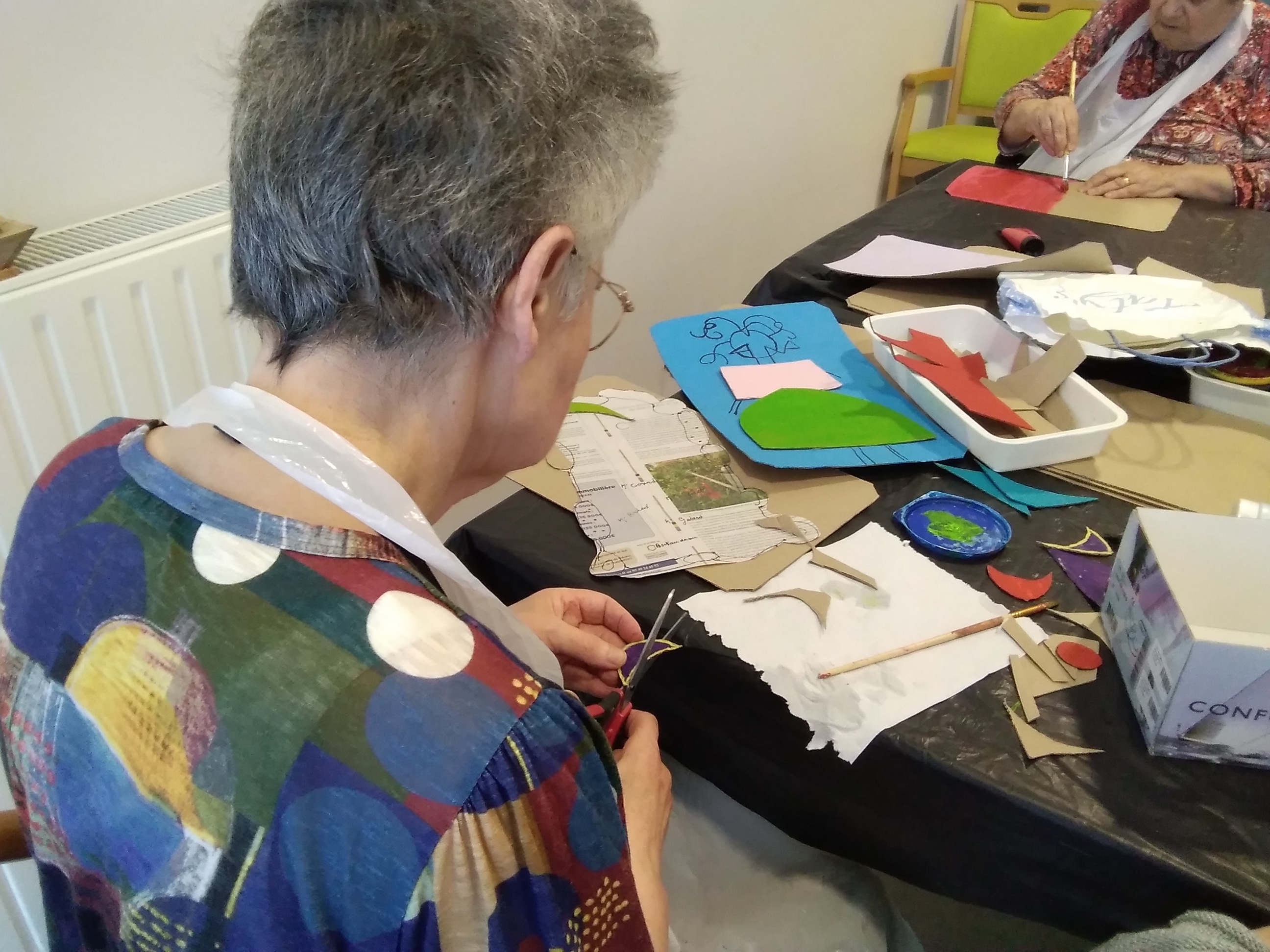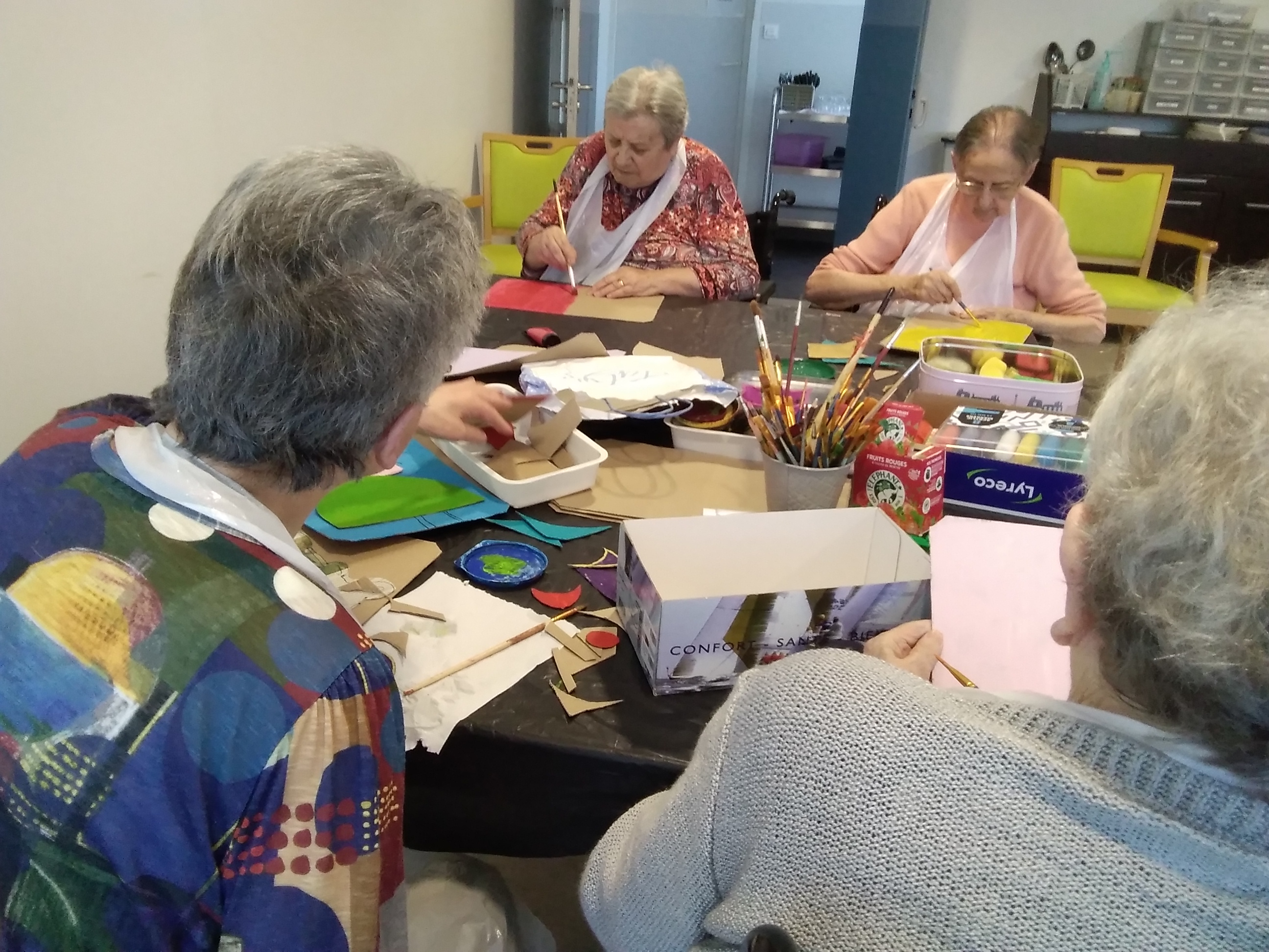 -Brigitte Belaud Art thérapeute a proposé des séances individuelles (musique, lecture…) dans les chambres pour certains ce matin et a retrouvé son groupe de résidentes cet après-midi ; un groupe qui continue des créations autour des œuvres de Gaston Chaissac pour une exposition prévue très prochainement…