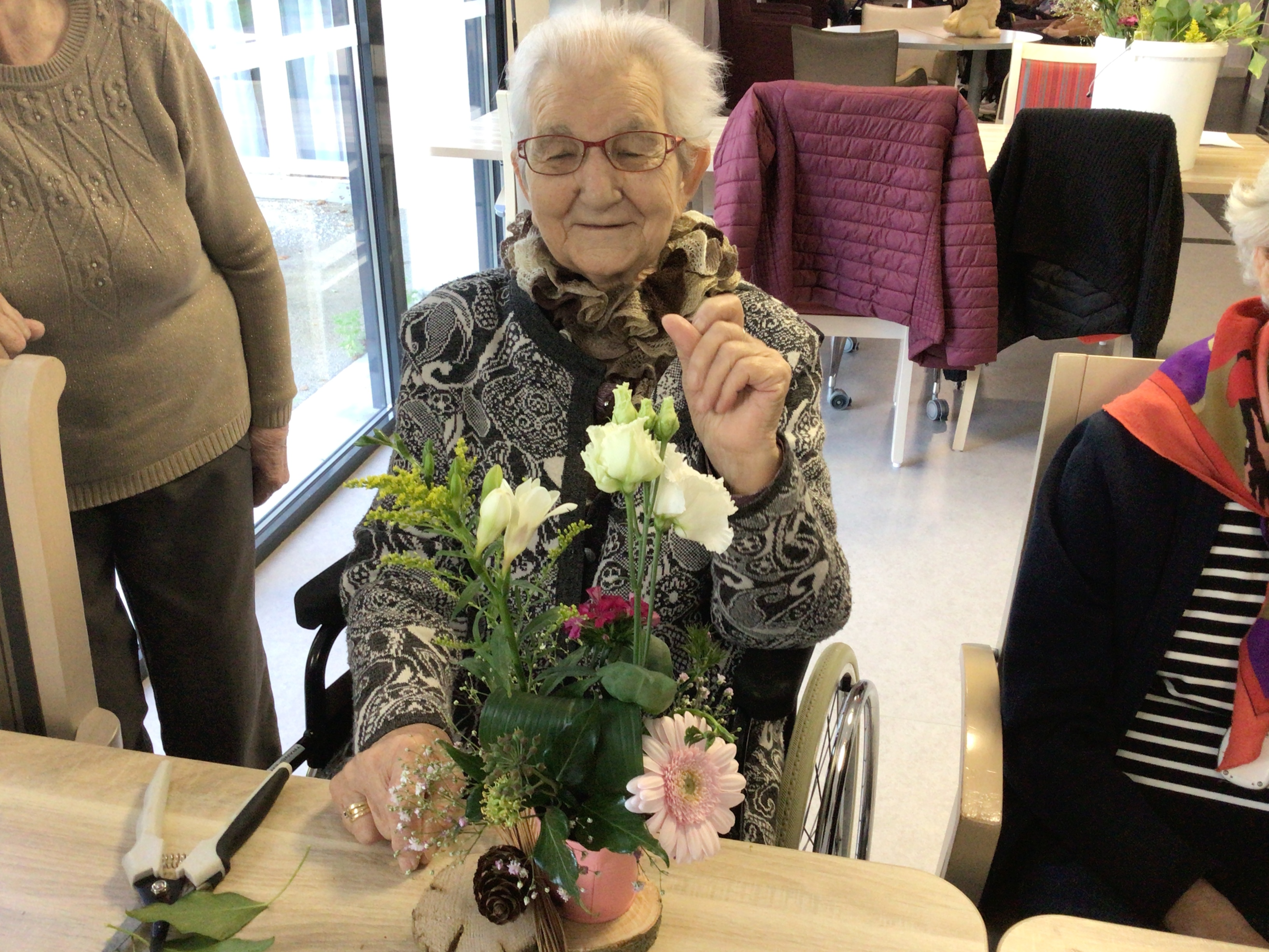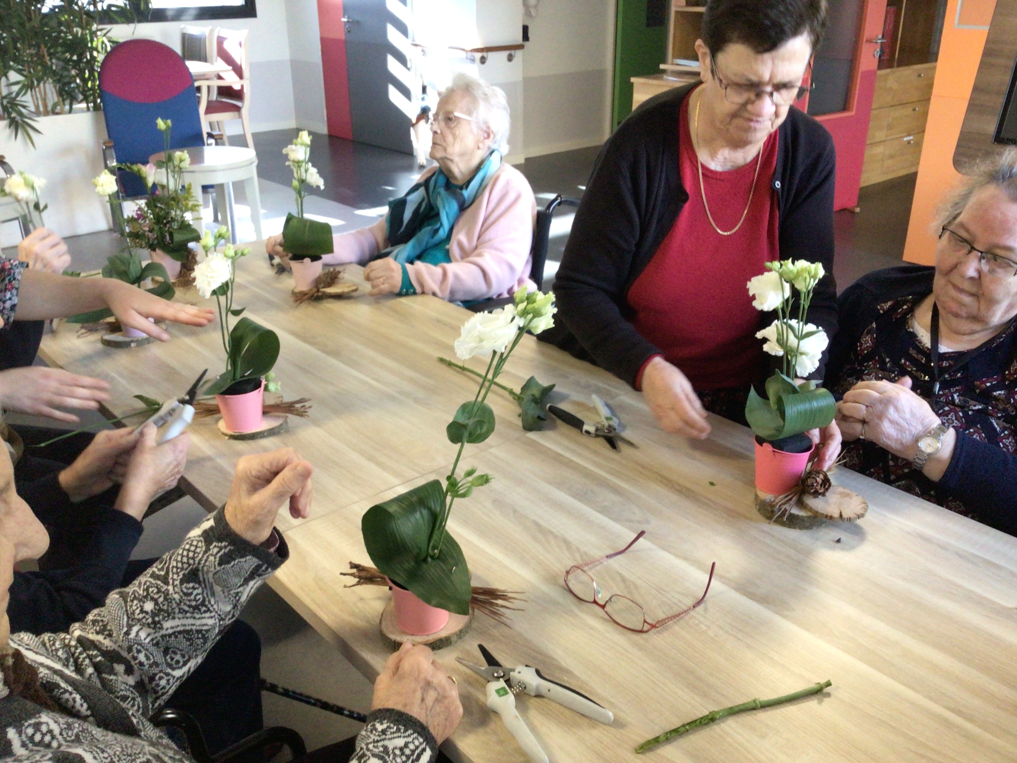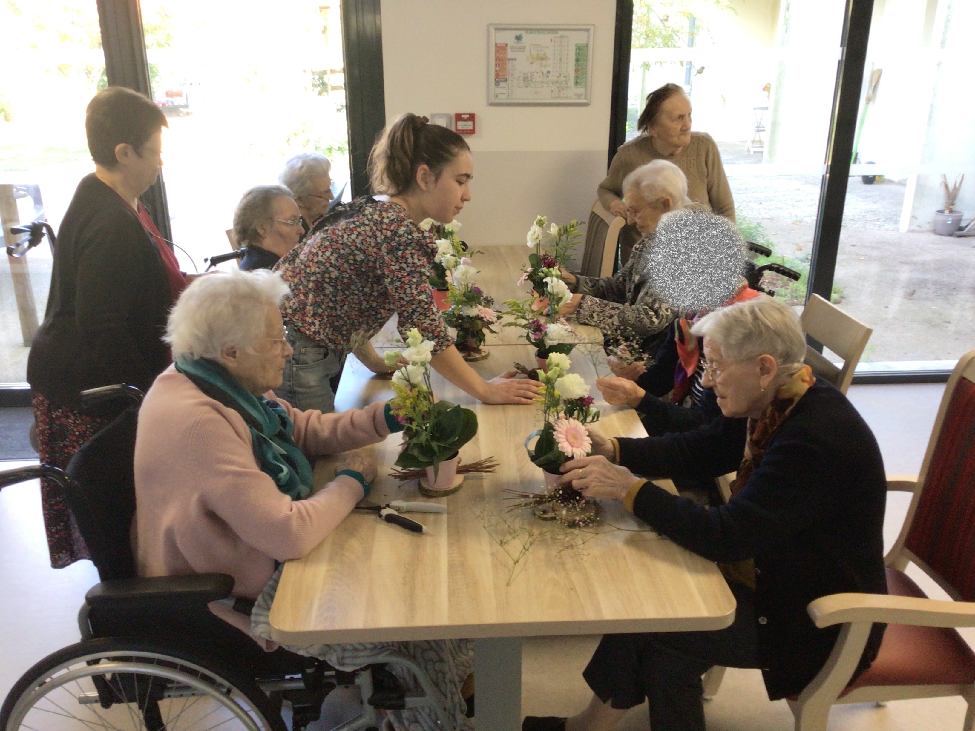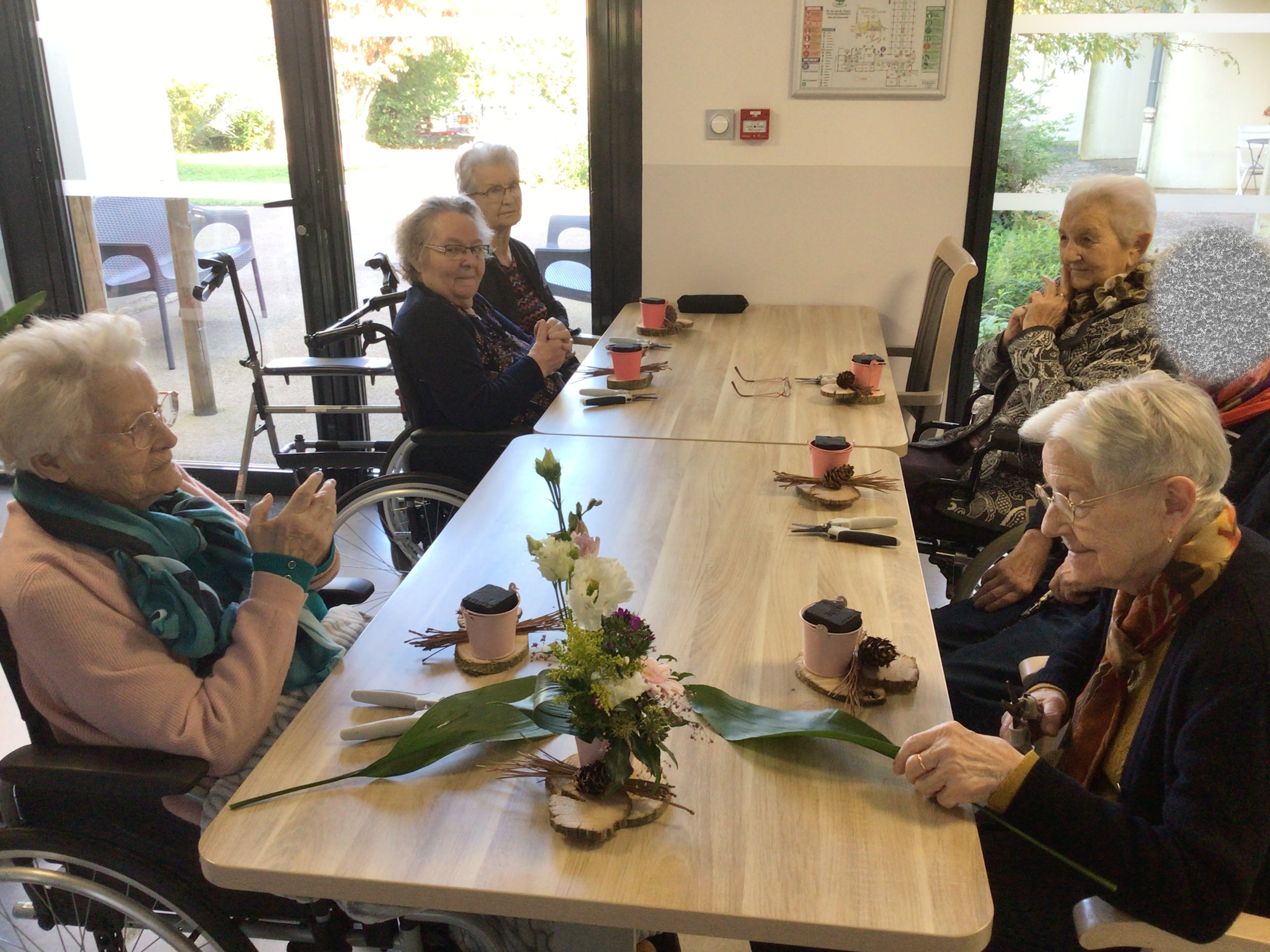 Une belle journée qui commence par la présence d'Honorine la fleuriste de Secondigny accompagnée d'une bénévole qui sont venues ce matin à l'EHPAD pour un atelier Art Floral qui a ravie les participantes.