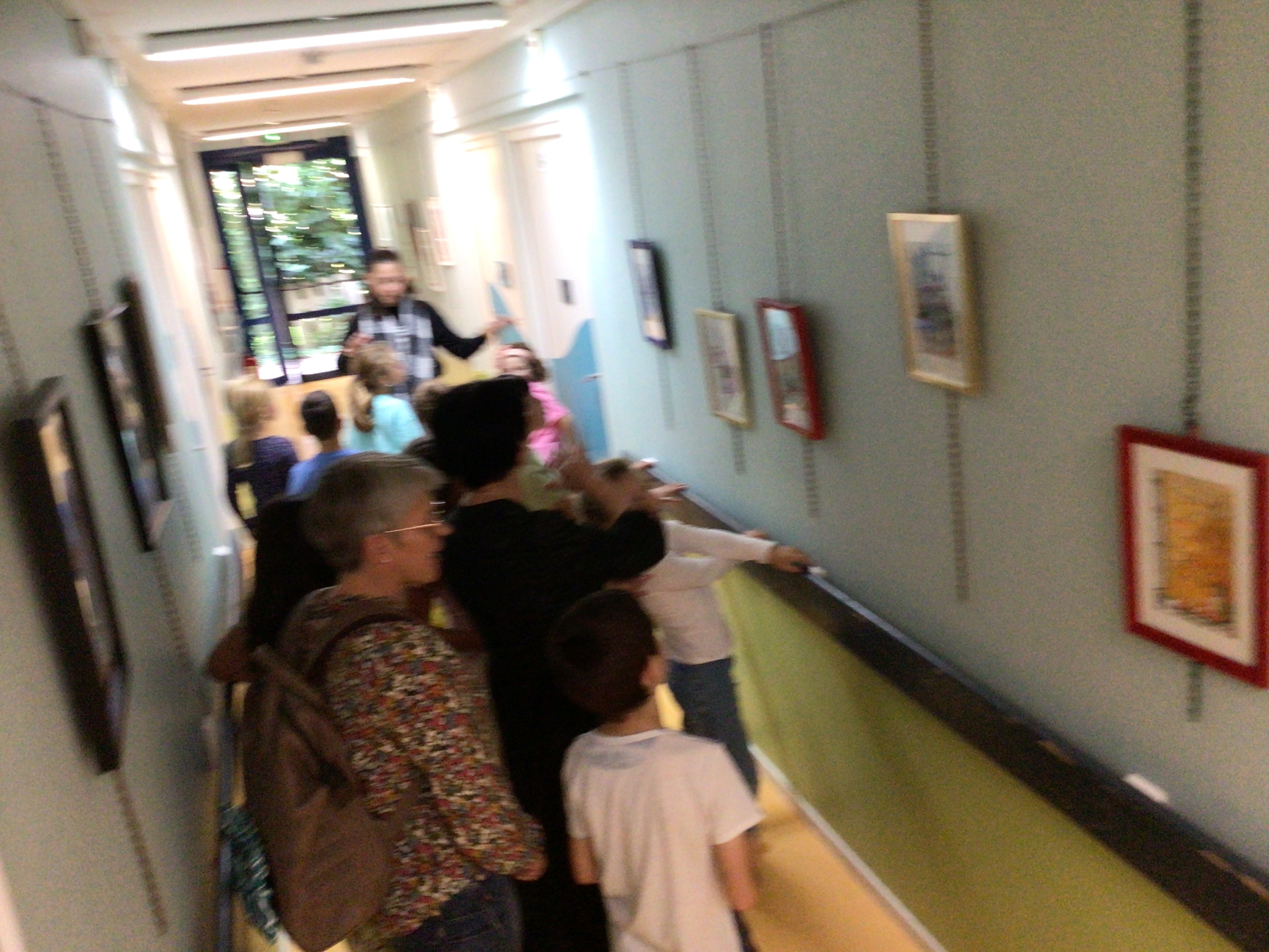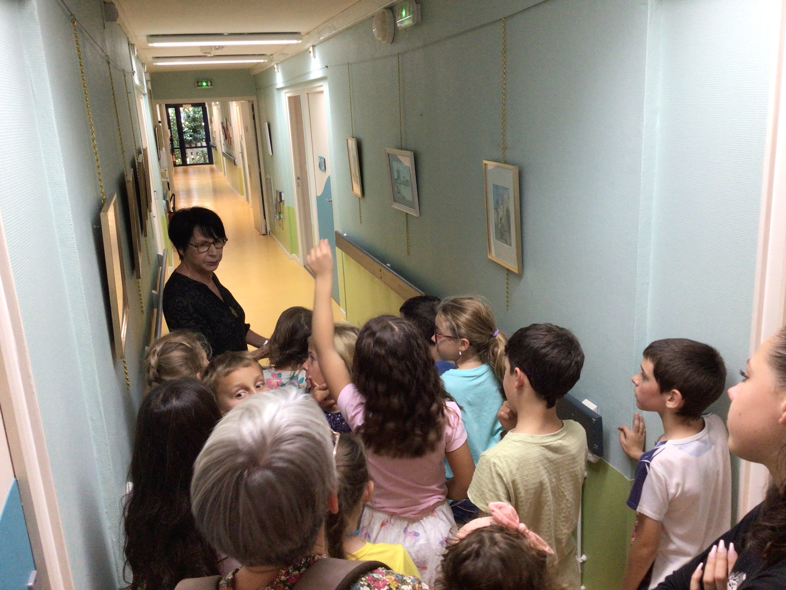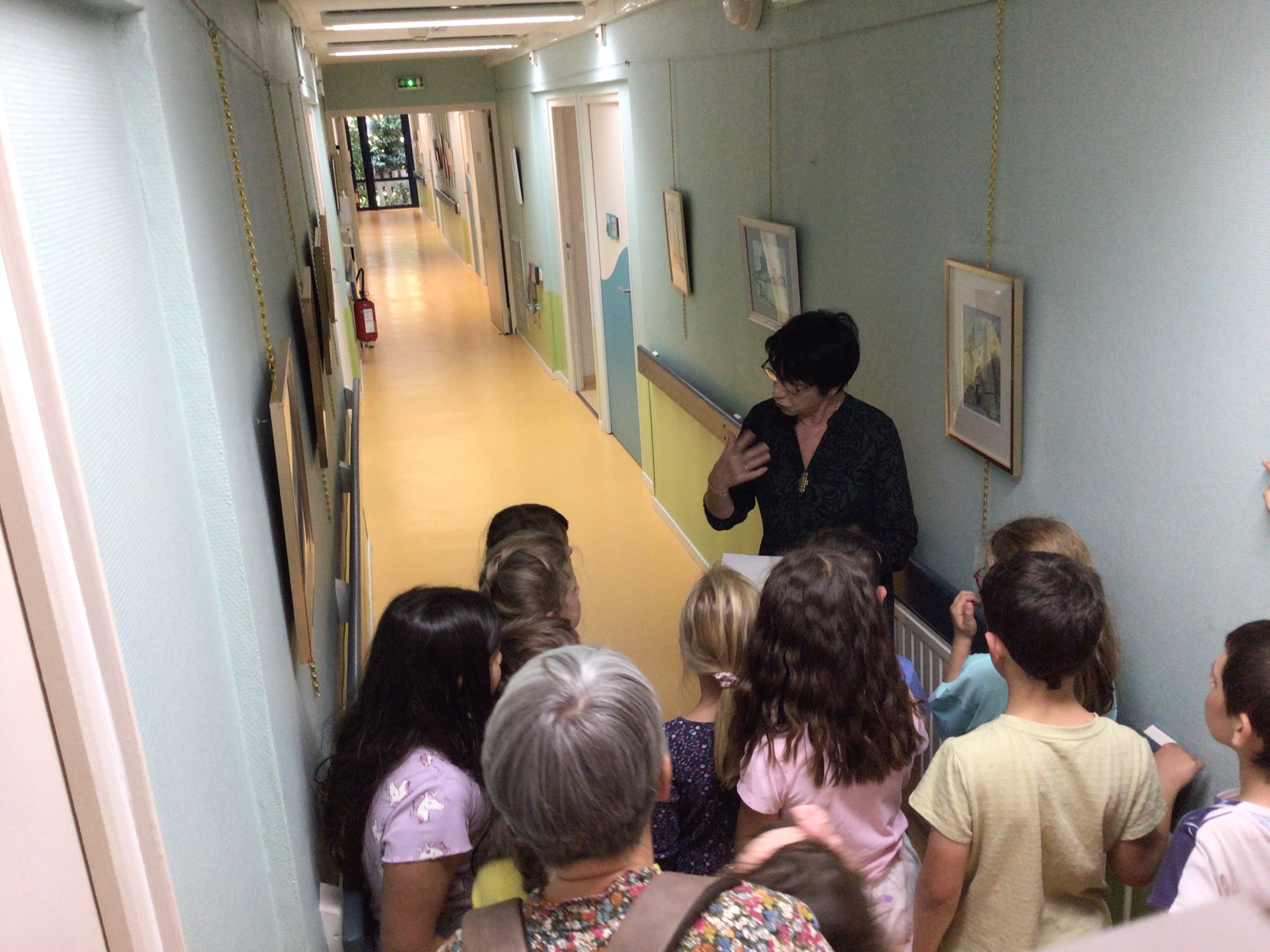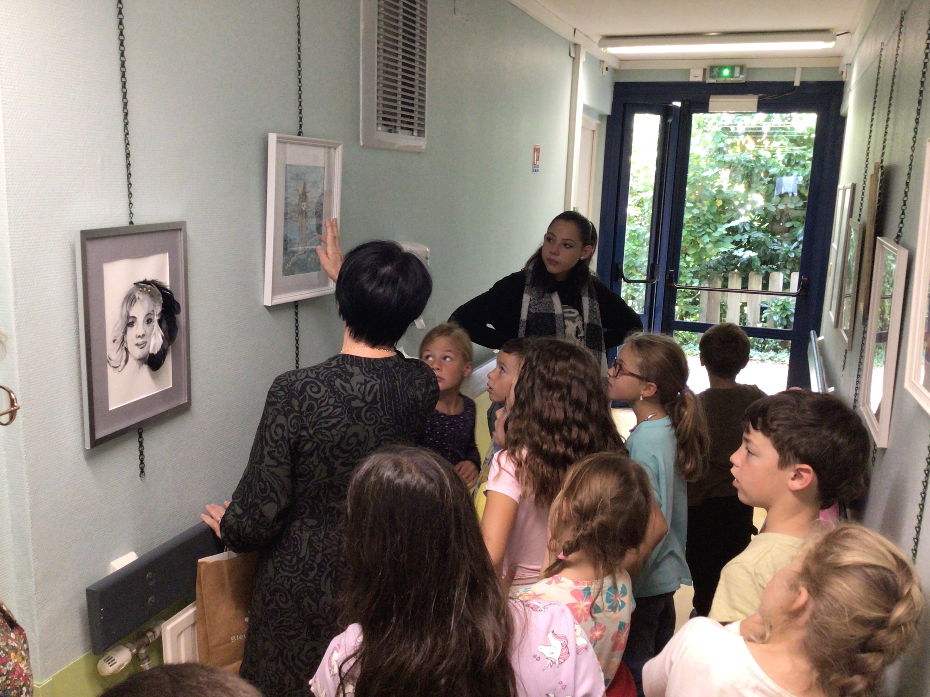Cet après-midi, la classe de primaire (CP/CE1/CE2) de l'école Ste Marie est venue visiter l'exposition "l'art entre en résidence". A cette occasion , ils ont pu rencontrer l'artiste Josette Calvet , et échanger sur les différentes oeuvres.