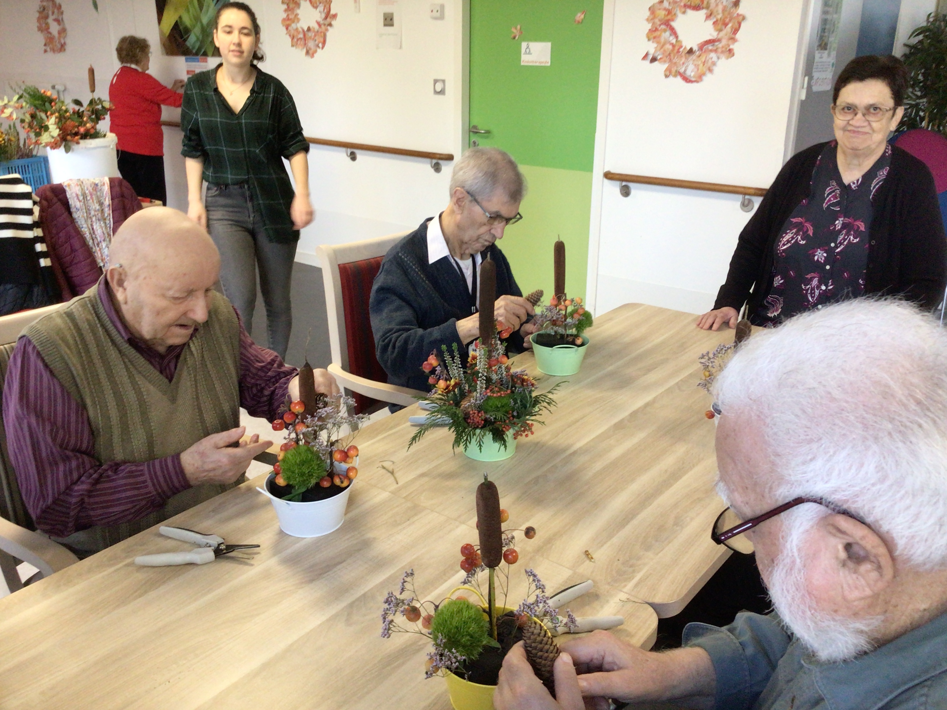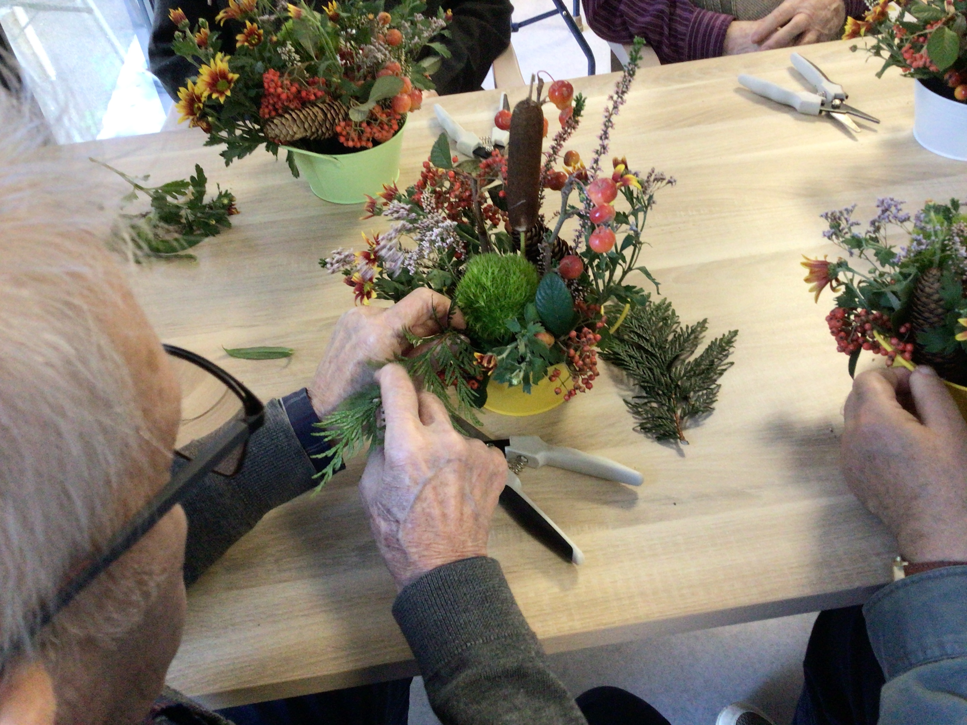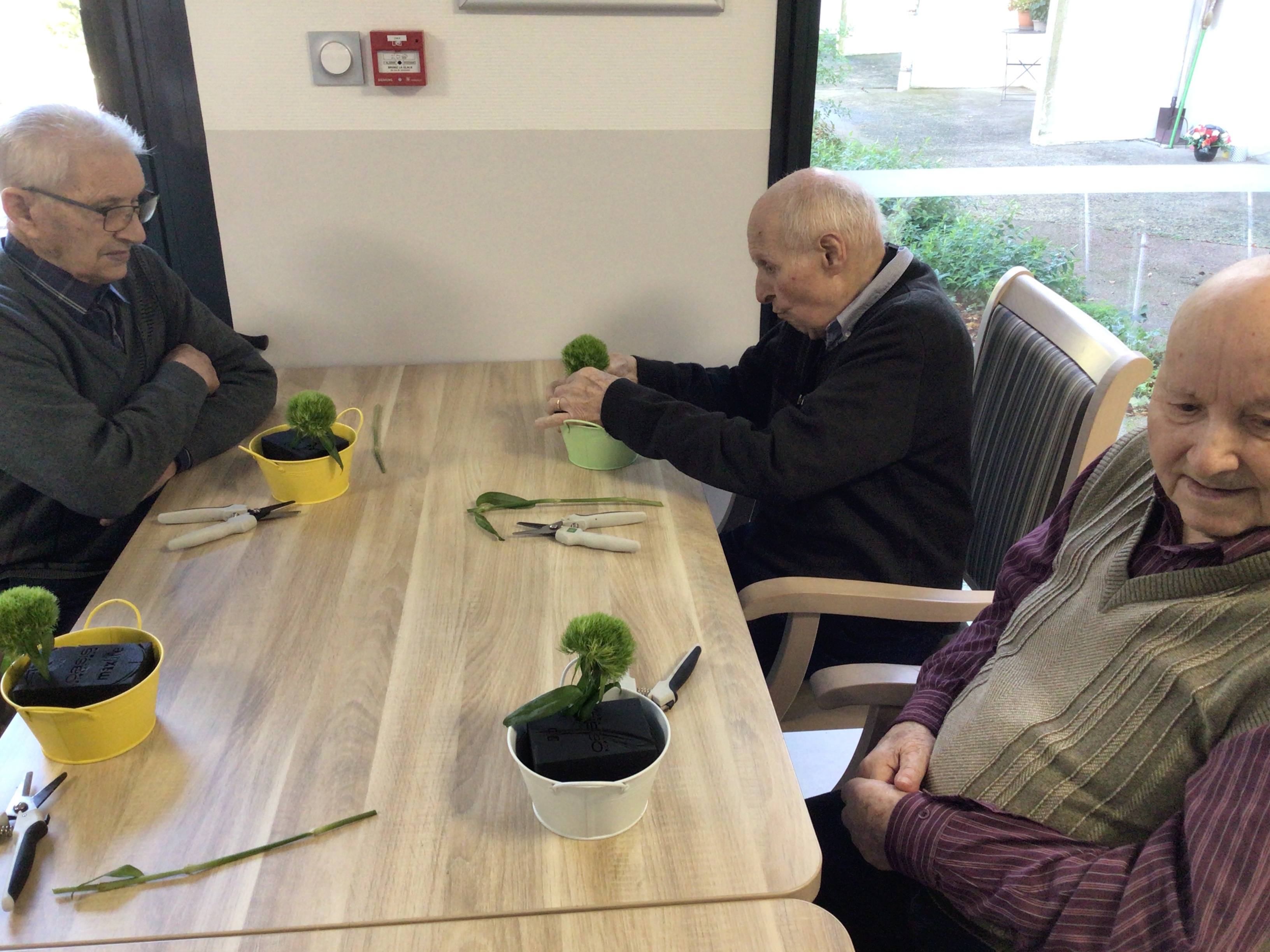 -Art floral avec Honorine la fleuriste de Secondigny et Jacqueline notre bénévole pour un groupe de Messieurs très volontaires . Ambiance très studieuse...