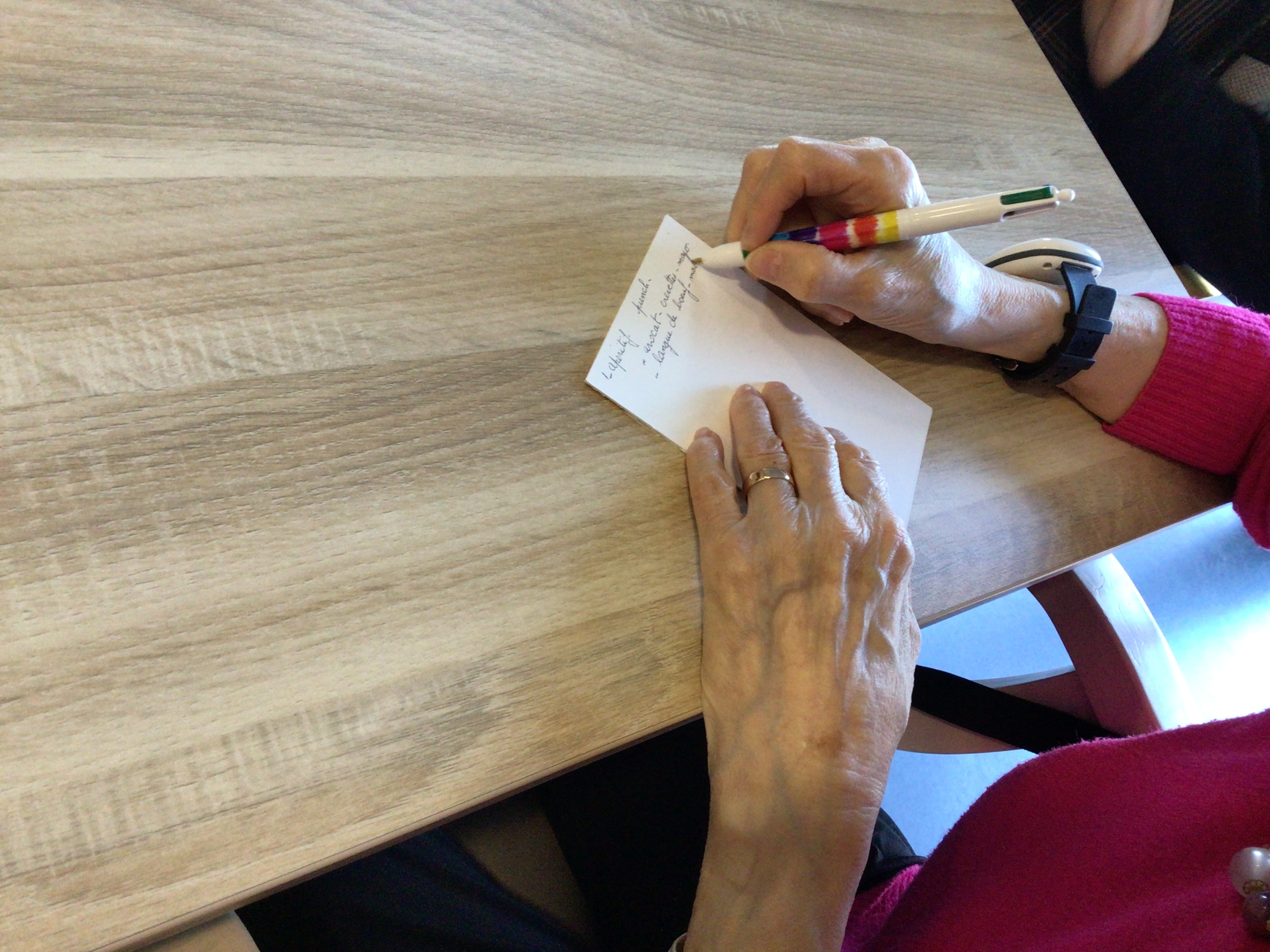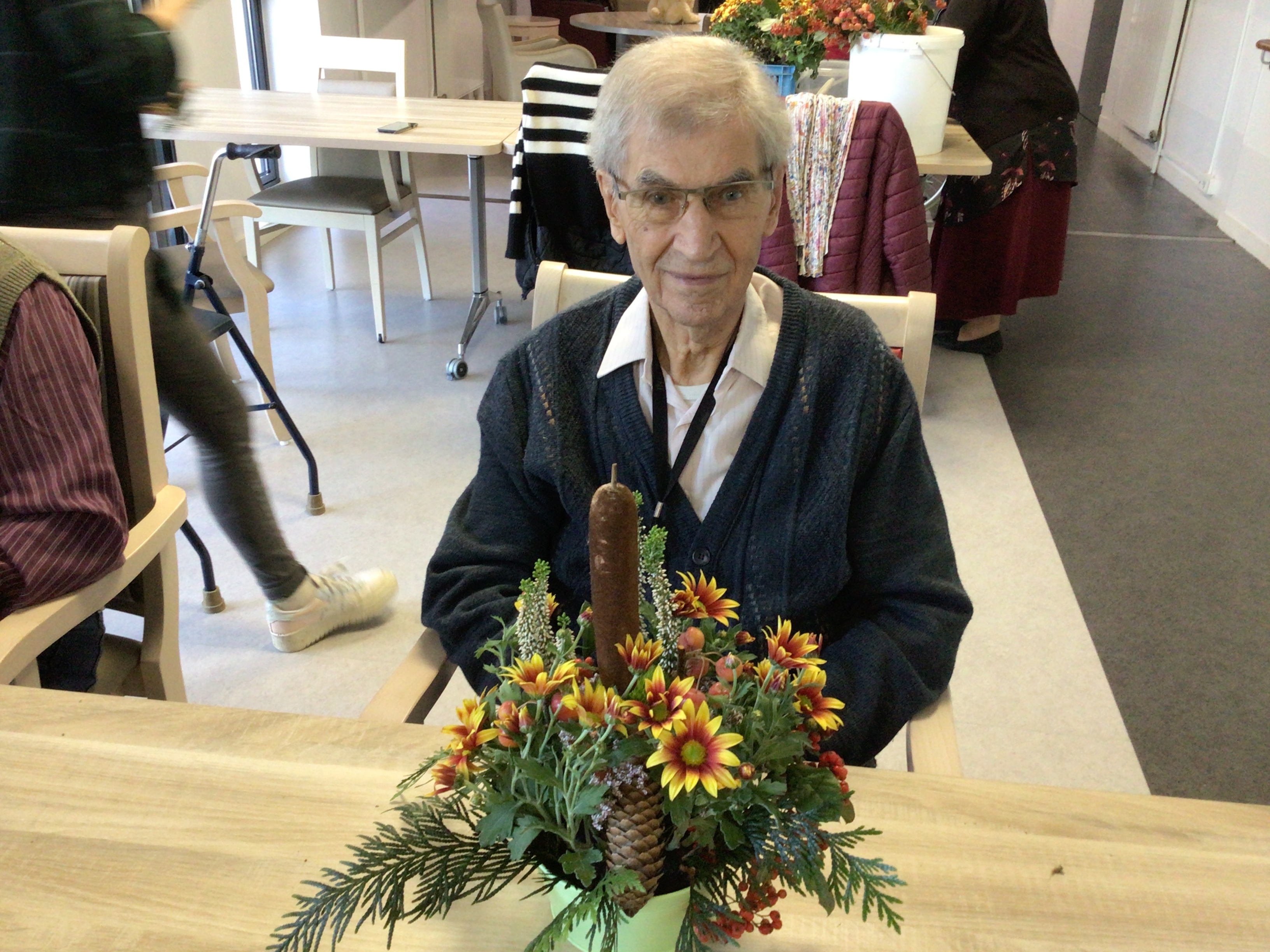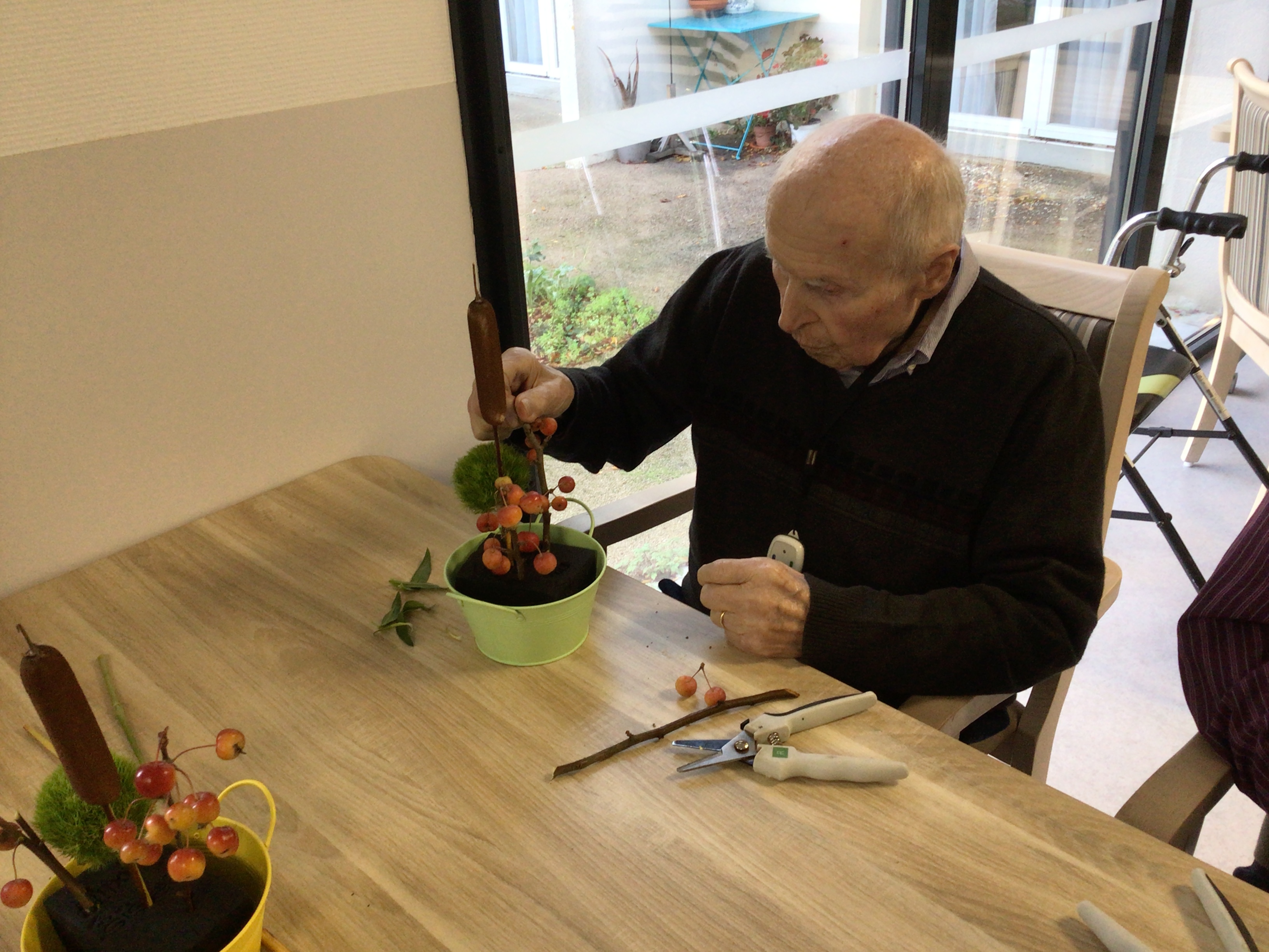 -Art floral avec Honorine la fleuriste de Secondigny et Jacqueline notre bénévole pour un groupe de Messieurs très volontaires . Ambiance très studieuse...