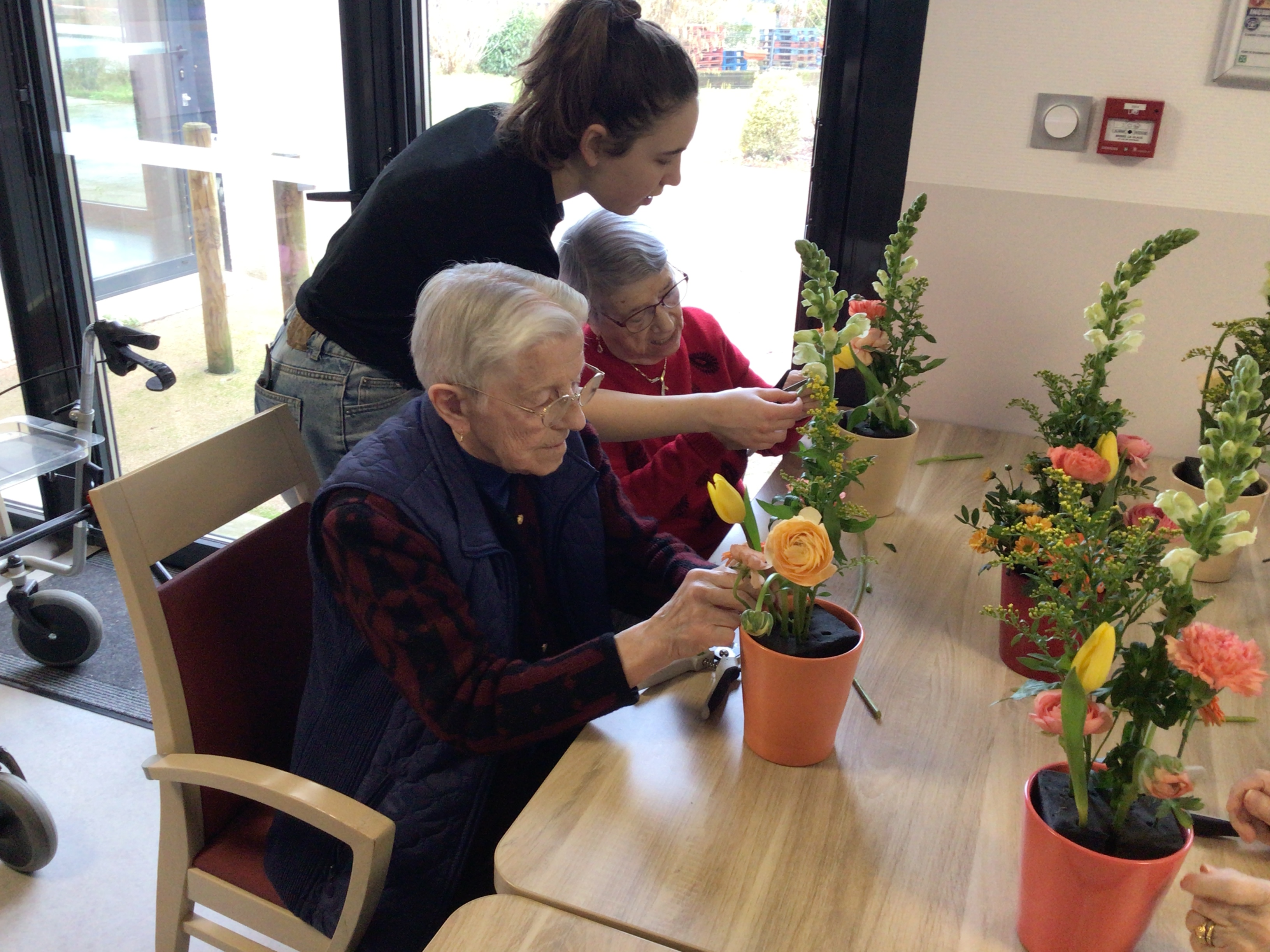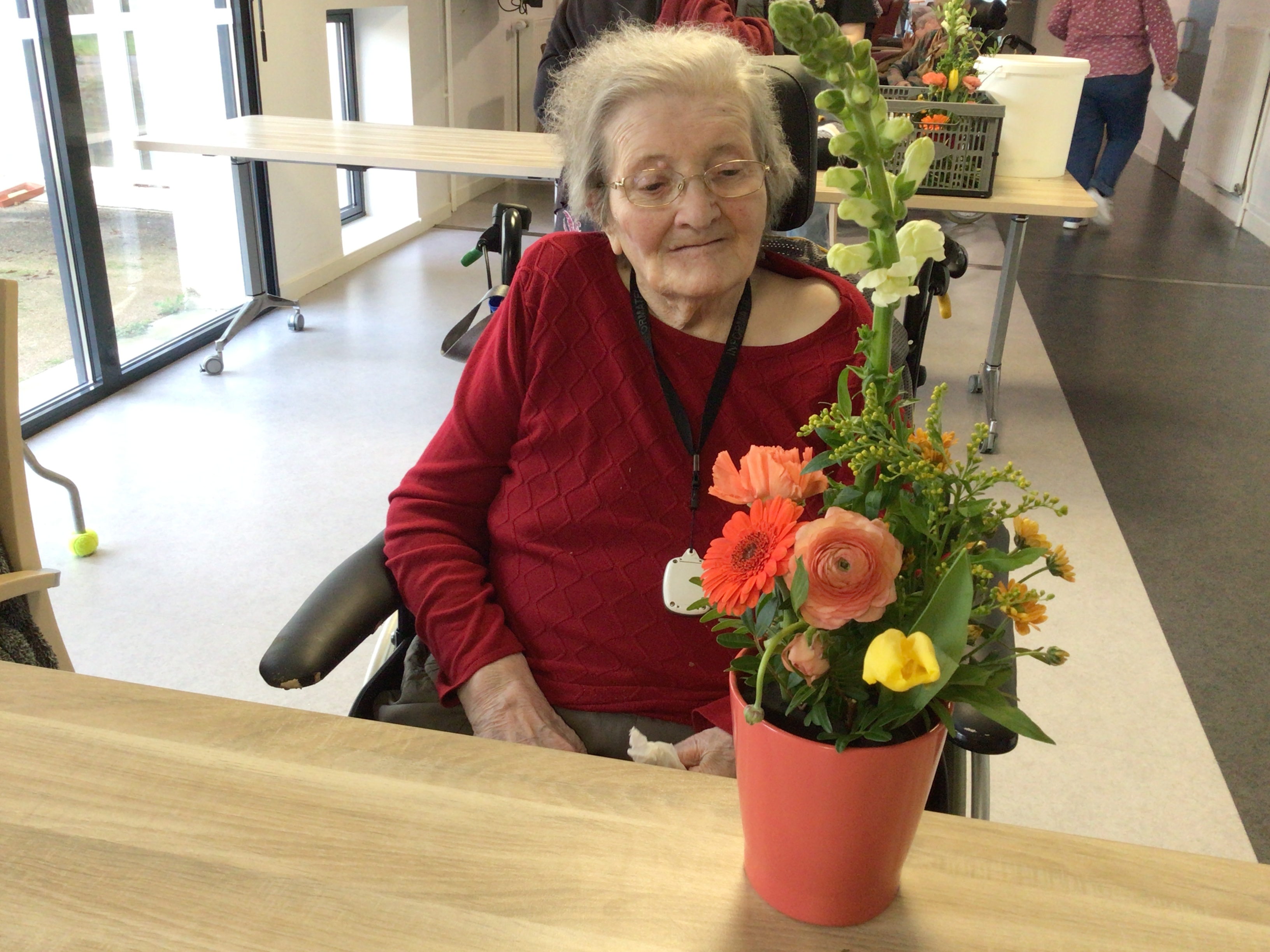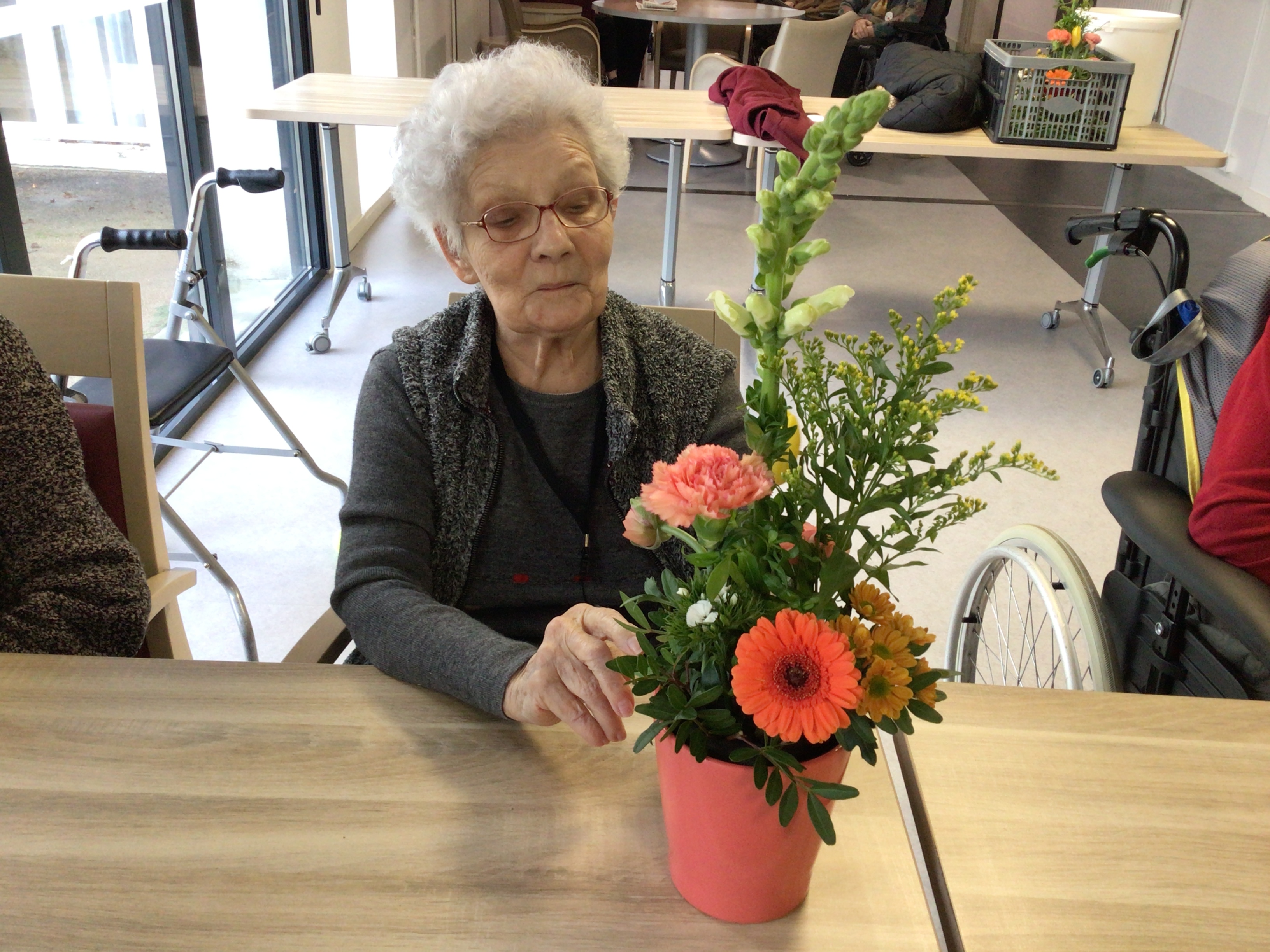 art floral ce matin en compagnie d'honorine de Miletunefleurs Honorine et de notre bénévole Jacqueline : création d'une composition florale pour agrémenter sa chambre. En suivant les consignes de la fleuriste, chaque résidente réalise sa composition florale et en bavardant.